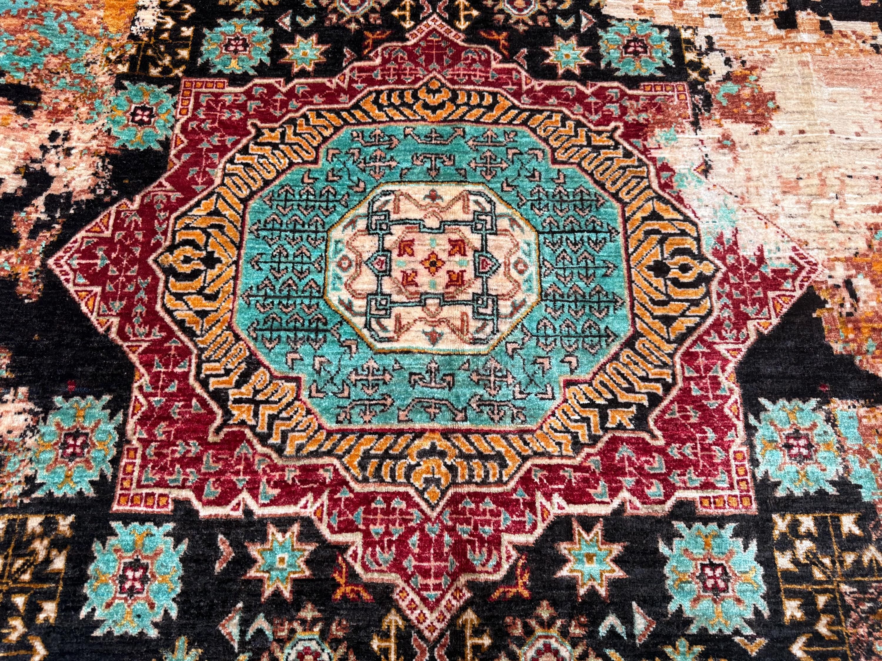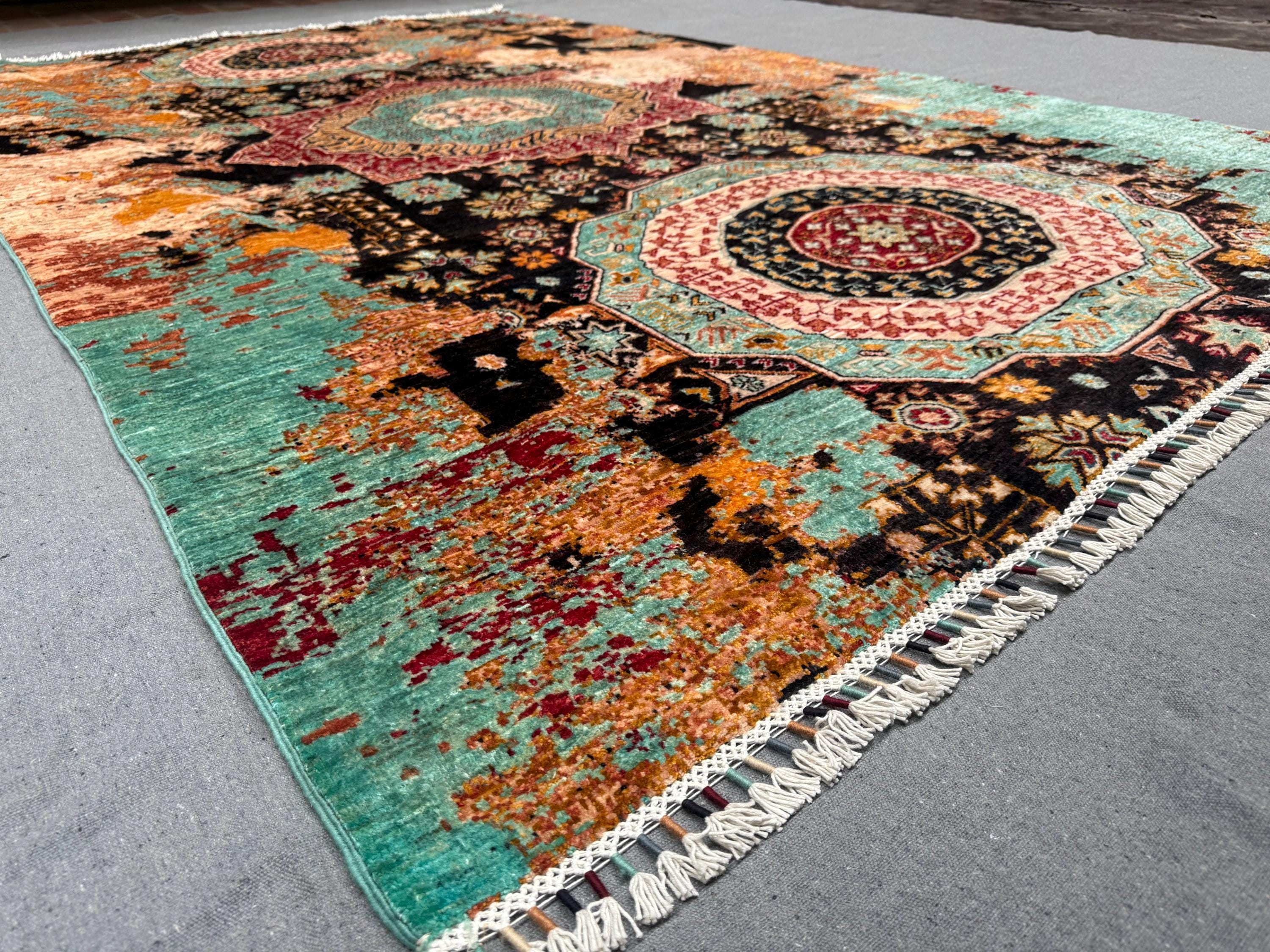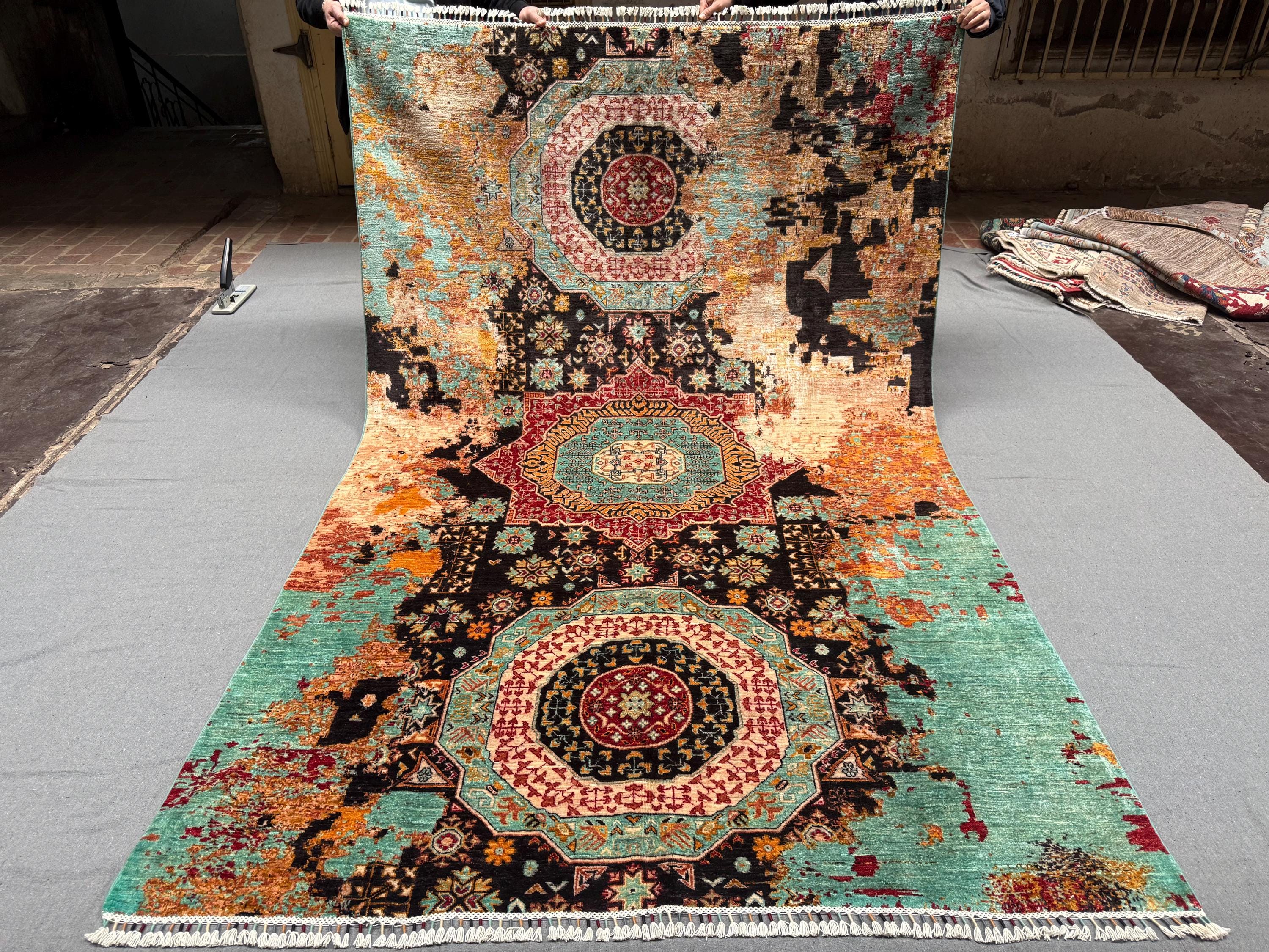 This handmade Mamluk rug blends traditional geometric medallions with a bold distressed design, creating a dramatic and artistic centerpiece. Rich tones of teal, rust, burgundy, black, cream, and gold form a vibrant, textured background around layered Mamluk medallions, giving the rug both depth and modern flair.