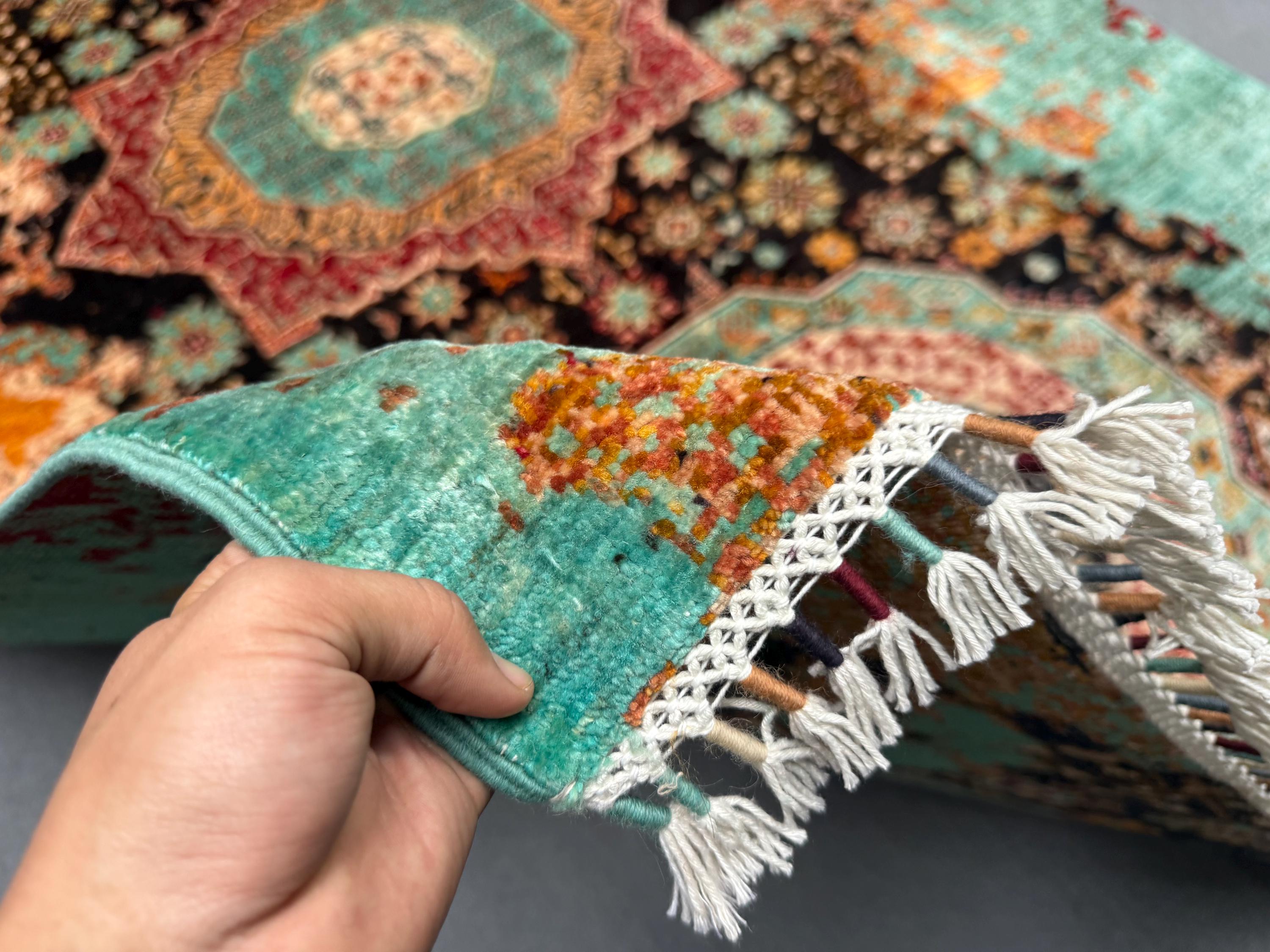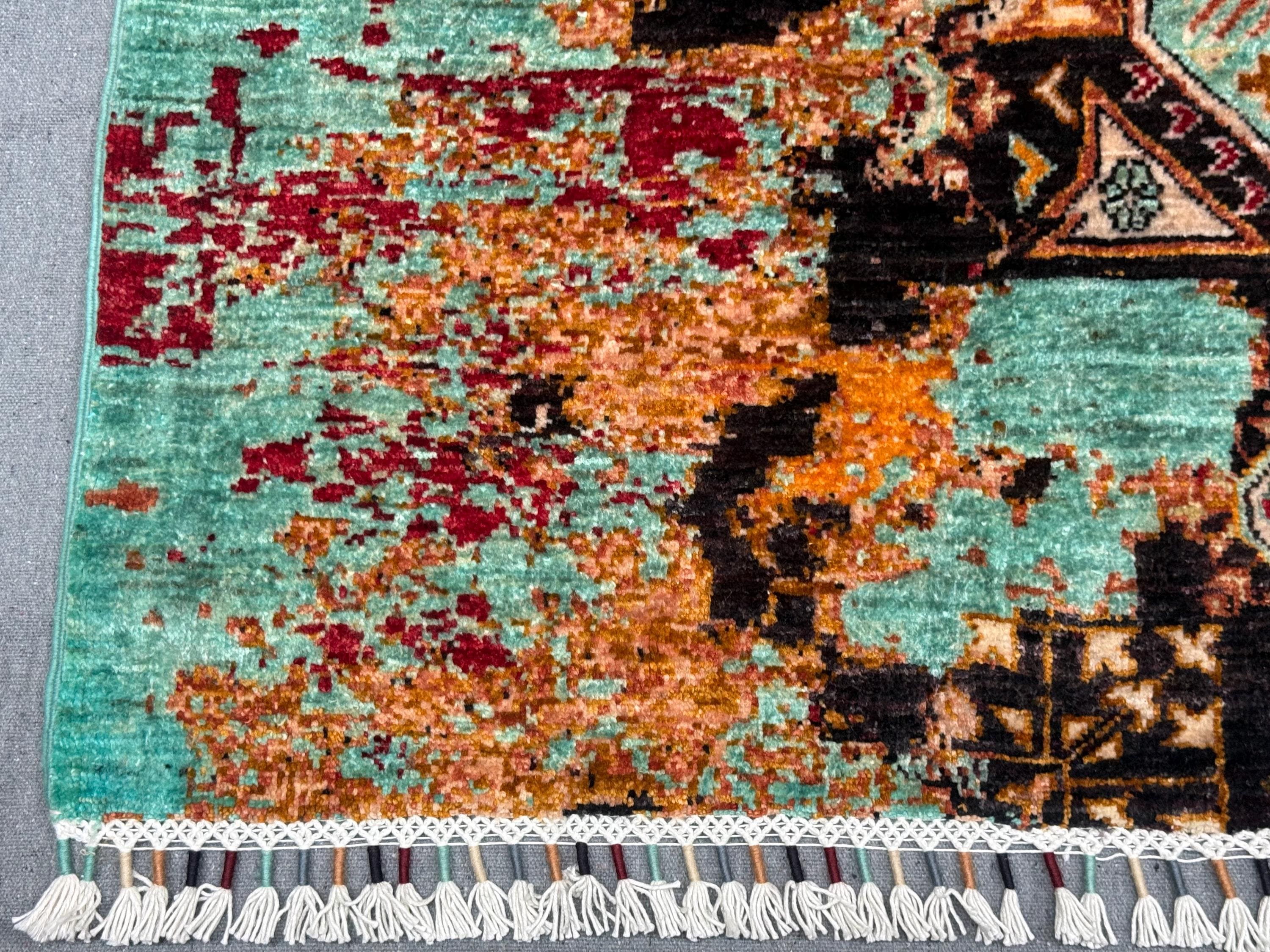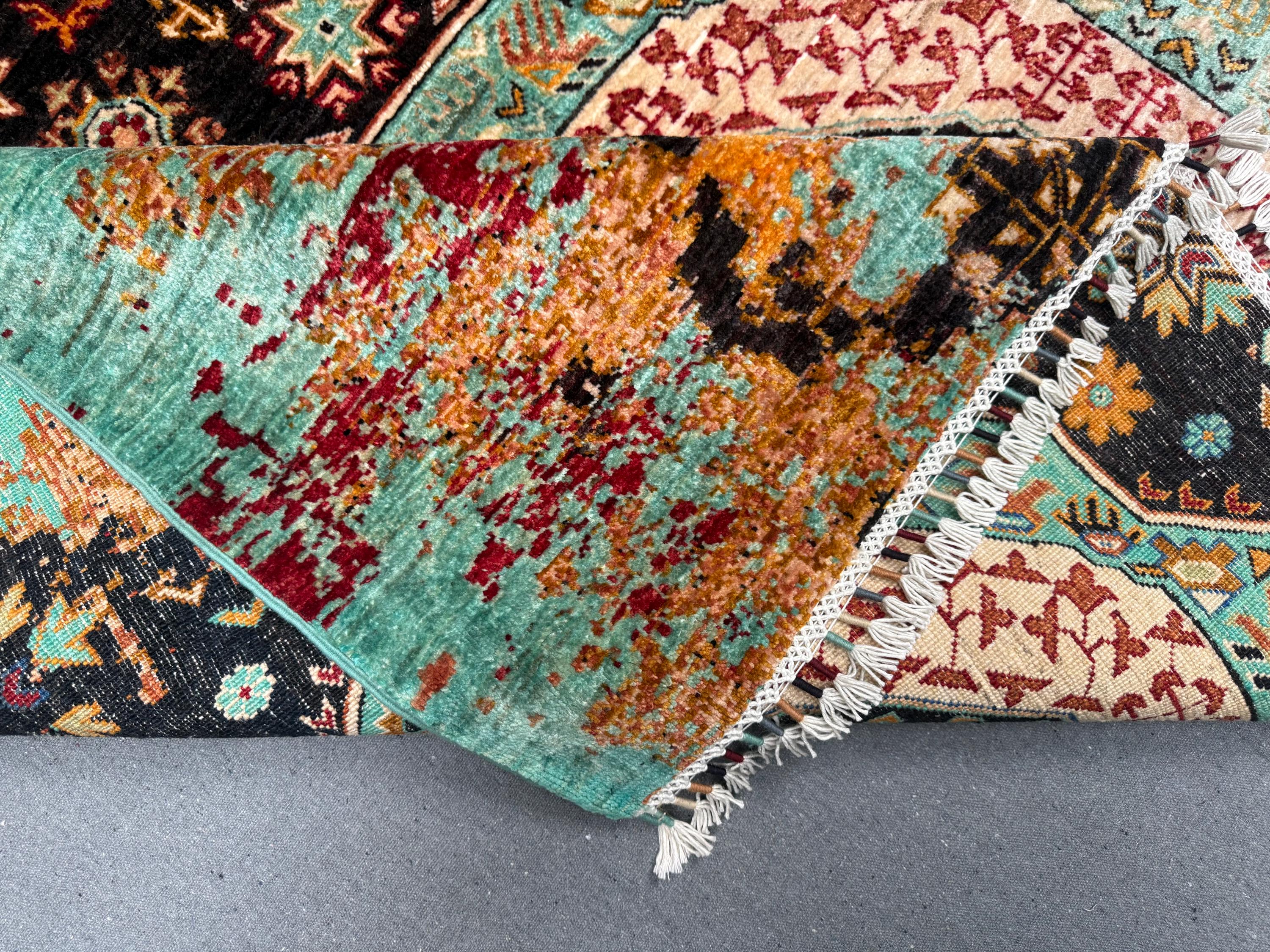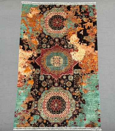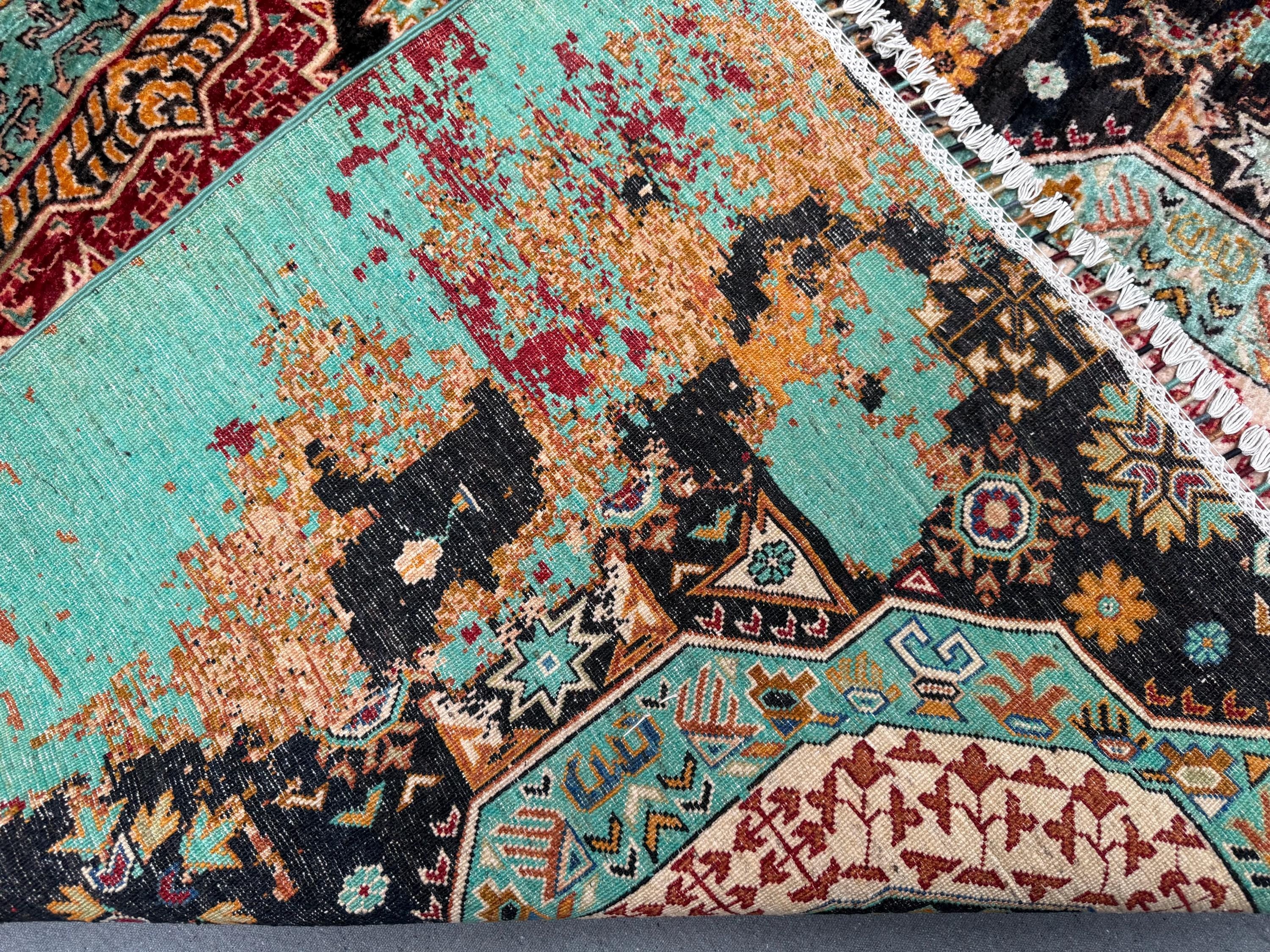 This handmade Mamluk rug blends traditional geometric medallions with a bold distressed design, creating a dramatic and artistic centerpiece. Rich tones of teal, rust, burgundy, black, cream, and gold form a vibrant, textured background around layered Mamluk medallions, giving the rug both depth and modern flair.