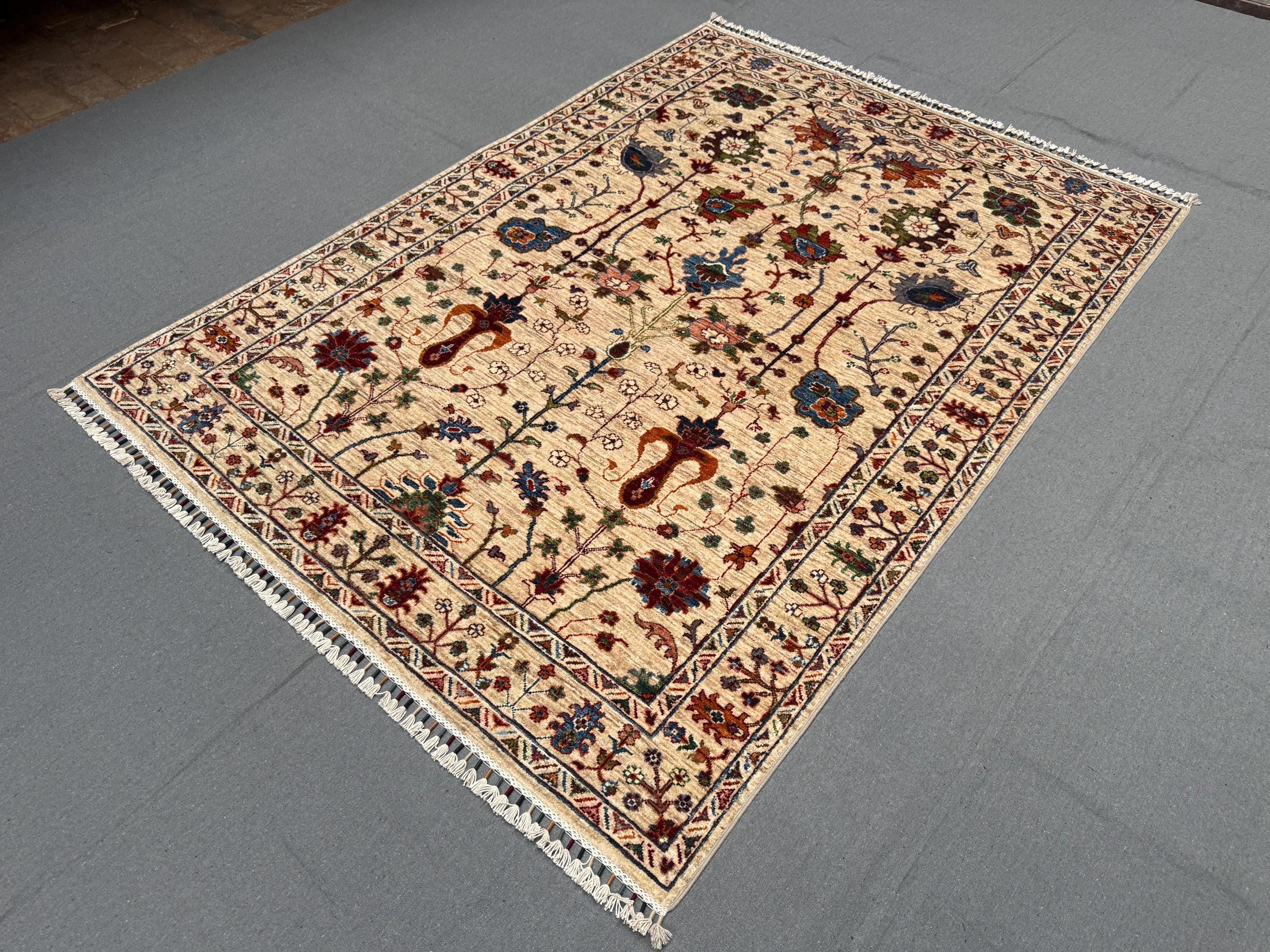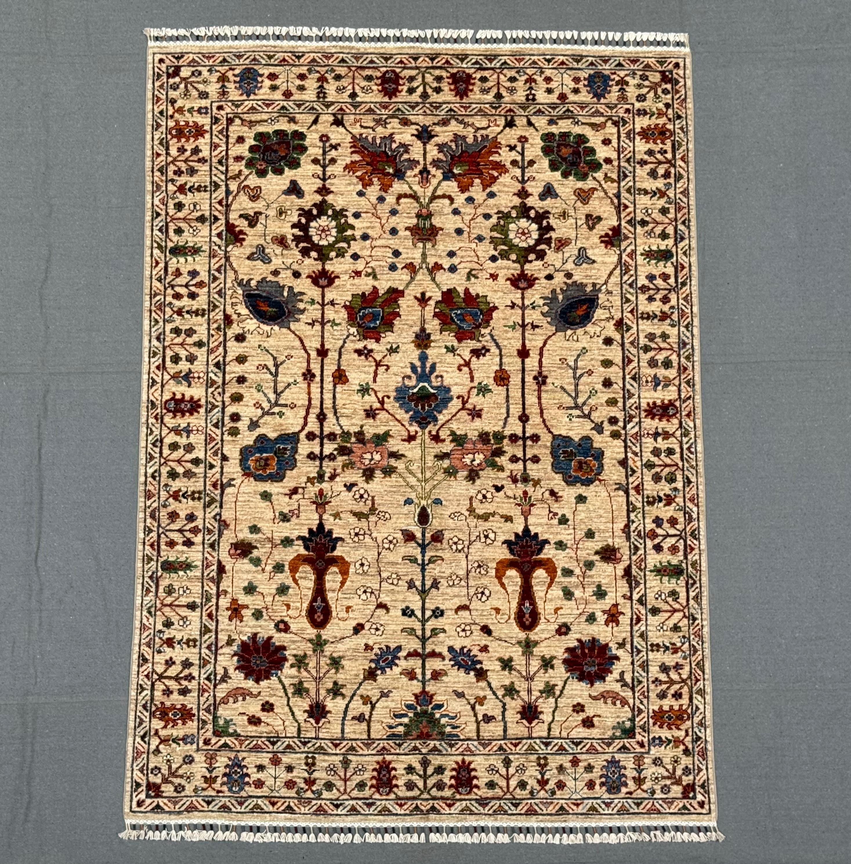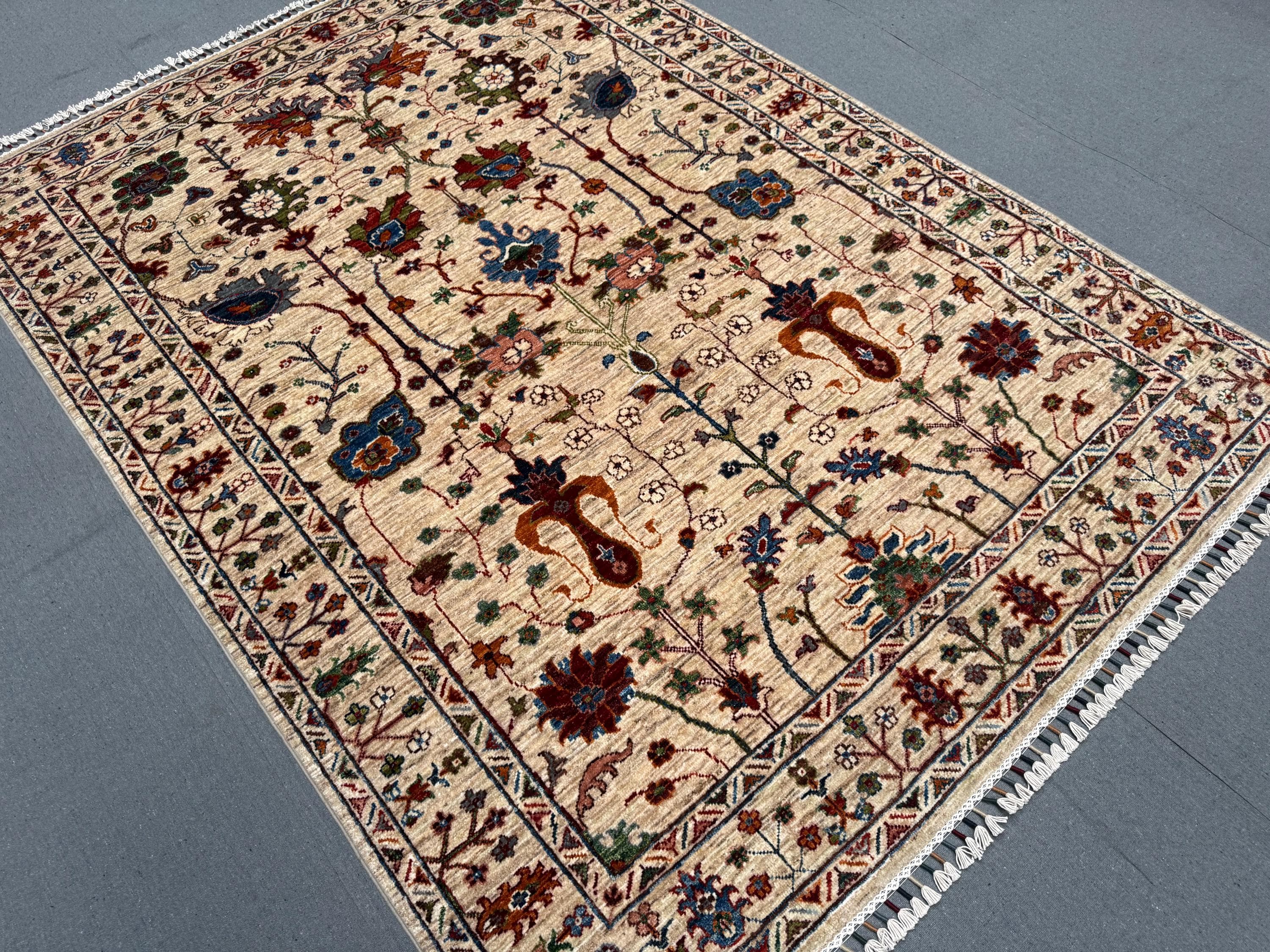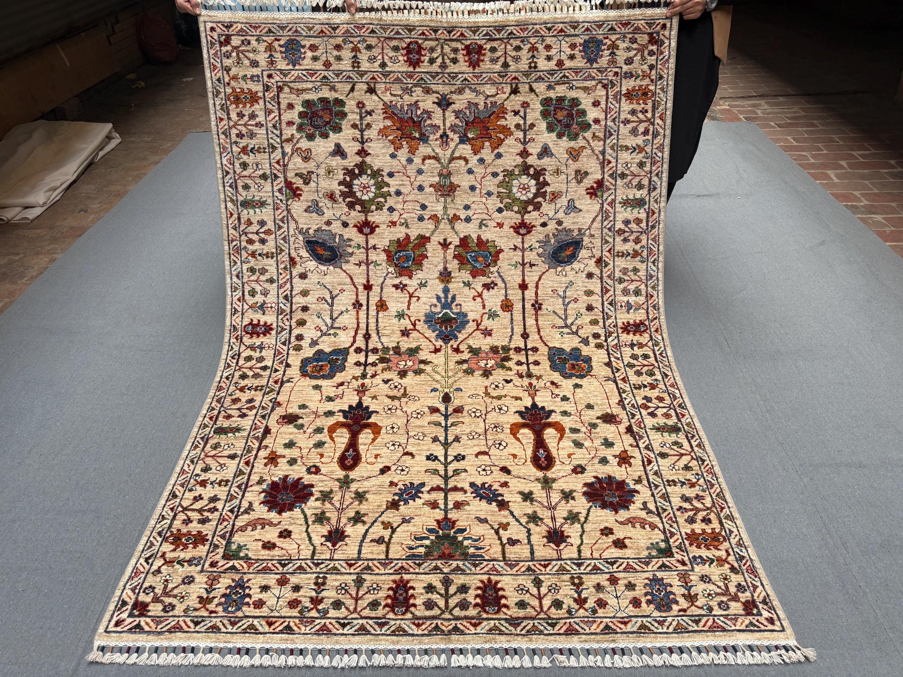 Handmade Sultani Rug 5x7 ft Afghan Cream Wool Area Rug, Floral Oriental Carpet, Boho Living Room Decor, Traditional Handmade Rug