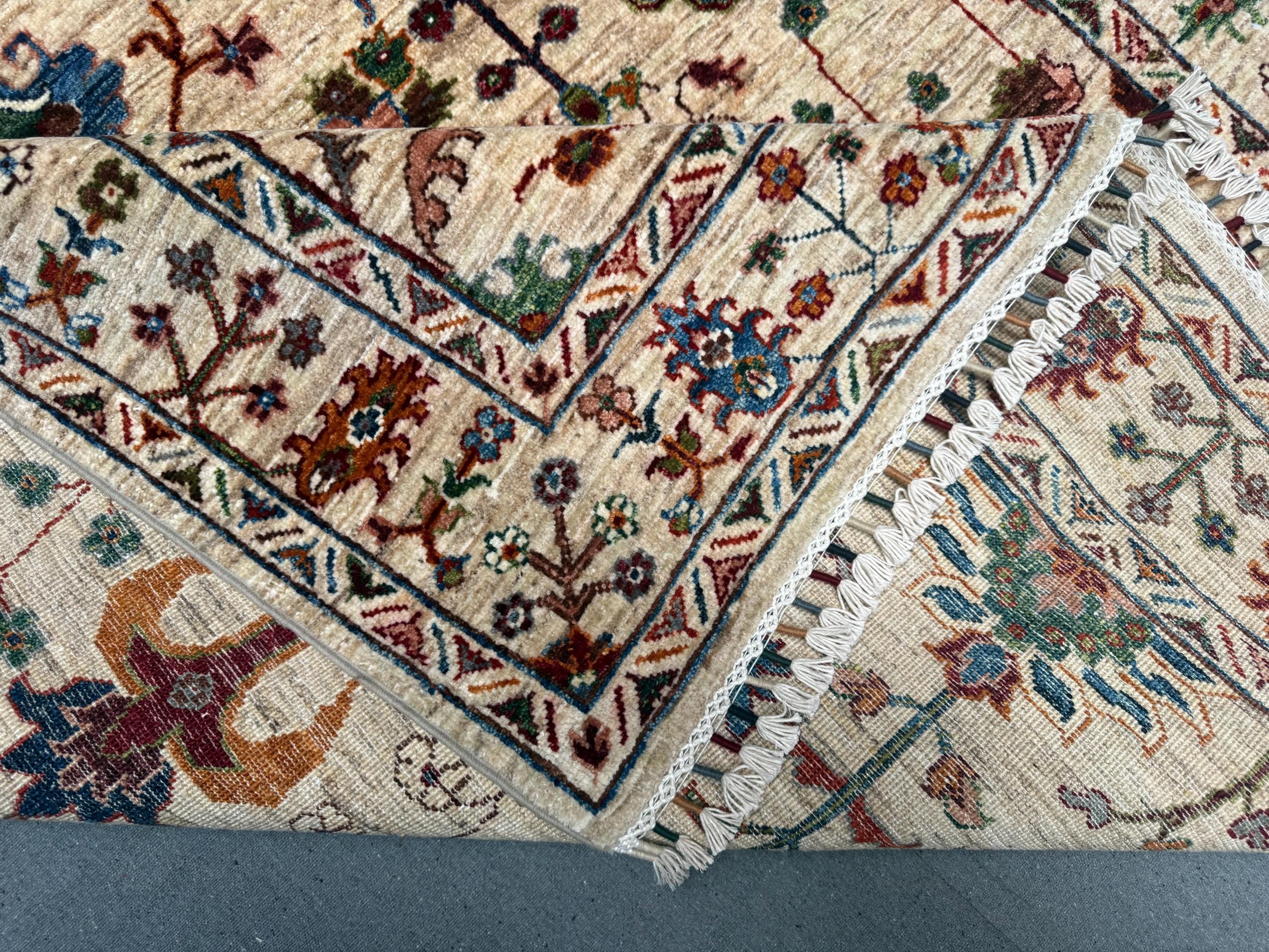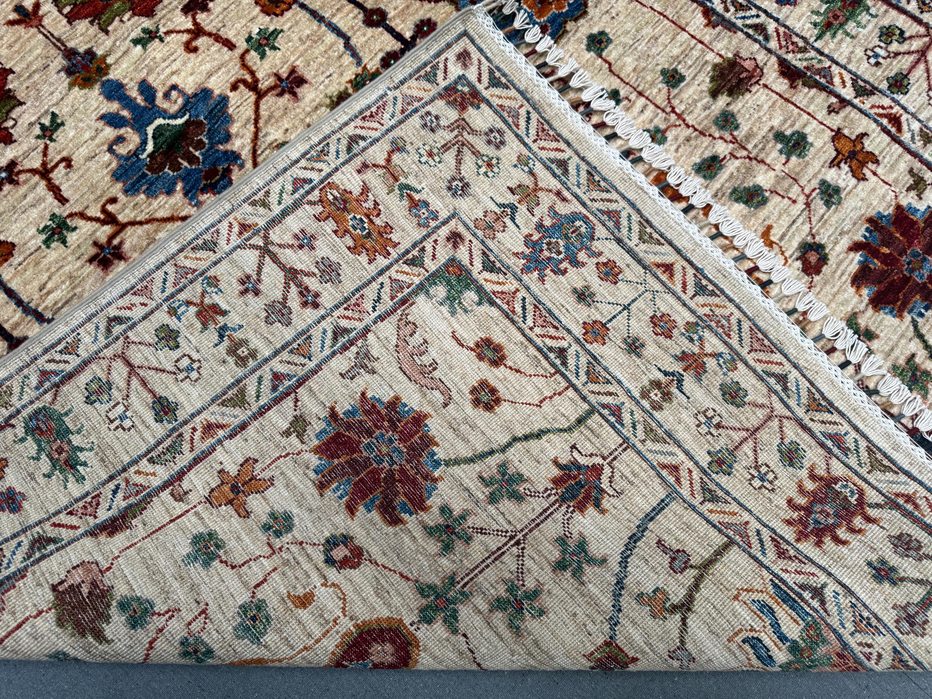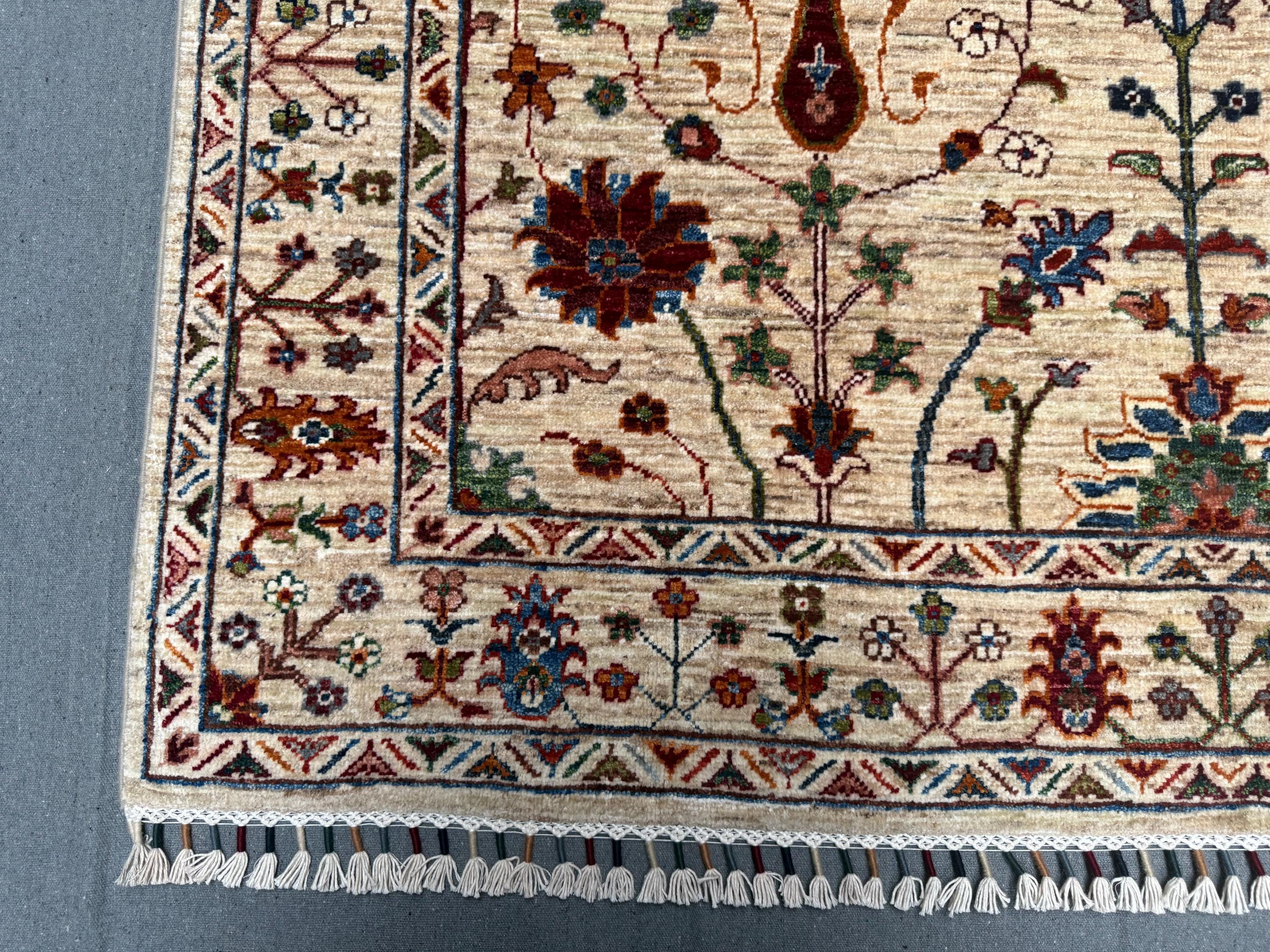 This piece is handwoven by Afghan artisans using generations-old techniques, resulting in a rug full of detail, balance, and artistic expression. The symmetrical botanical patterns, decorative borders, and soft wool texture make it perfect for creating a cozy, uplifting atmosphere.