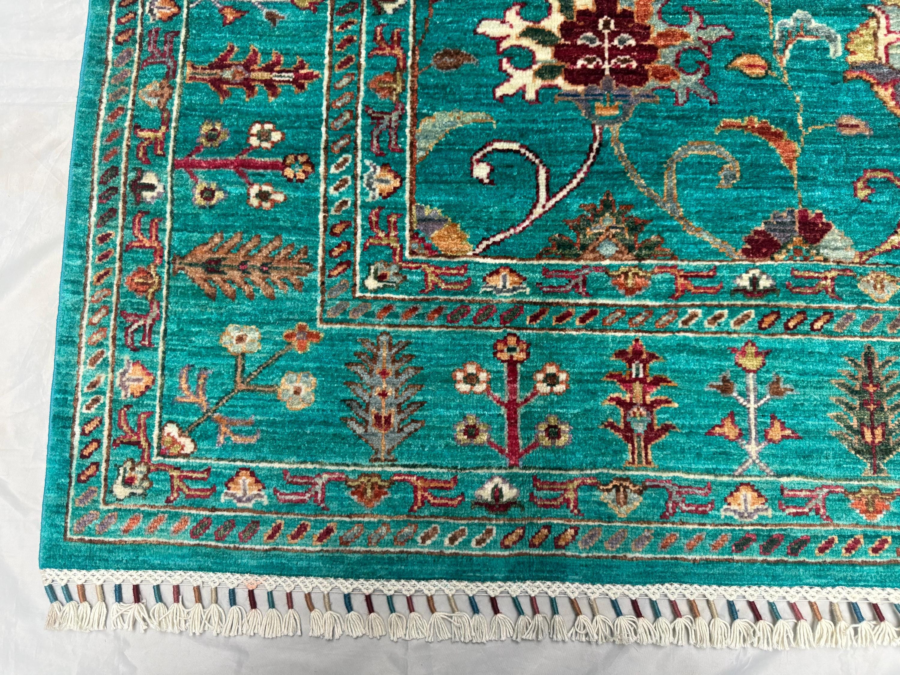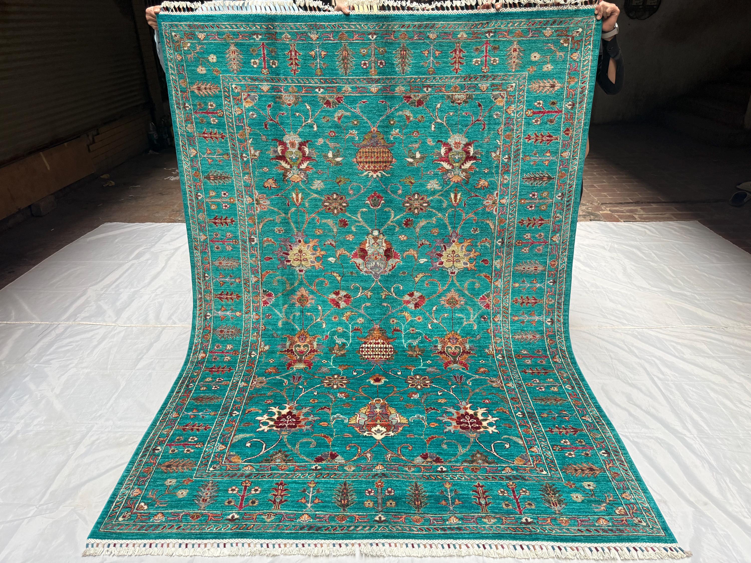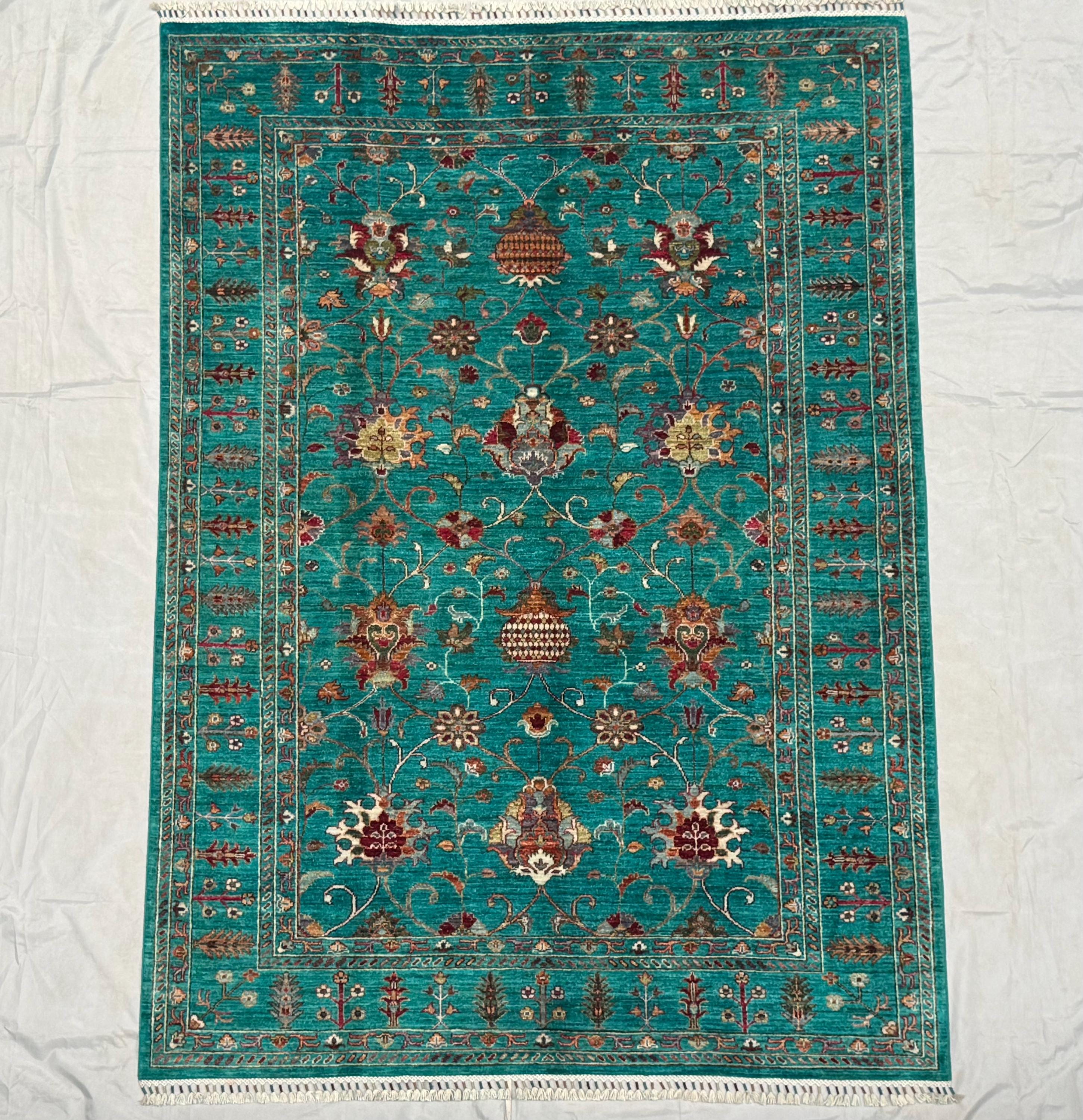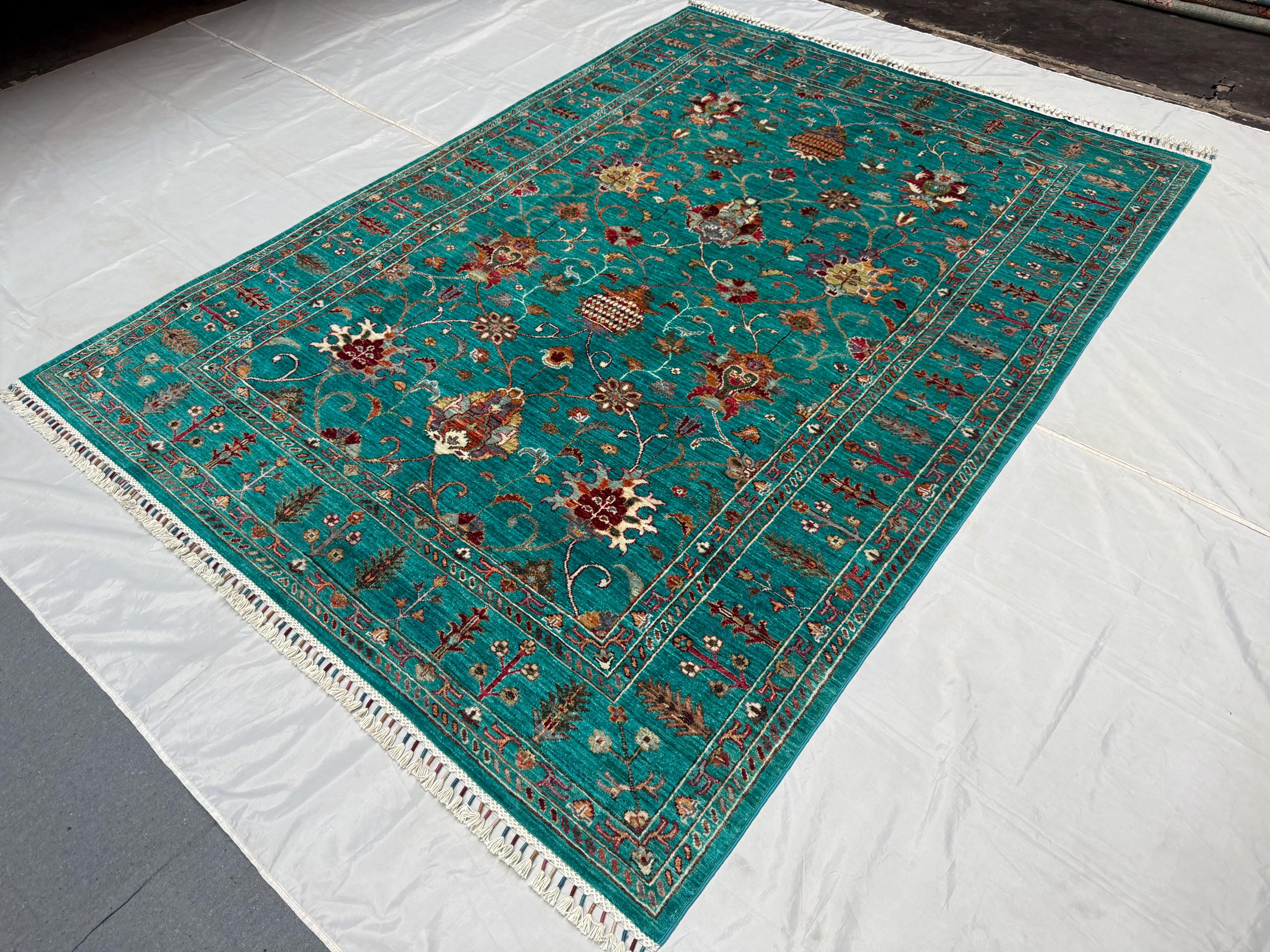Handmade Sultani Rug 5x8 ft Afghan Turquoise Wool Area Rug, Oriental Floral Carpet, Boho Living Room Decor, Traditional Handmade Rug