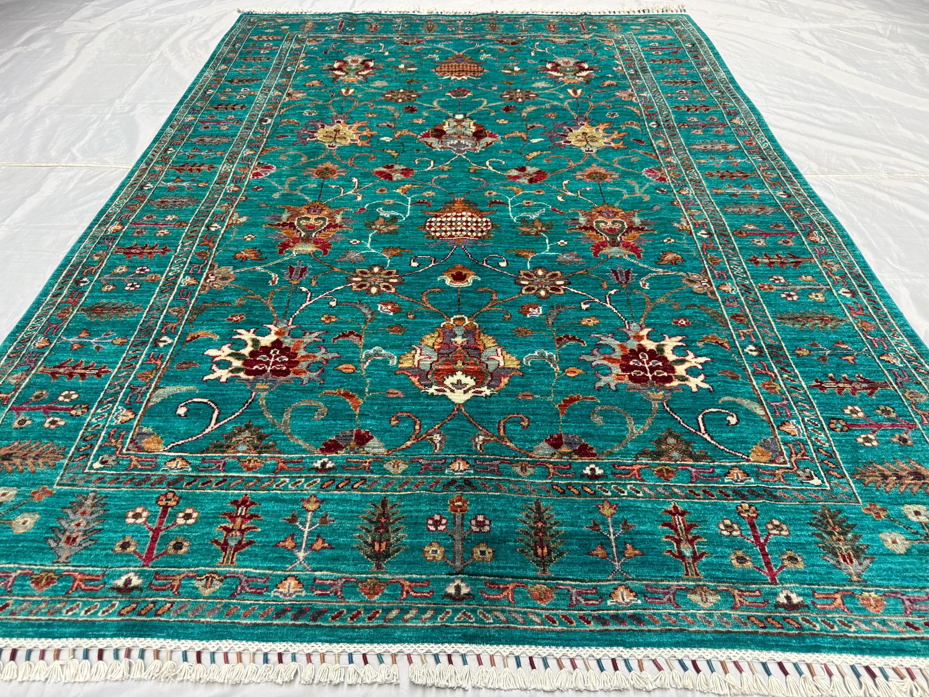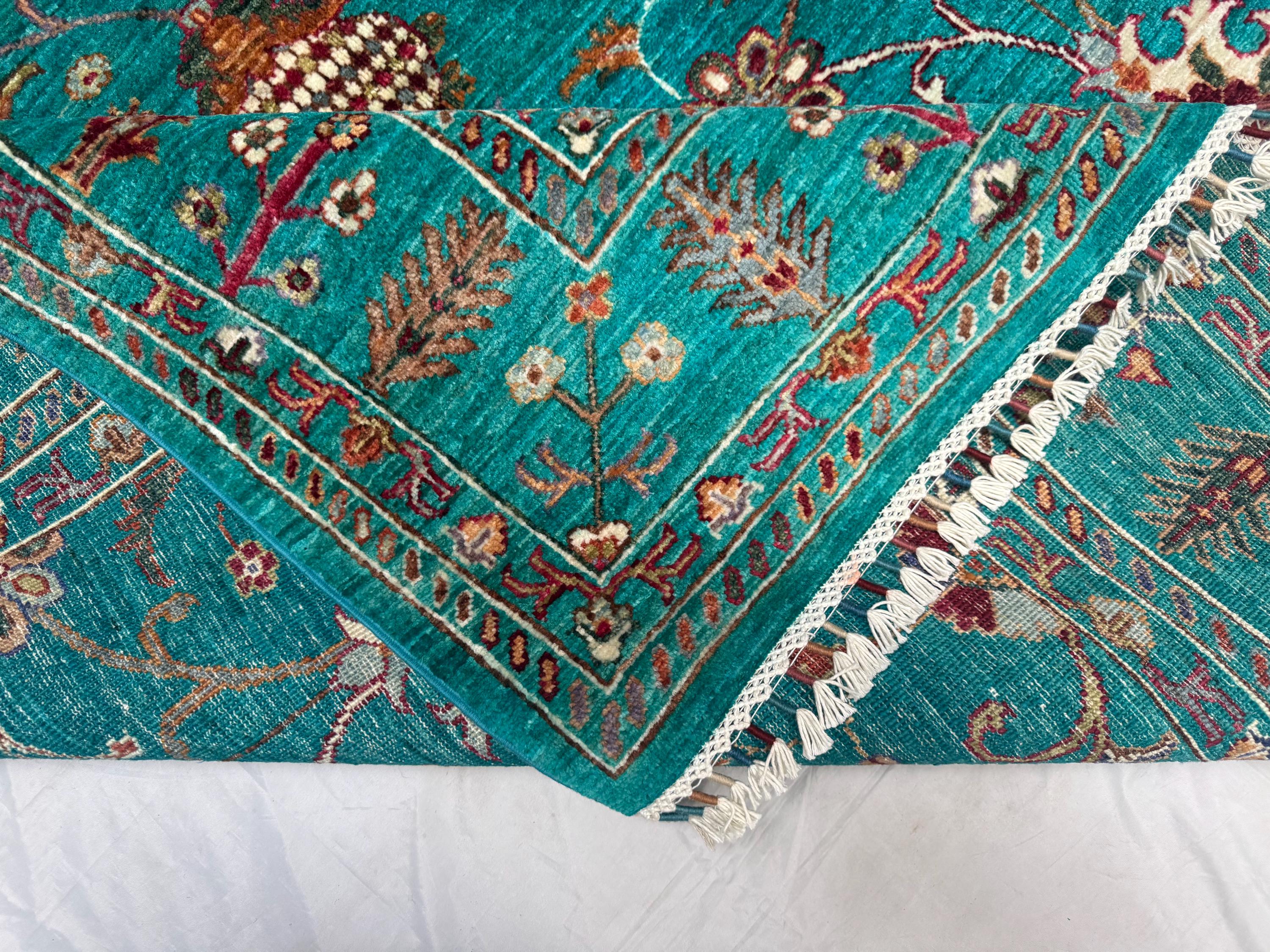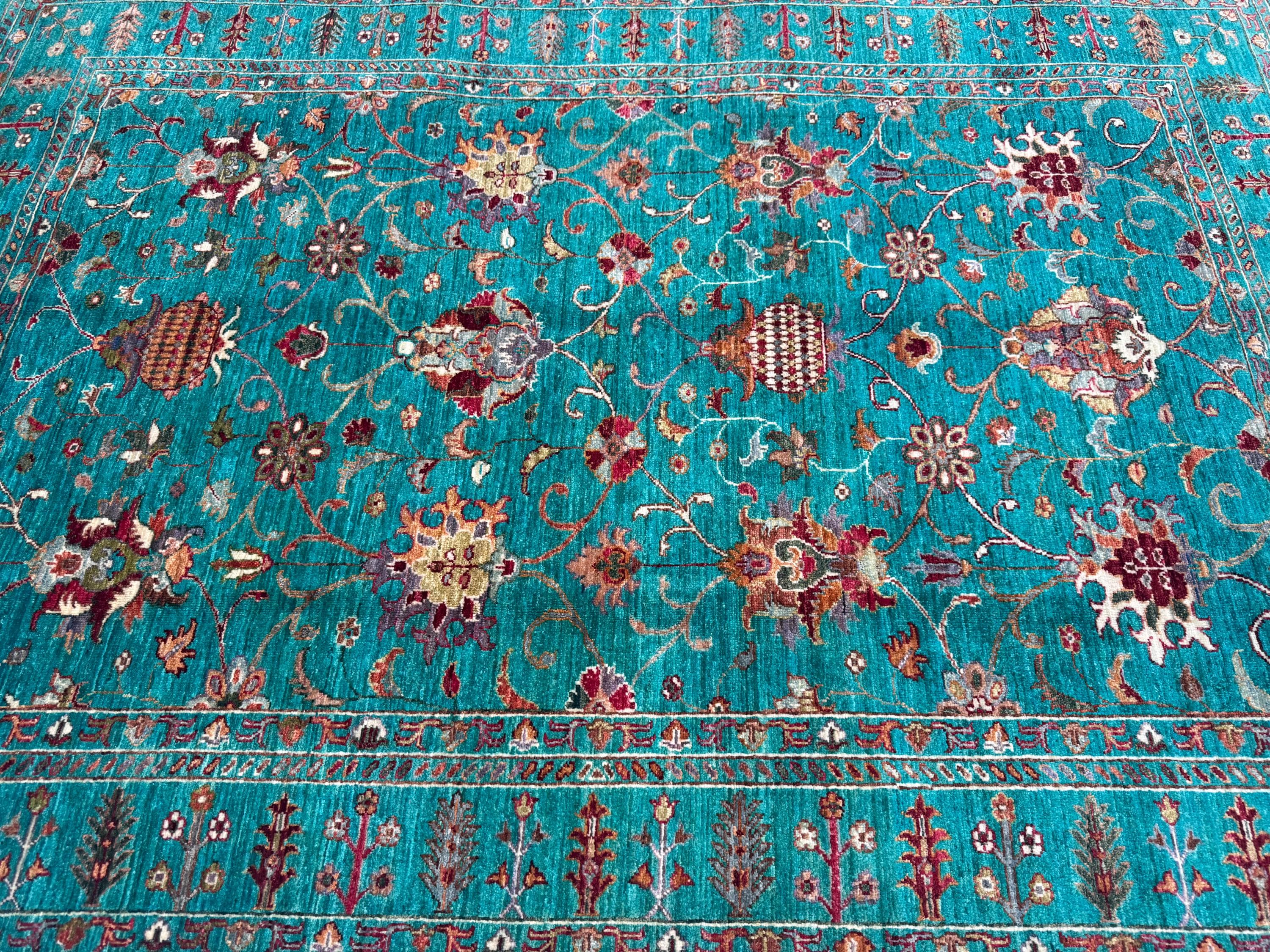 Handwoven by skilled Afghan artisans, this rug features a classic Sultani layout with decorative borders, botanical flourishes, and elegant symmetry. The bold yet soothing turquoise hue makes this piece perfect for modern, boho, eclectic, and classic interiors—adding depth, personality, and charm.