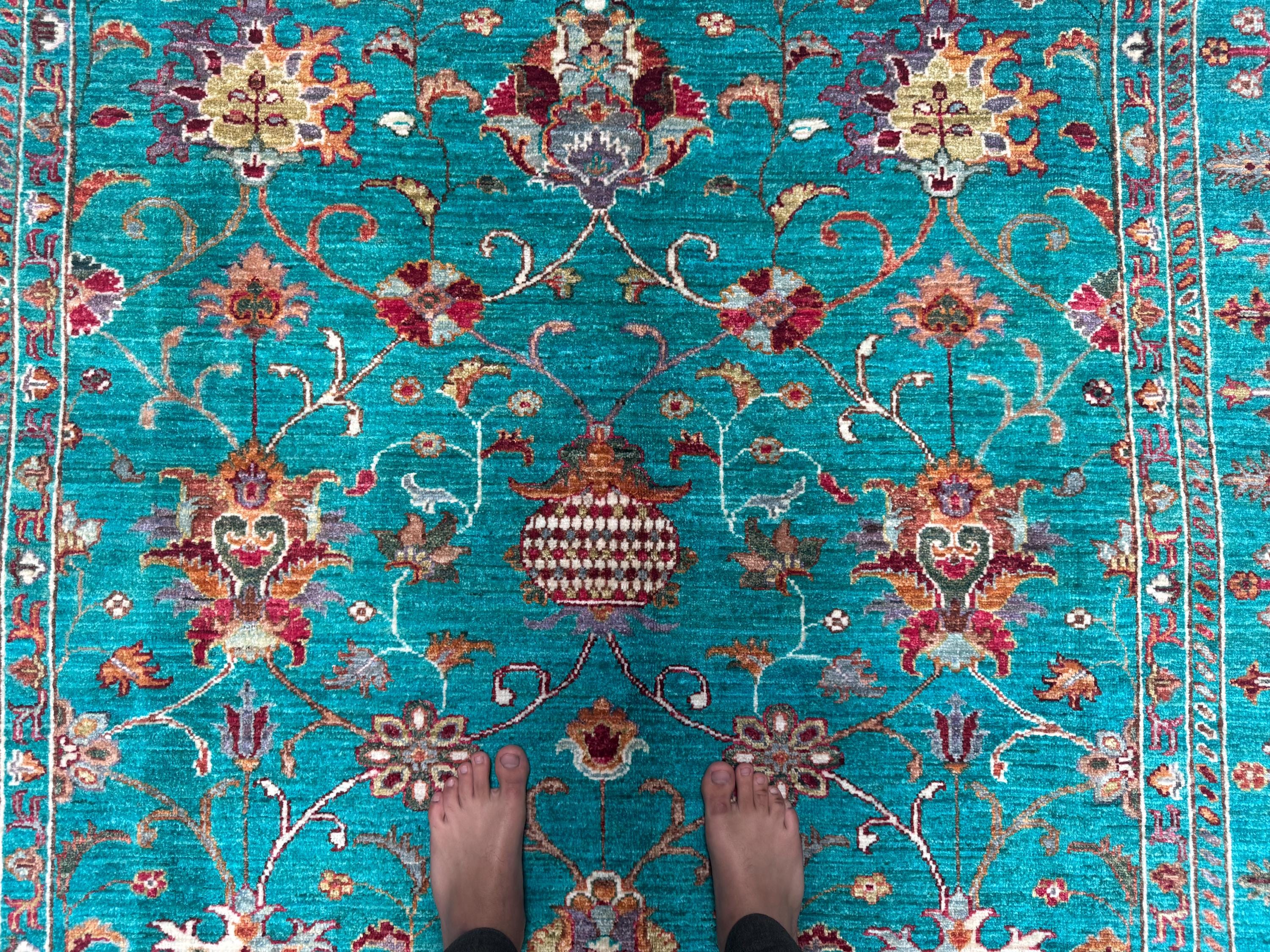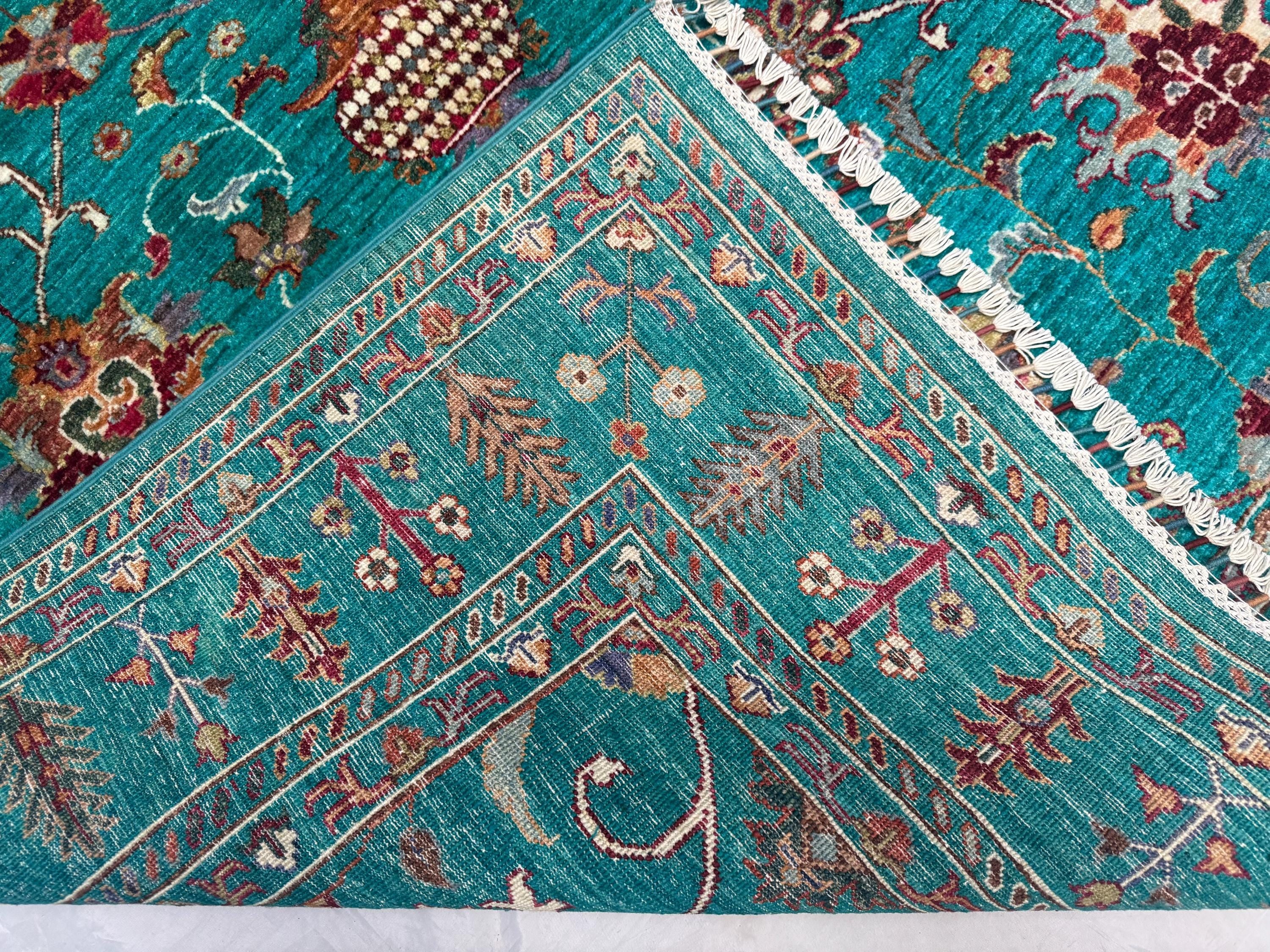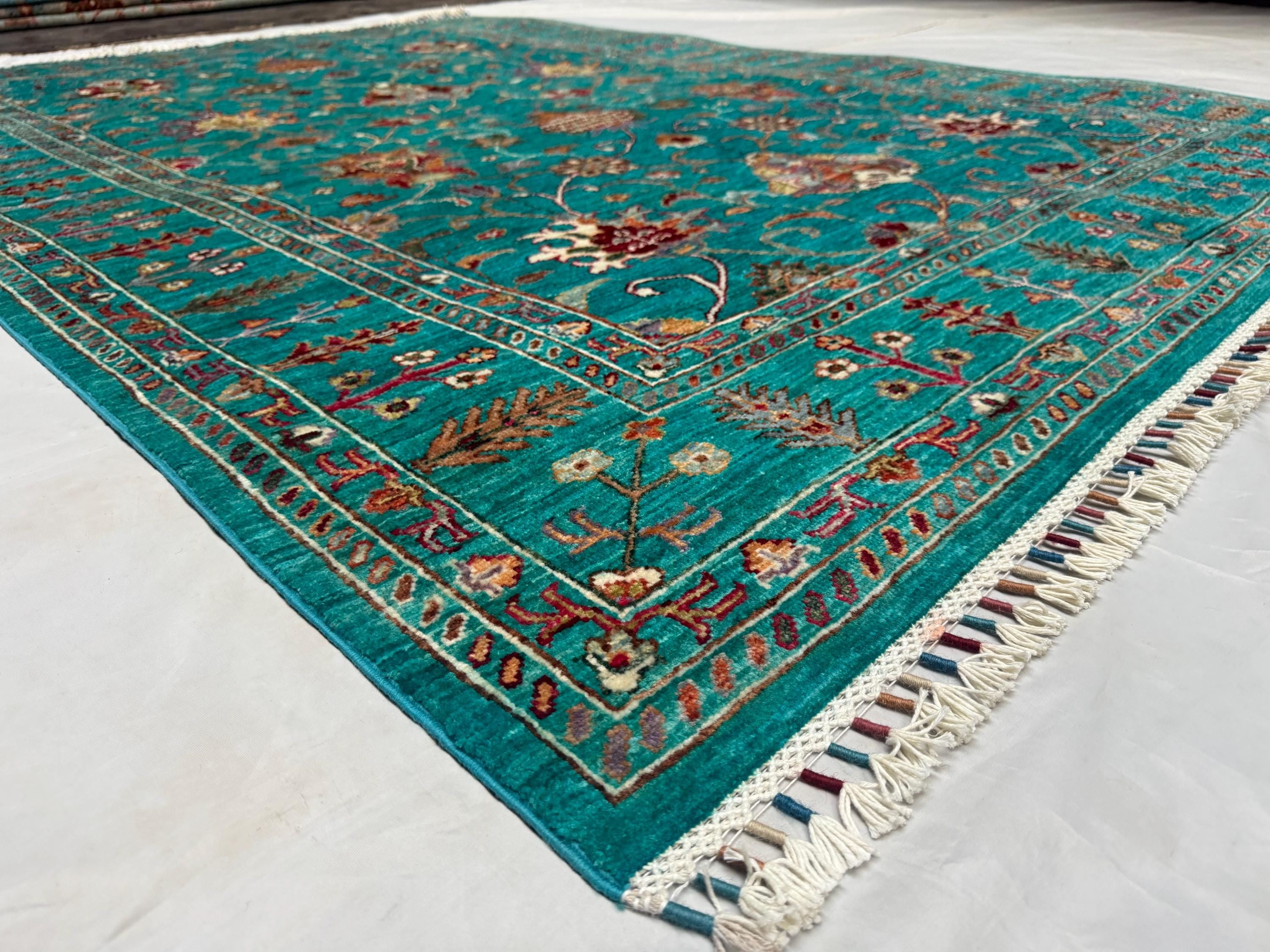 Handwoven by skilled Afghan artisans, this rug features a classic Sultani layout with decorative borders, botanical flourishes, and elegant symmetry. The bold yet soothing turquoise hue makes this piece perfect for modern, boho, eclectic, and classic interiors—adding depth, personality, and charm.