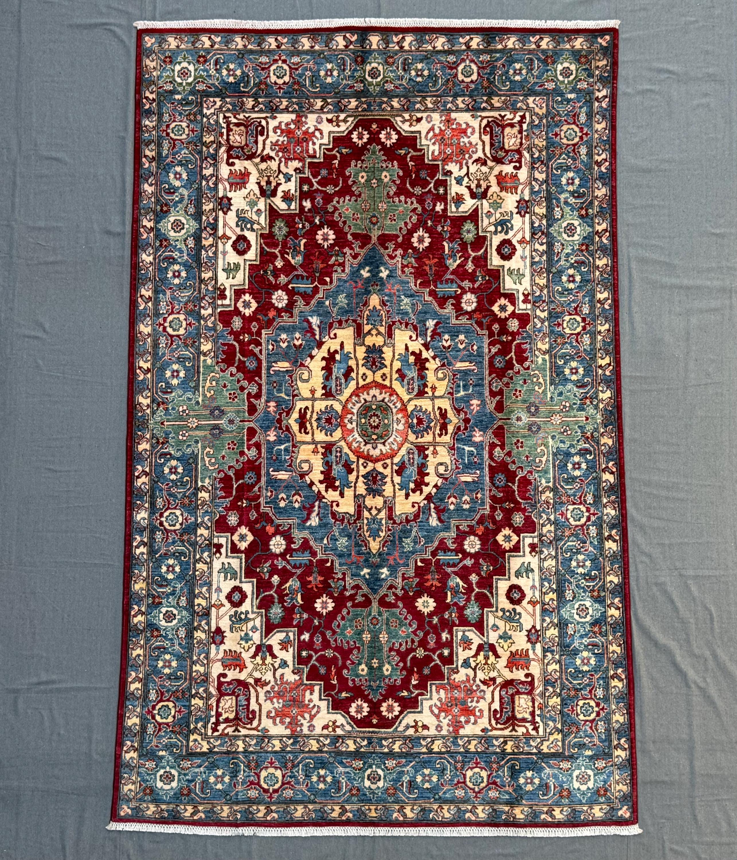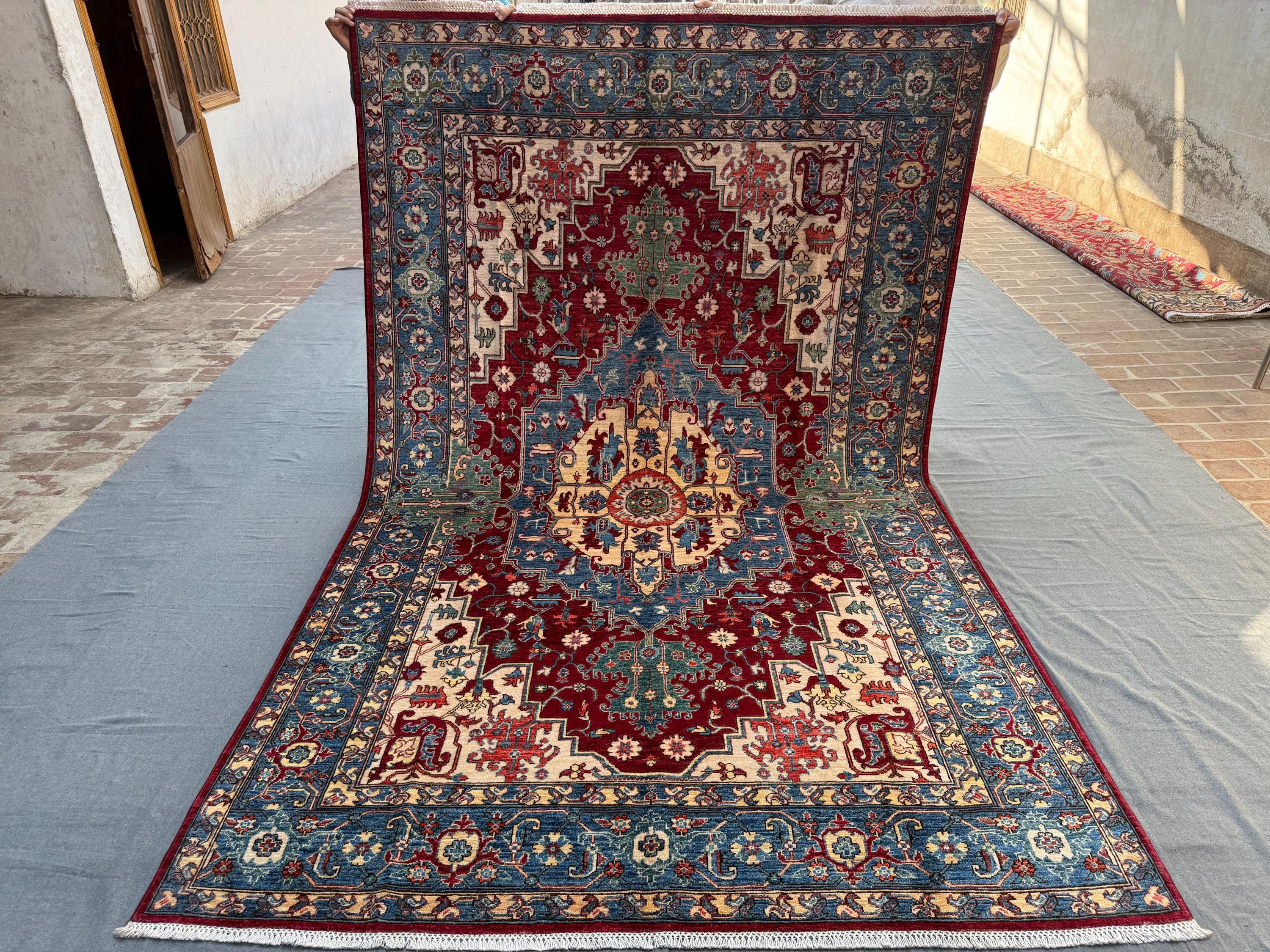 Burgundy & Blue Heriz Rug 5x10 ft Handmade Wool Medallion Carpet with Ivory Accents, Tribal Geometric Floral Area Rug