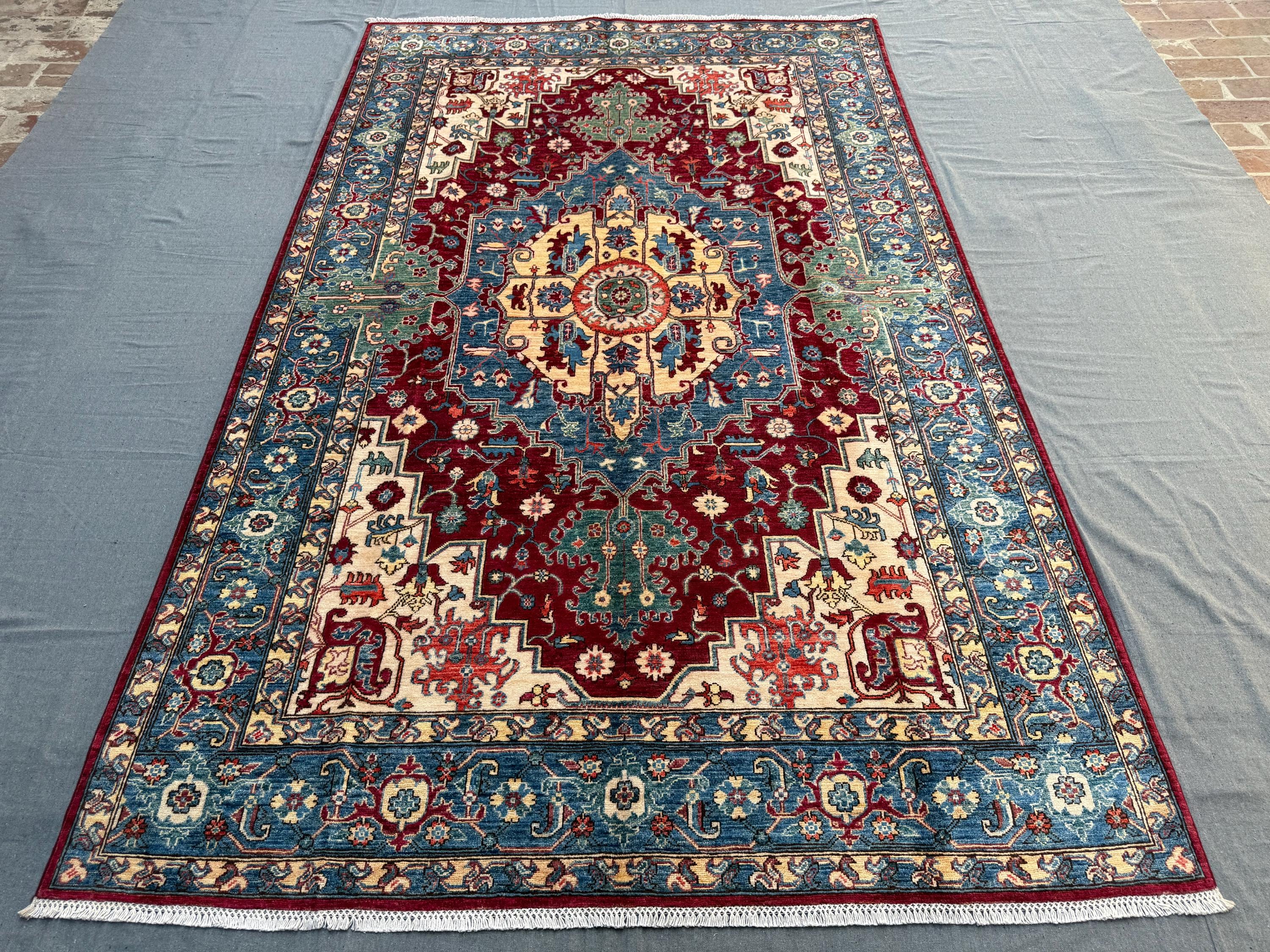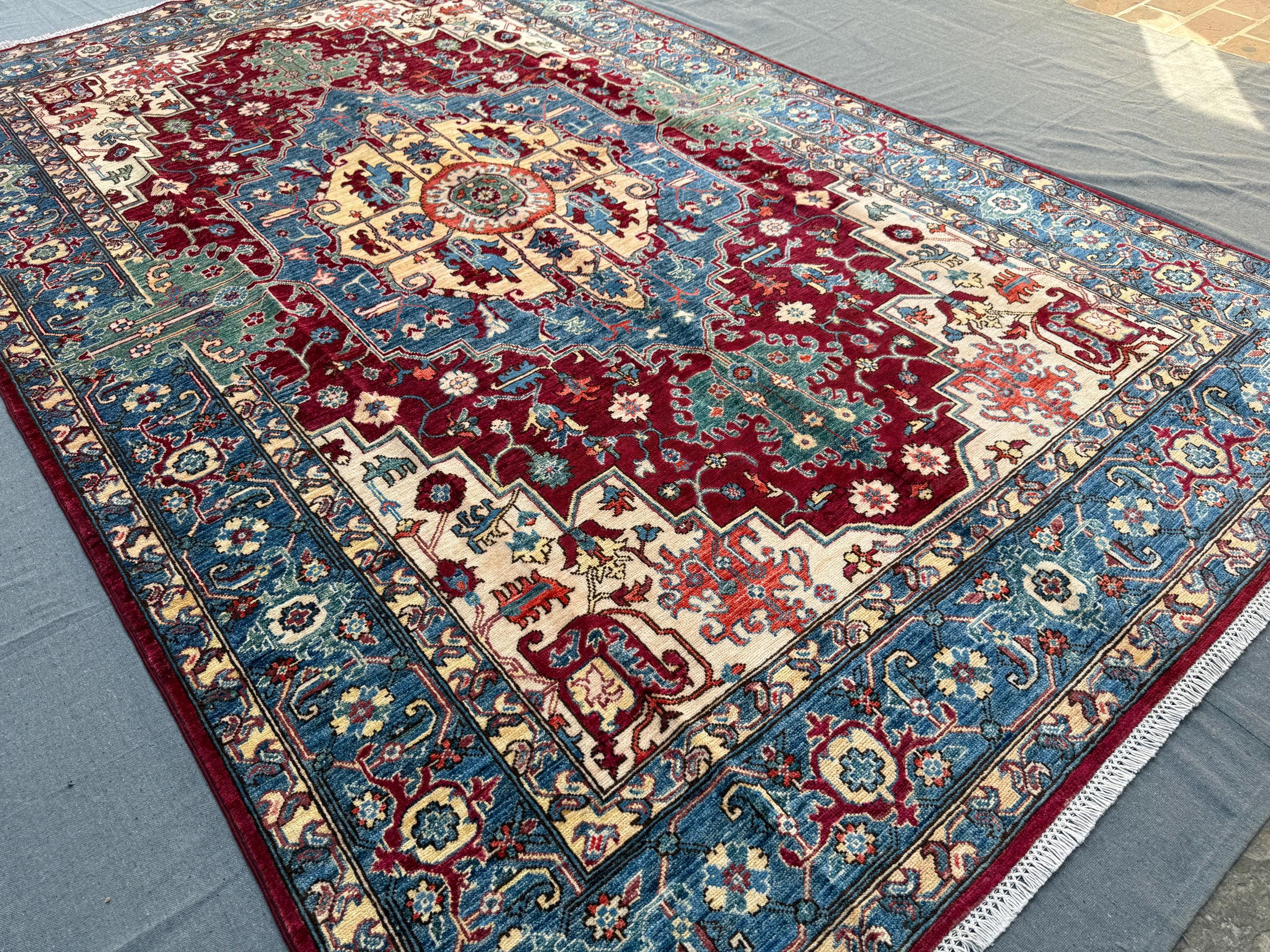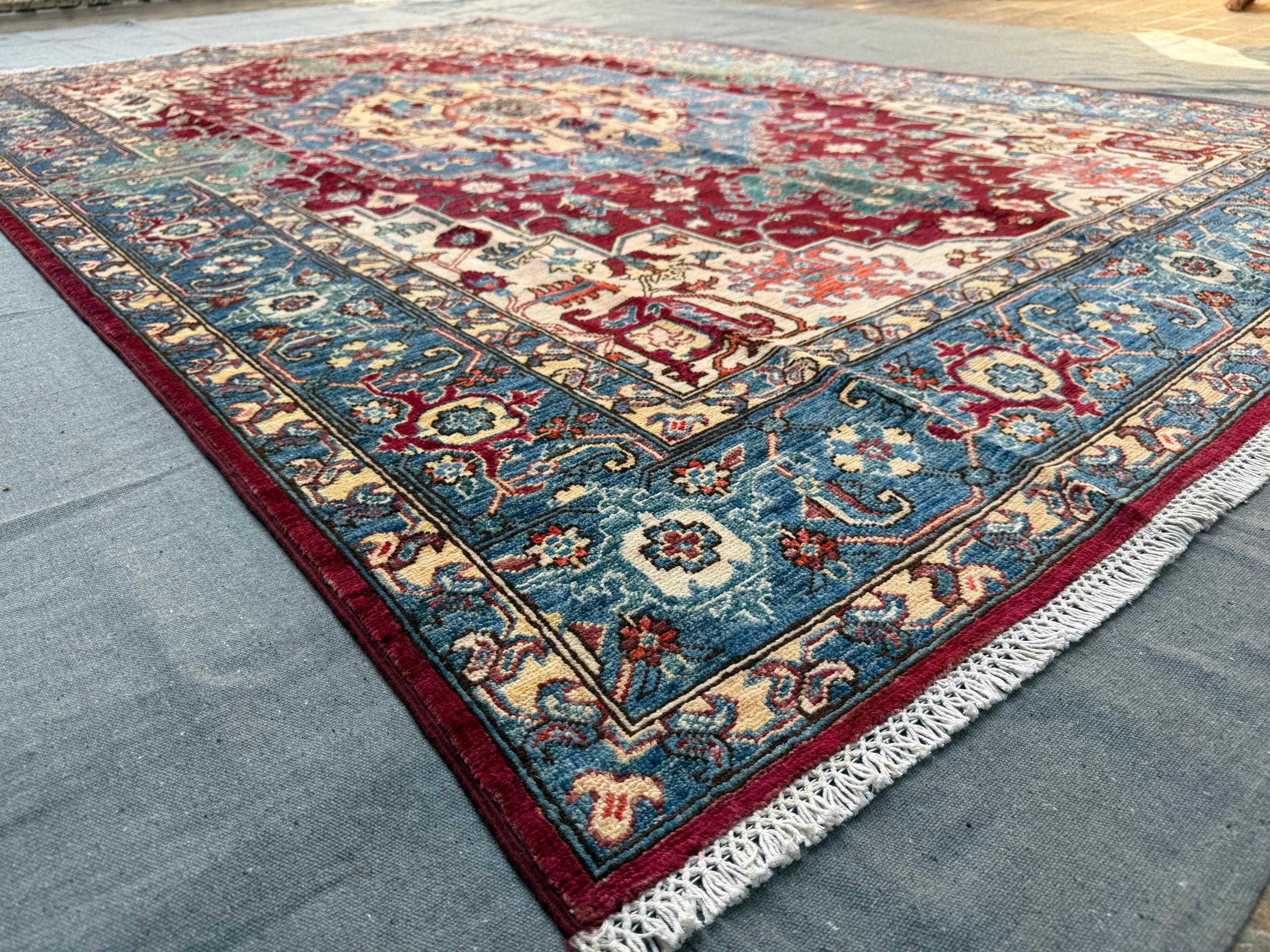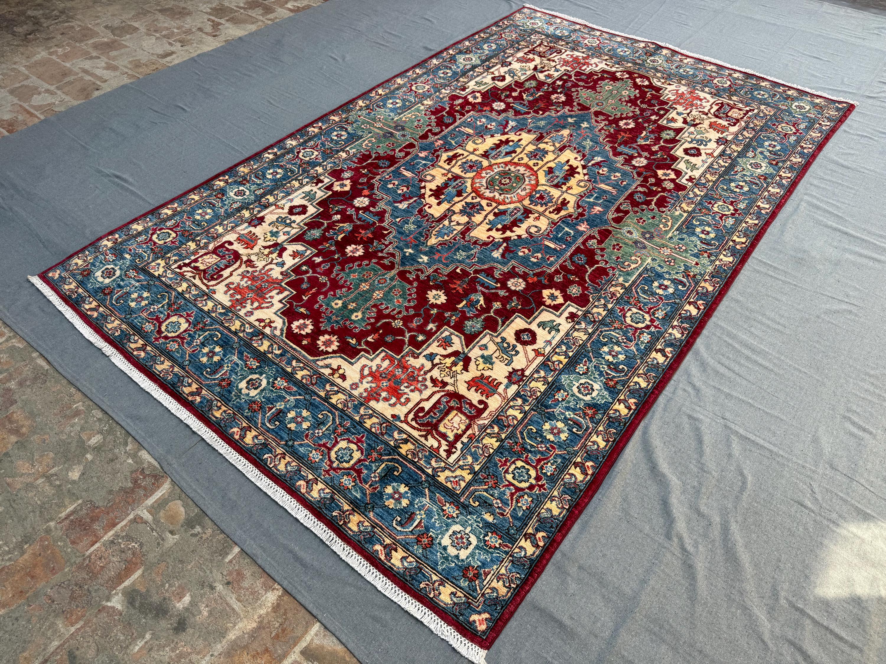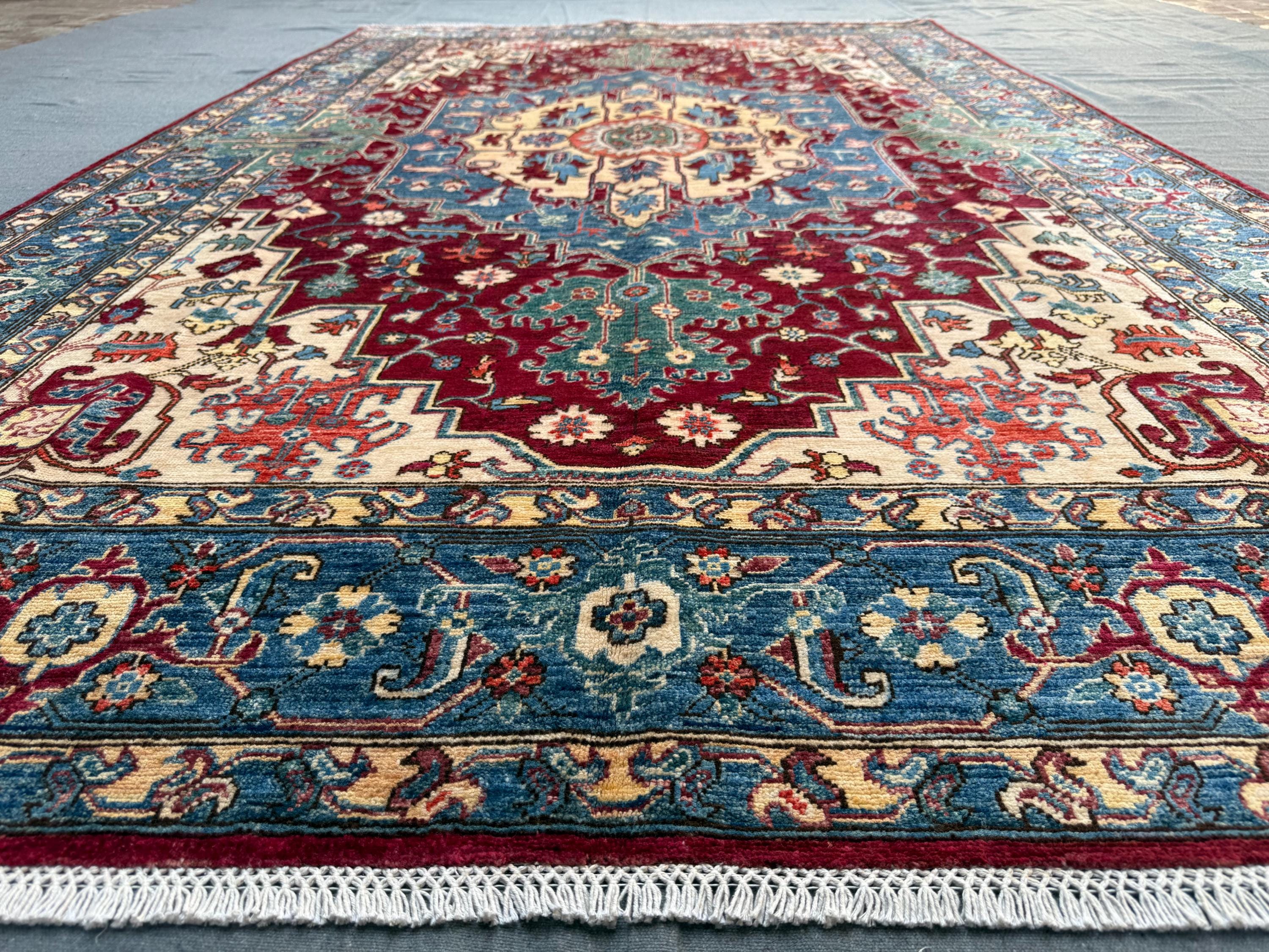 Bring bold character and timeless artistry to your home with this Handmade Heriz Wool Rug, featuring a deep burgundy field paired with striking blue, ivory, and green accents. The detailed central medallion, geometric florals, and crisp tribal motifs create a rich, dramatic look that instantly elevates any interior.