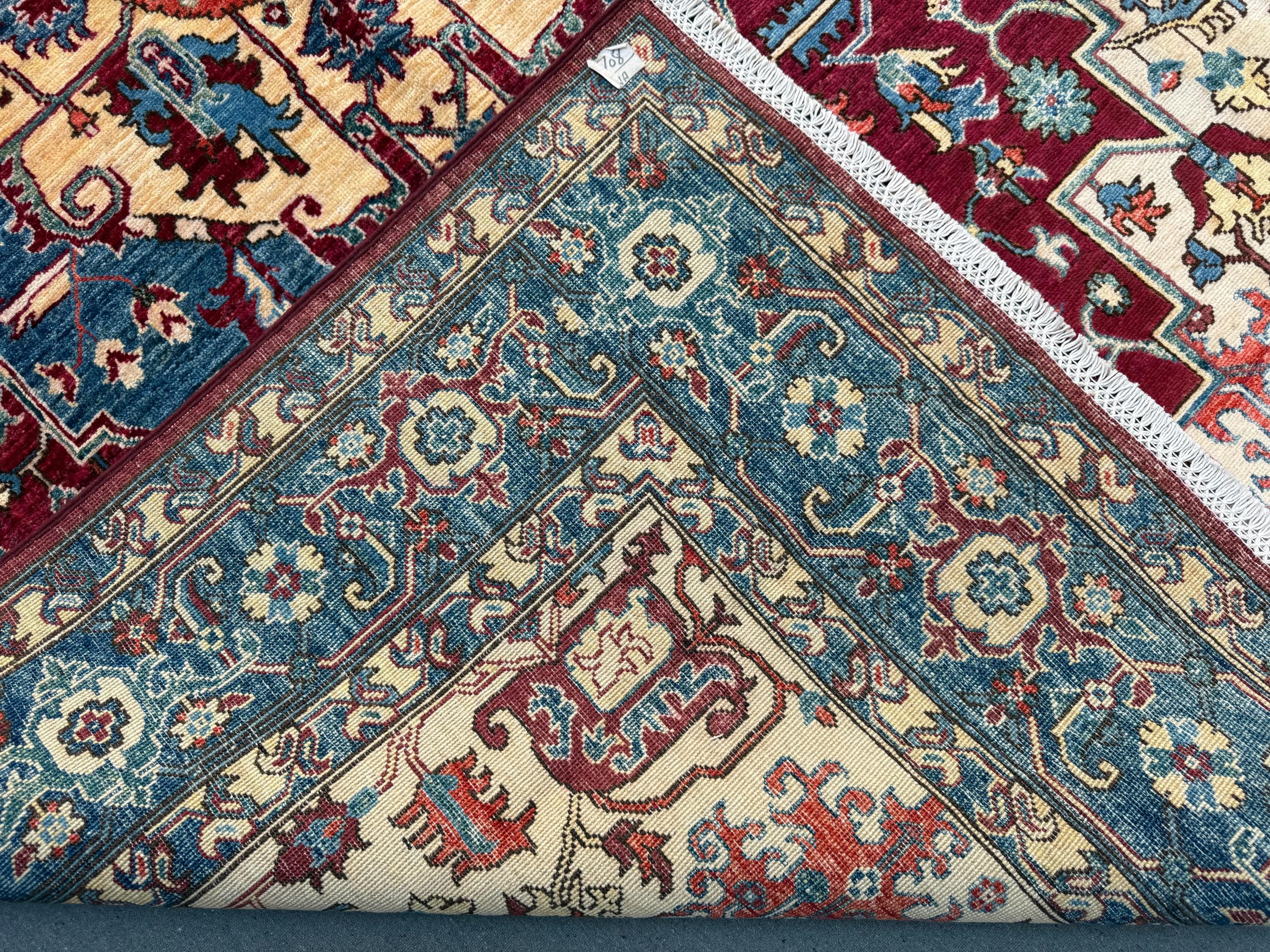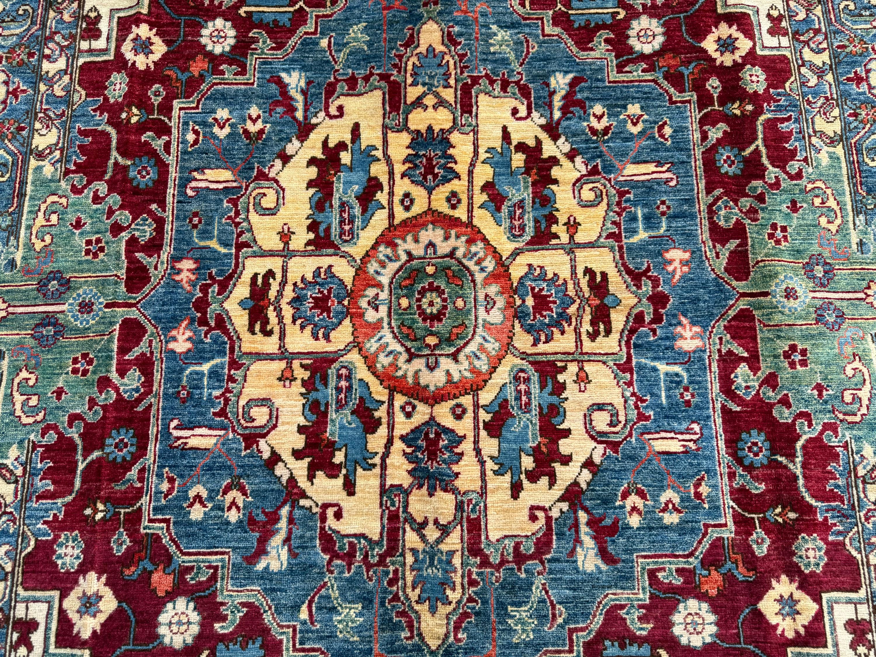This rug showcases classic Heriz symmetry with layered borders, fine line detailing, and beautifully contrasting colors. Crafted from high-quality wool, it offers durability, softness, and a warm presence perfect for living rooms, bedrooms, dining areas, offices, or curated interior spaces.