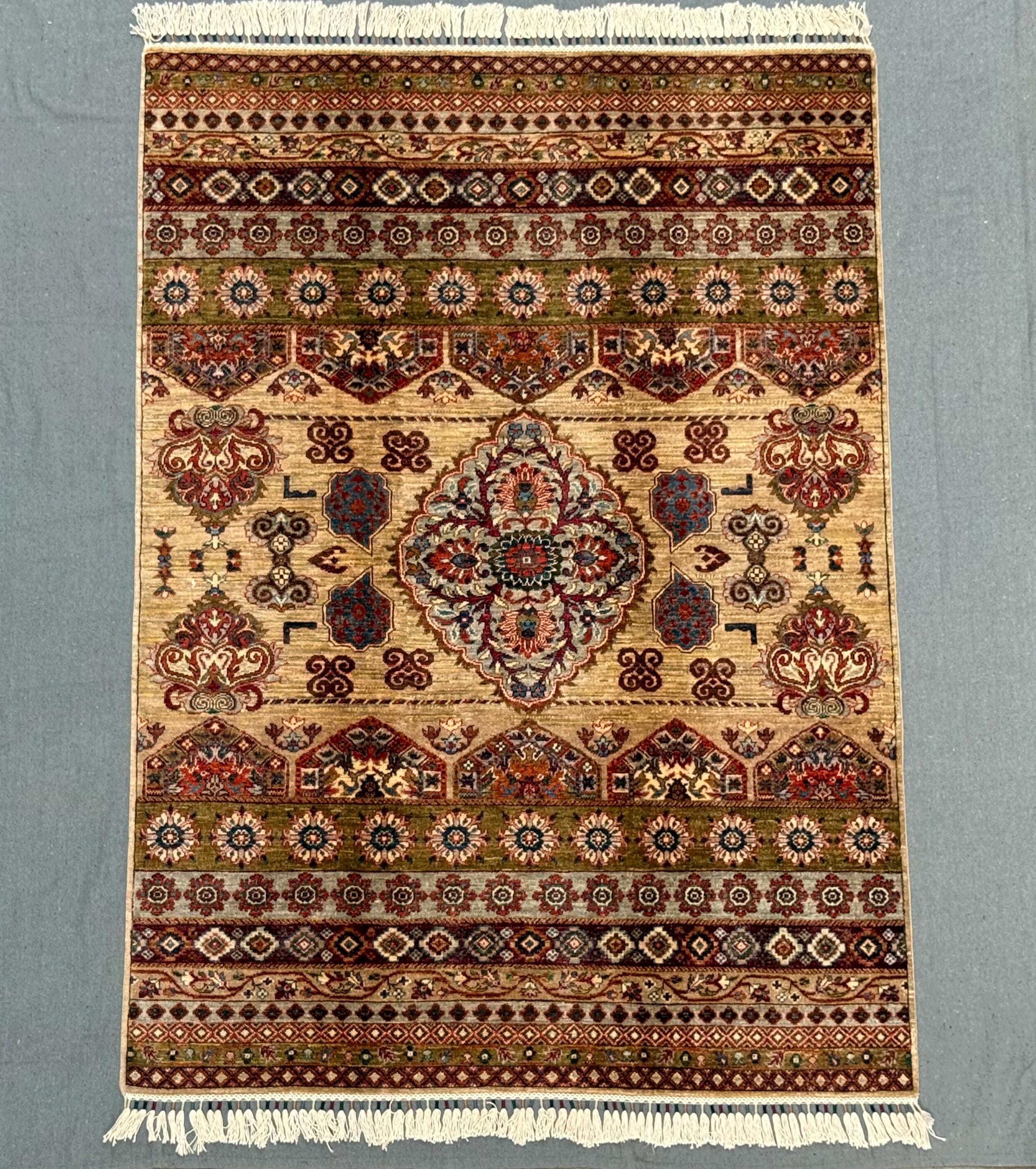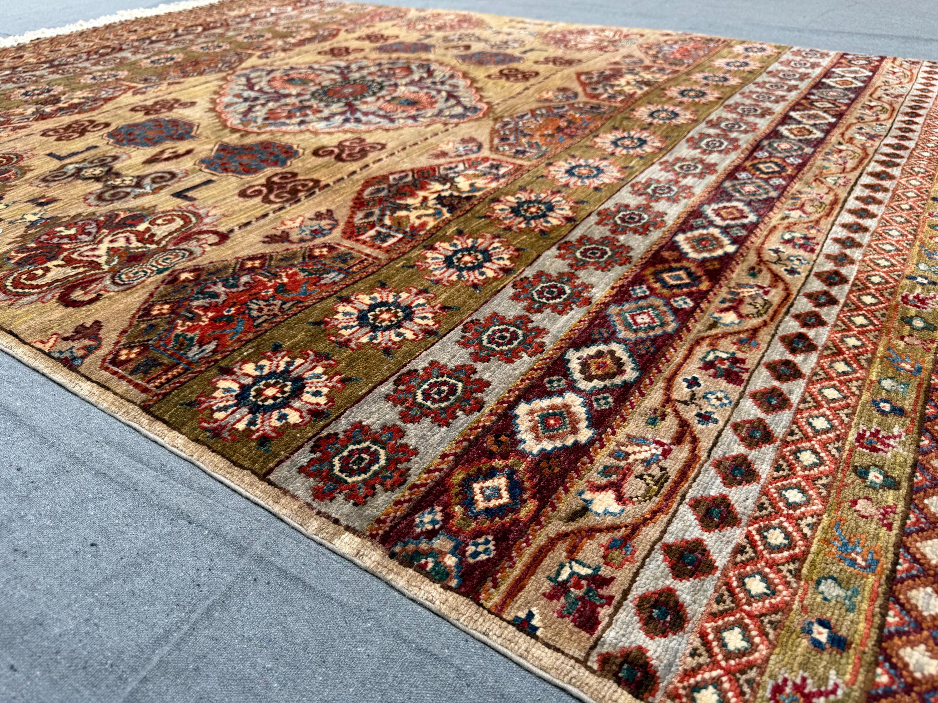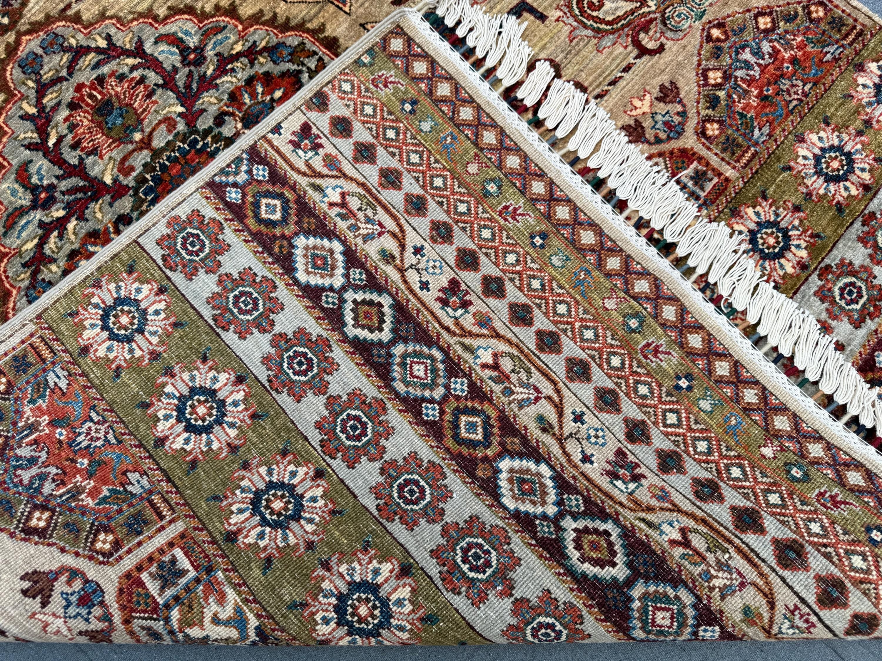 This Khorji handmade wool rug is a fine example of traditional artistry, featuring a bold central floral medallion on a warm beige field, framed by intricate floral borders and ornamental geometric bands. Its blend of earthy tones and rich reds makes it a versatile statement piece for any space.