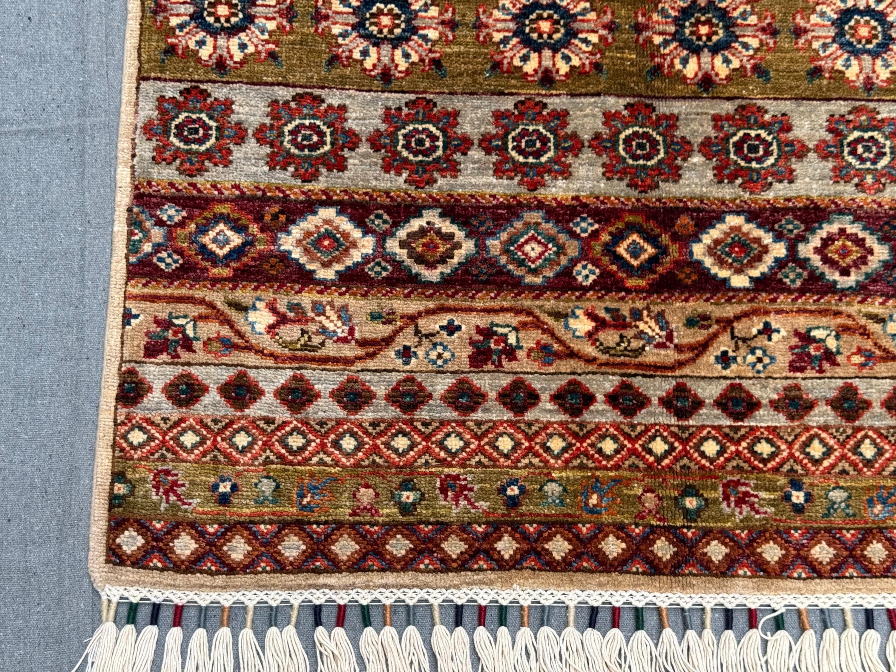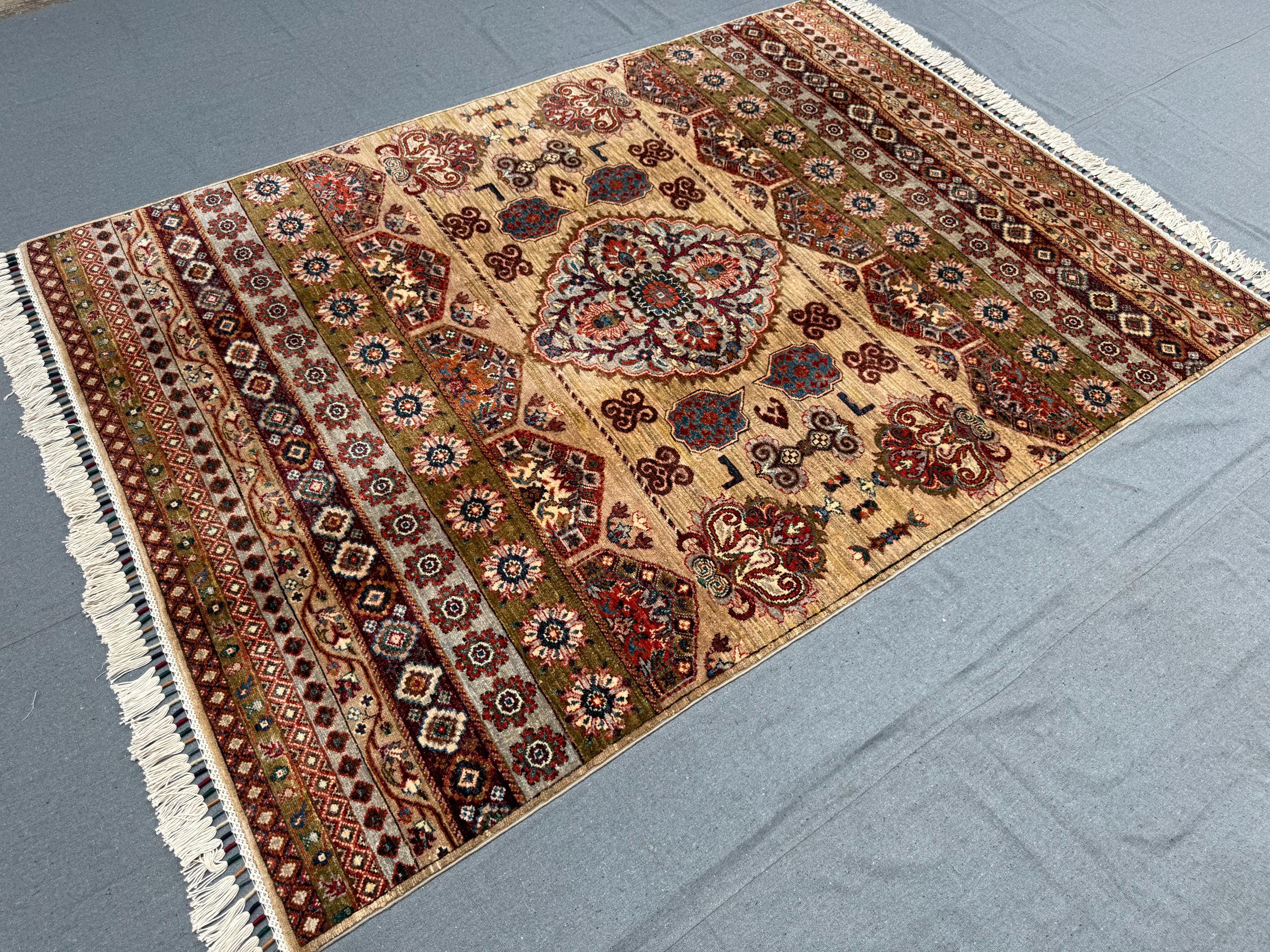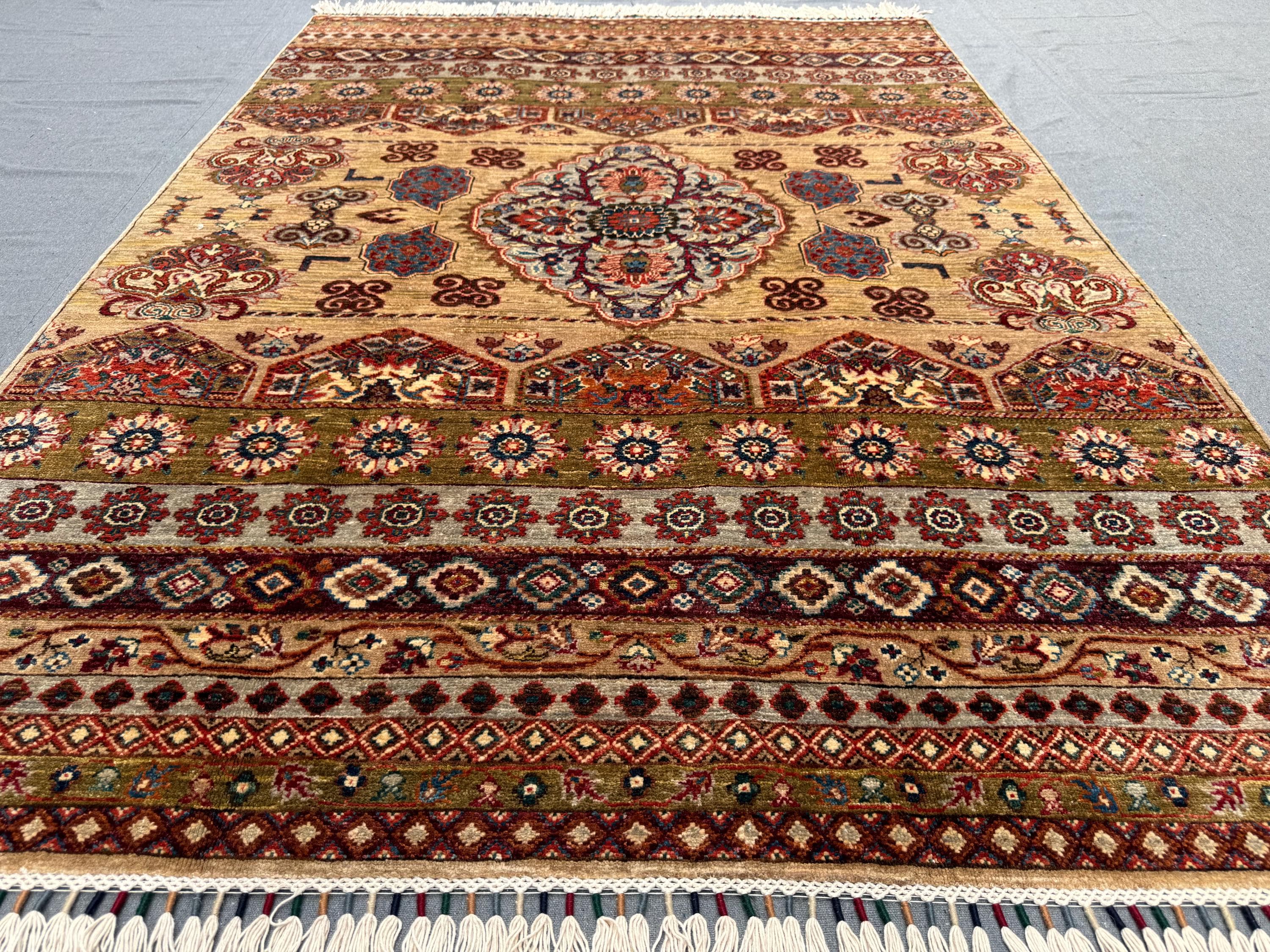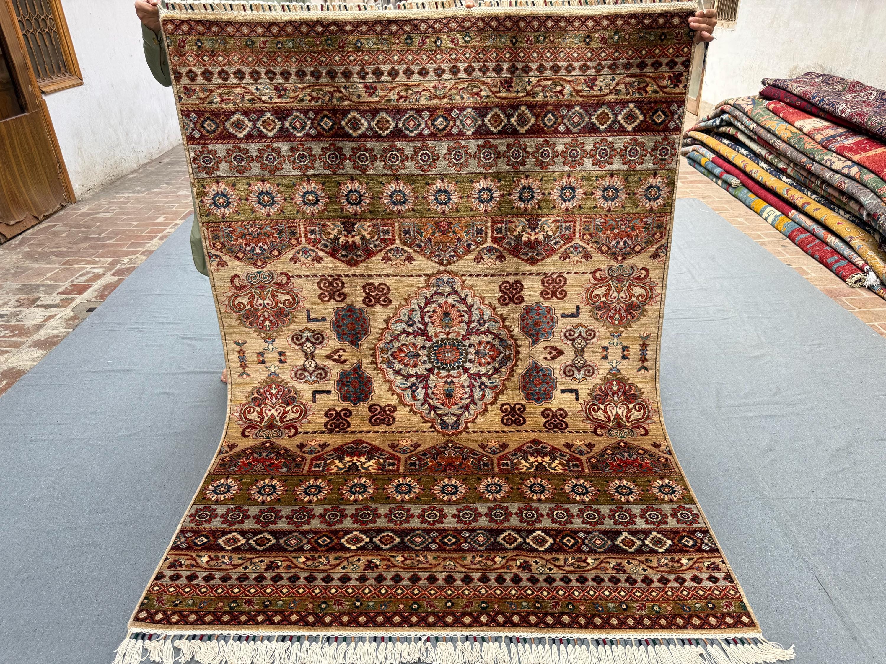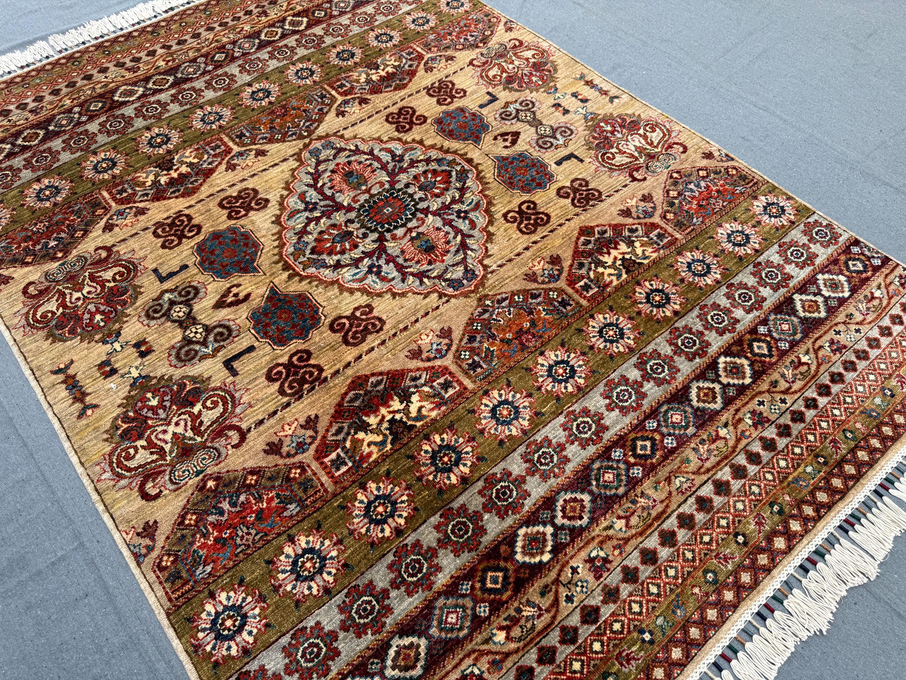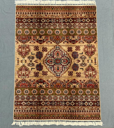Handwoven using 100% handspun wool and dyed with natural vegetable colors, this rug offers durability and timeless character. Its approx. 5x7 ft size makes it suitable for medium-sized rooms, such as living rooms, bedrooms, or dining areas.