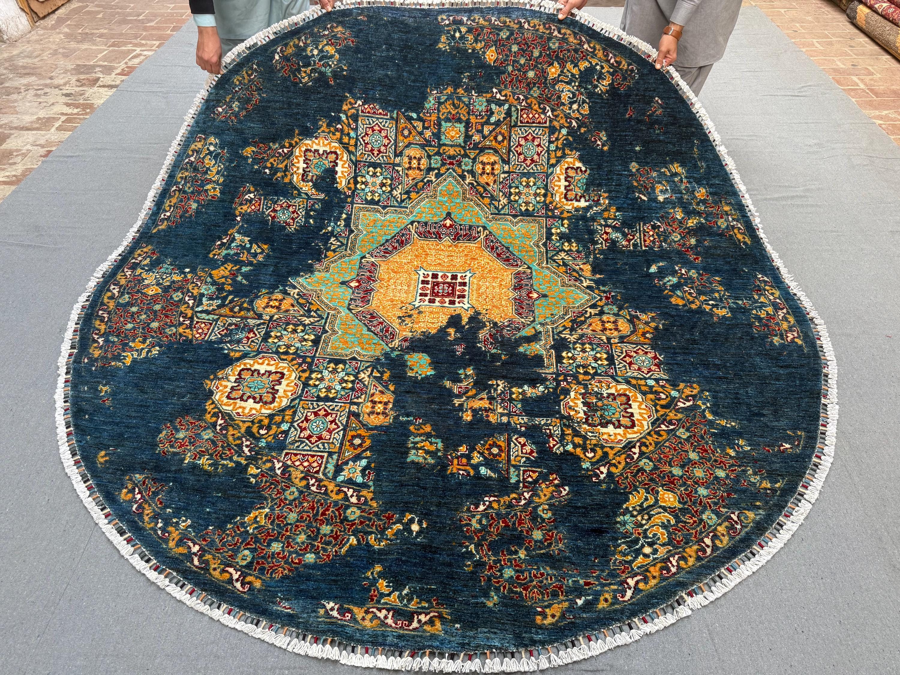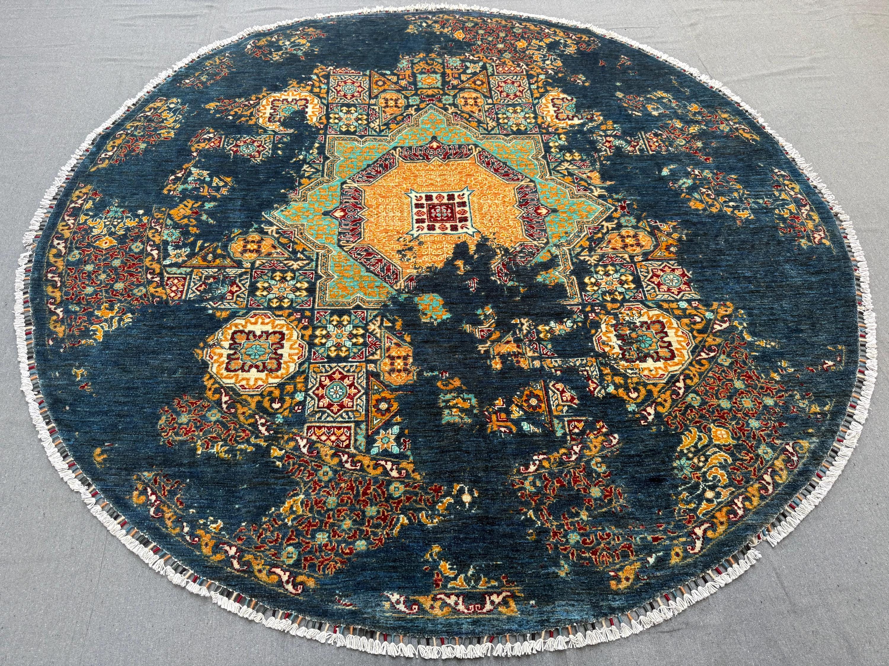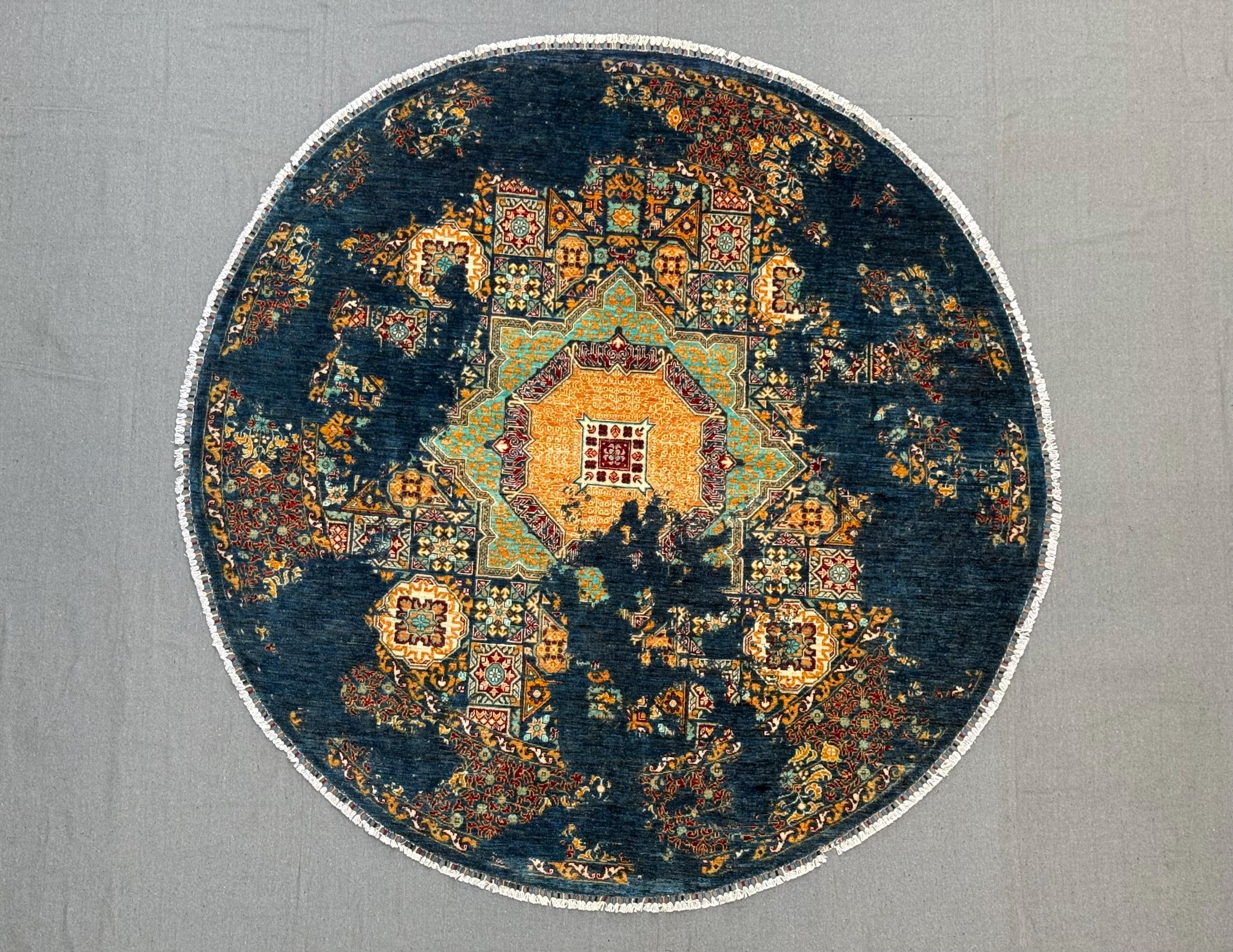 Handmade Round Mamluk Rug 7x7 ft Navy & Gold Geometric Wool Area Carpet Circular Medallion Design for Living Room Home Decor