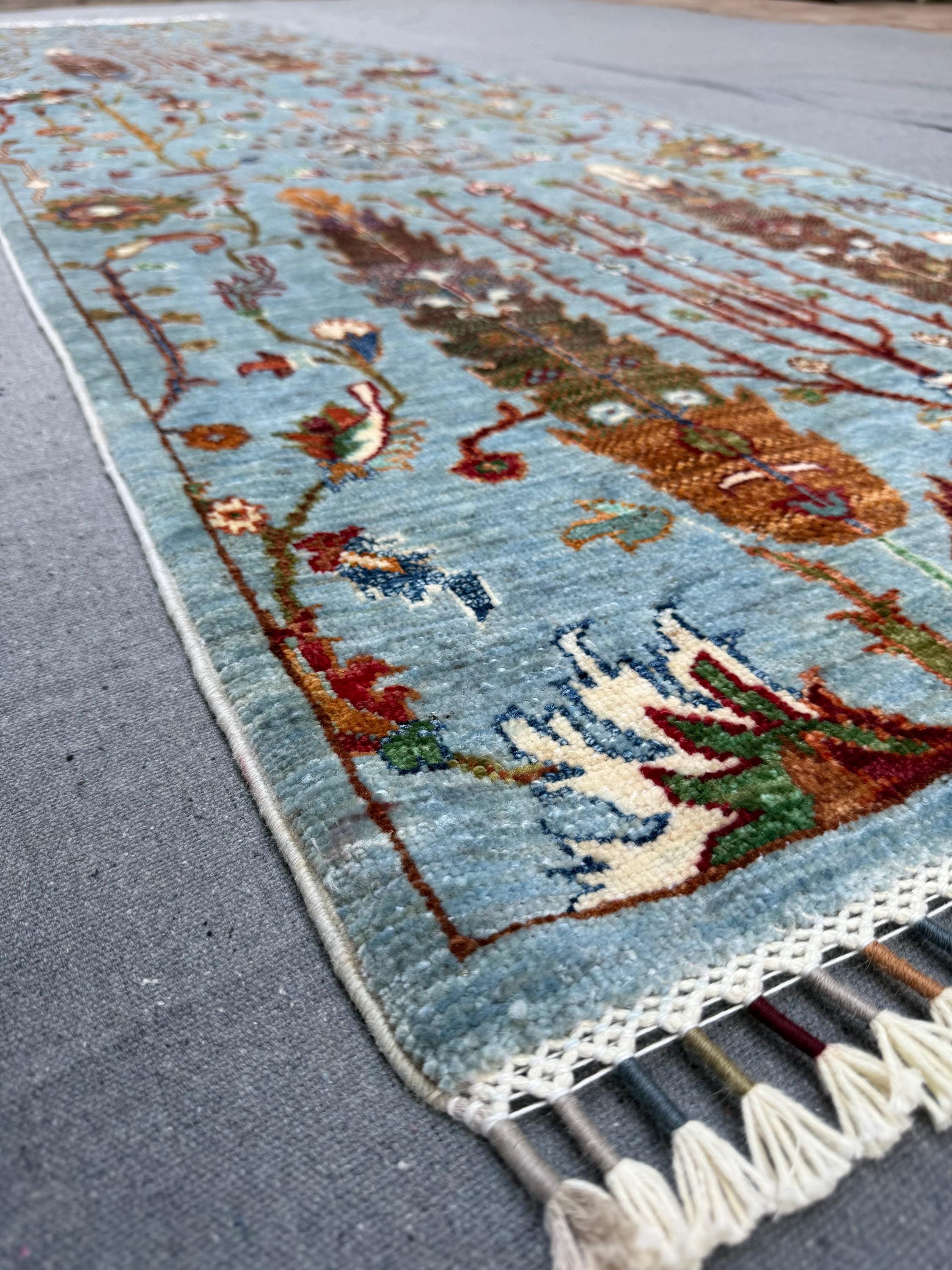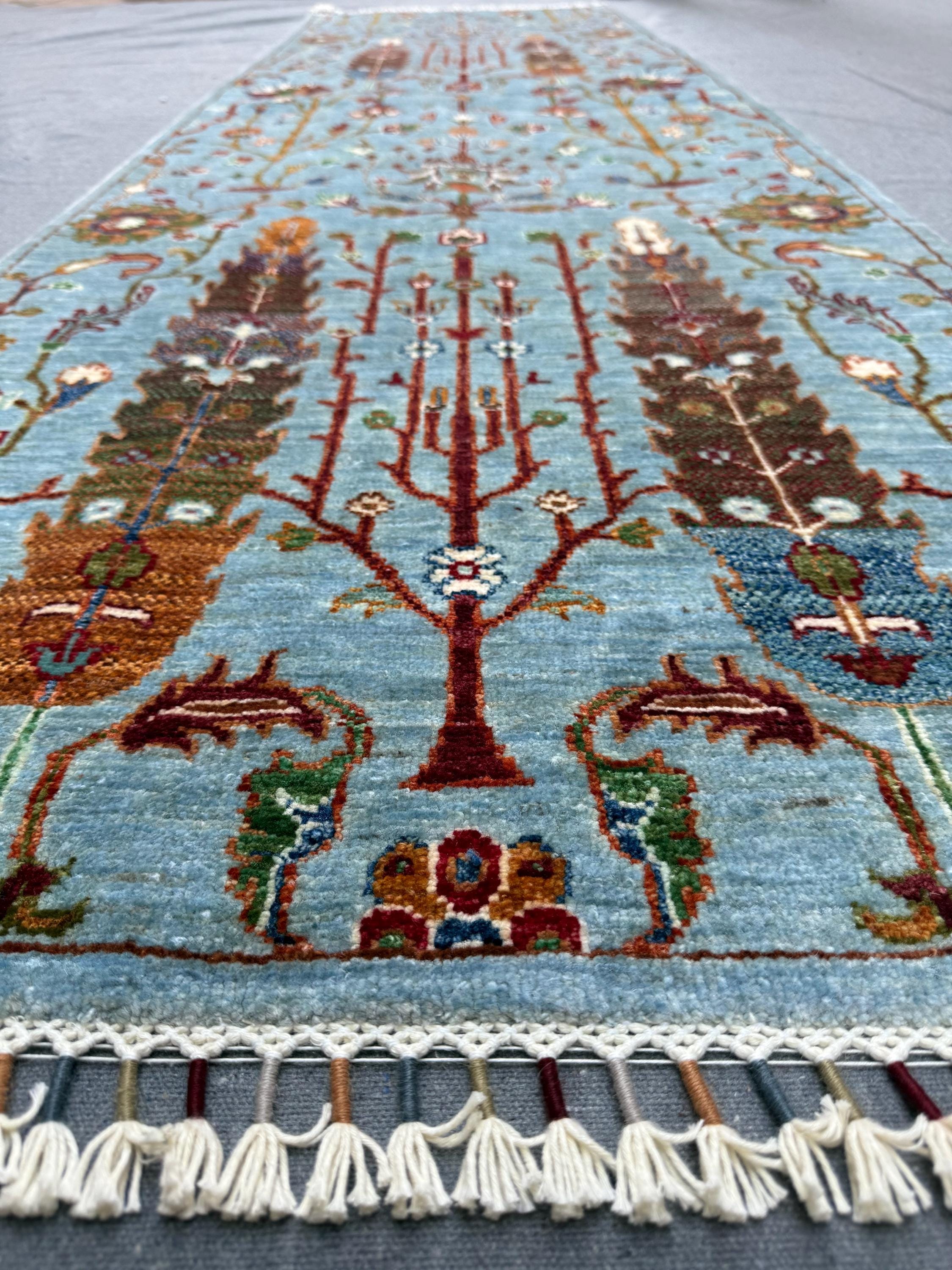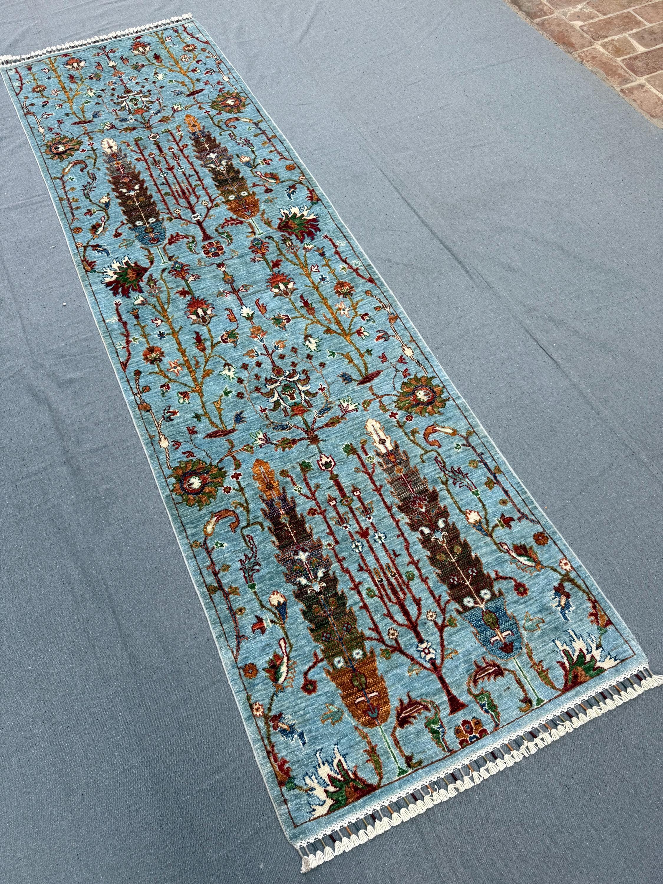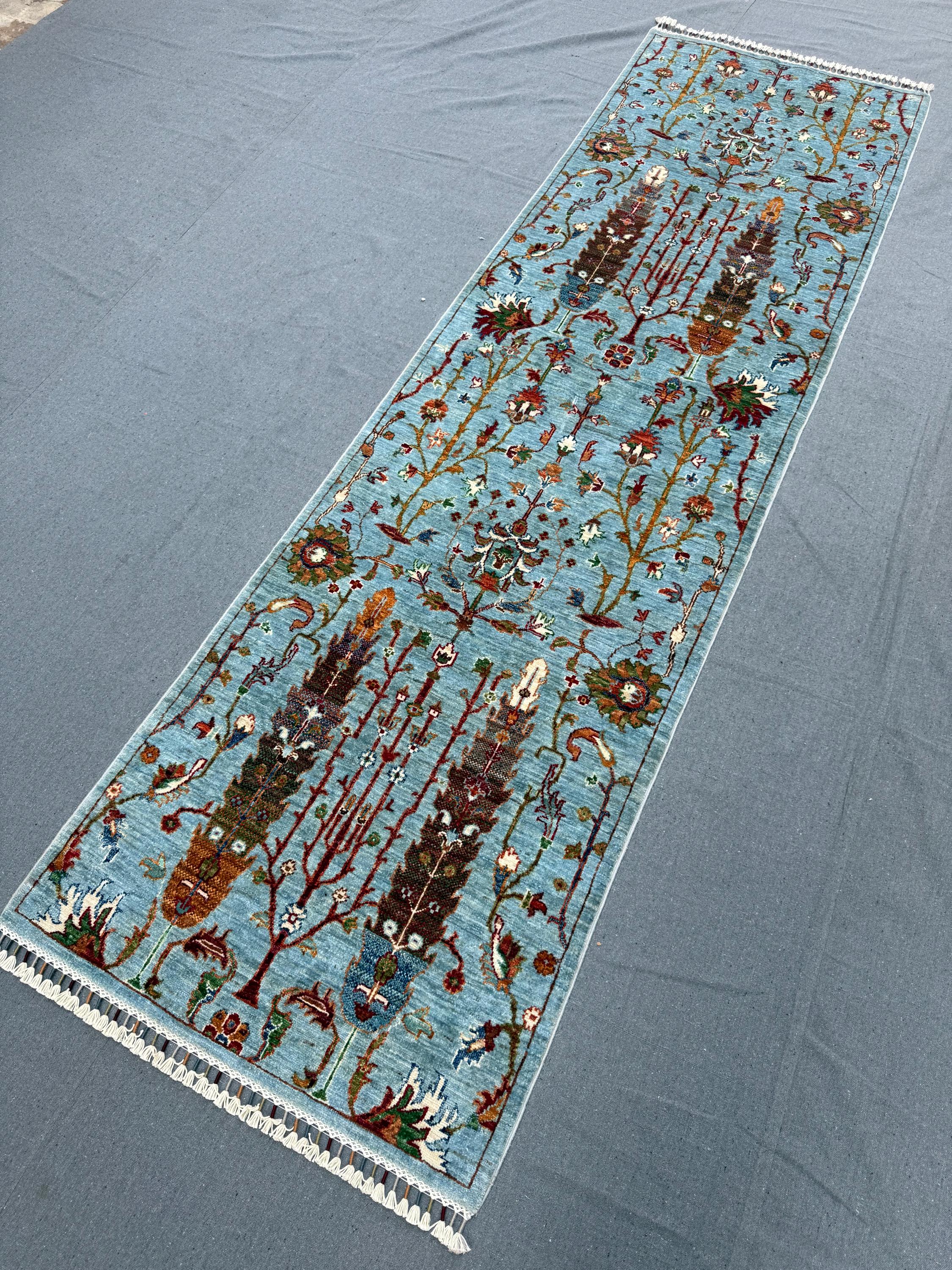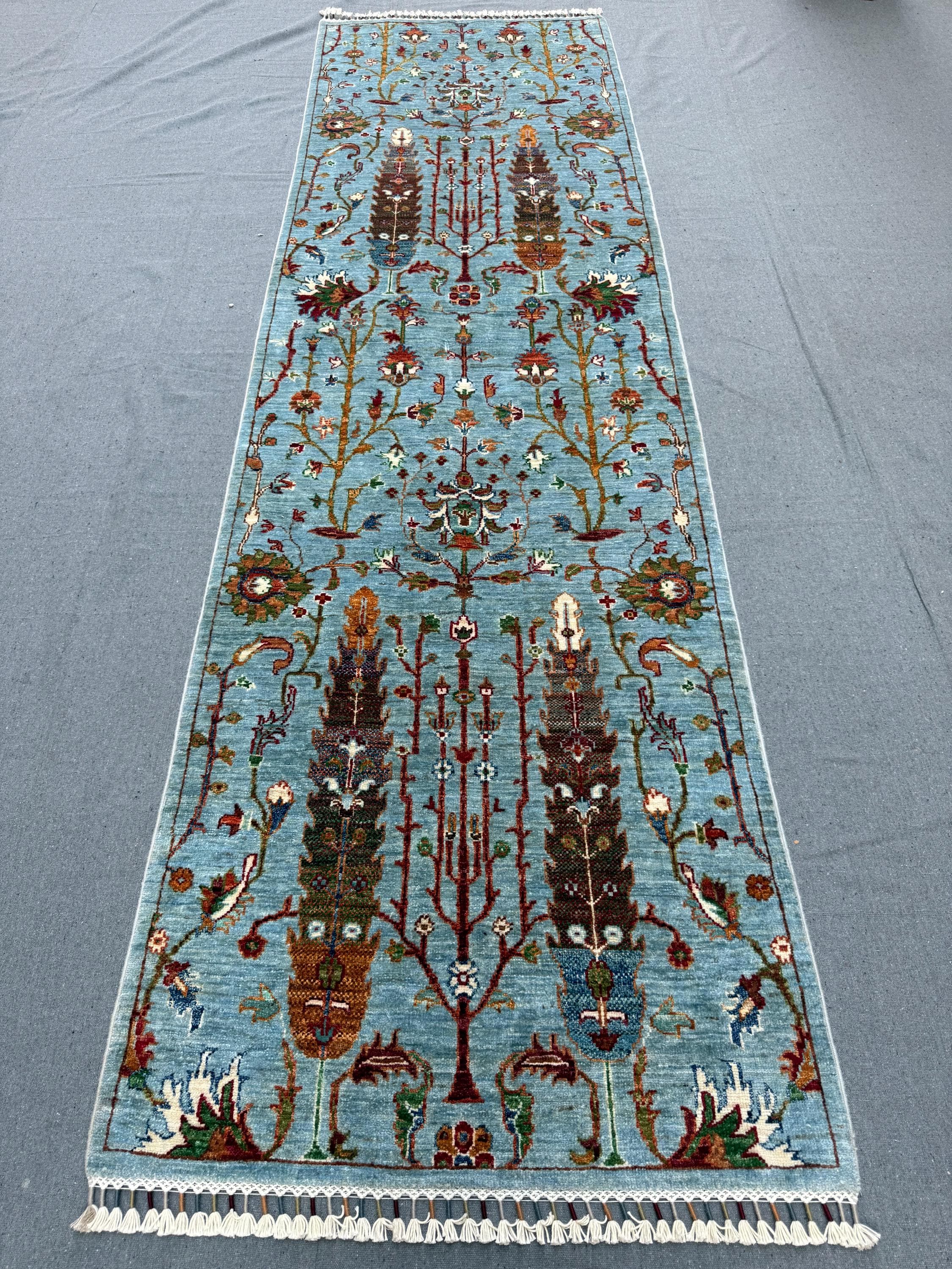 3x9 Tree of Life Handmade Wool Runner Light Blue Afghan Hallway Rug with Floral Garden Motifs, Hand-Knotted Wool Carpet for Entryway