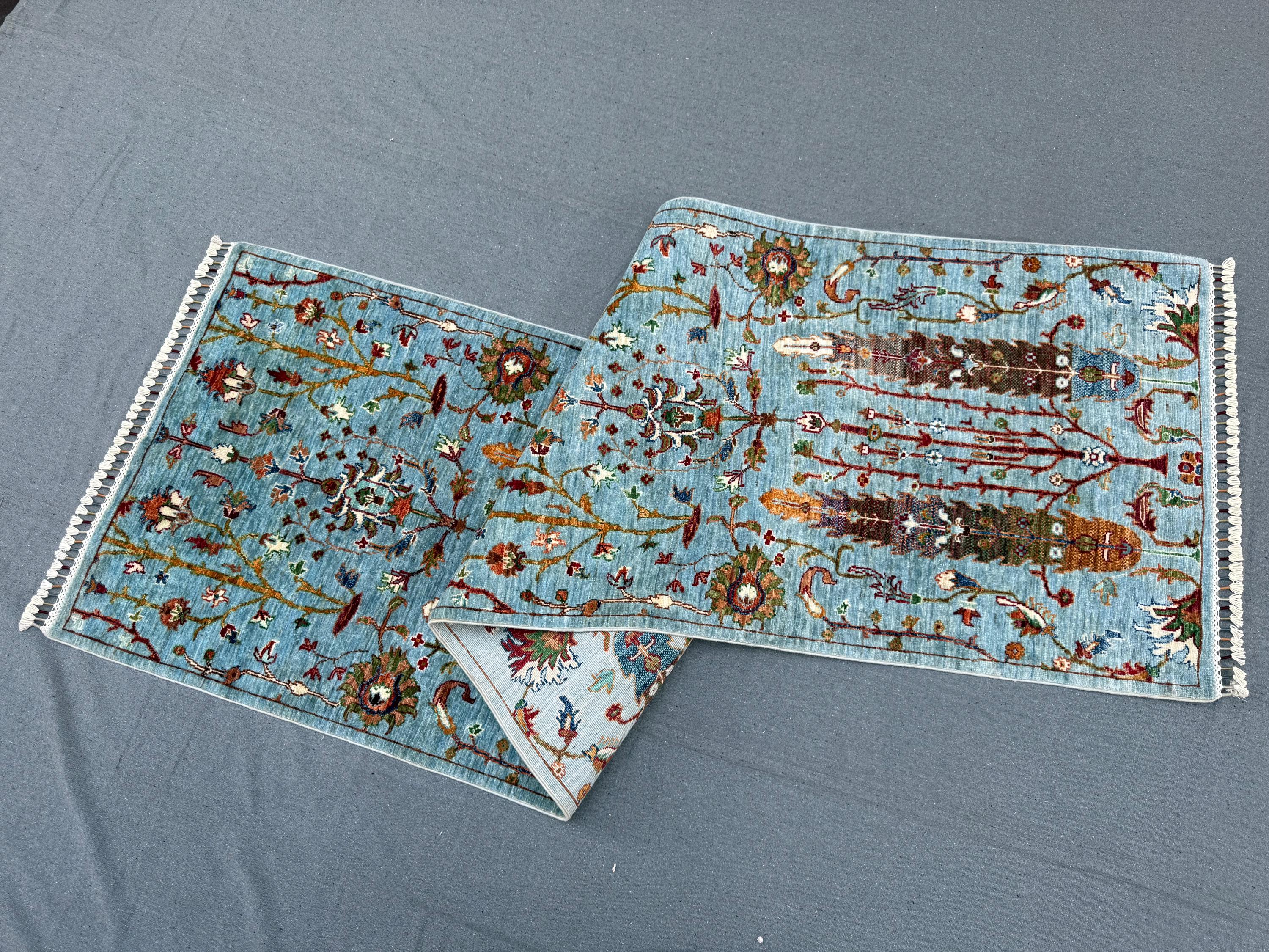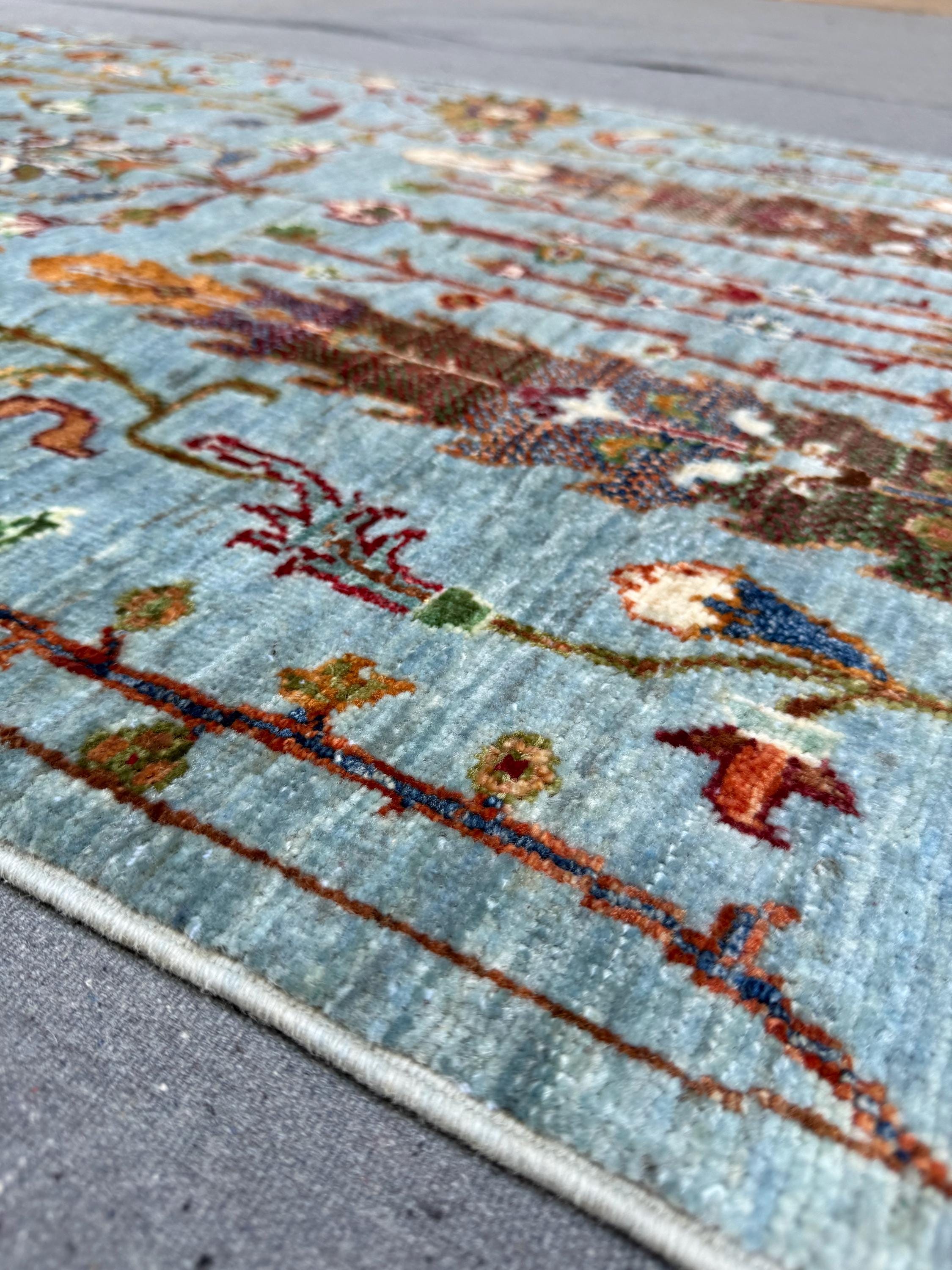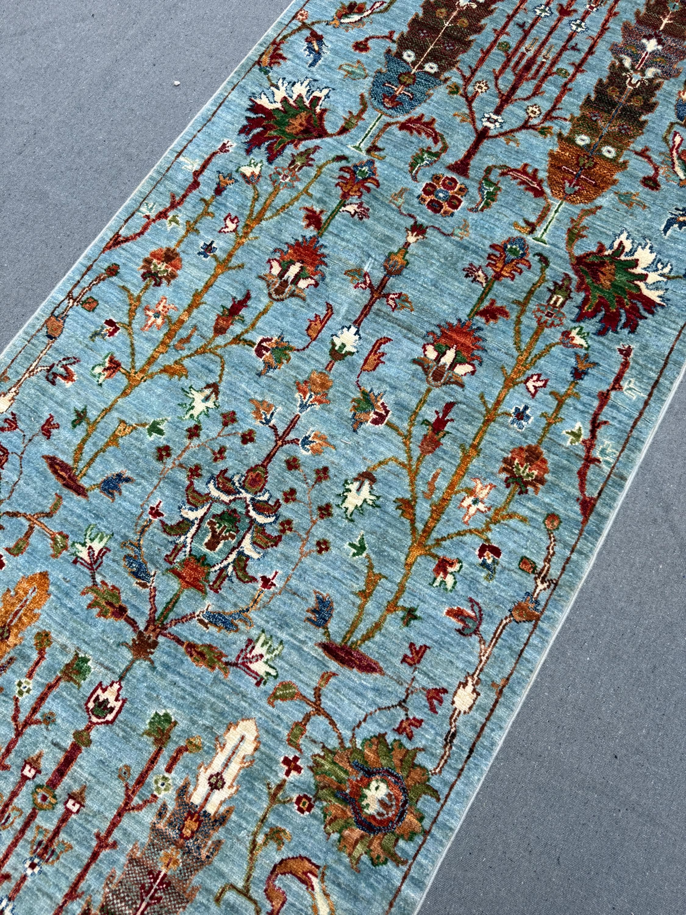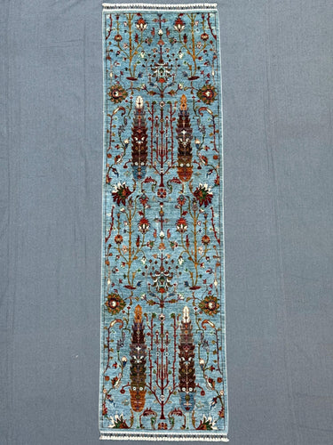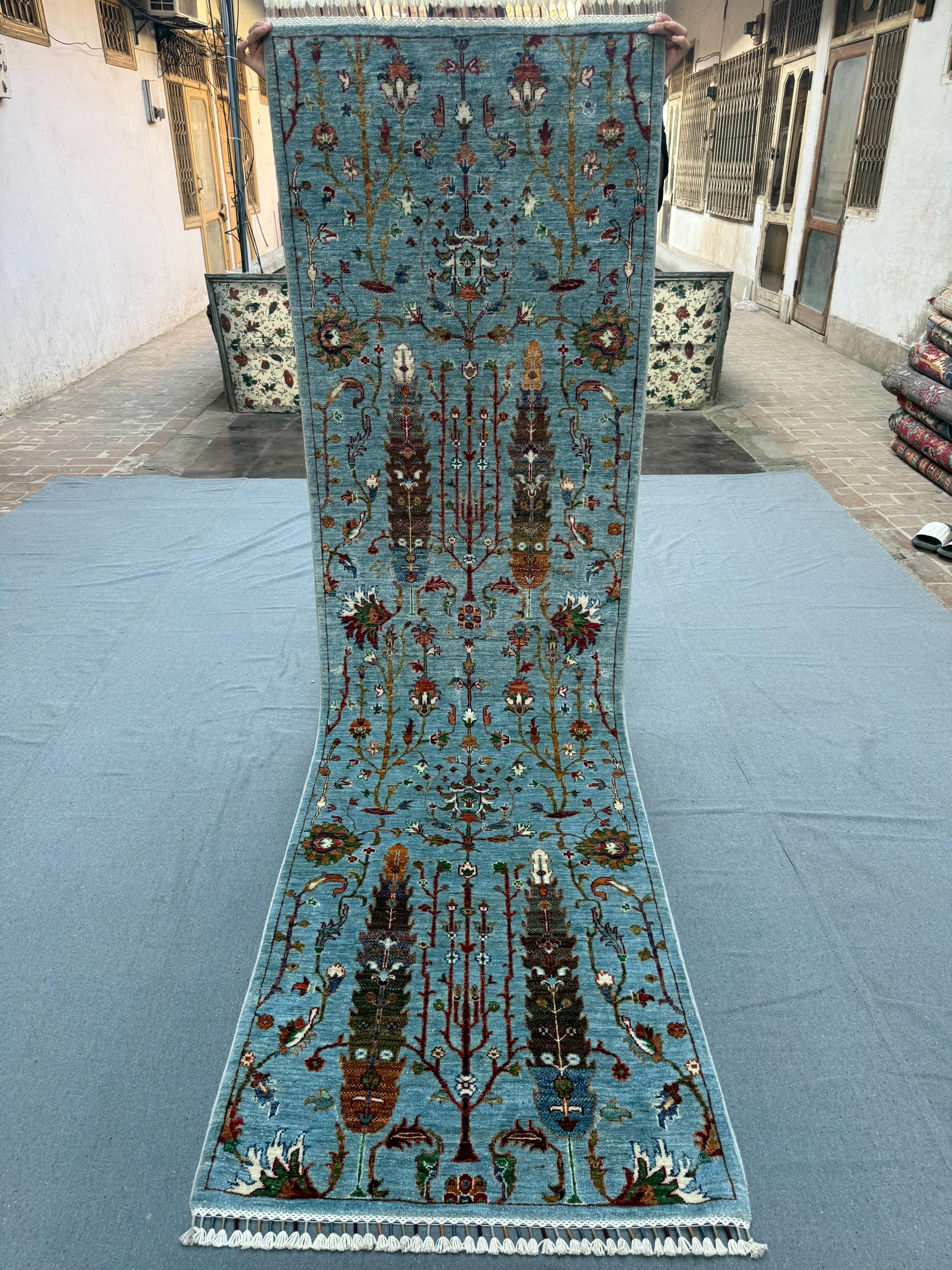 3x9 Tree of Life Handmade Wool Runner Light Blue Afghan Hallway Rug with Floral Garden Motifs, Hand-Knotted Wool Carpet for Entryway