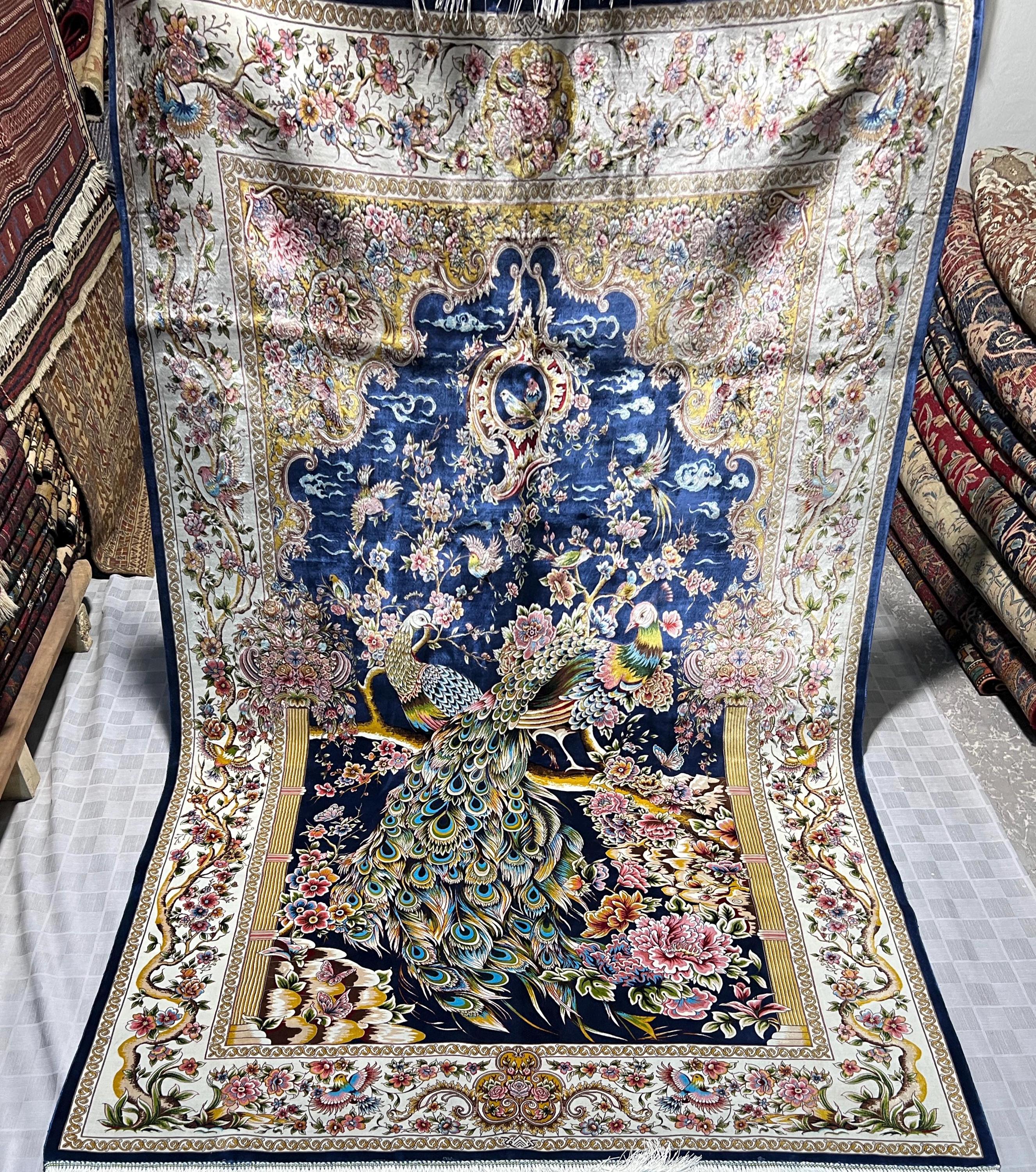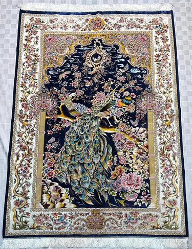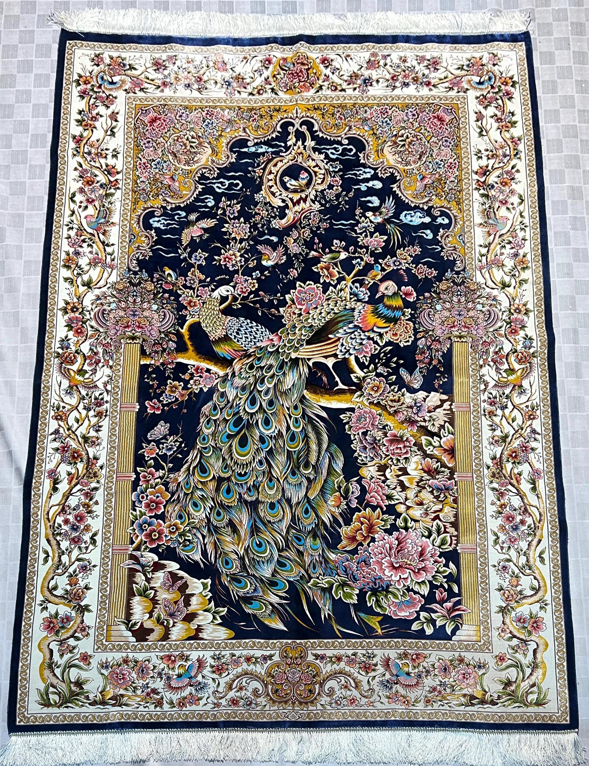 Luxury Silk Peacock Rug 5x7 ft Elegant Decorative Art Carpet with Floral Details Shiny Soft Silk Area Rug for Living Room & Bedroom
