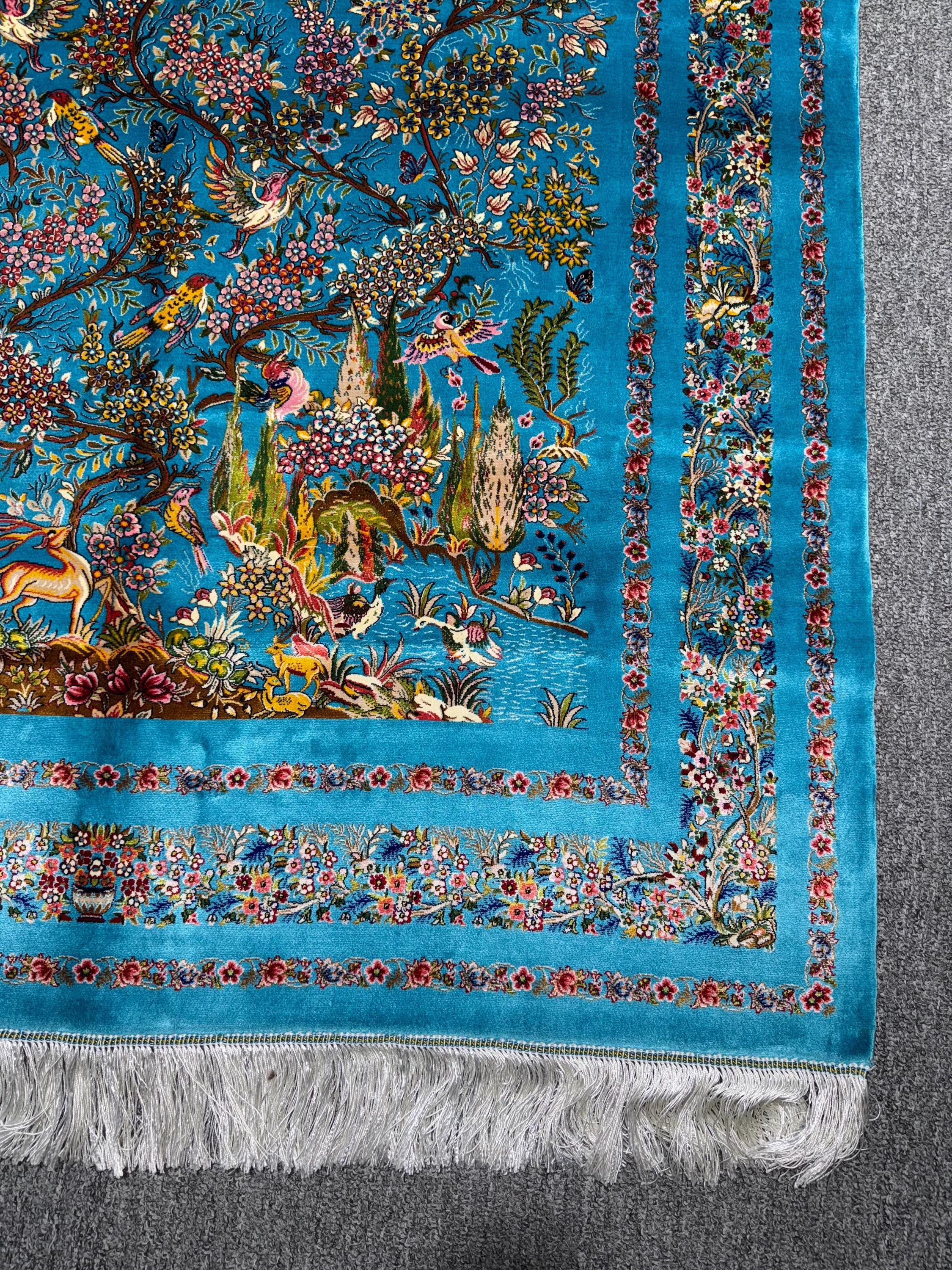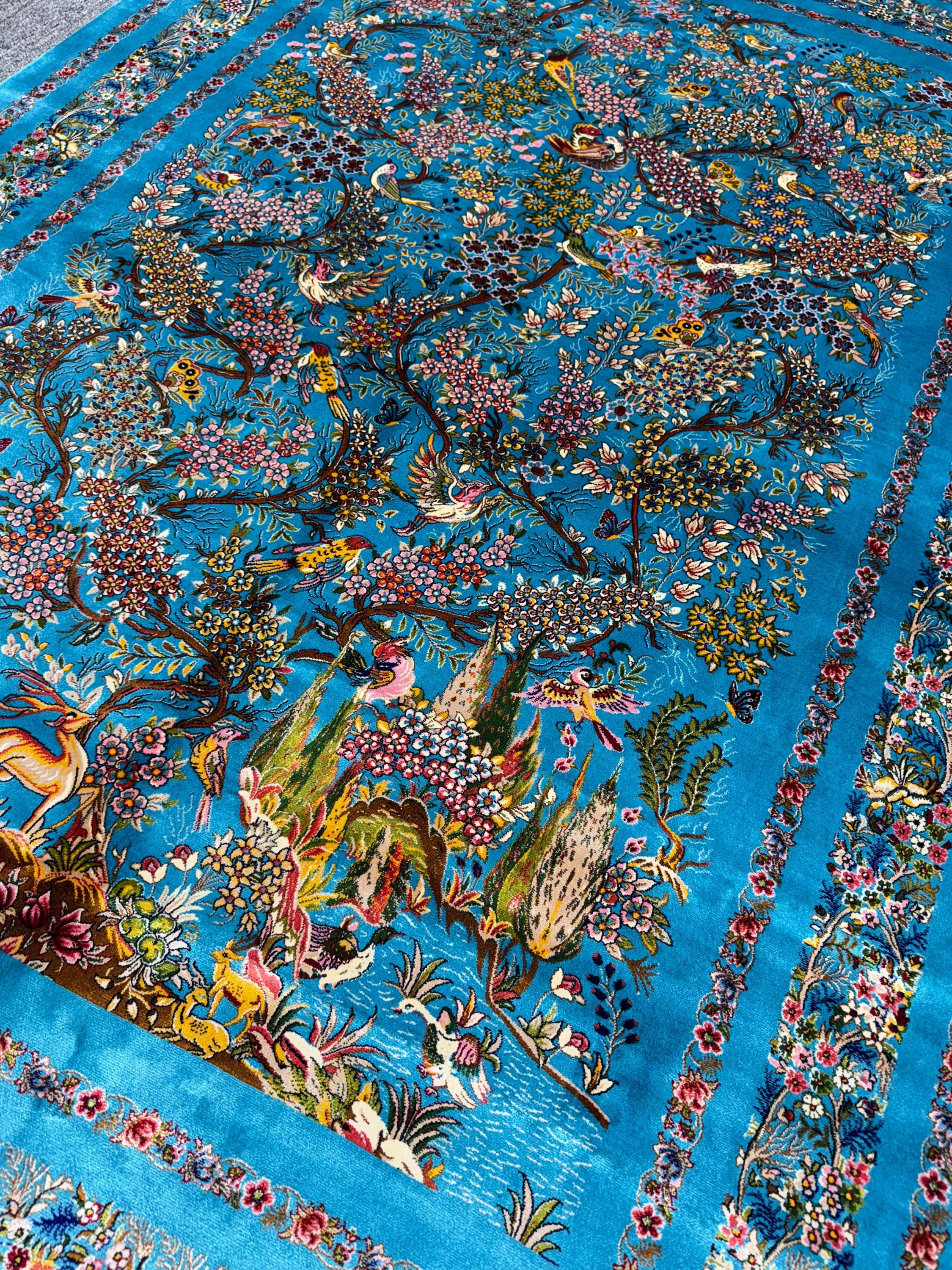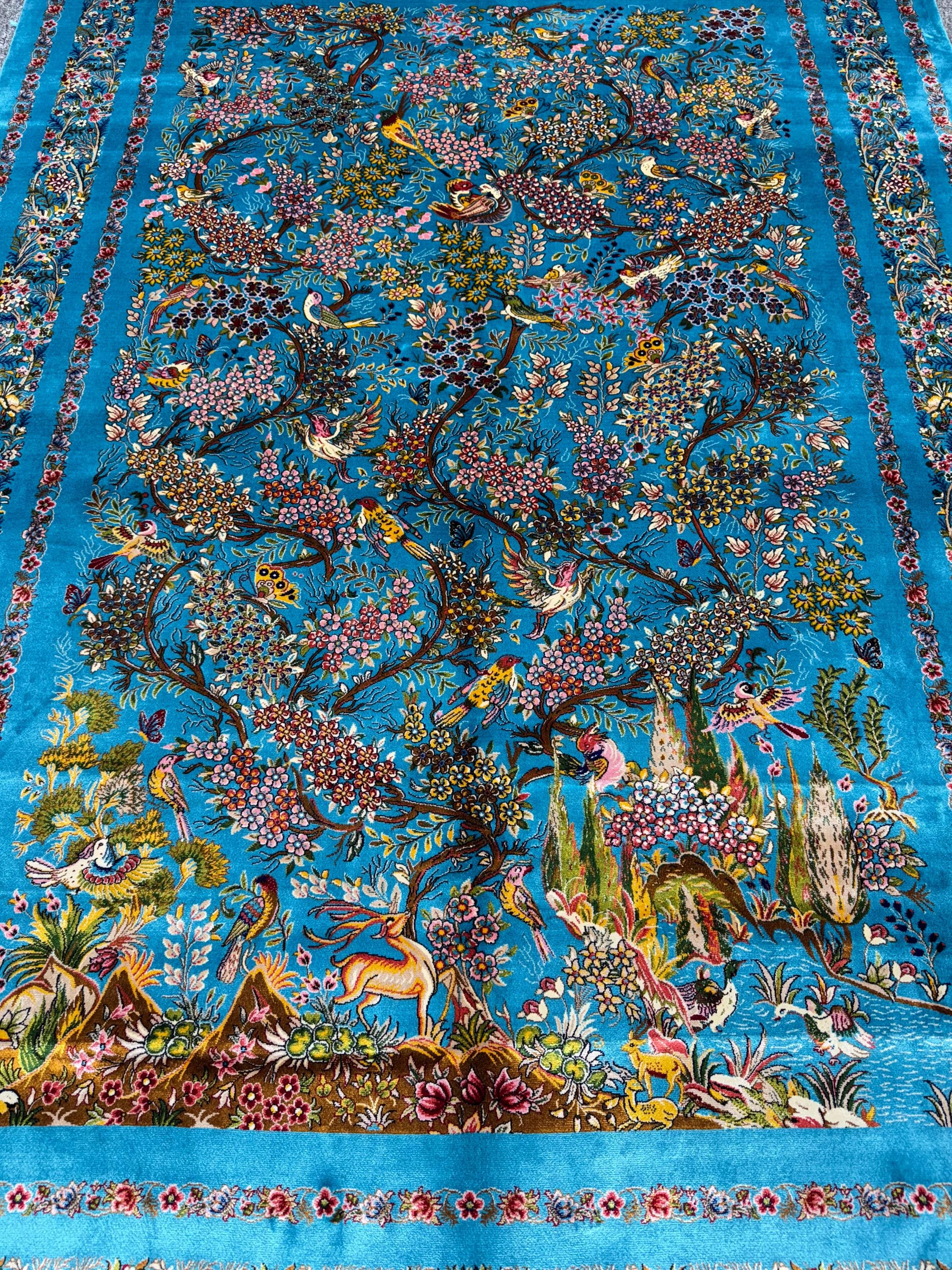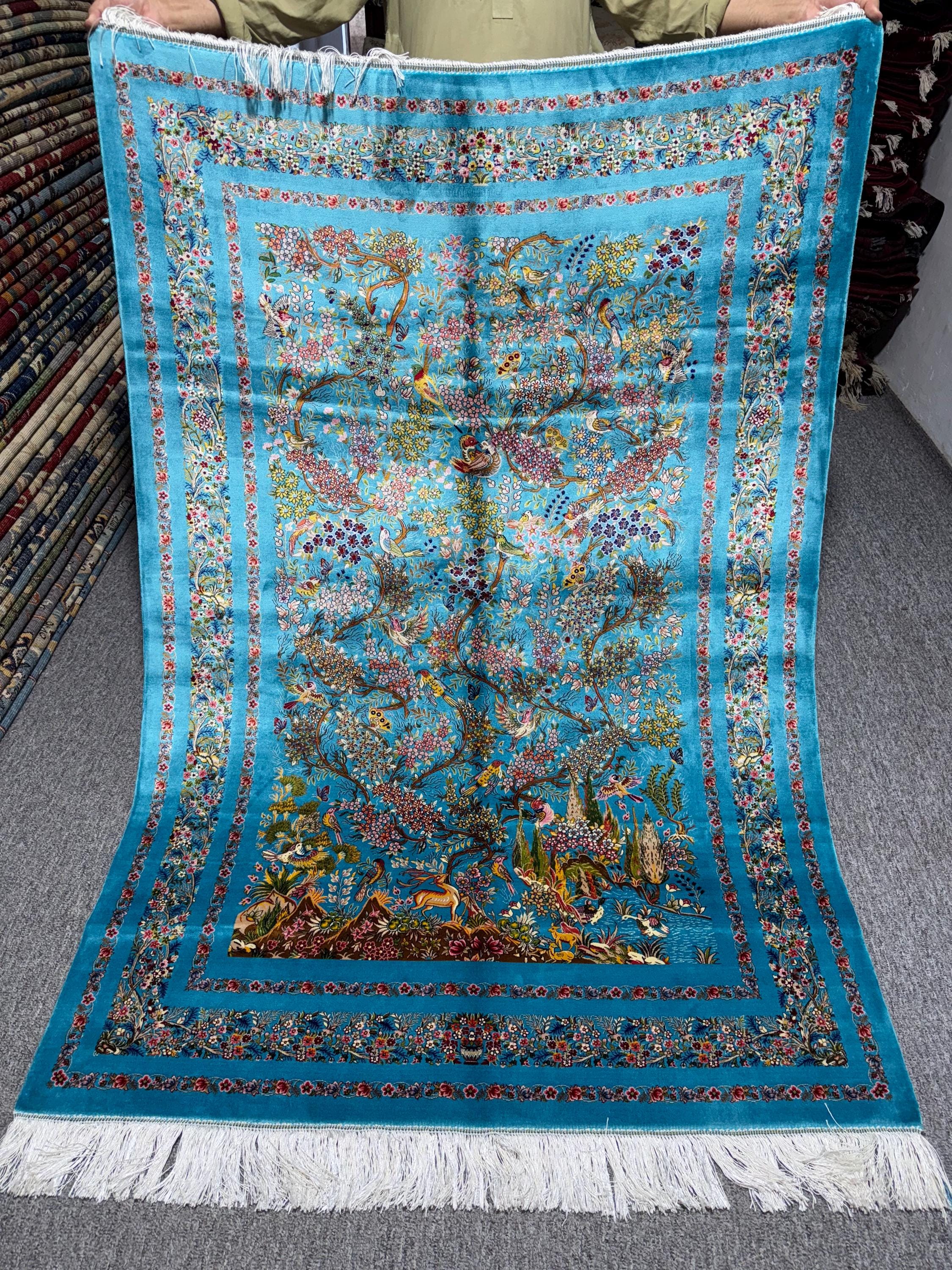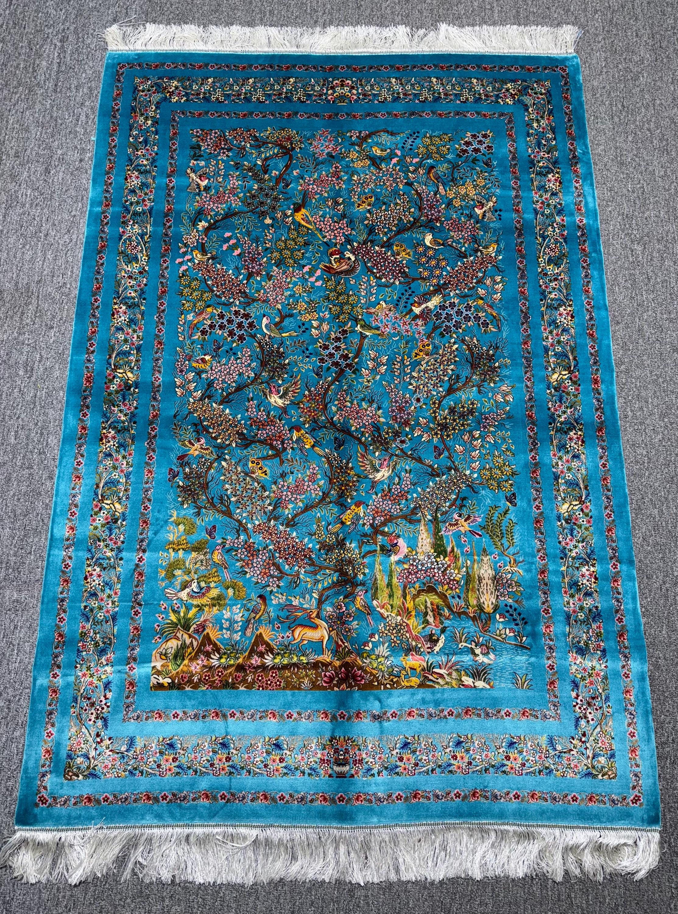 Luxury Silk Area Rug 5x7 ft Turquoise Floral Tree & Birds Design, Elegant Classic Style Rug for Living Room Decor