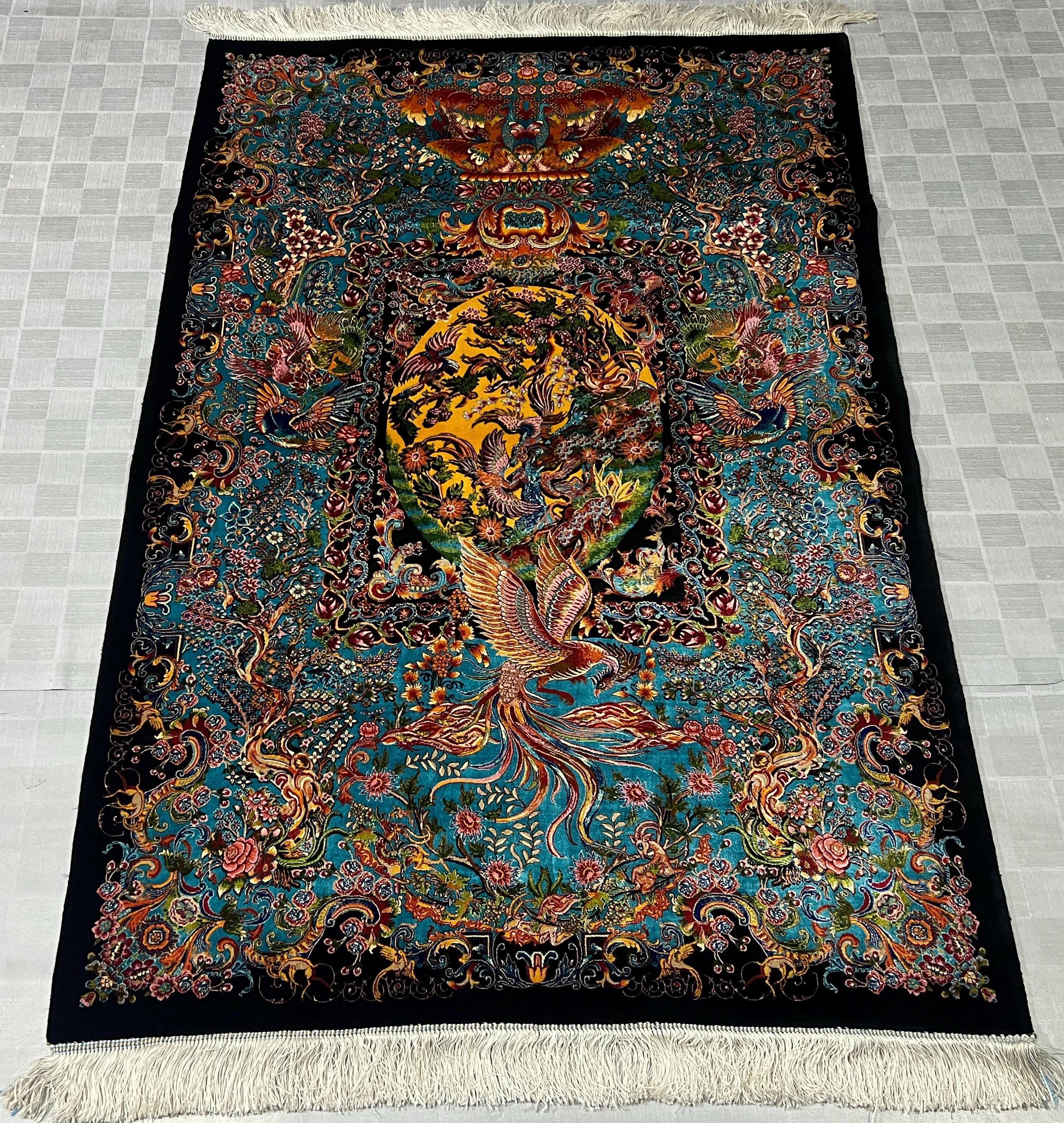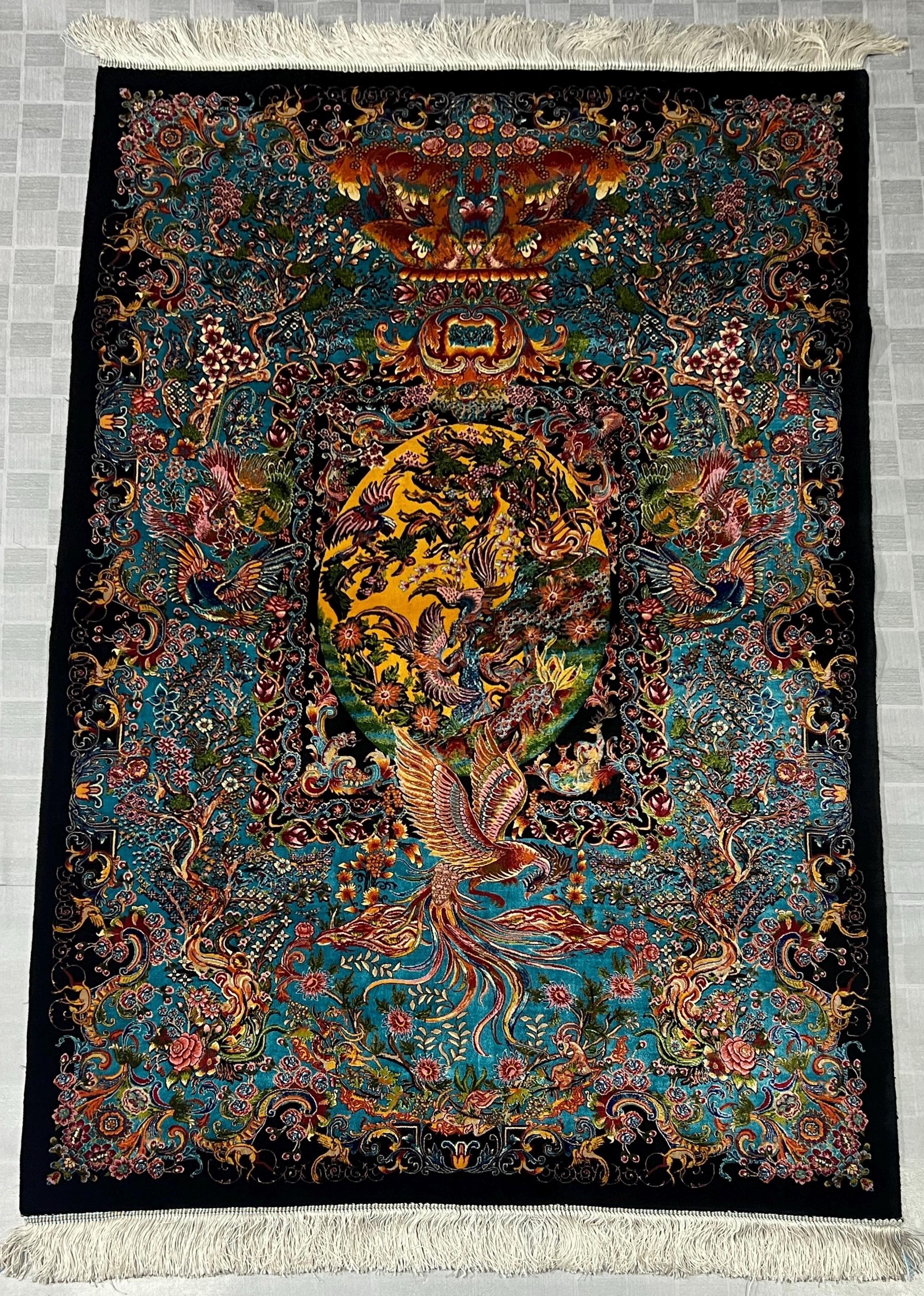 Silk Art Rug 3x5 ft Phoenix & Mythical Bird Carpet, Luxury Decorative Wall Tapestry, Detailed Silk Area Rug, Exotic Oriental Art Home Decor