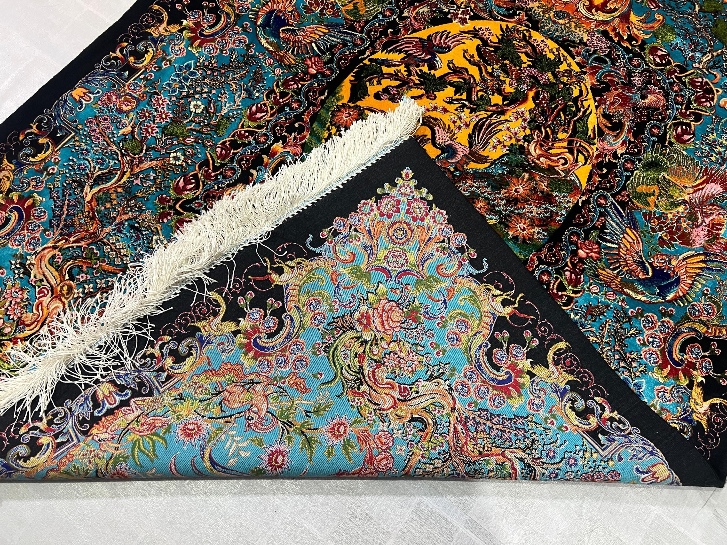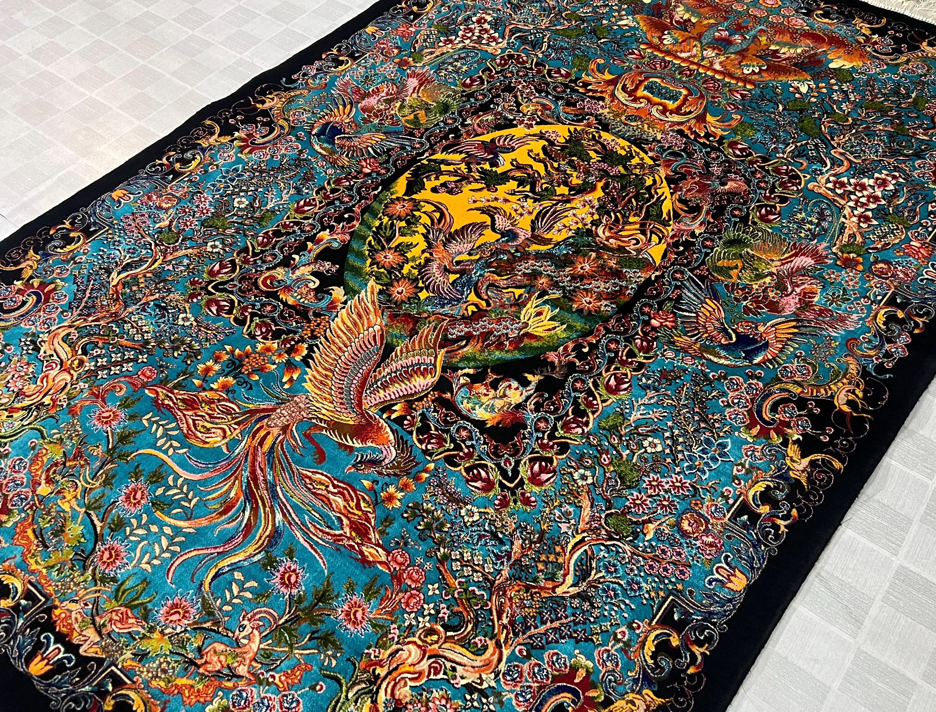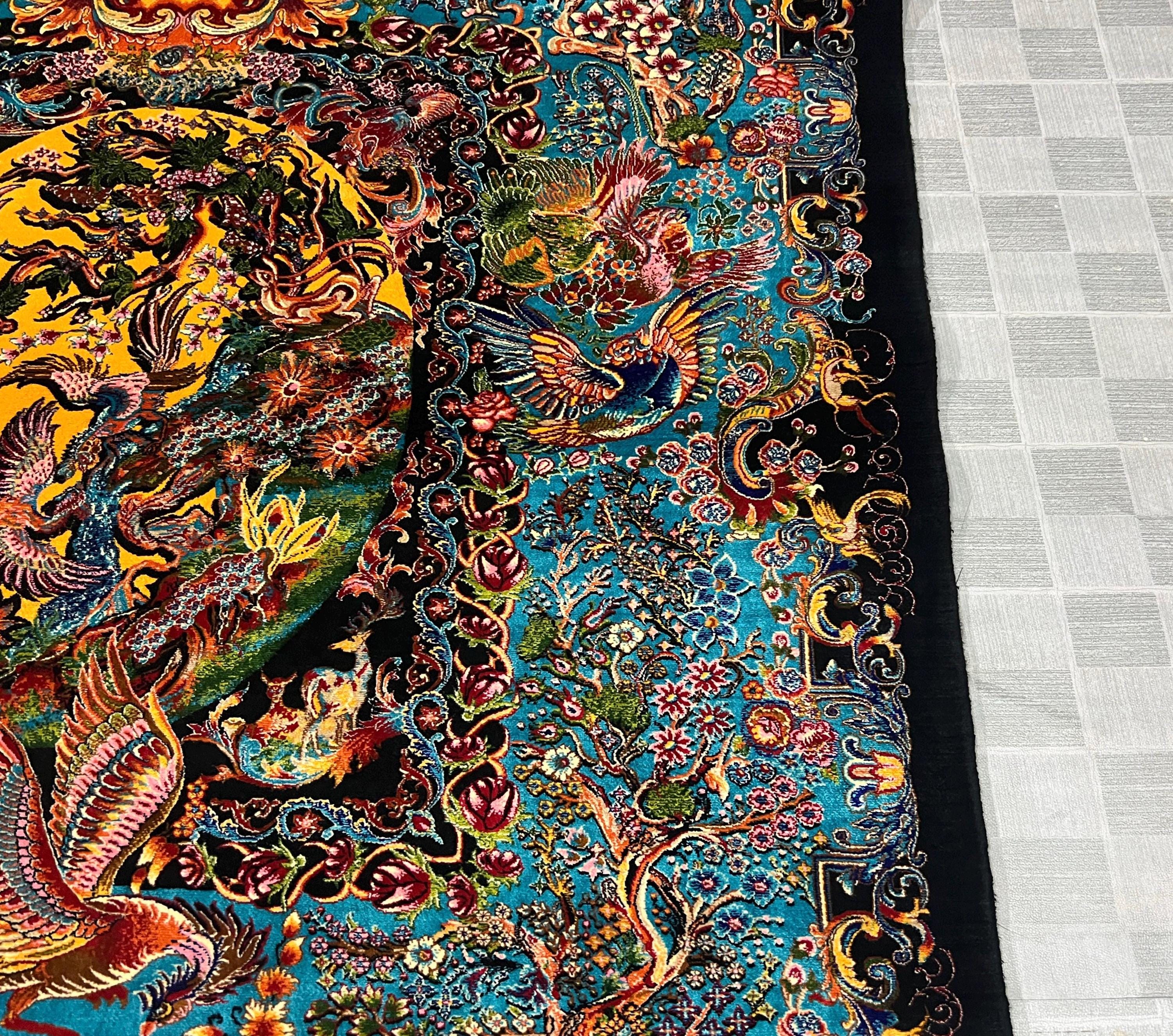 The rich jewel-tone palette — turquoise, gold, crimson, deep navy, and emerald — glows beautifully under light thanks to the smooth, high-shine silk fibers. Every swirl, feather, blossom, and border detail is woven with incredible precision, creating a piece that feels alive with movement and emotion.