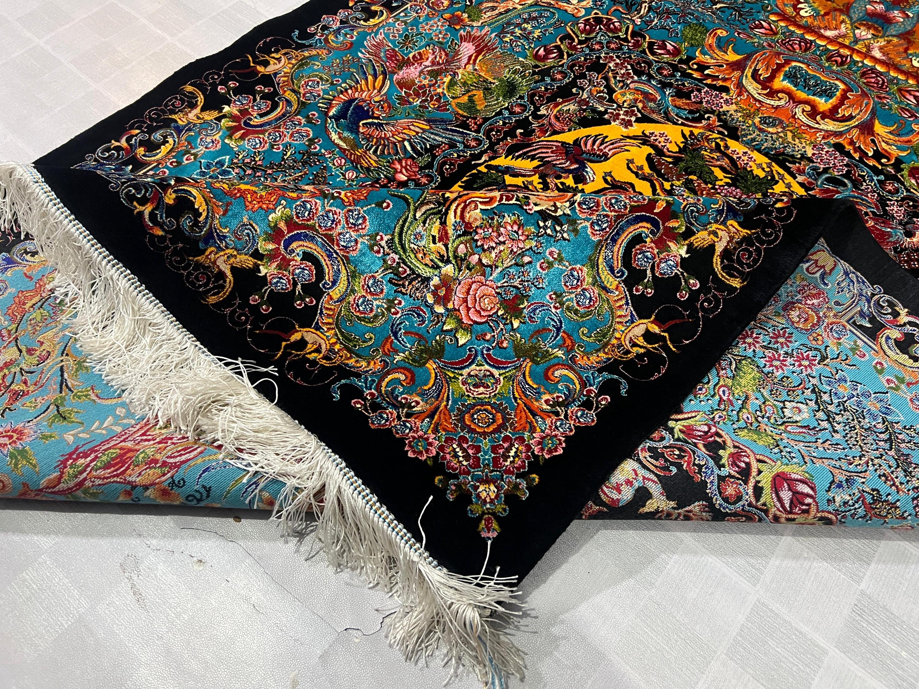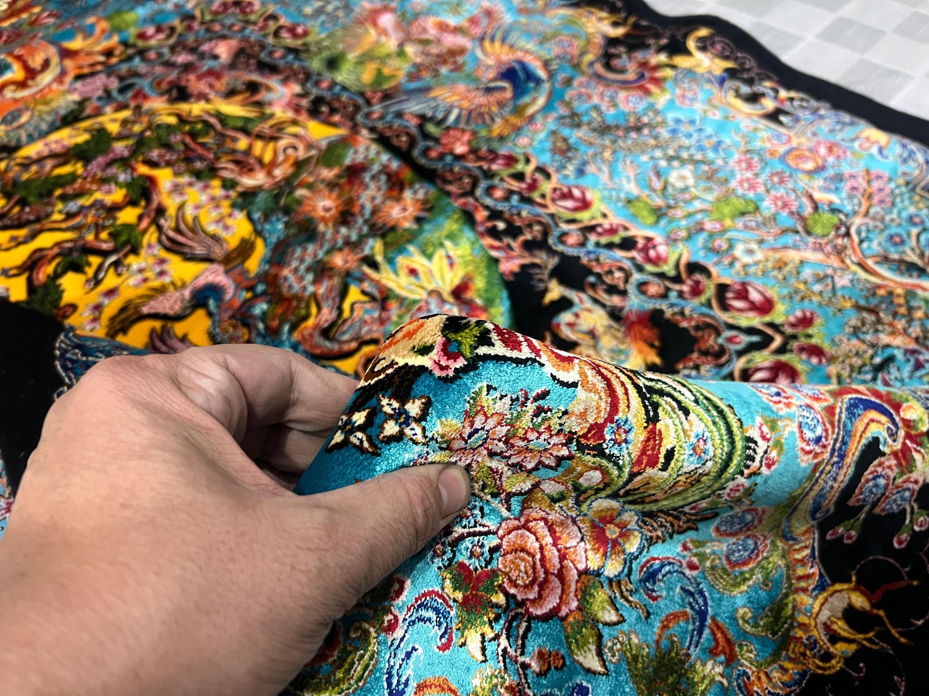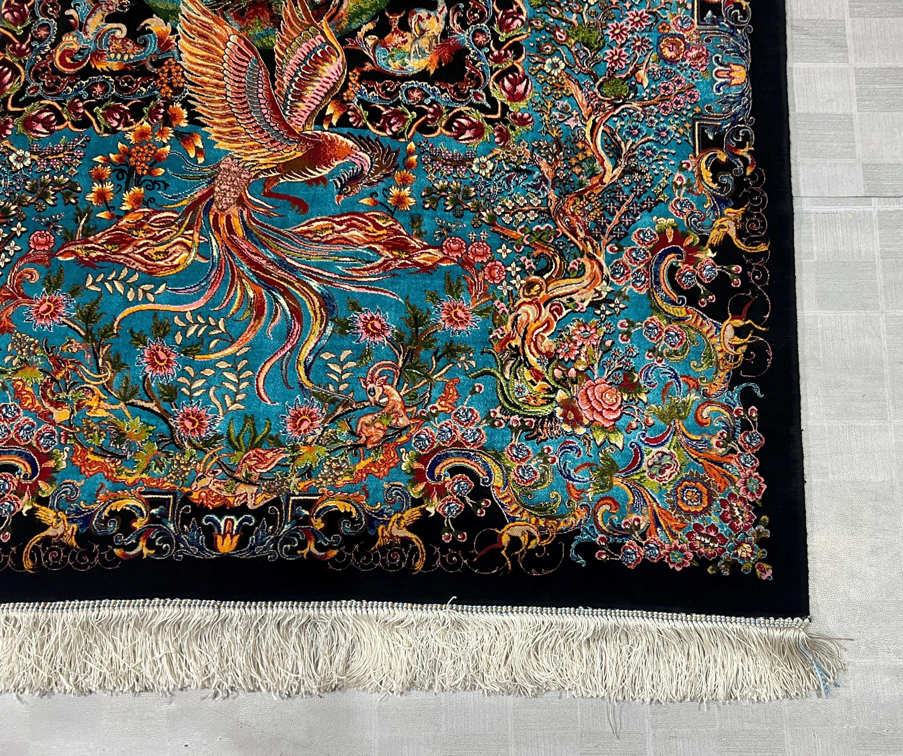 The rich jewel-tone palette — turquoise, gold, crimson, deep navy, and emerald — glows beautifully under light thanks to the smooth, high-shine silk fibers. Every swirl, feather, blossom, and border detail is woven with incredible precision, creating a piece that feels alive with movement and emotion.