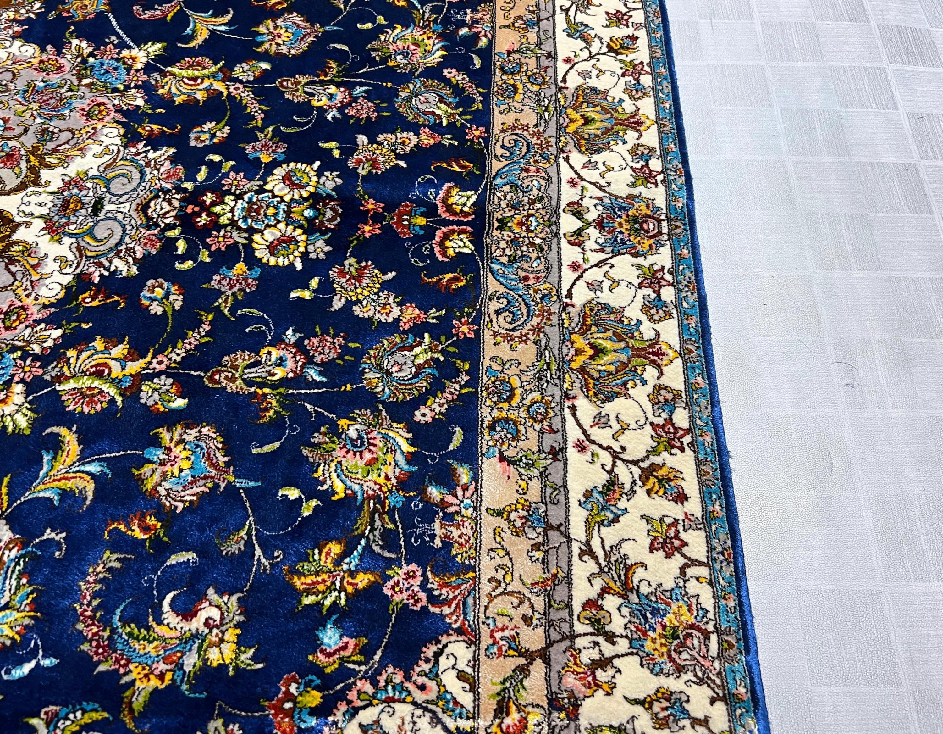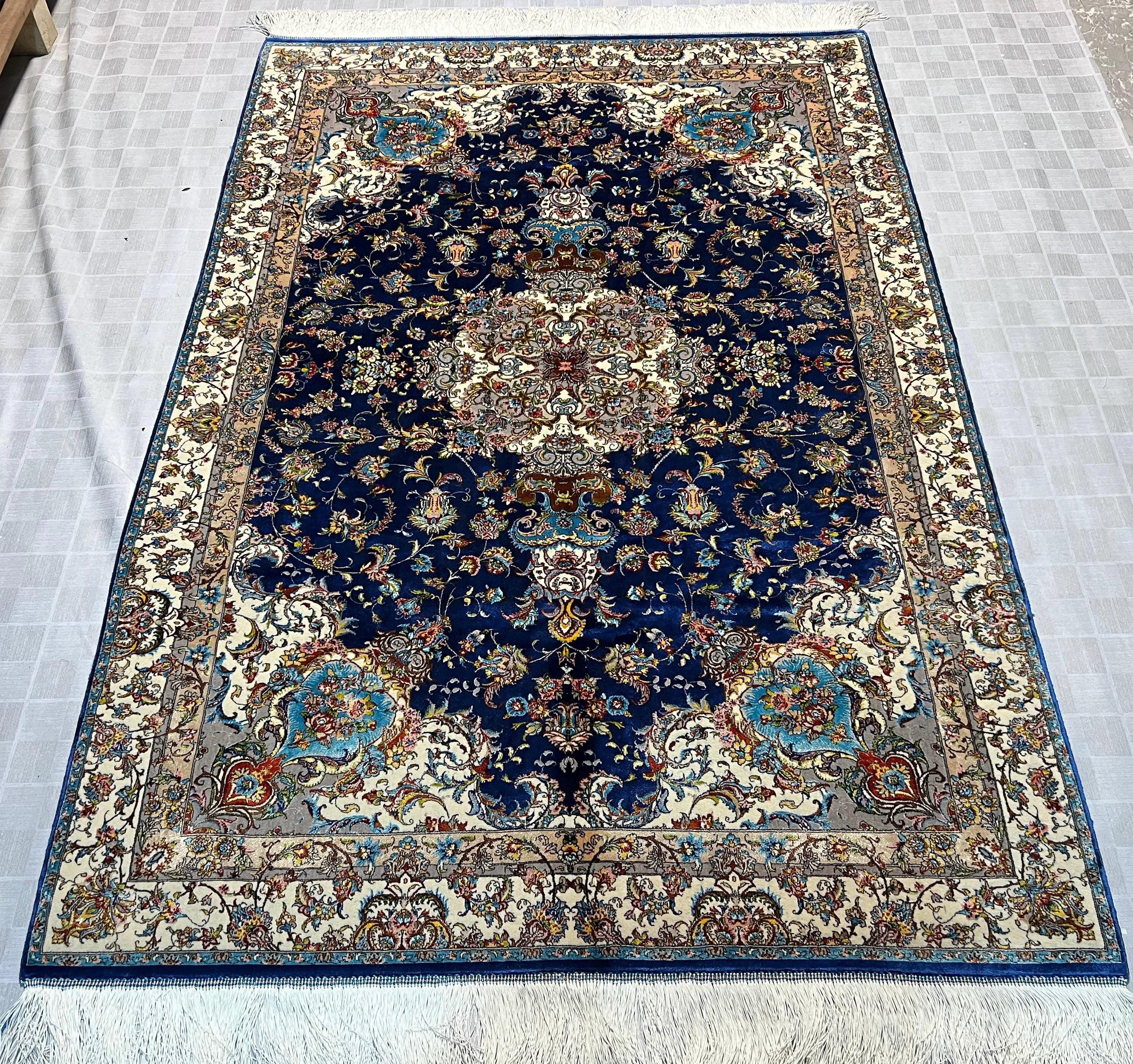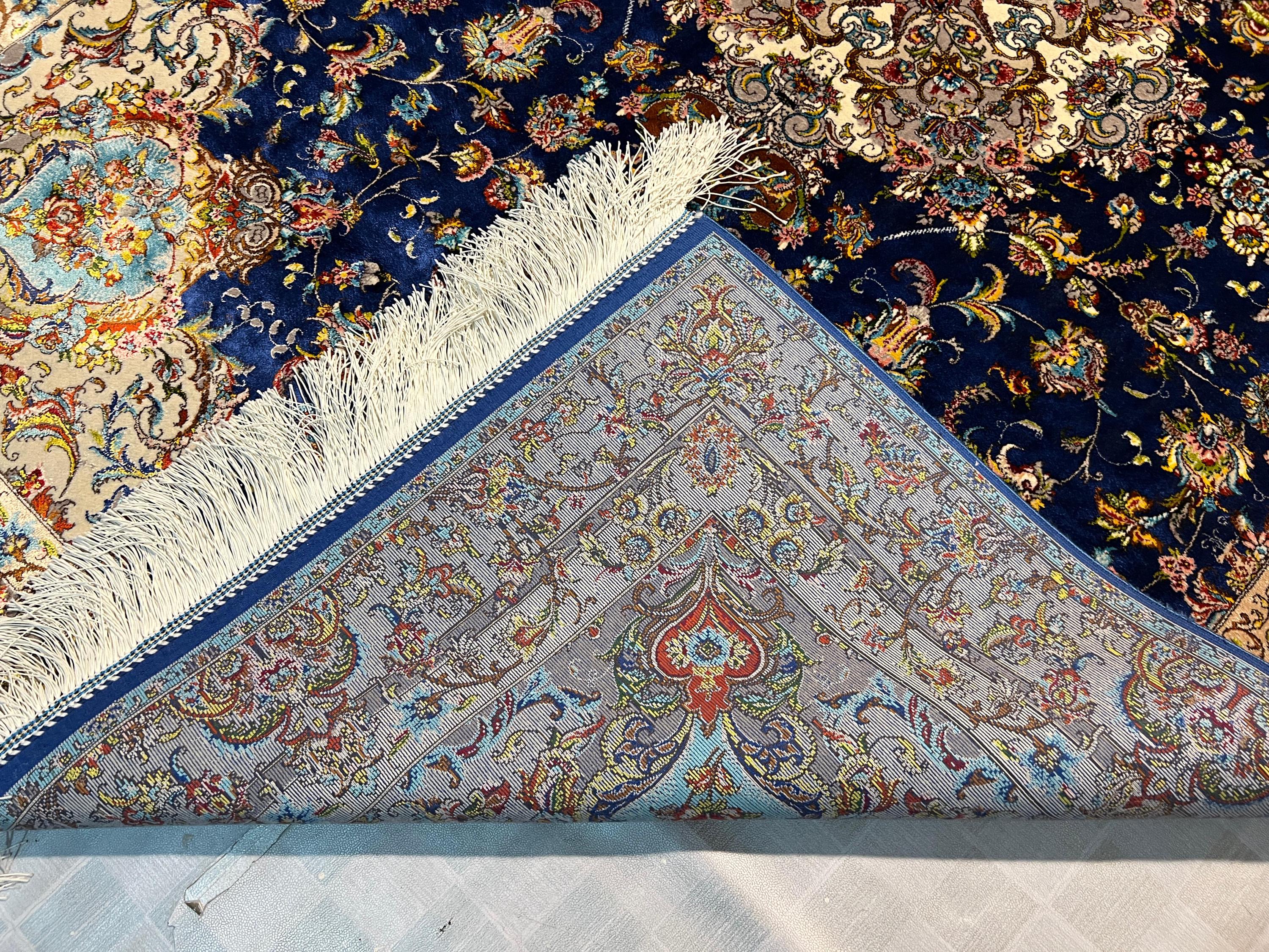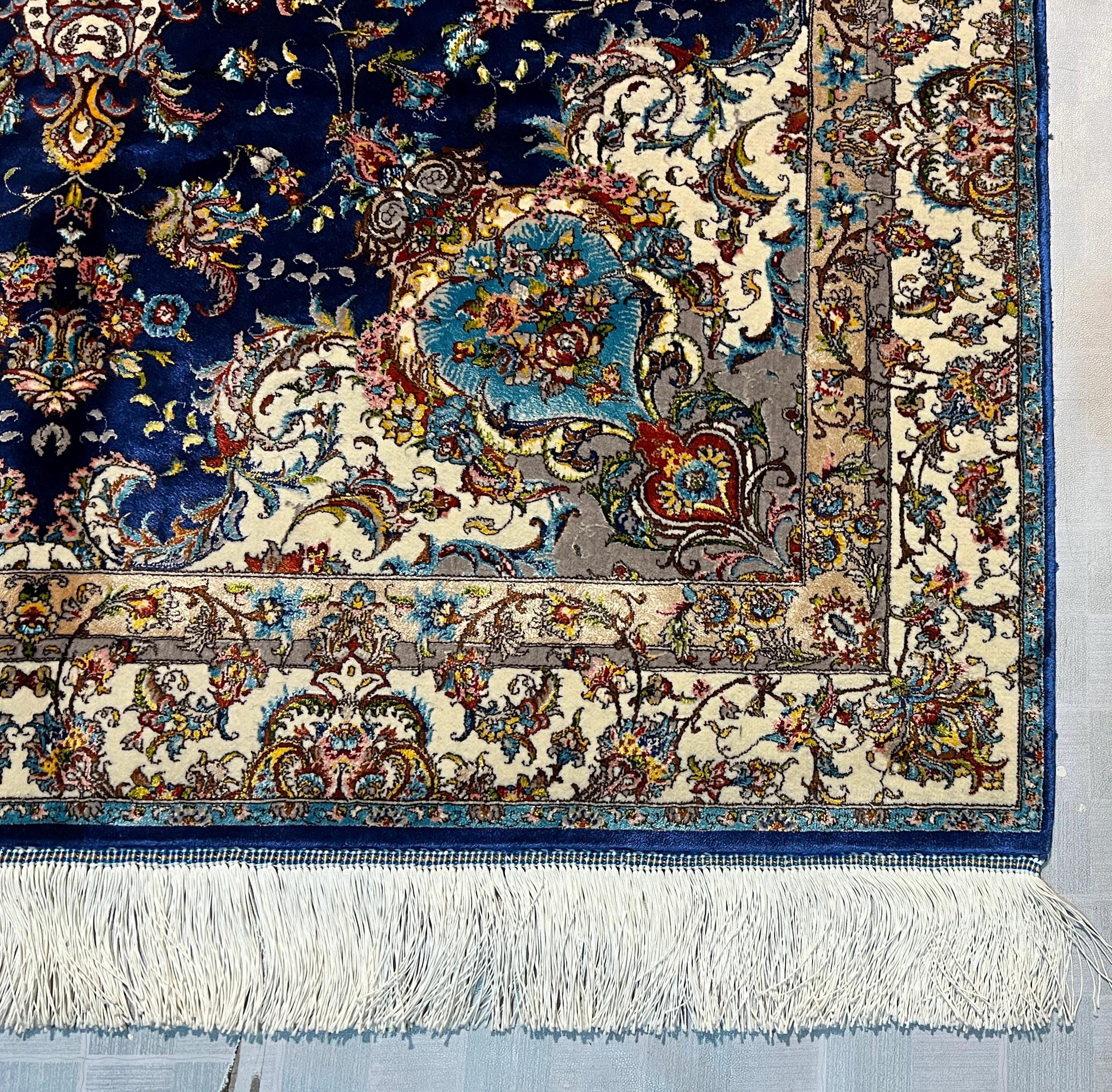 Silk Rug 4x6 ft Navy Blue Luxury Area Carpet with Detailed Floral Medallion Soft Shiny Decorative Rug for Living Room & Home Decor
