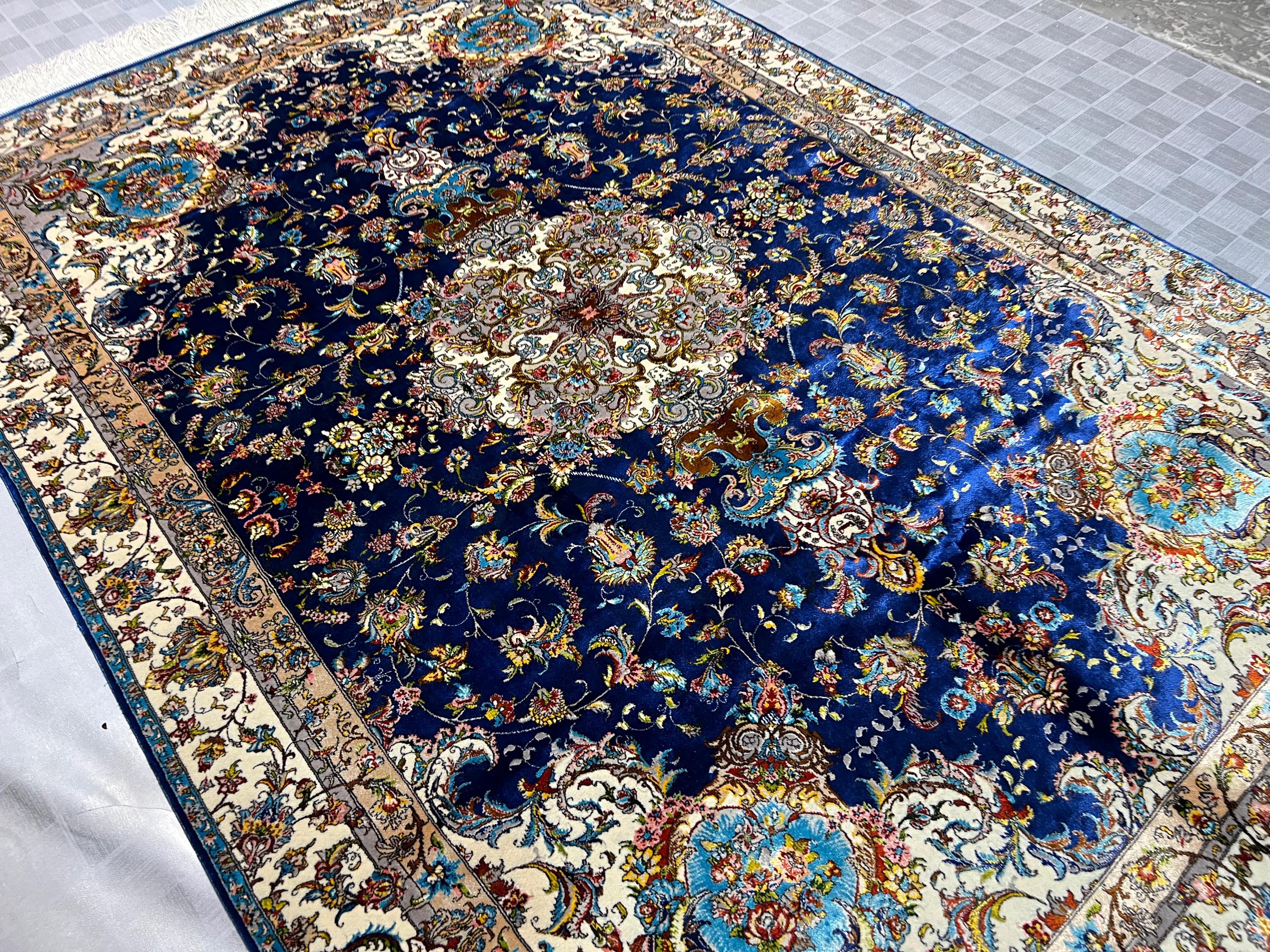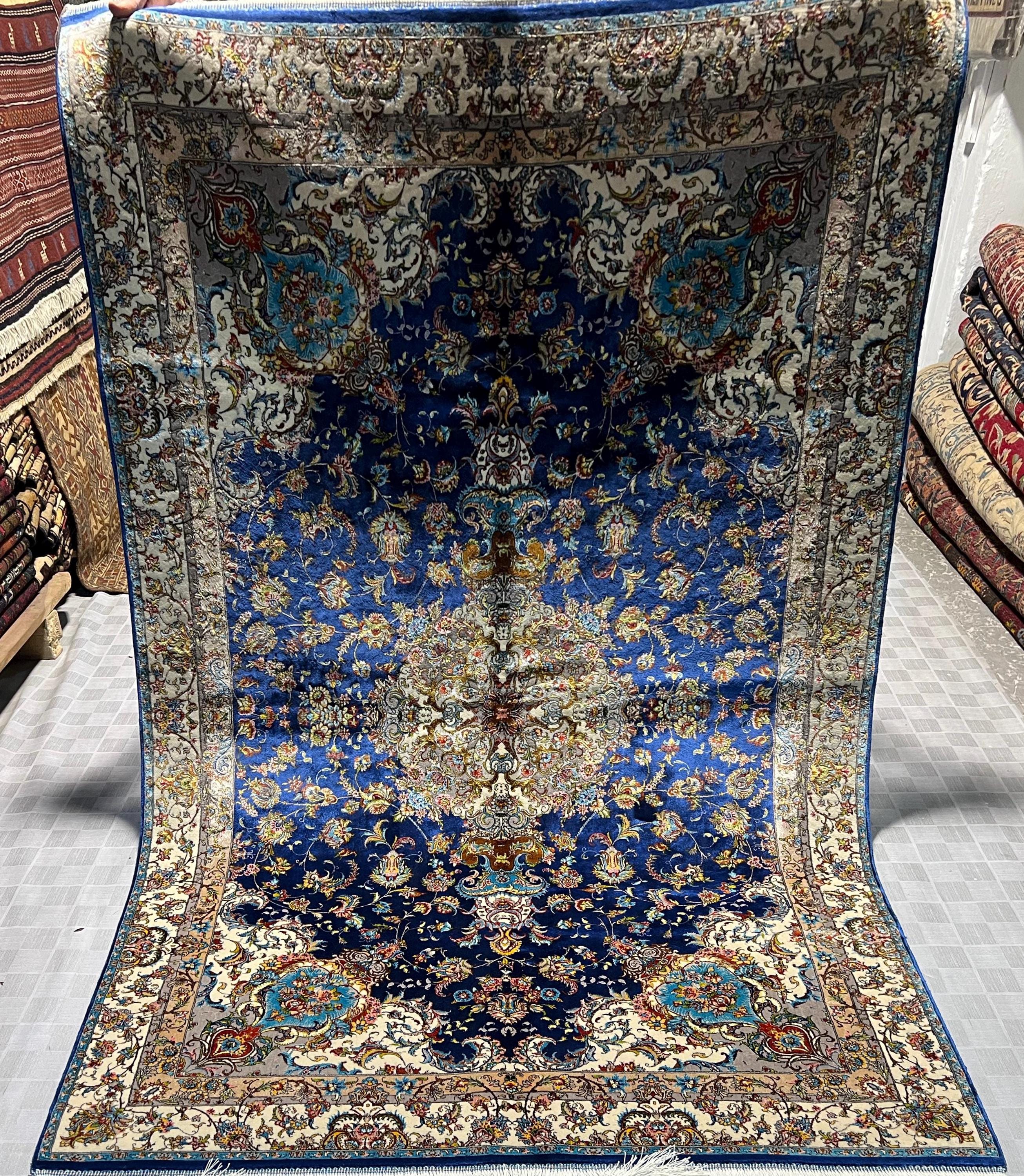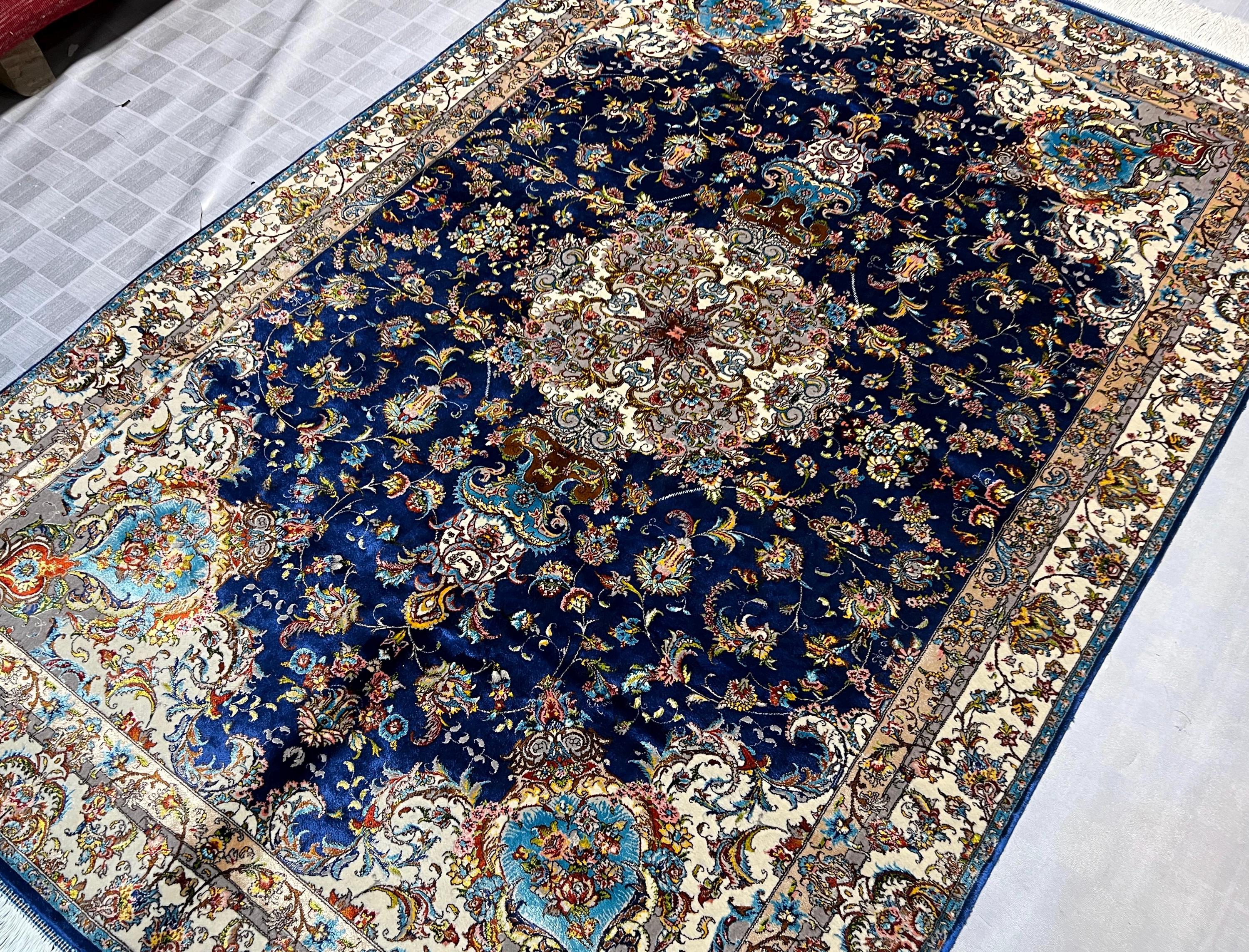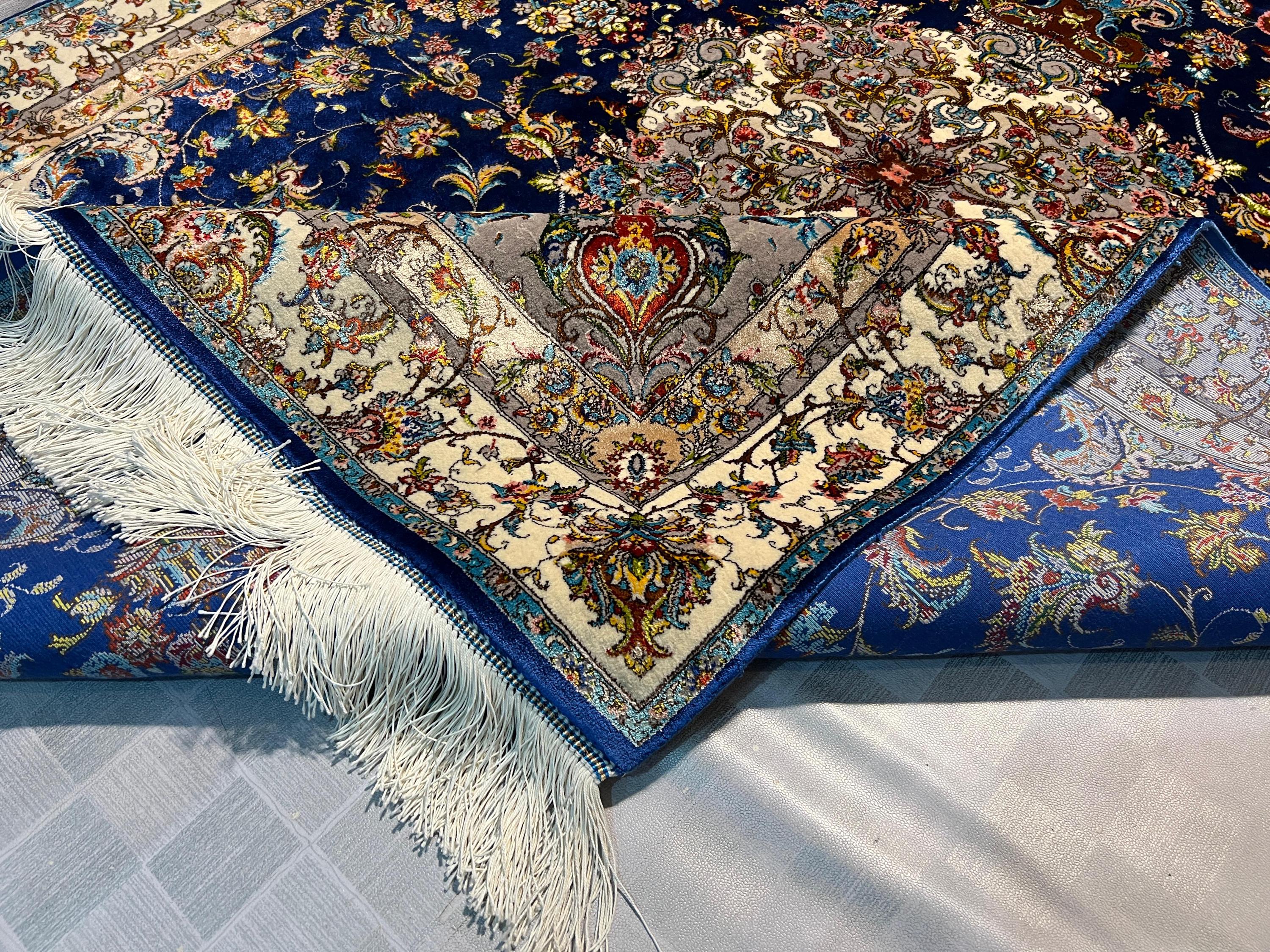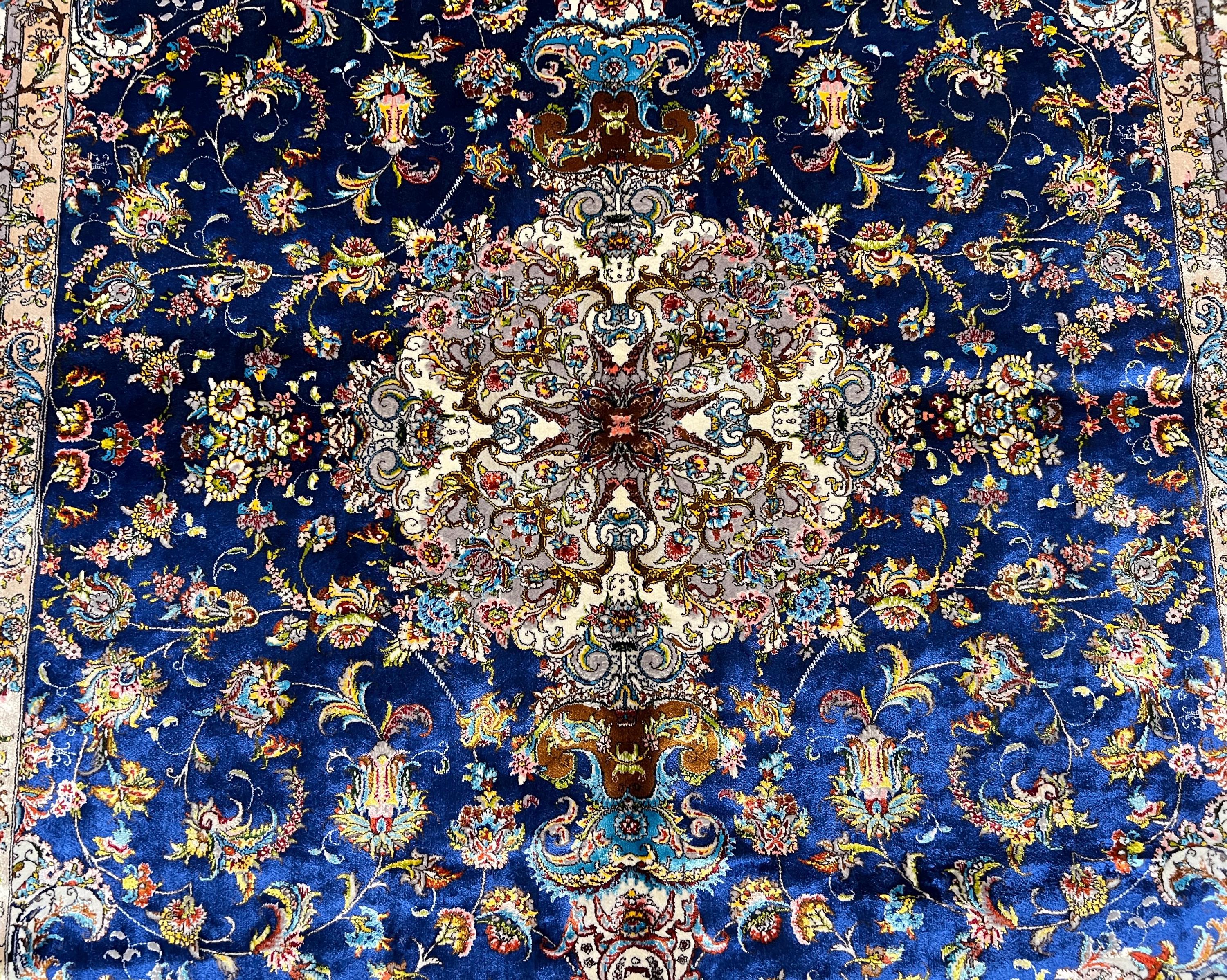 Silk Rug 4x6 ft Navy Blue Luxury Area Carpet with Detailed Floral Medallion Soft Shiny Decorative Rug for Living Room & Home Decor