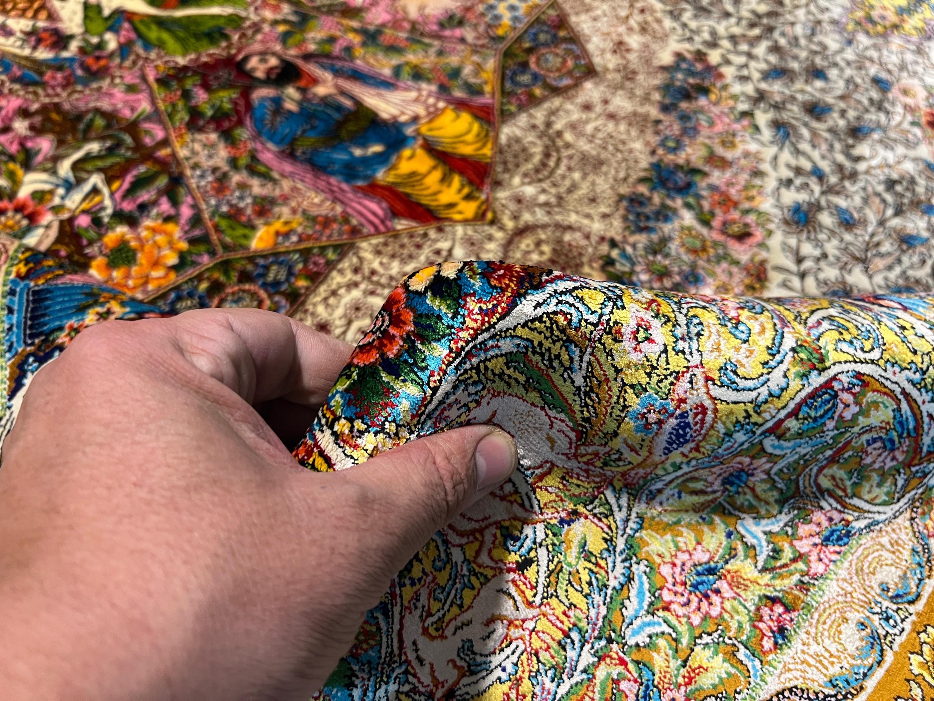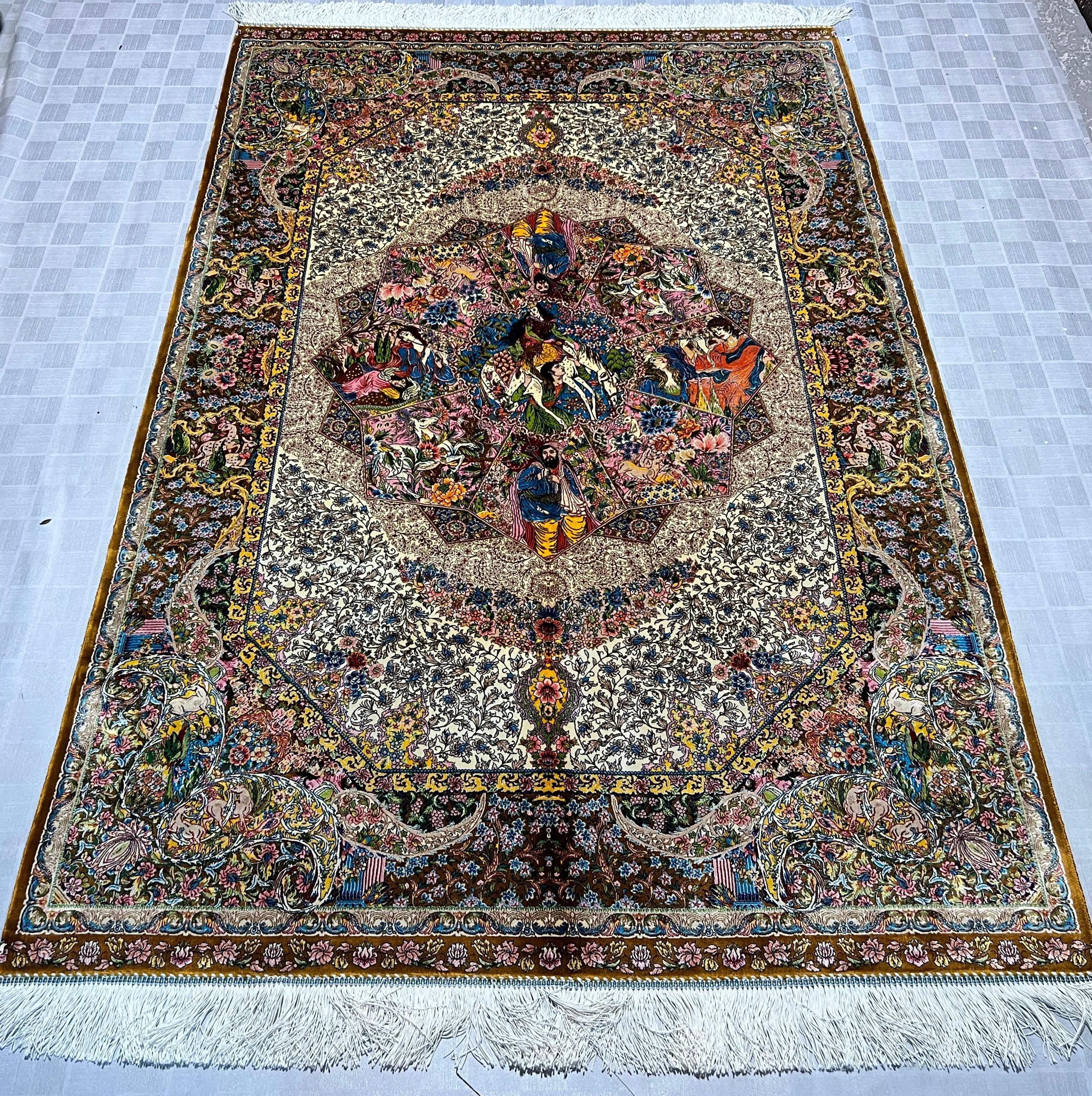 Silk Rug 4x6 ft Luxury Fine-Weave Carpet with Romantic Story Scene & Floral Medallion Shiny Decorative Area Rug for Elegant Home Decor