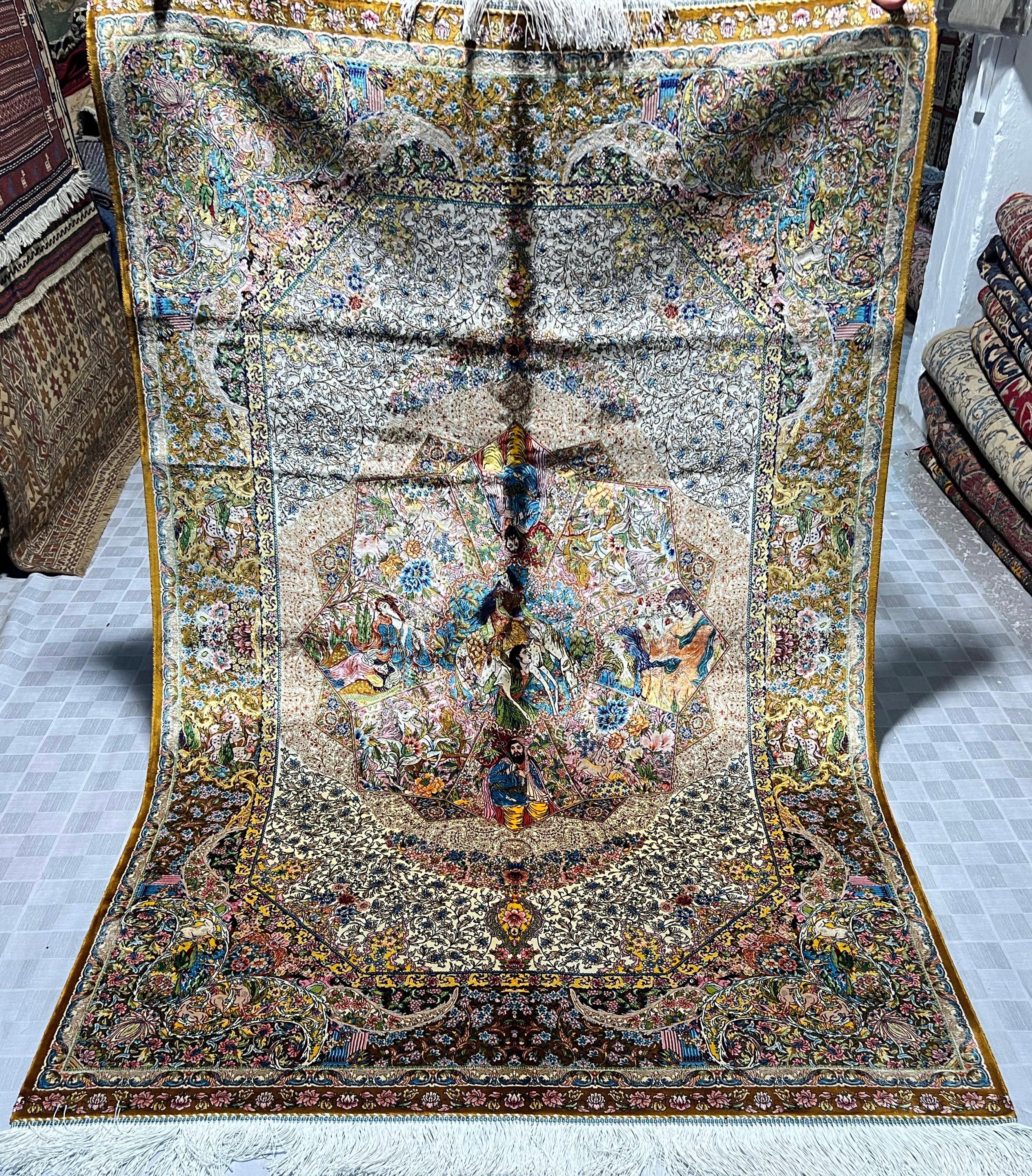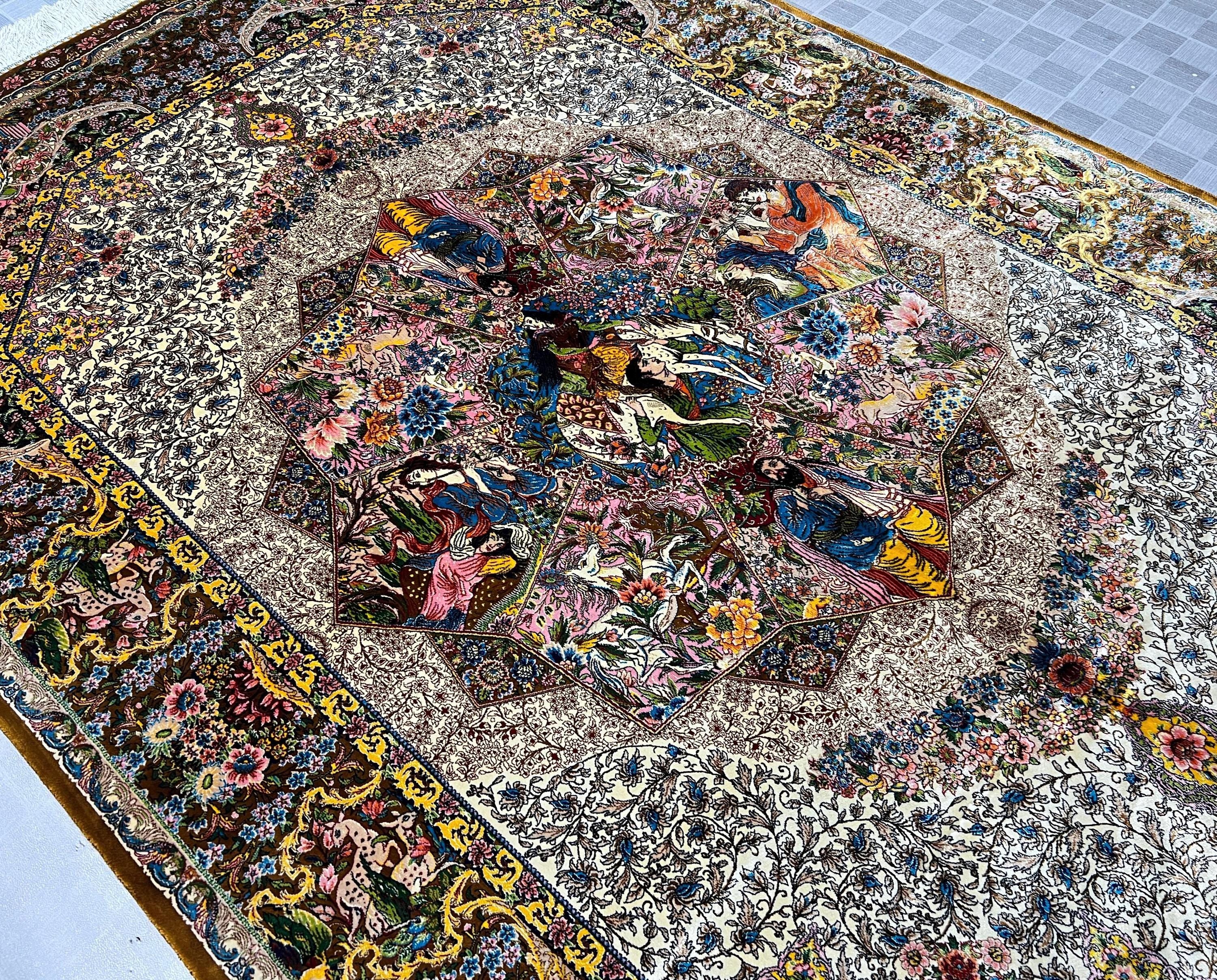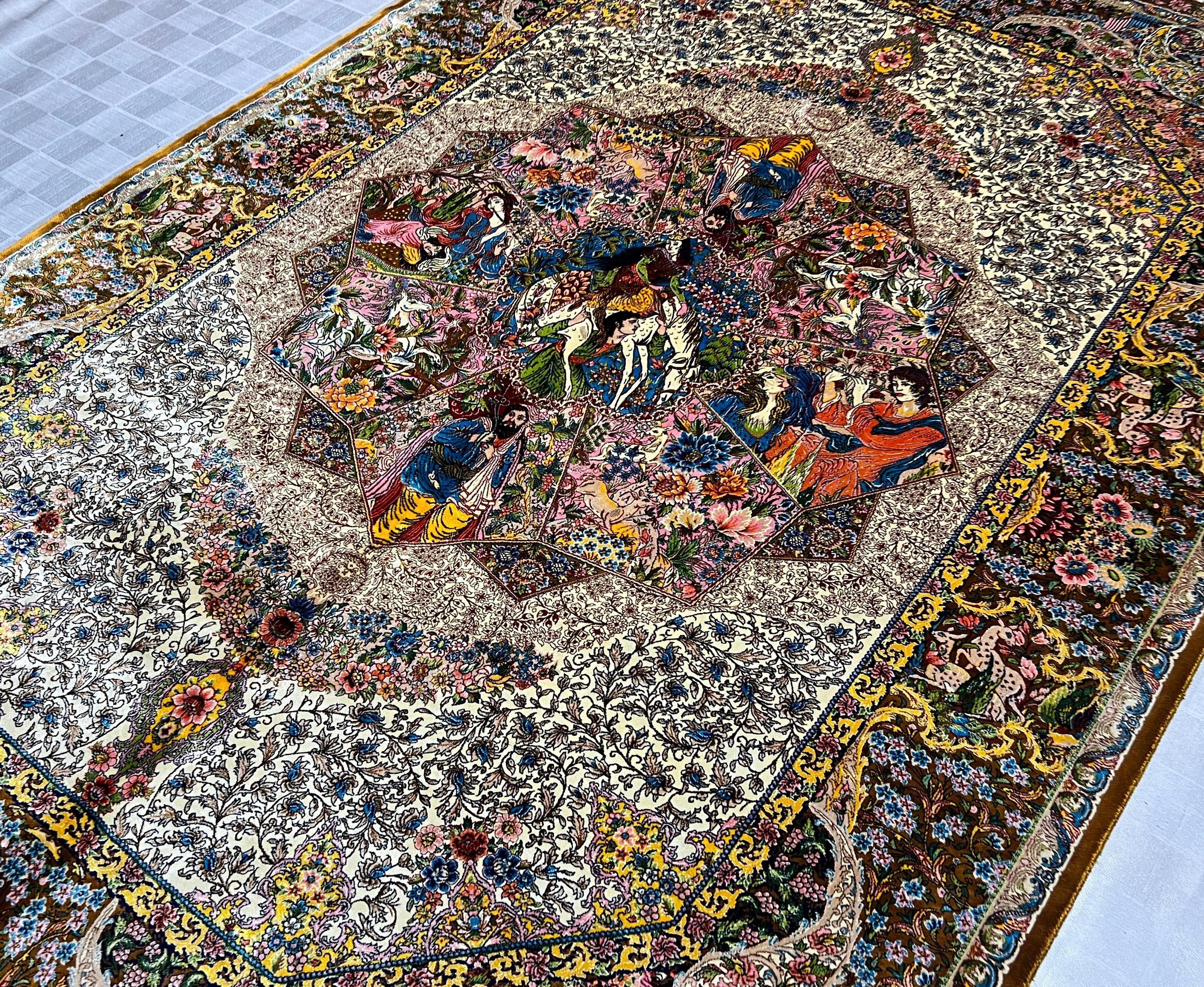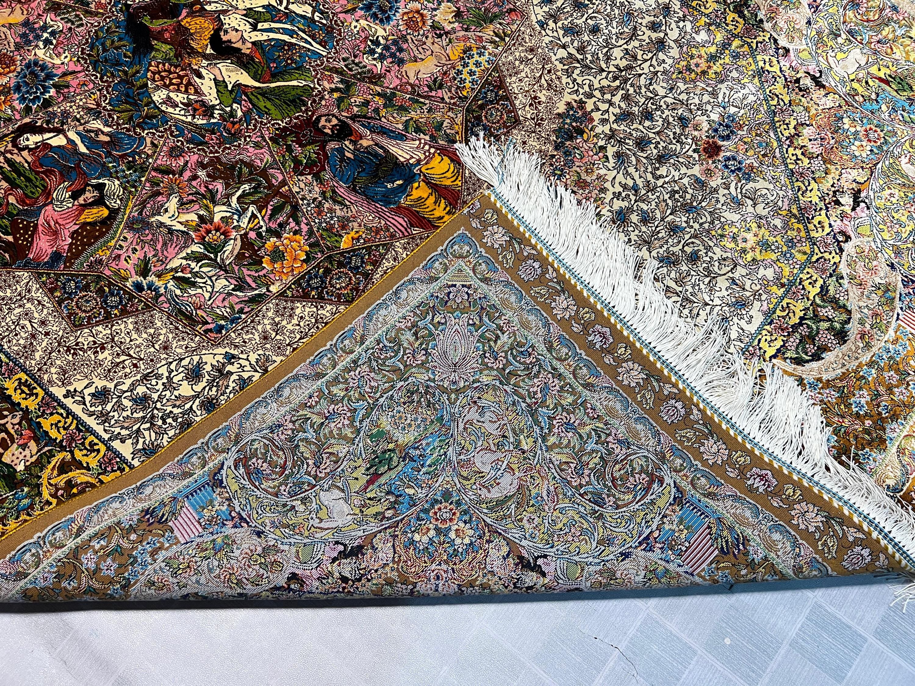 The center showcases beautifully illustrated figures surrounded by blooming flowers, intricate patterns, and rich storytelling imagery. The border is filled with graceful vines, delicate blossoms, and ornate detailing that highlight the exceptional craftsmanship of this fine-weave silk rug.