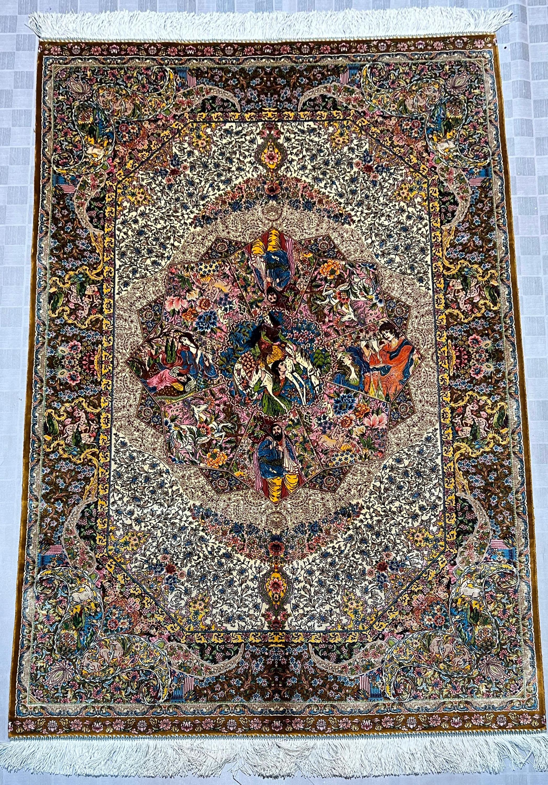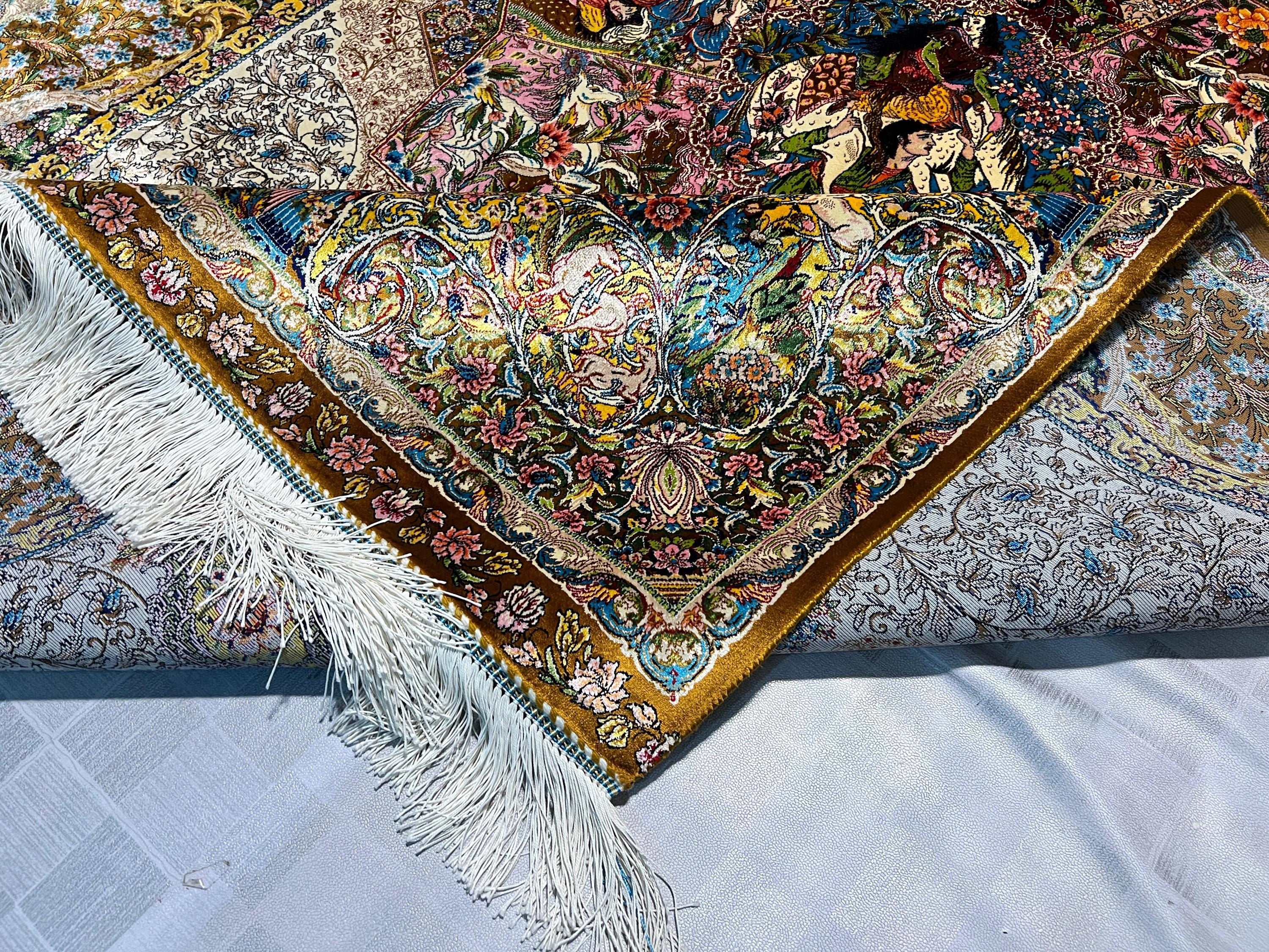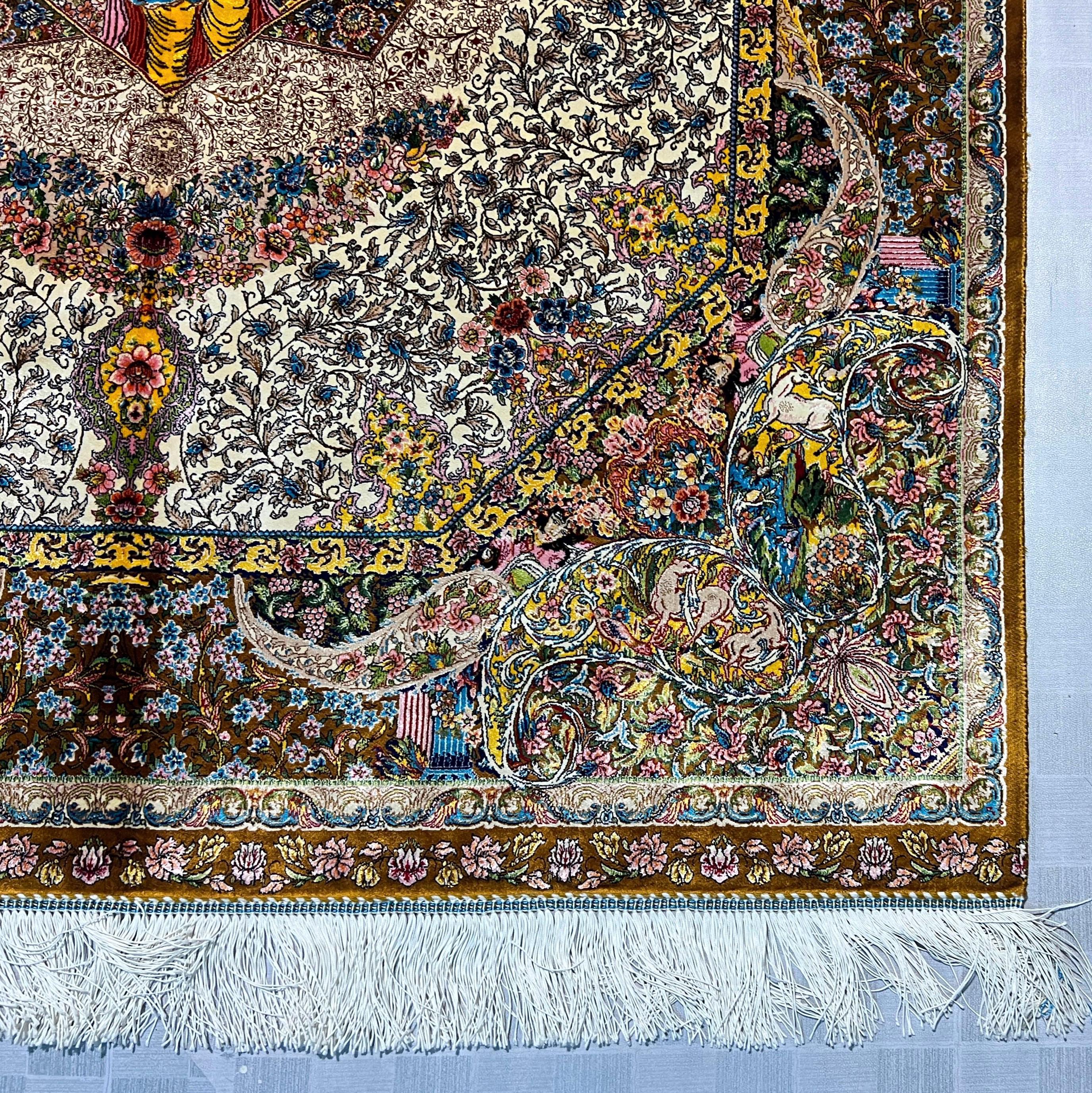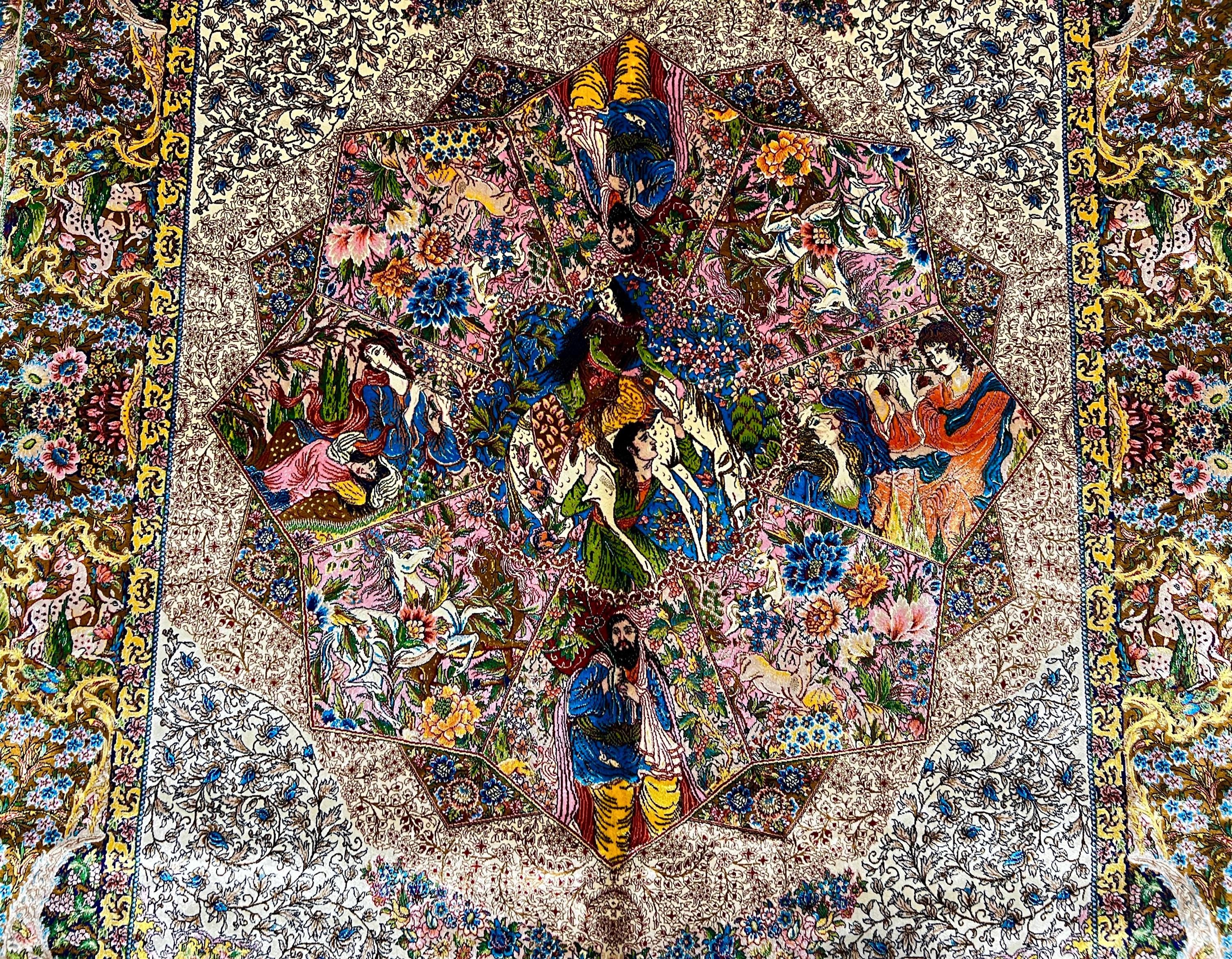 The center showcases beautifully illustrated figures surrounded by blooming flowers, intricate patterns, and rich storytelling imagery. The border is filled with graceful vines, delicate blossoms, and ornate detailing that highlight the exceptional craftsmanship of this fine-weave silk rug.
