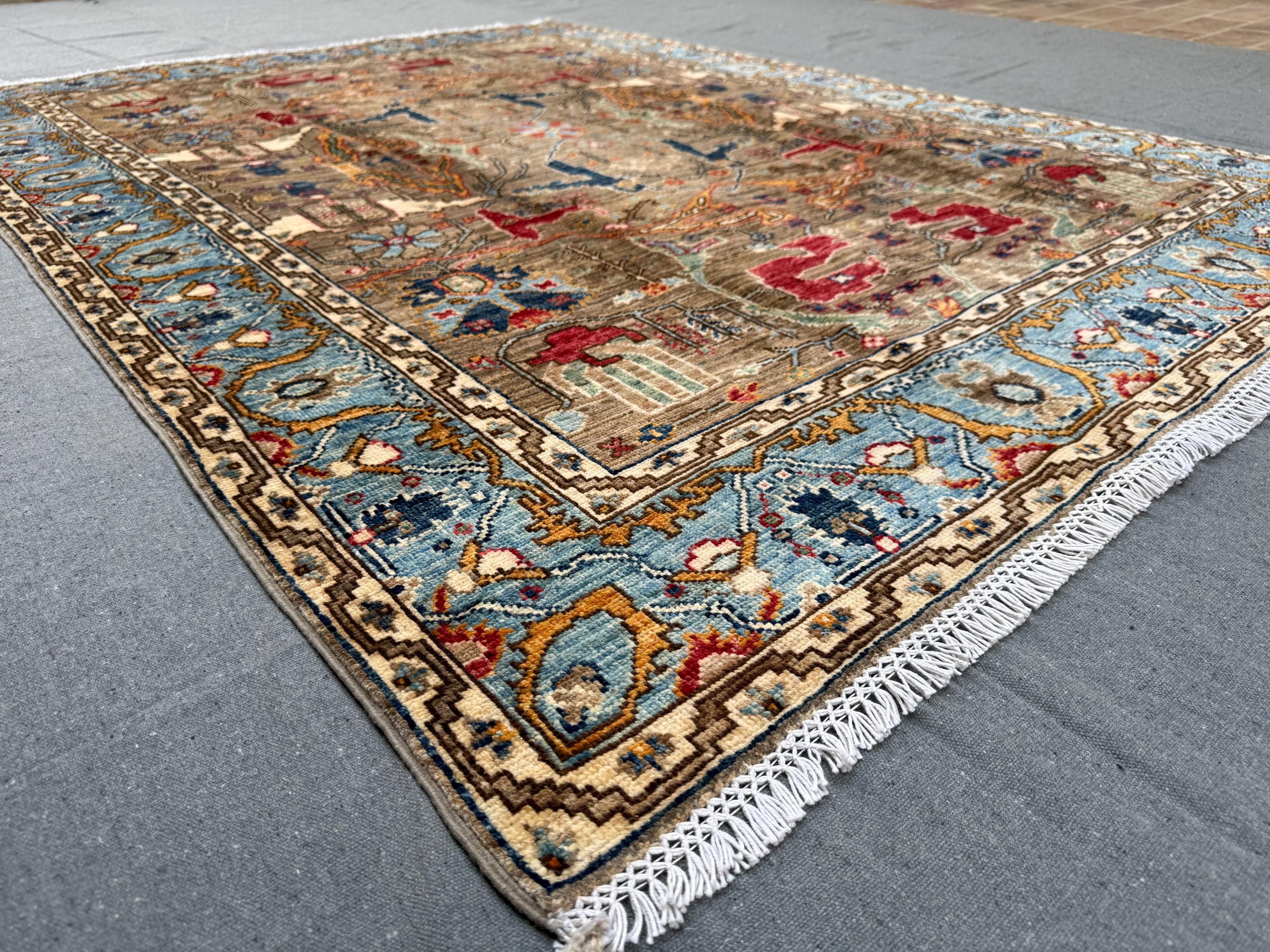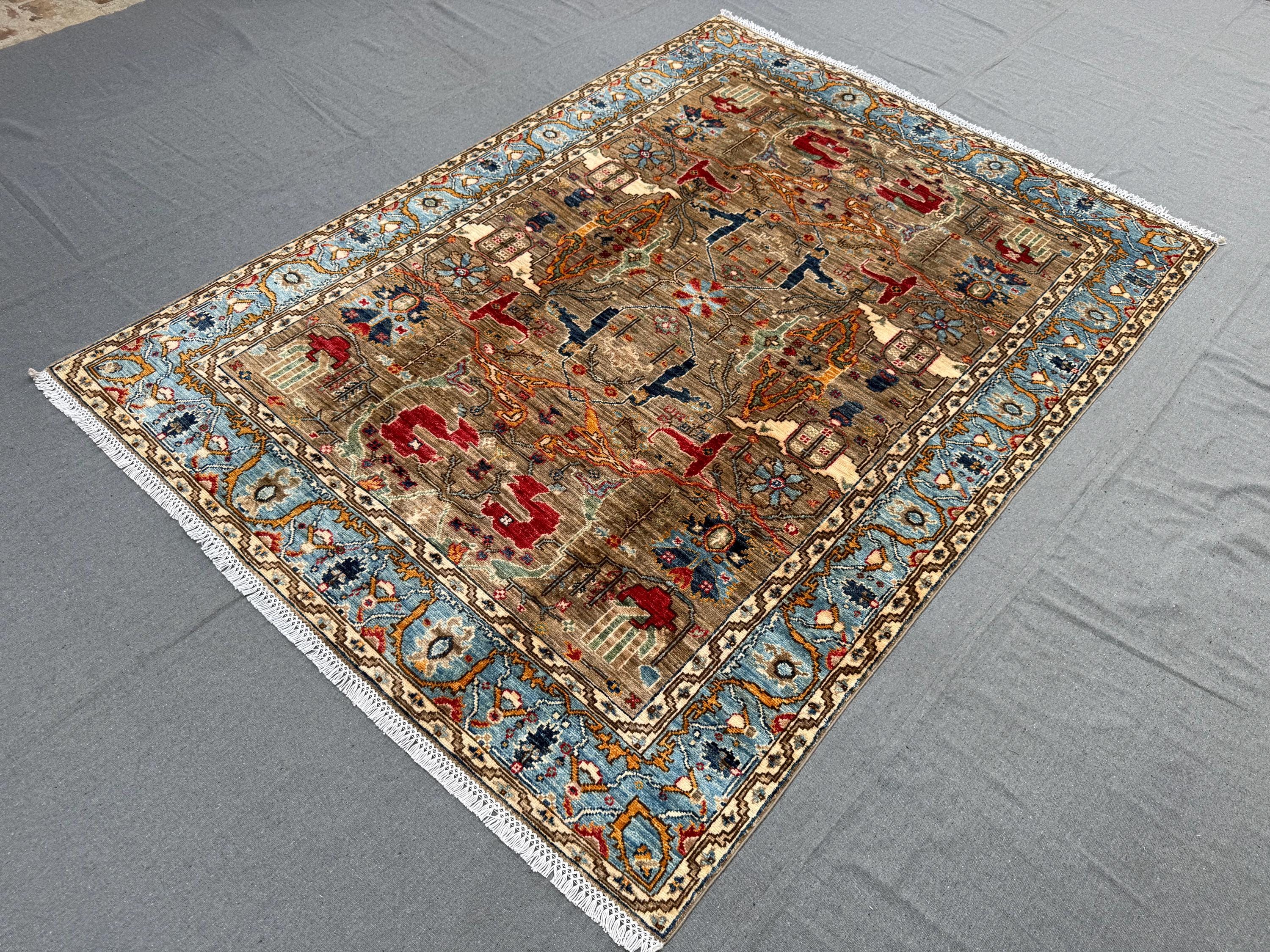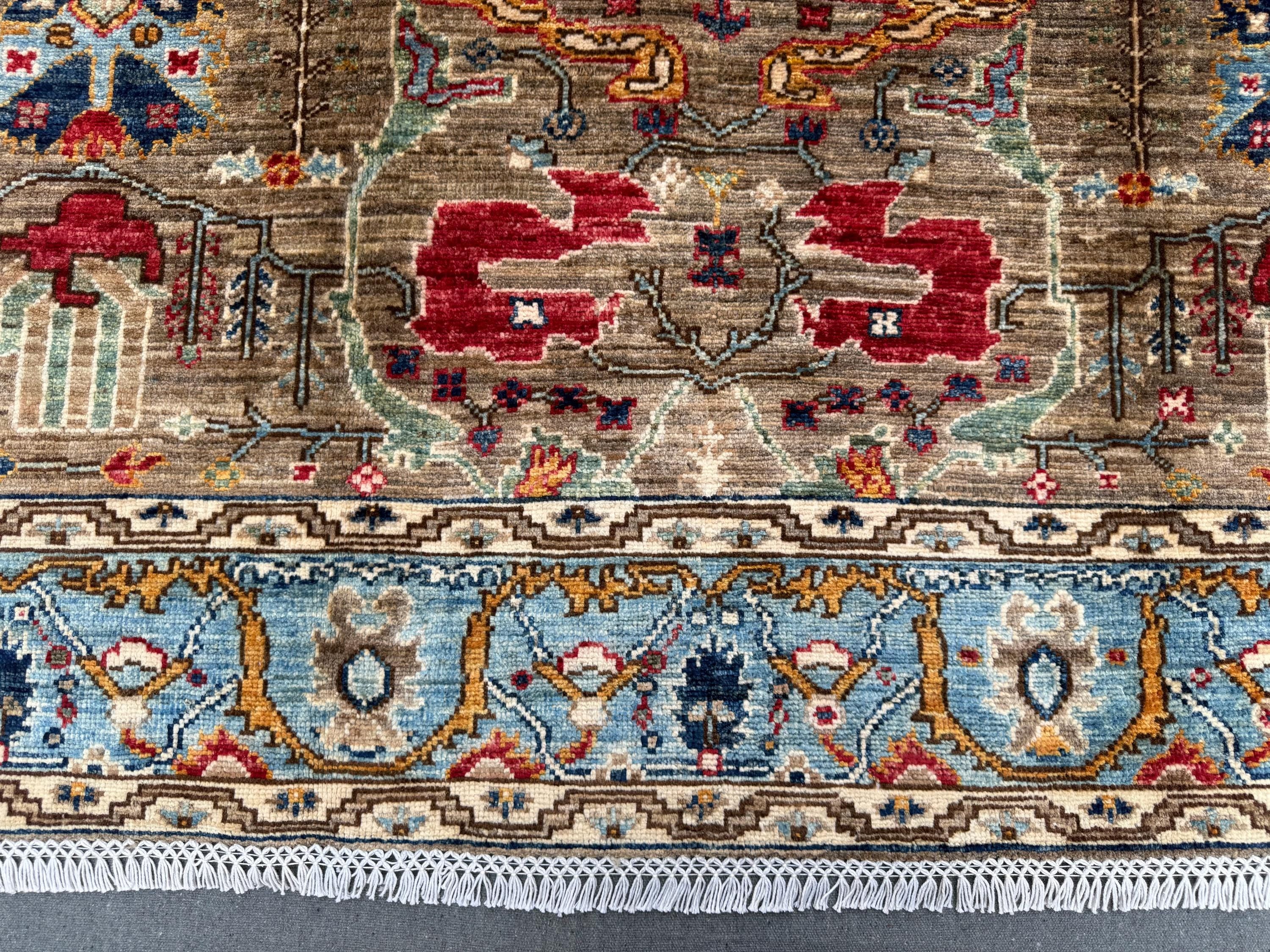 This stunning handmade Afghan Oriental rug features a rich brown field filled with beautifully woven tribal motifs in shades of navy, red, ivory, orange, teal, and soft green. The symmetrical medallion layout and the artistic border in sky blue and beige showcase the timeless craftsmanship of Afghan weaving.