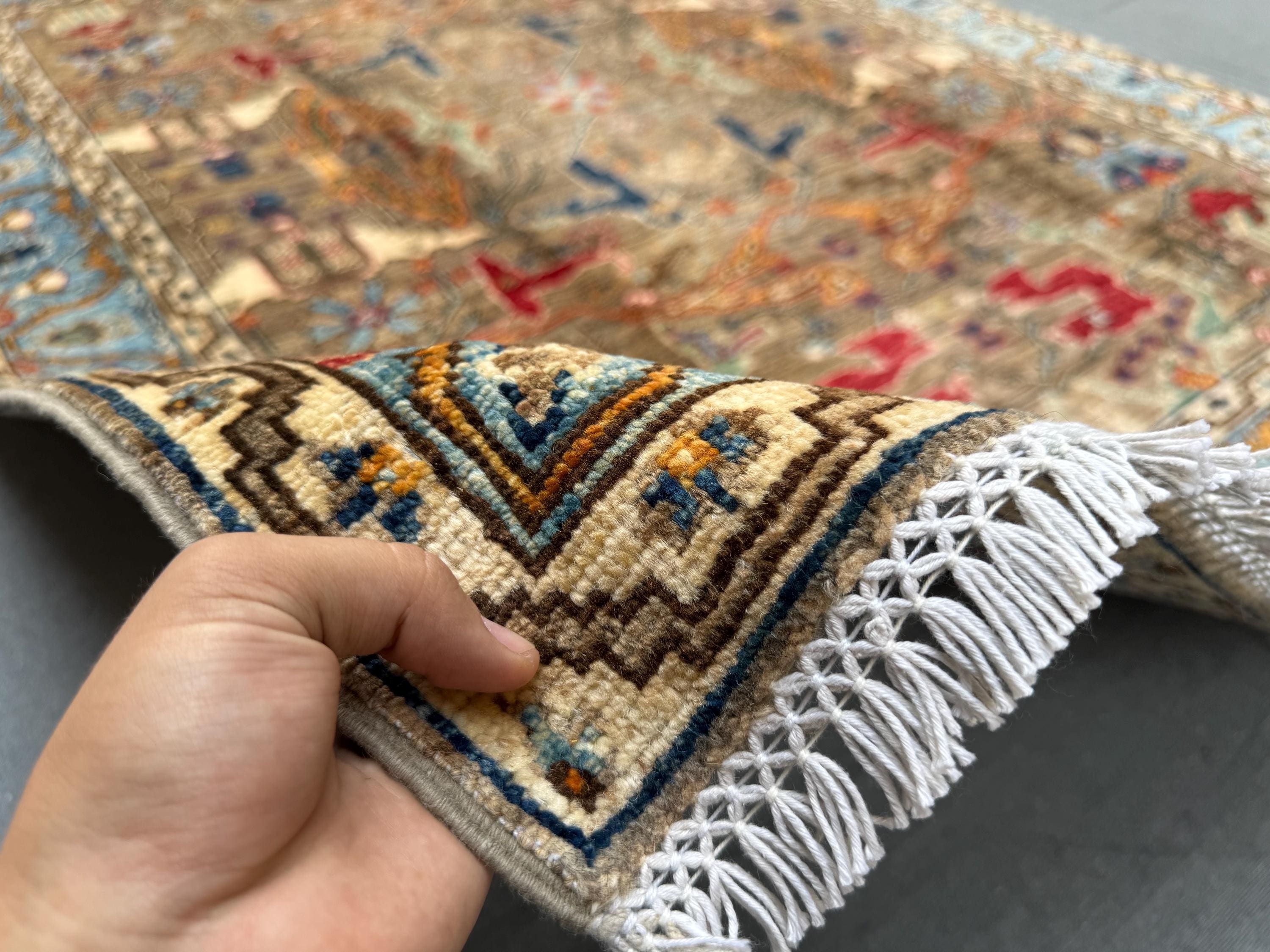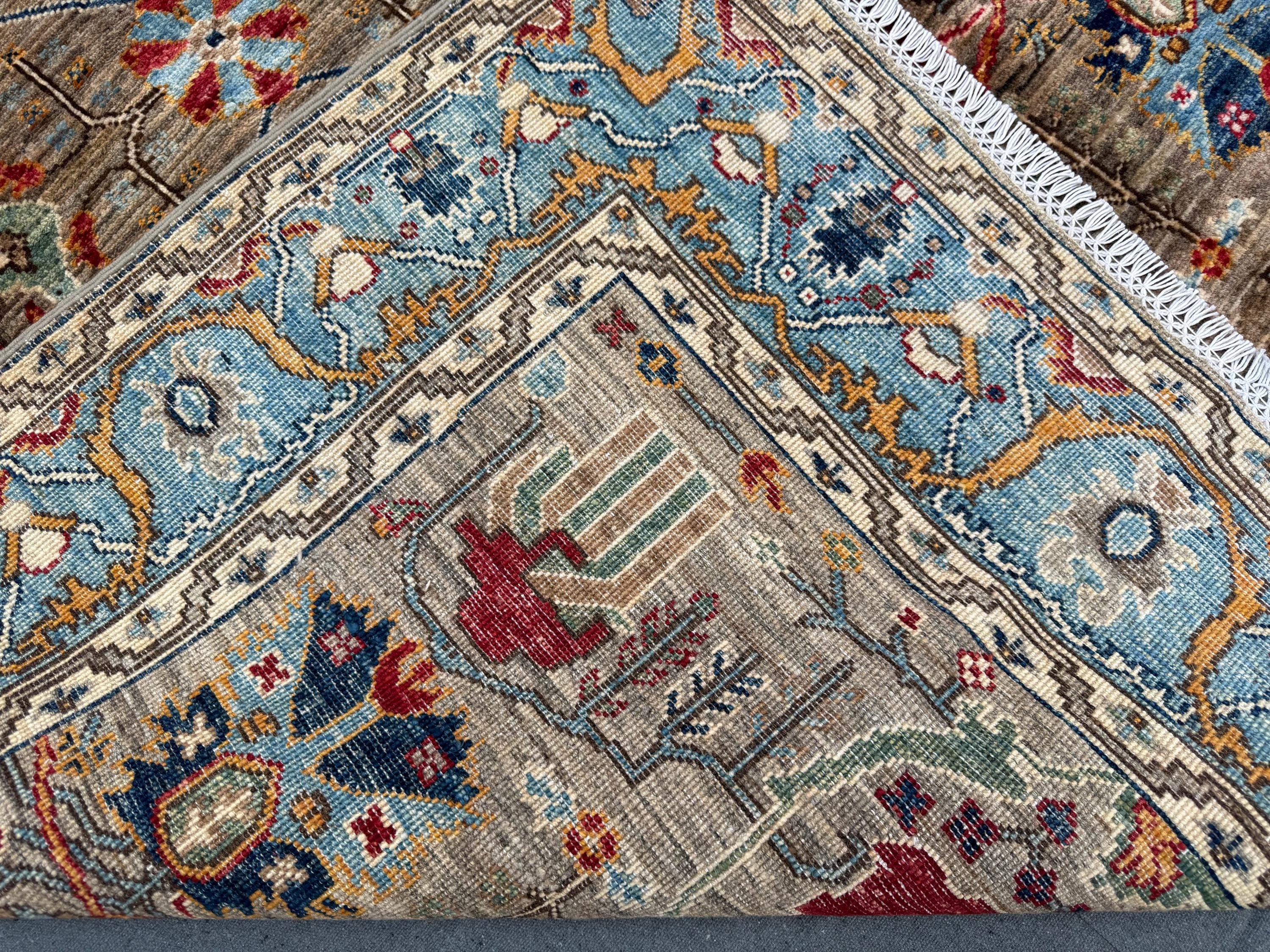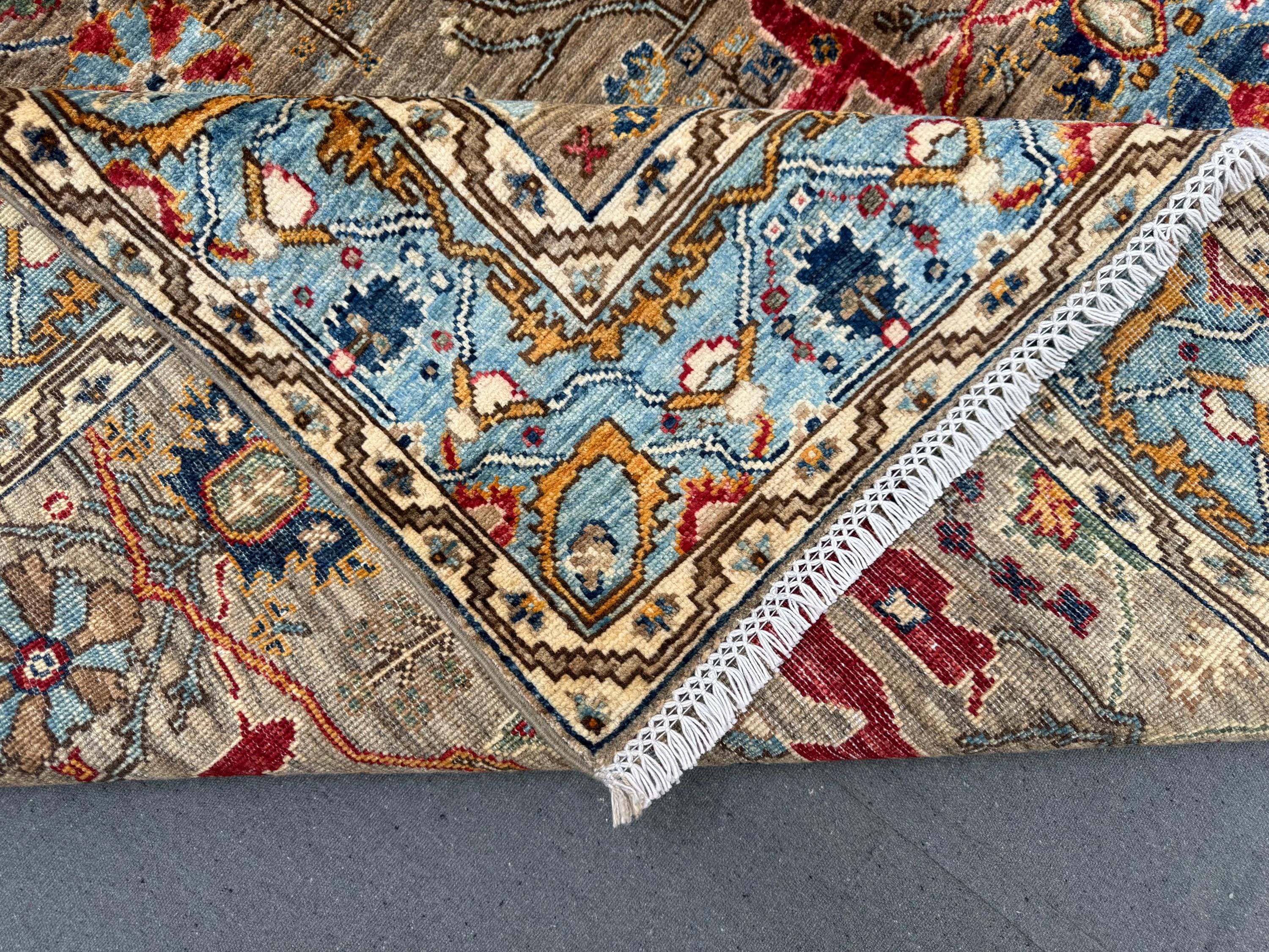 Hand-knotted using 100% premium wool, this rug offers long-lasting durability, a plush yet sturdy feel, and natural variations in color that shift beautifully in different lighting. The detailed patterns, bold color contrasts, and traditional tribal look make this rug an excellent statement piece for any interior.