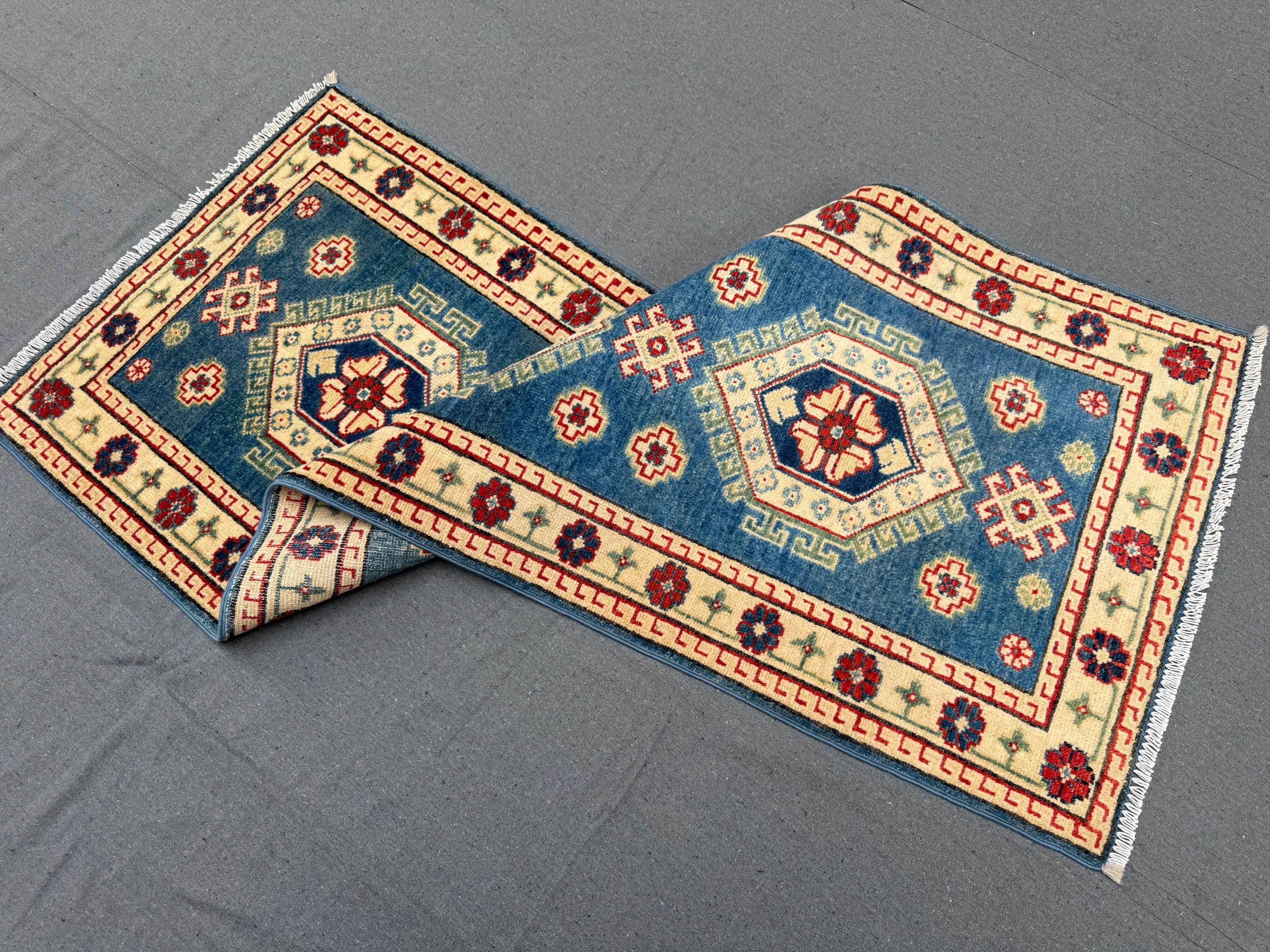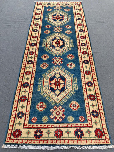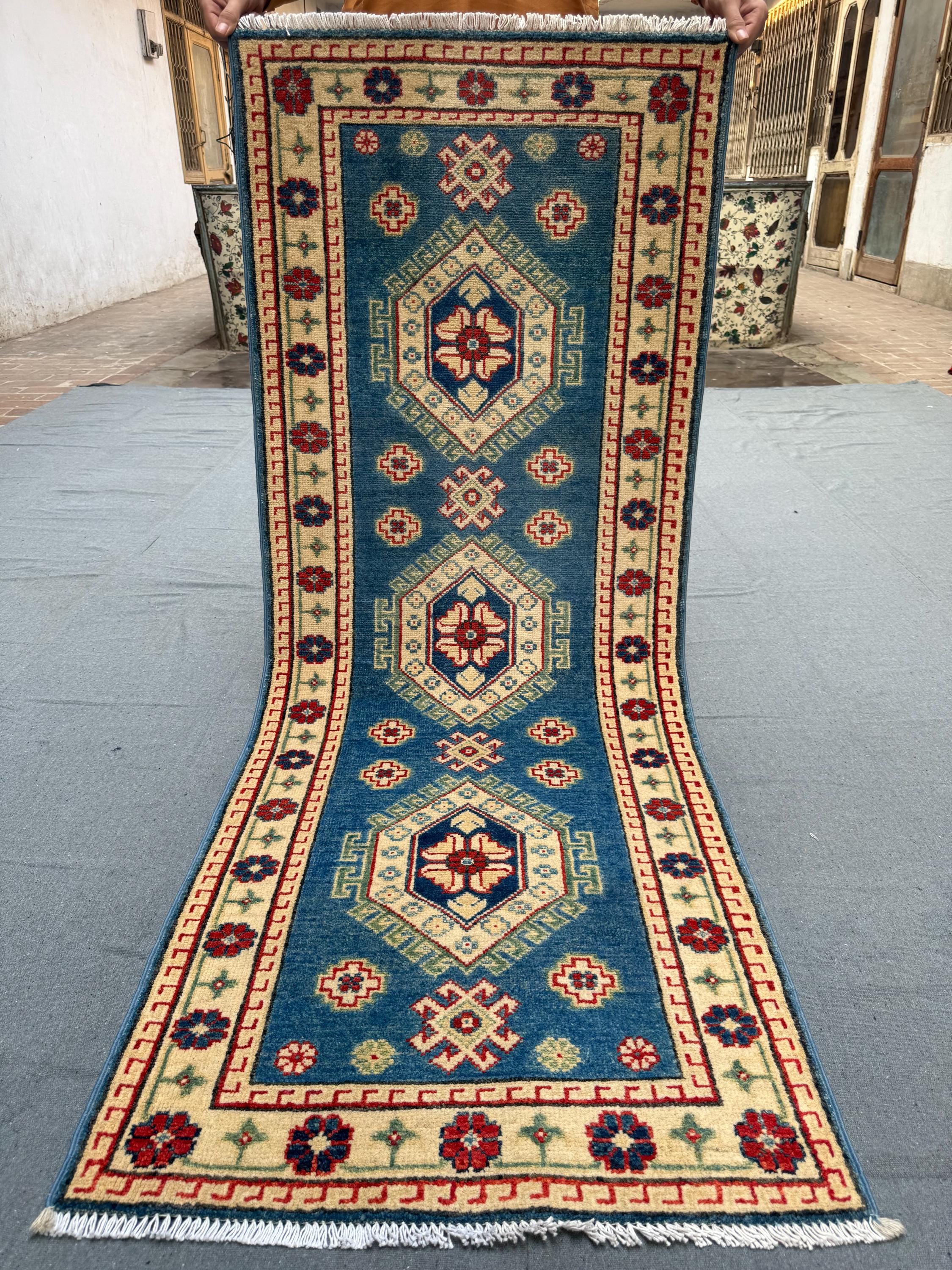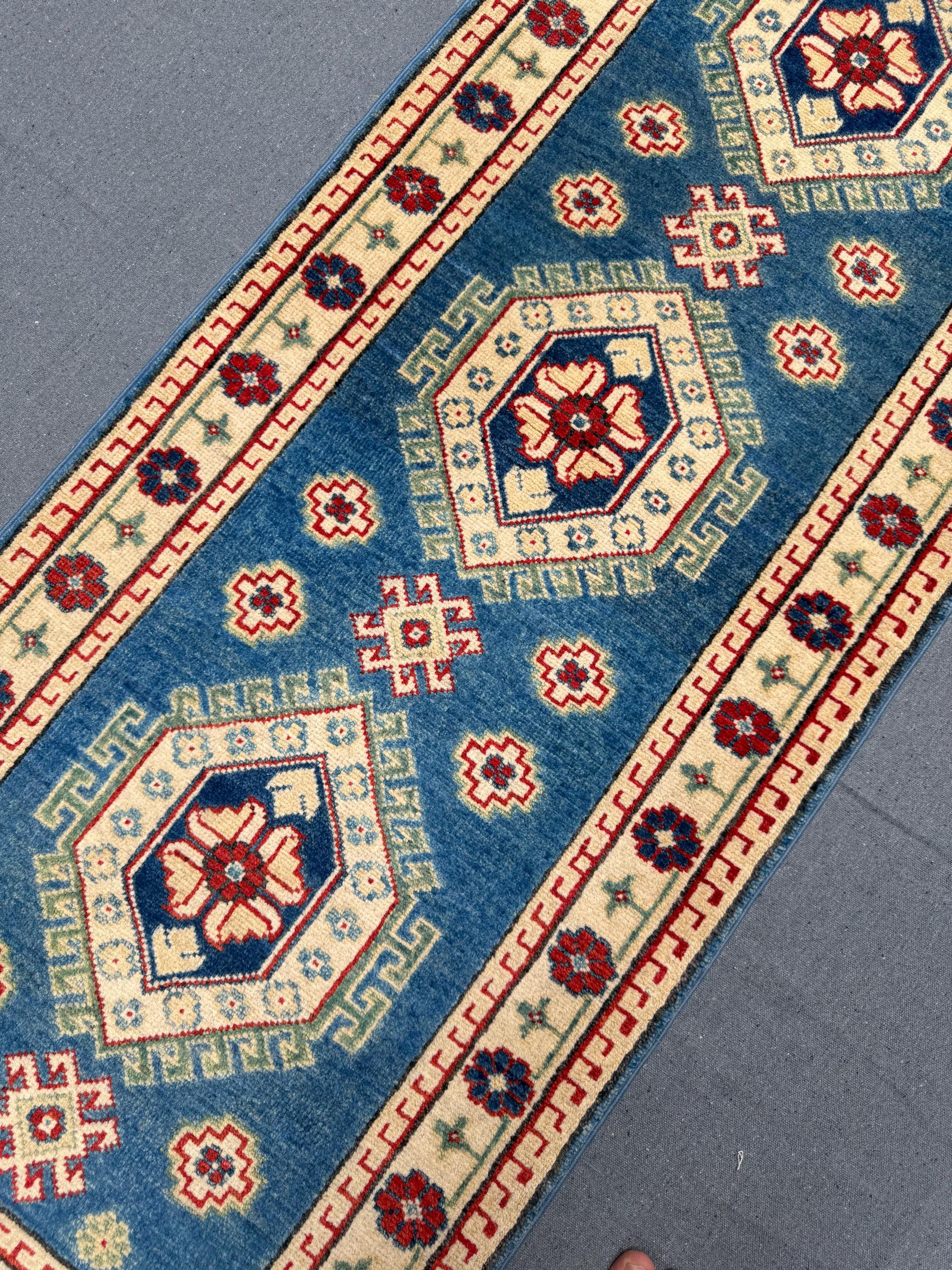Blue Kazak Runner Rug 2.4x6 ft Hand-Knotted Wool Afghan Runner, Ivory Border Tribal Rug, Geometric Hallway Carpet Handmade Wool