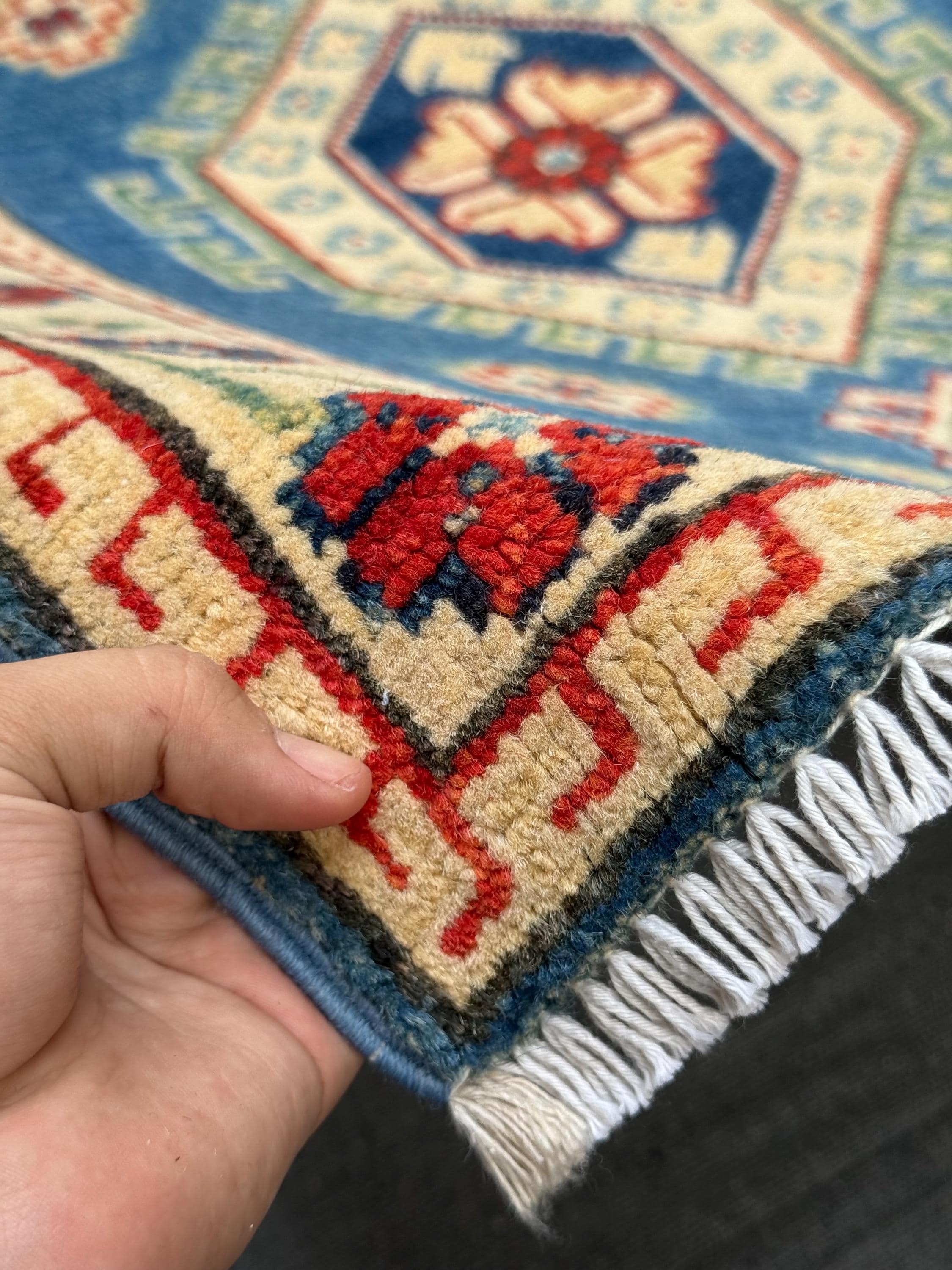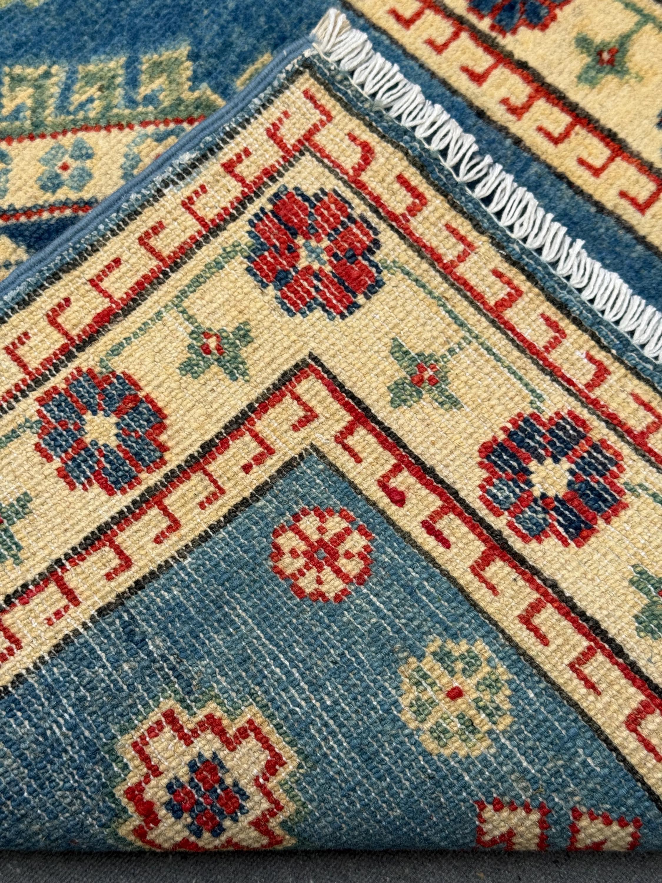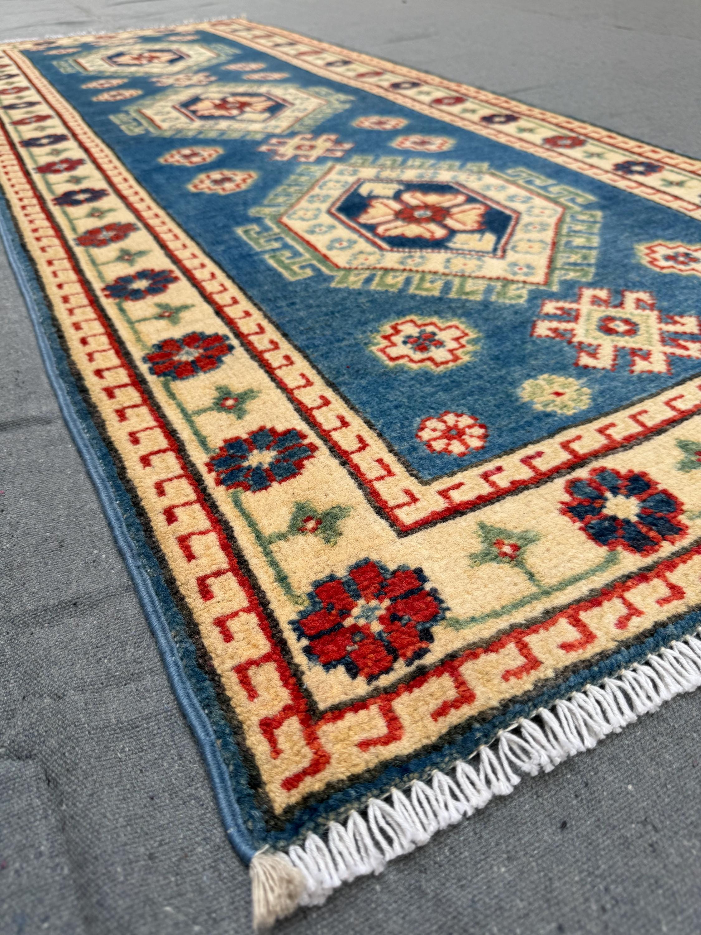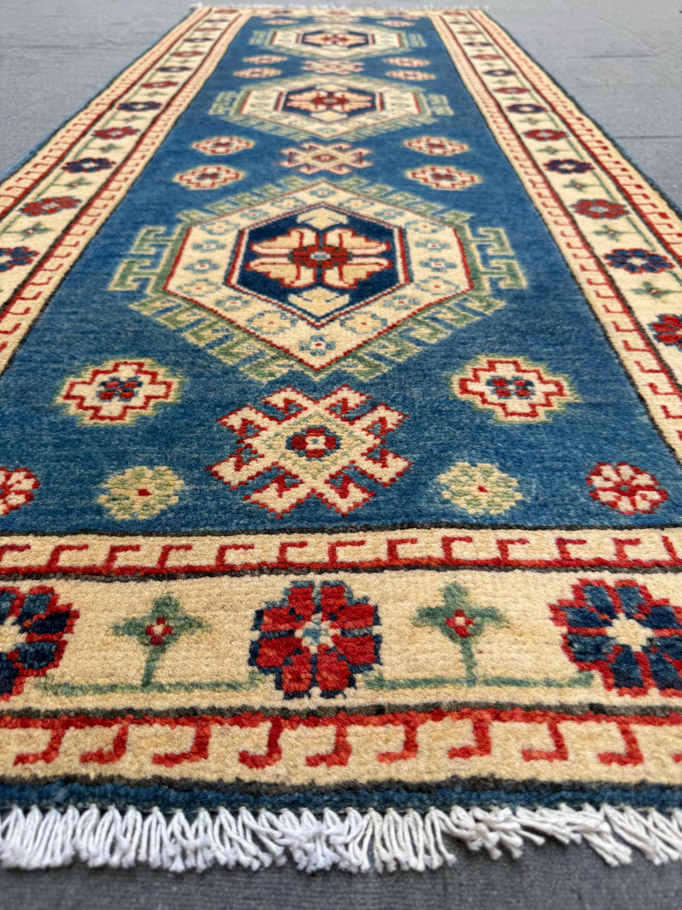 Add timeless Afghan artistry to your space with this beautiful blue Kazak runner rug, hand-knotted from 100% premium wool. The bold sky-blue field is framed by a cream border adorned with red floral motifs, creating a stunning contrast that complements both modern and traditional interiors.
