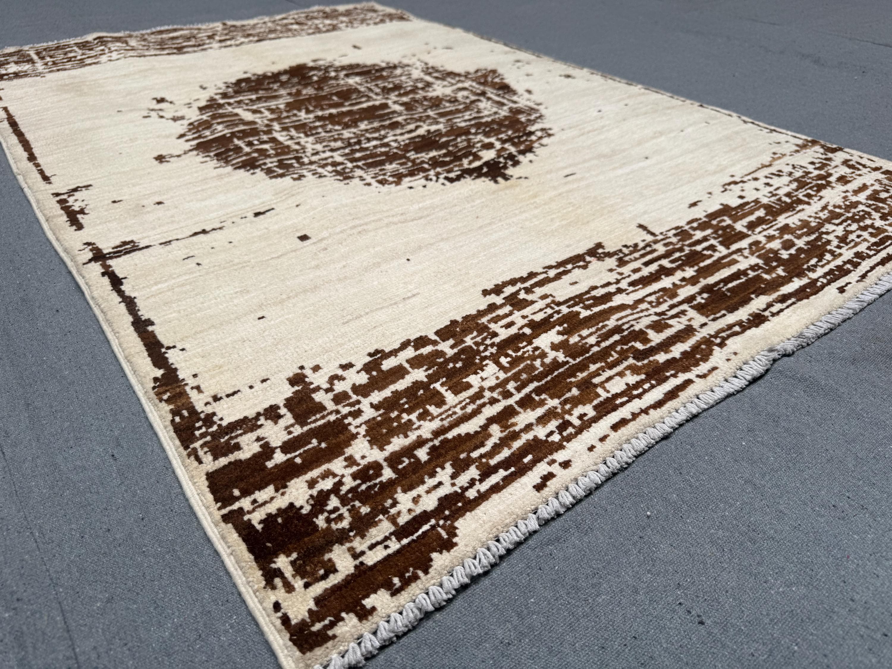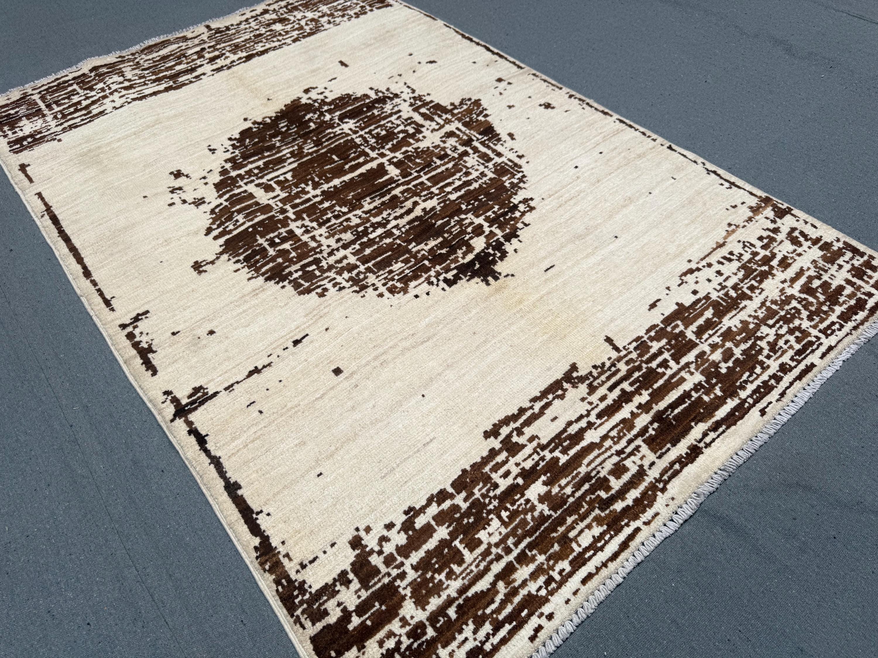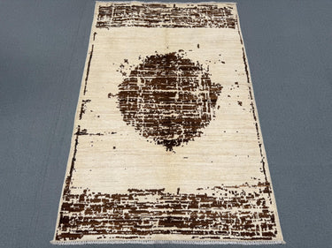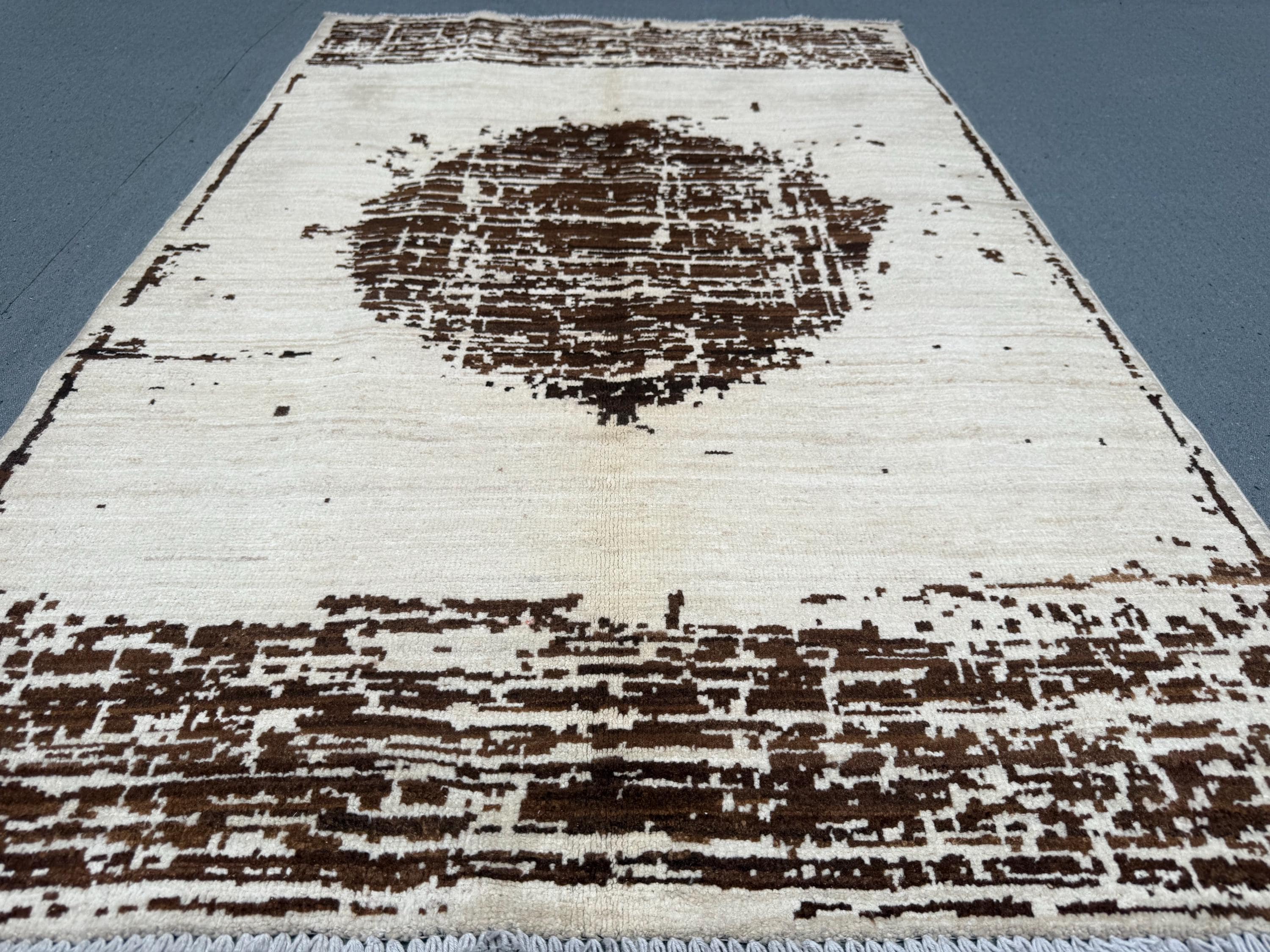 This handmade Gabbeh rug features a striking modern abstract design with a distressed circular motif centered on a warm beige background. The bold brown detailing creates a textured, artistic contrast, giving the rug a clean minimalist look while still offering depth and personality. Its contemporary styling makes it a perfect choice for modern, Scandinavian, Japandi, or minimalist interiors.