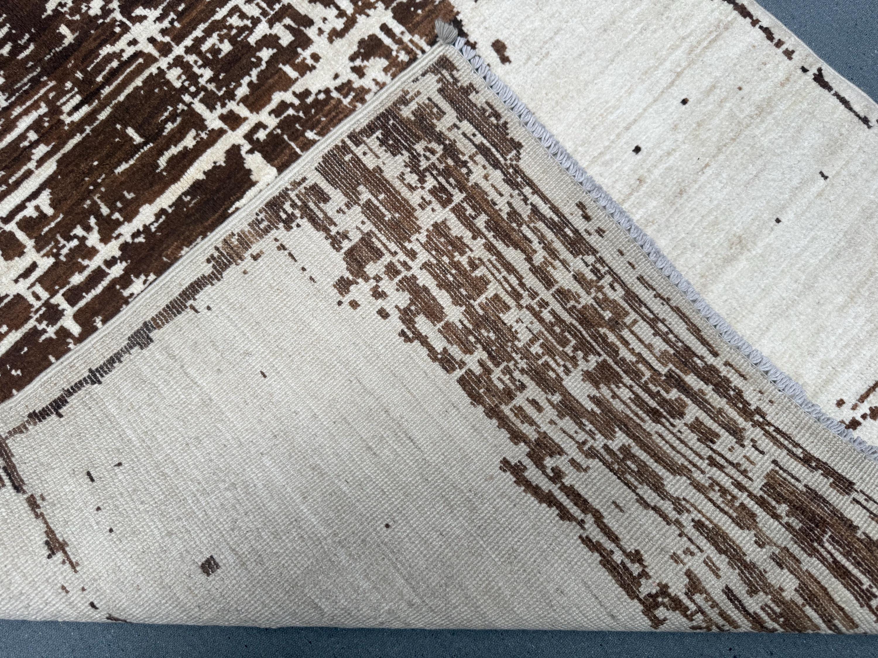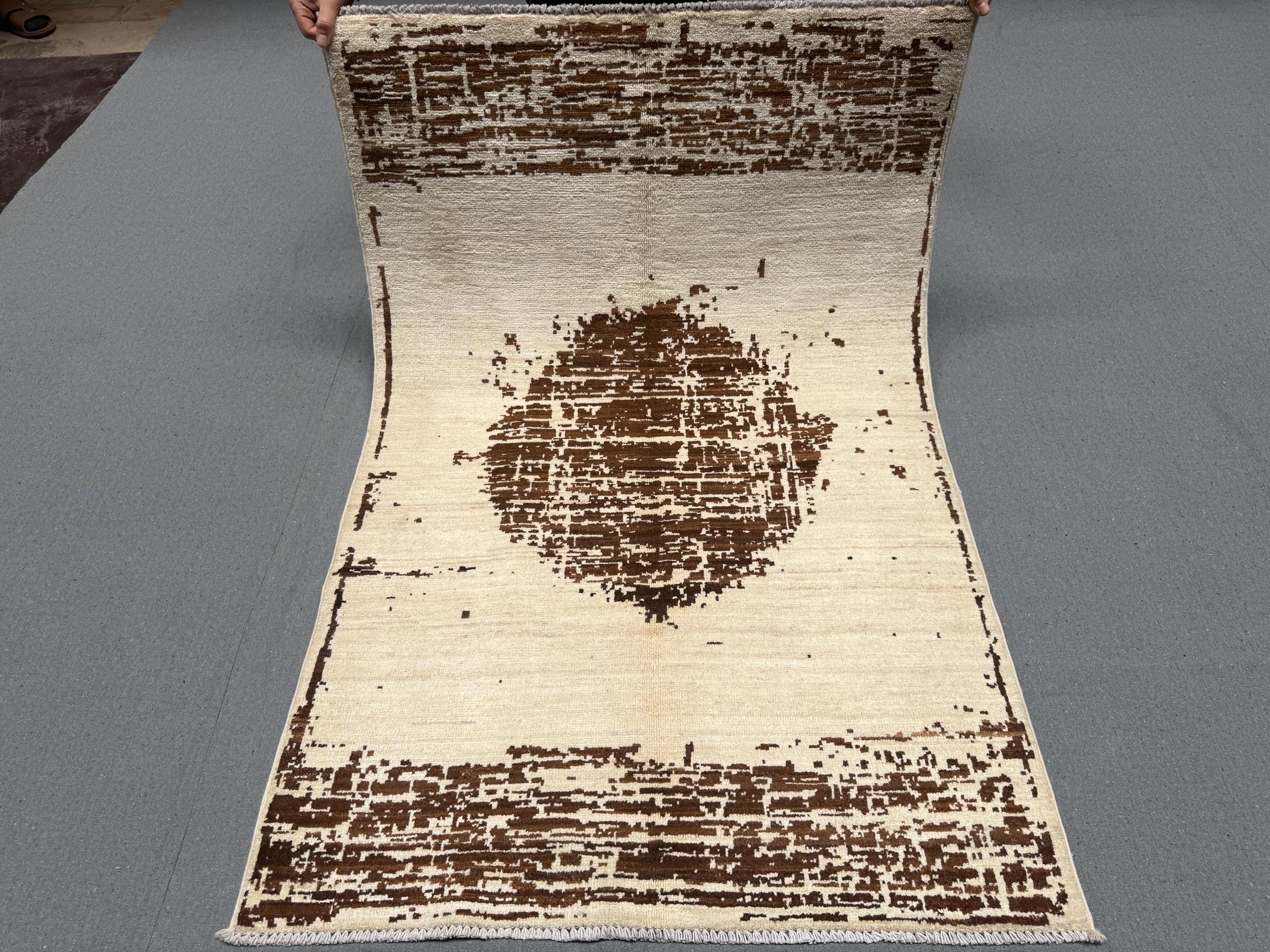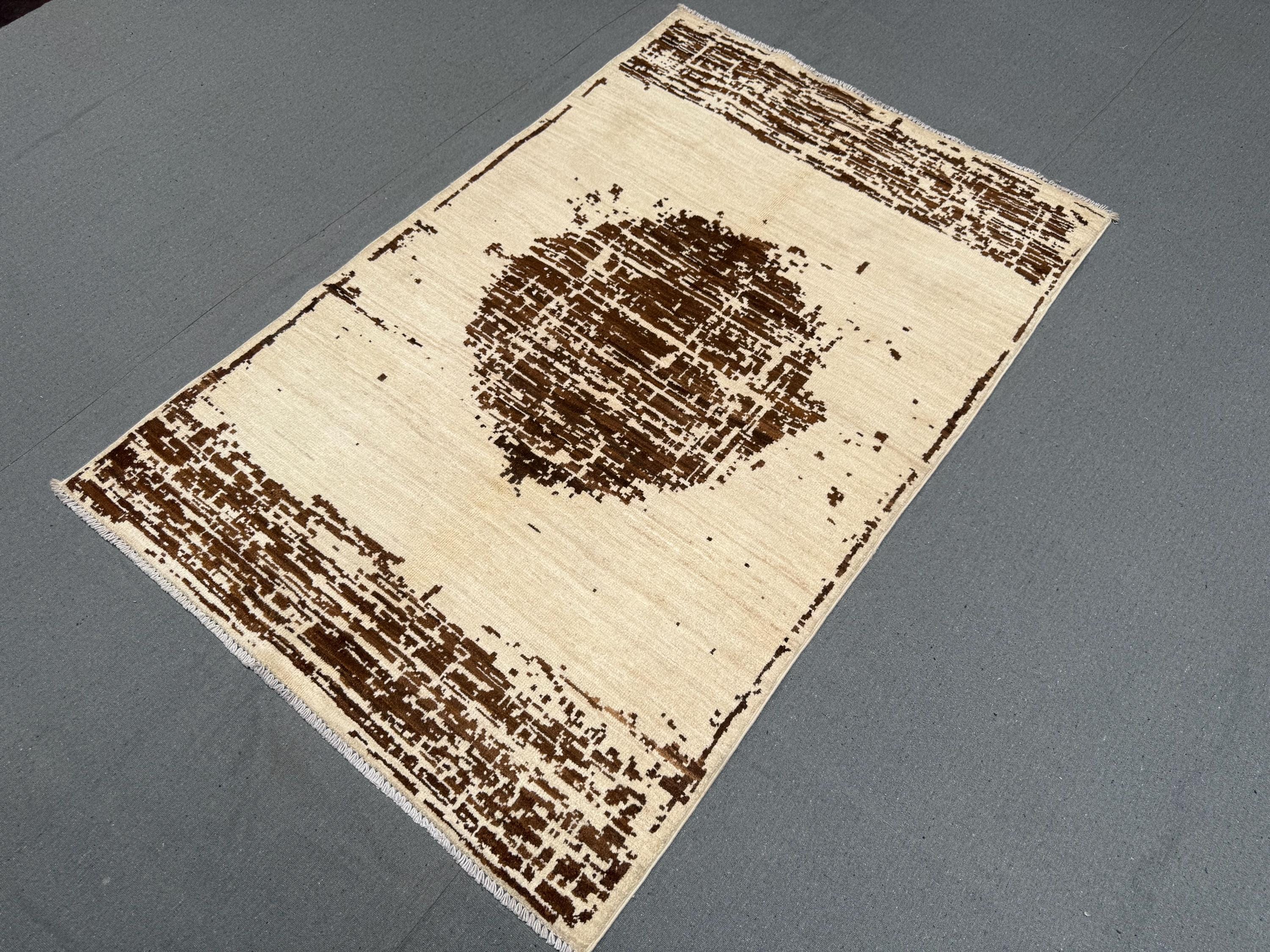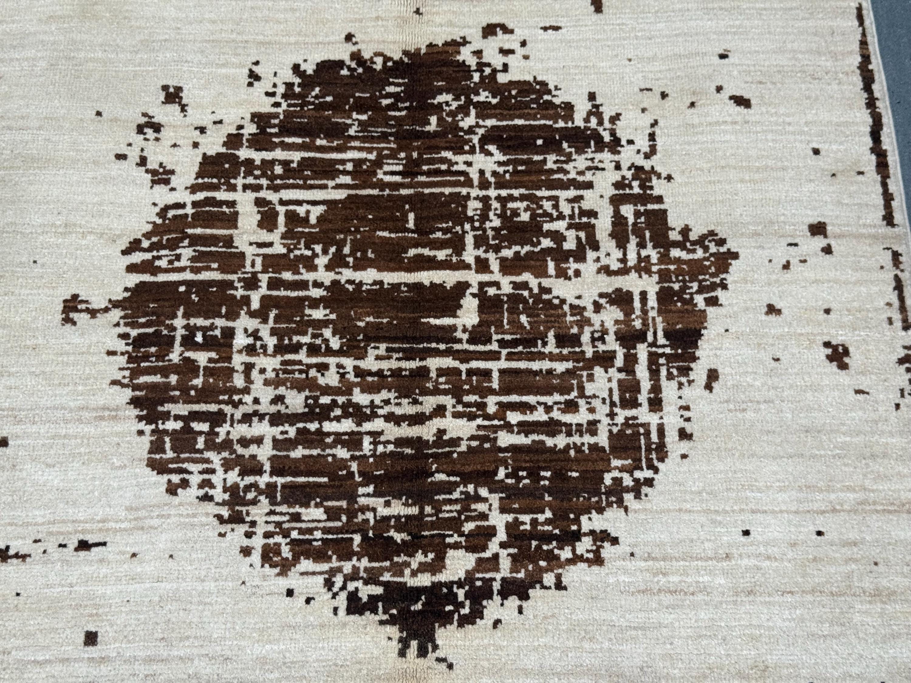This handmade Gabbeh rug features a striking modern abstract design with a distressed circular motif centered on a warm beige background. The bold brown detailing creates a textured, artistic contrast, giving the rug a clean minimalist look while still offering depth and personality. Its contemporary styling makes it a perfect choice for modern, Scandinavian, Japandi, or minimalist interiors.