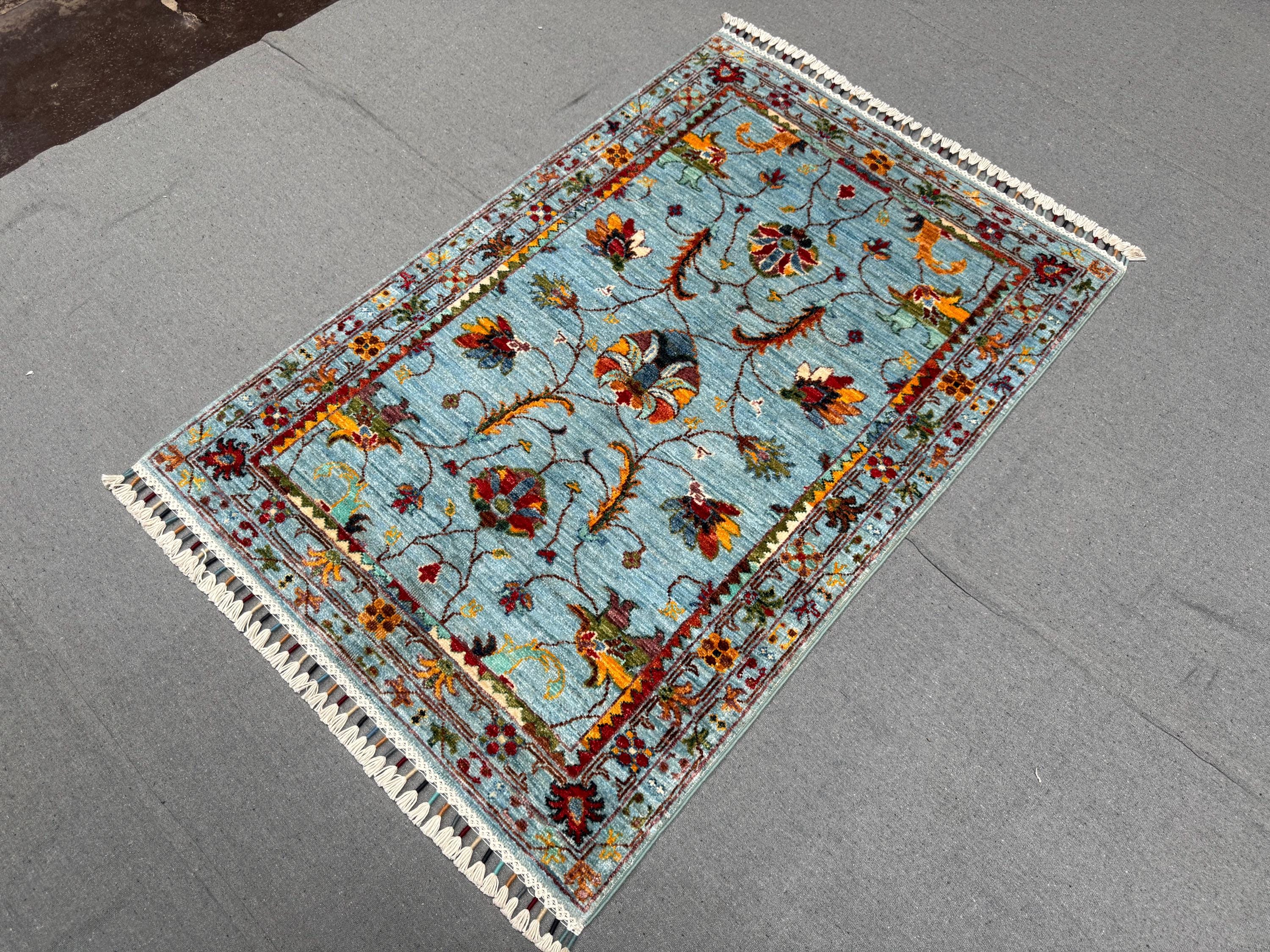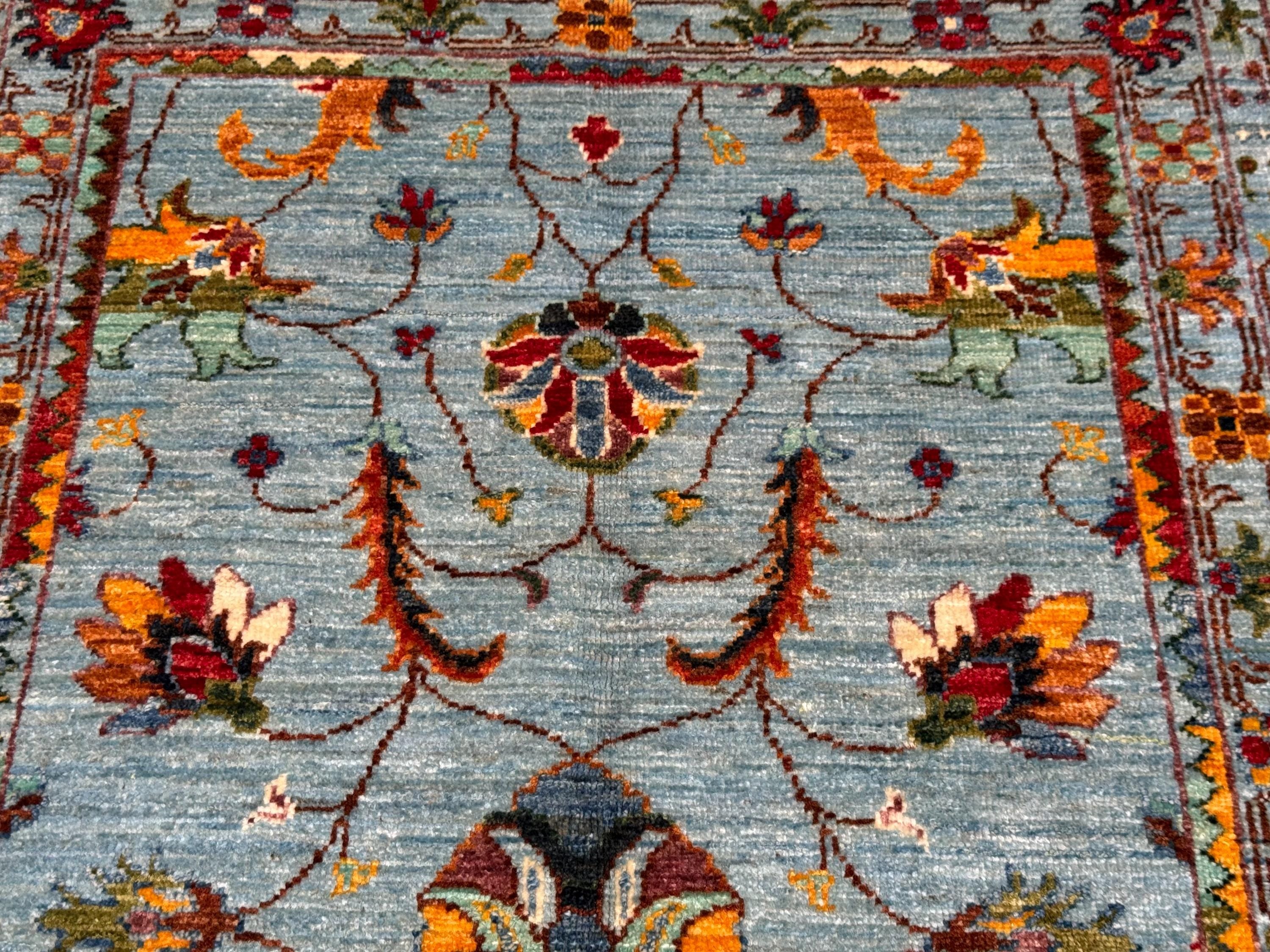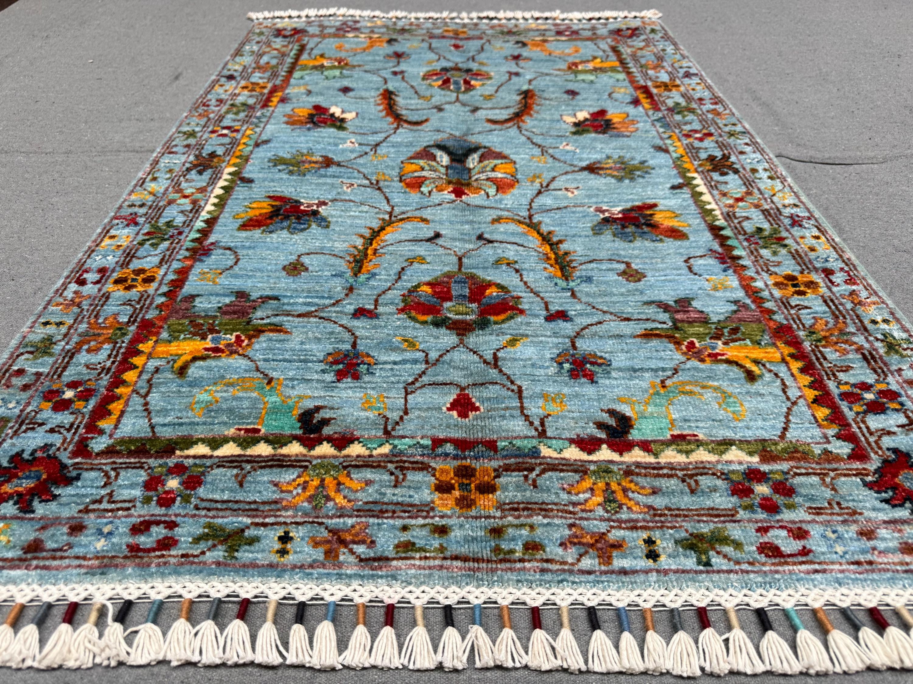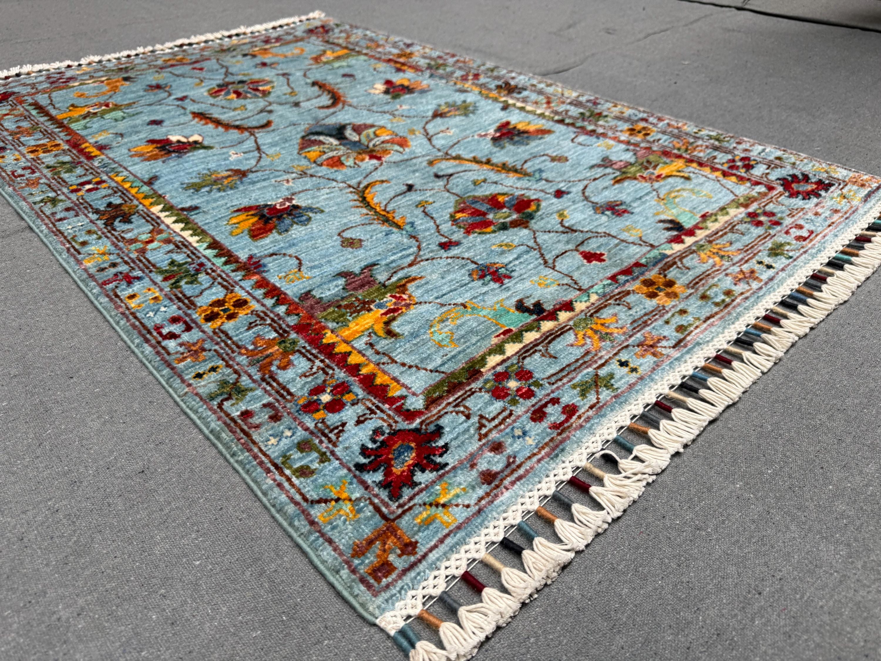 Brighten your space with this stunning Handmade Afghan Sultani Rug, featuring a refreshing sky-blue background and vibrant floral motifs that instantly bring energy and warmth into any room. The rich reds, golds, greens, and earthy tones create a dynamic contrast that feels both artistic and inviting.