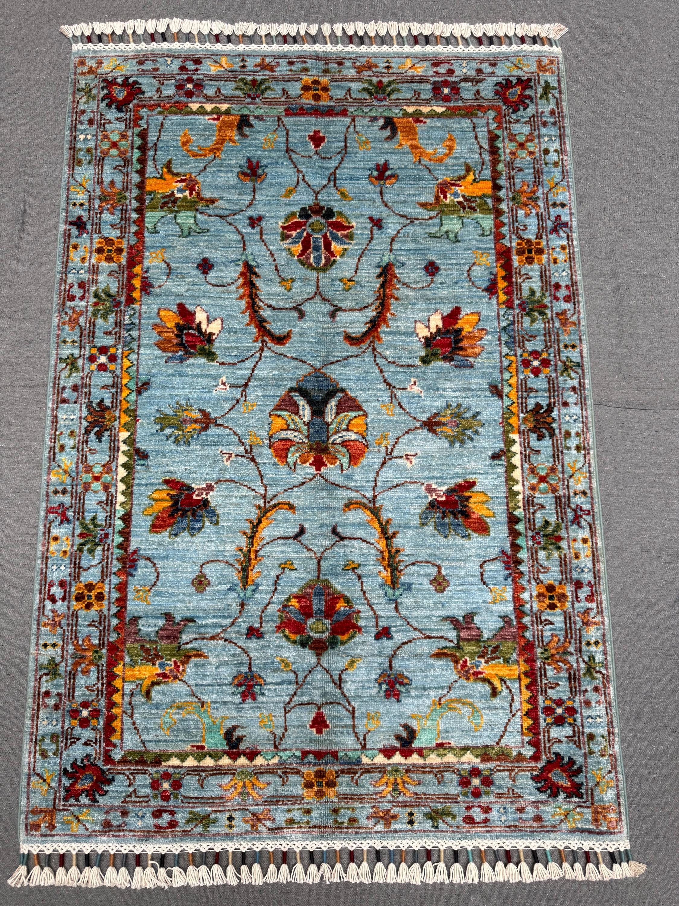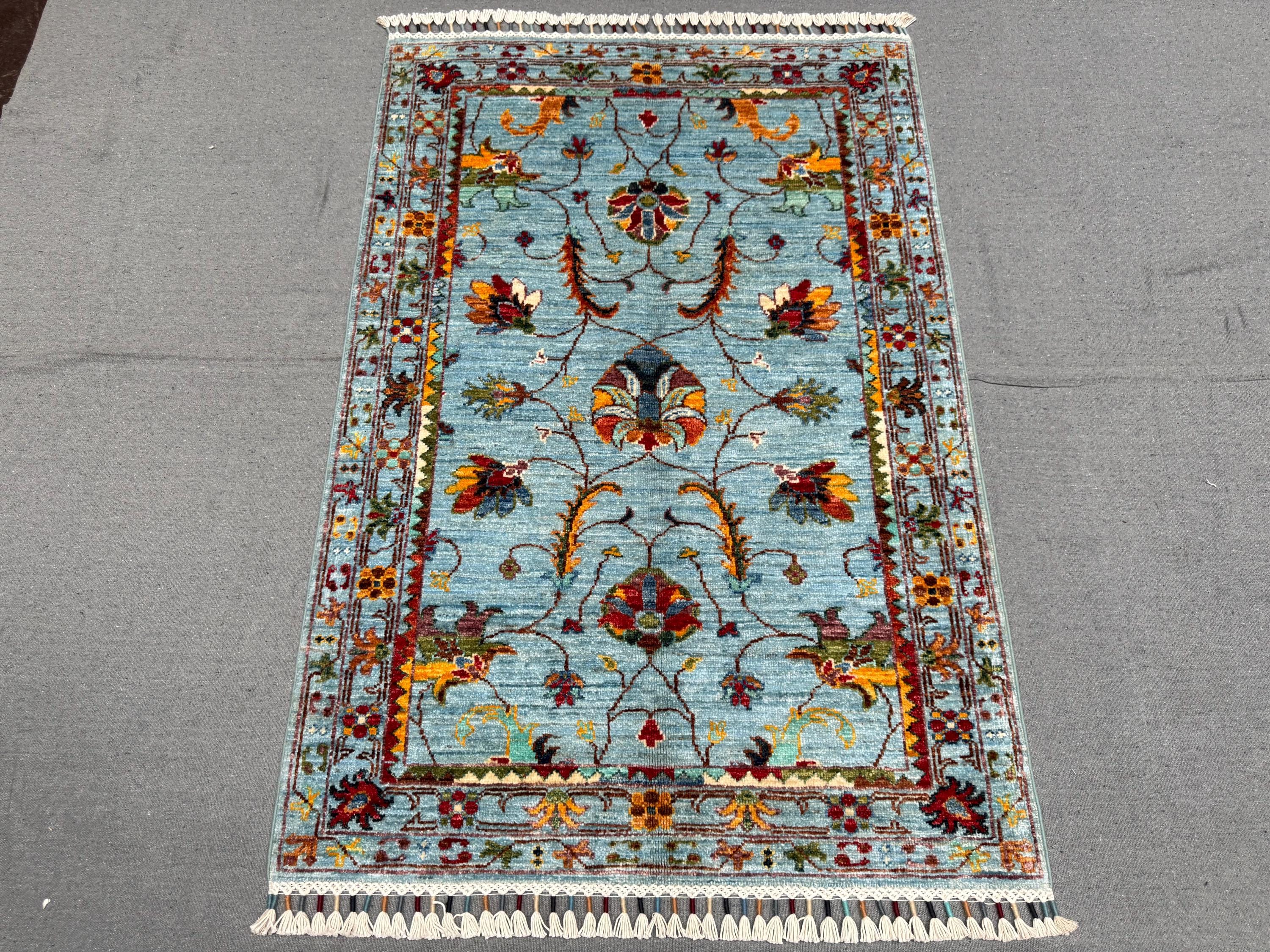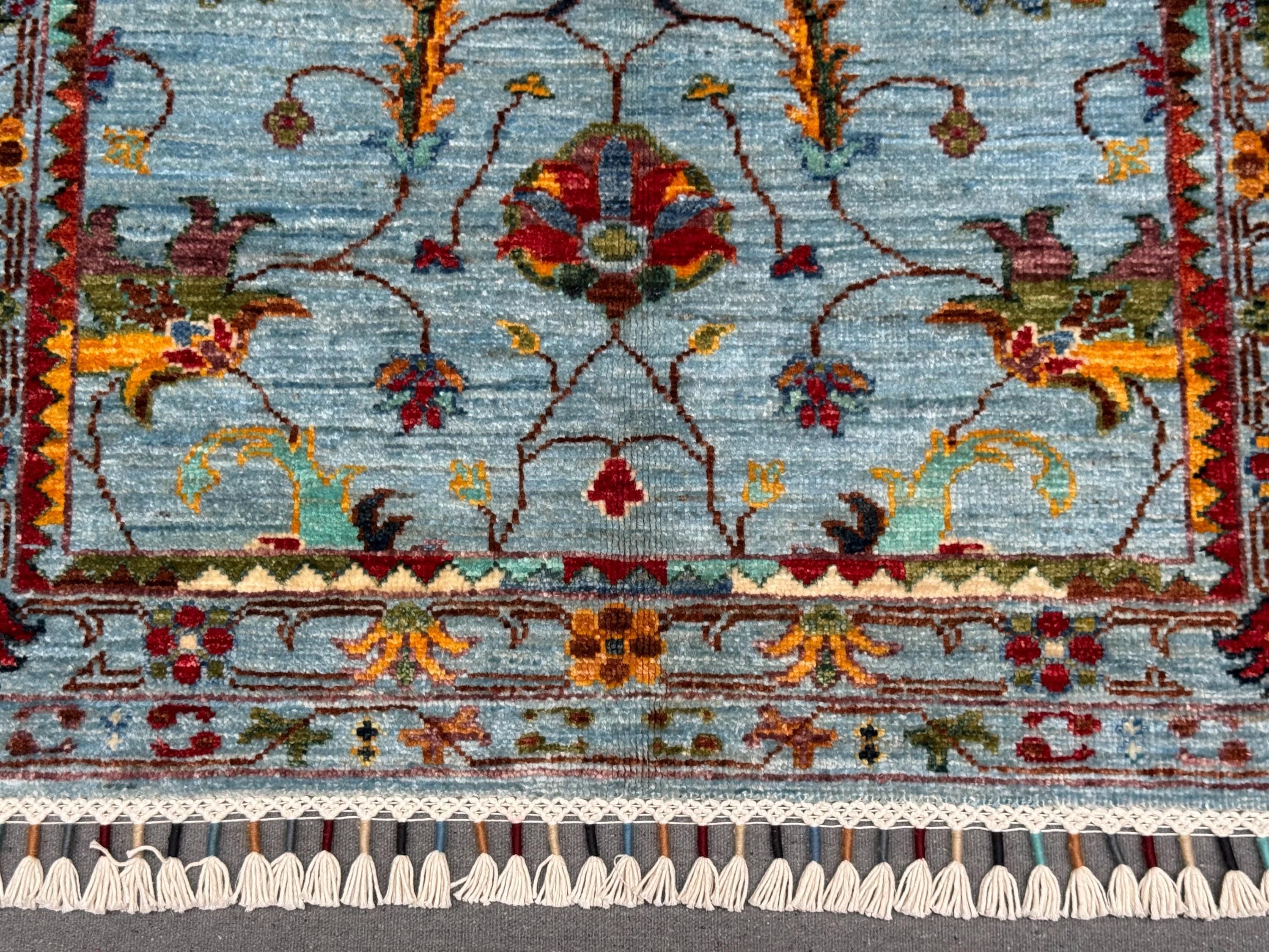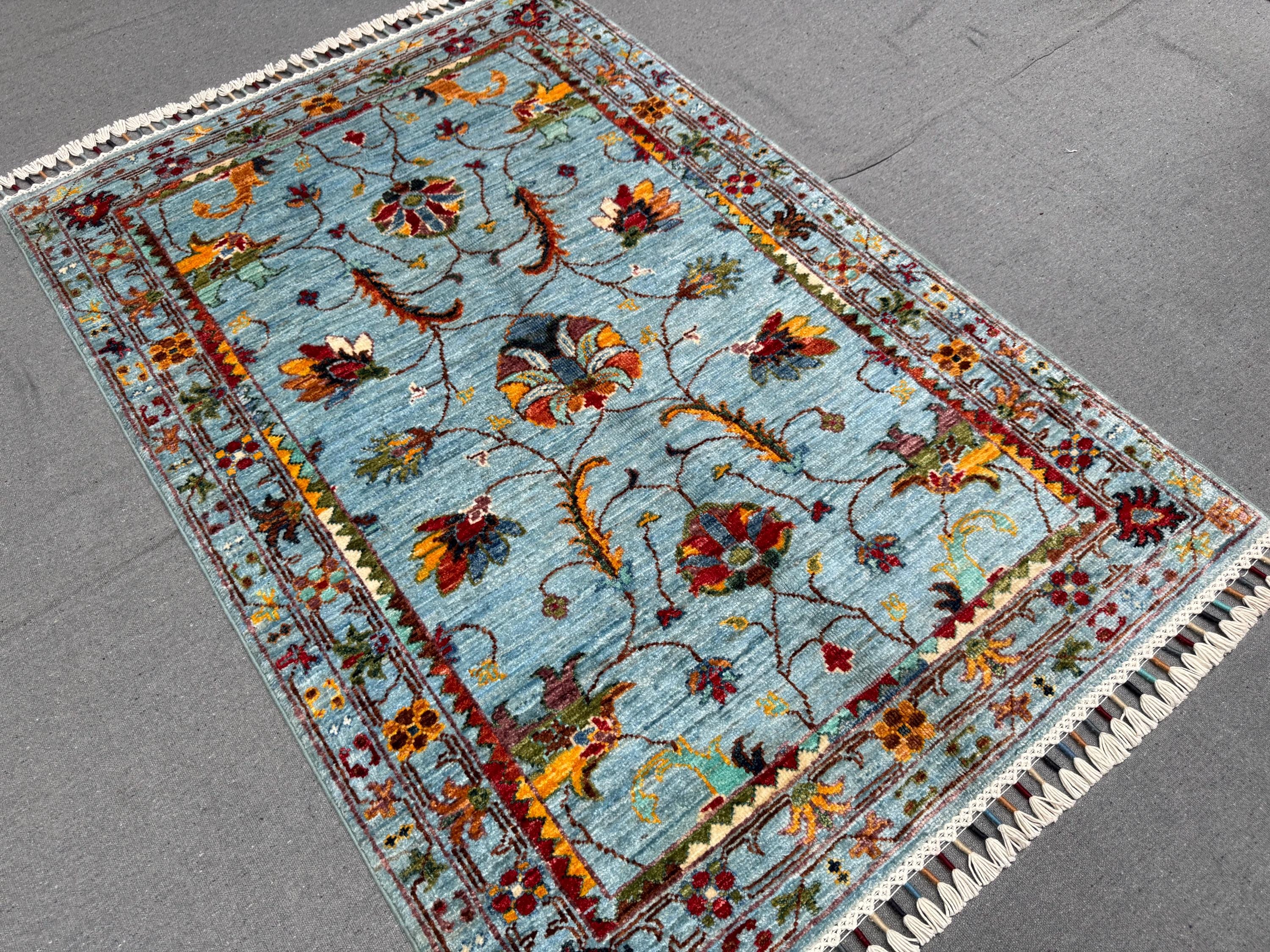 Brighten your space with this stunning Handmade Afghan Sultani Rug, featuring a refreshing sky-blue background and vibrant floral motifs that instantly bring energy and warmth into any room. The rich reds, golds, greens, and earthy tones create a dynamic contrast that feels both artistic and inviting.
