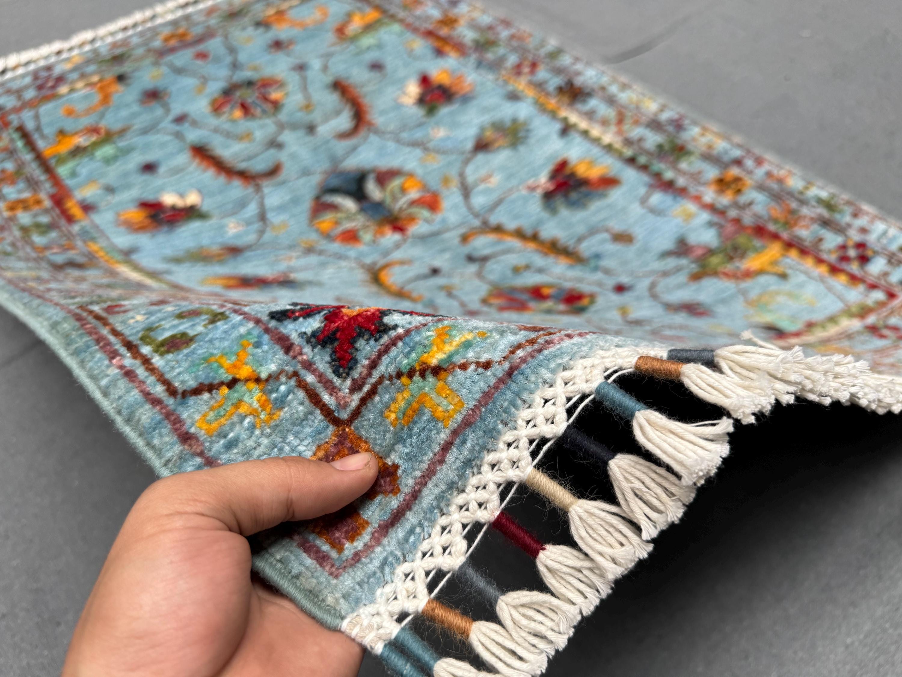 Handmade Sultani Rug 2x4 ft Afghan Blue Wool Area Rug, Small Floral Oriental Carpet, Entryway Accent Rug, Boho Tribal Afghan Decor
