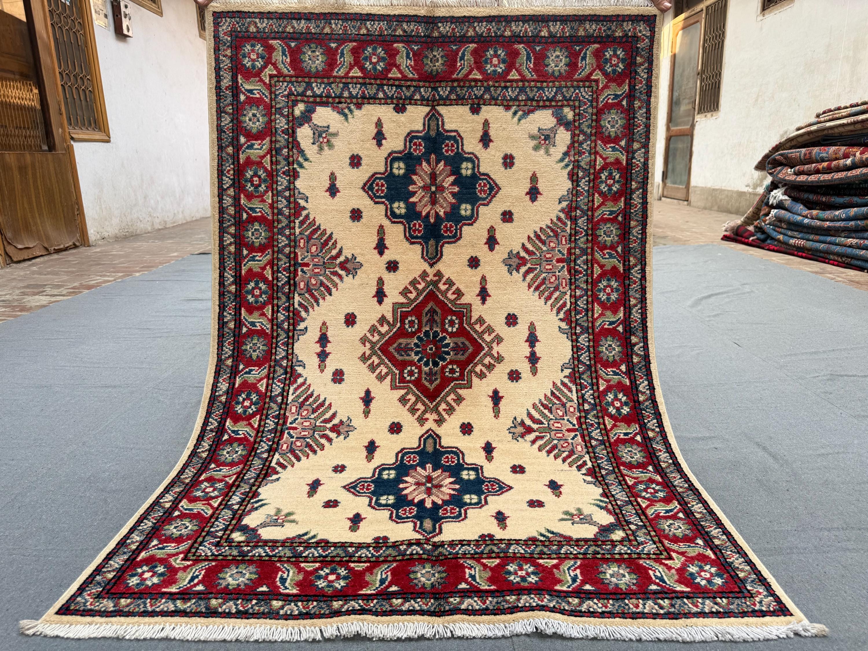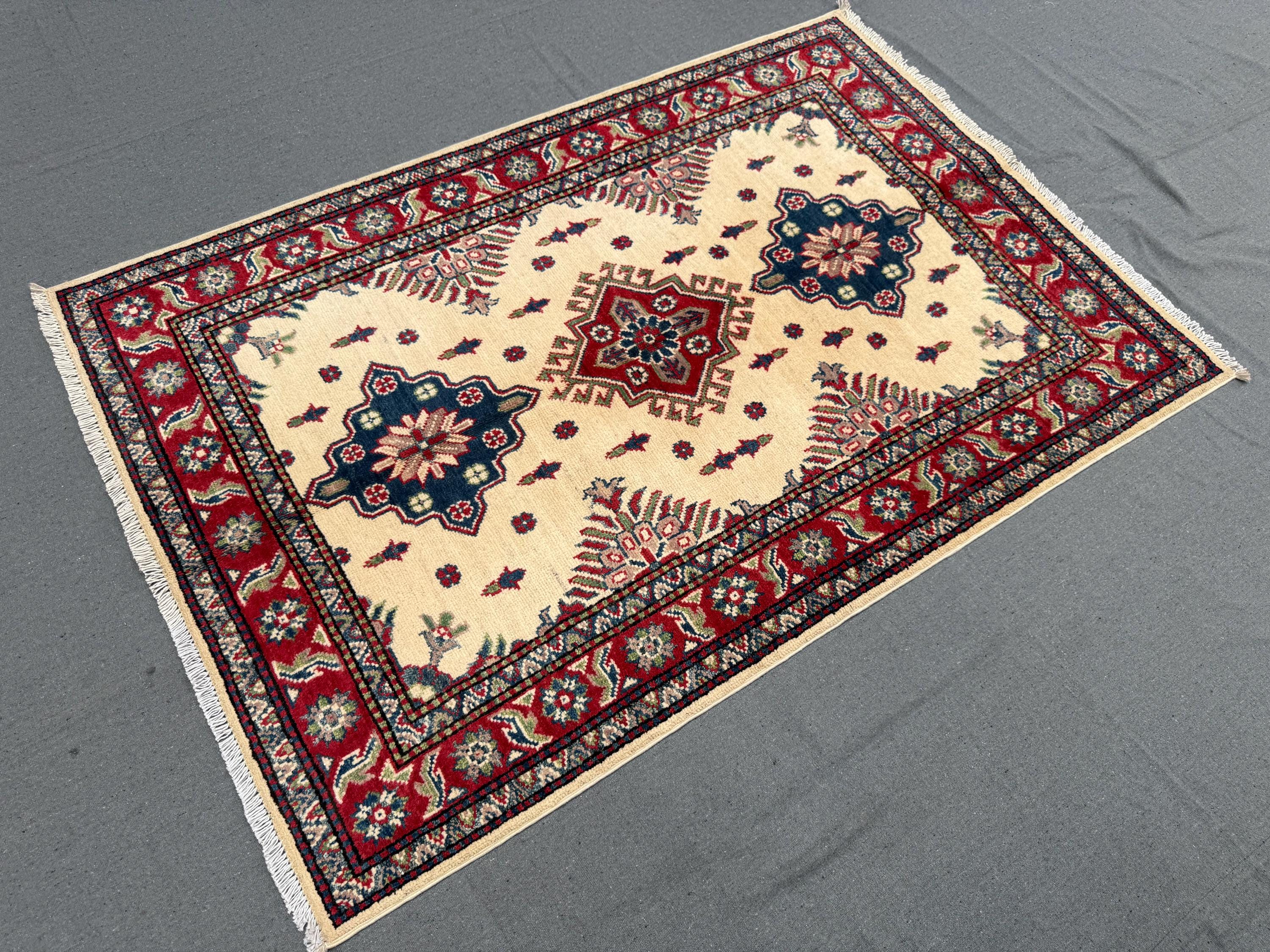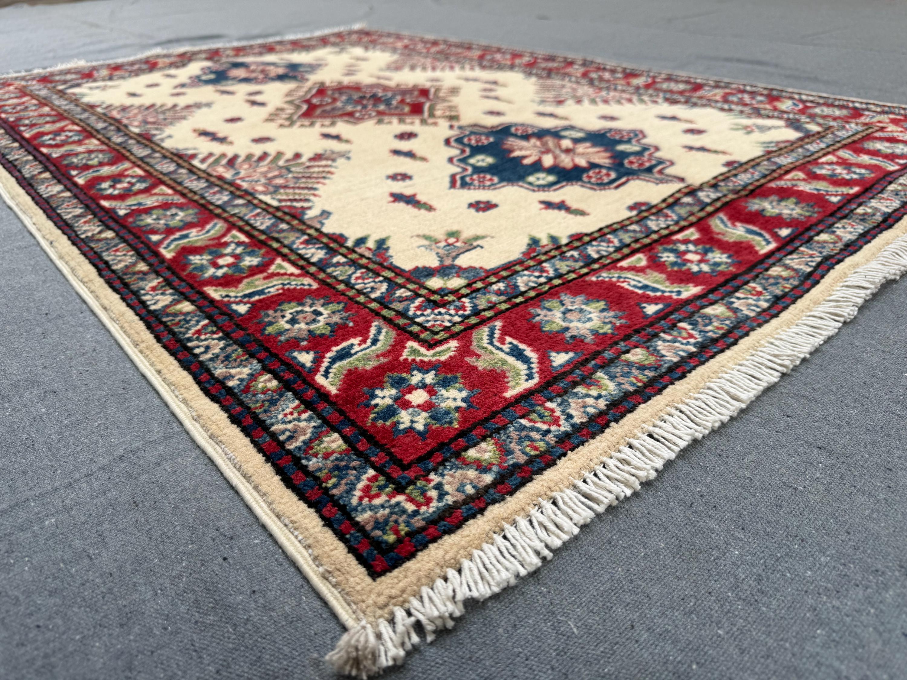 Kazak Rug 3.4x4.11 ft Hand-Knotted Afghan Wool Carpet, Cream and Red Tribal Wool Rug, Geometric Handmade Afghan Oriental Accent Decor