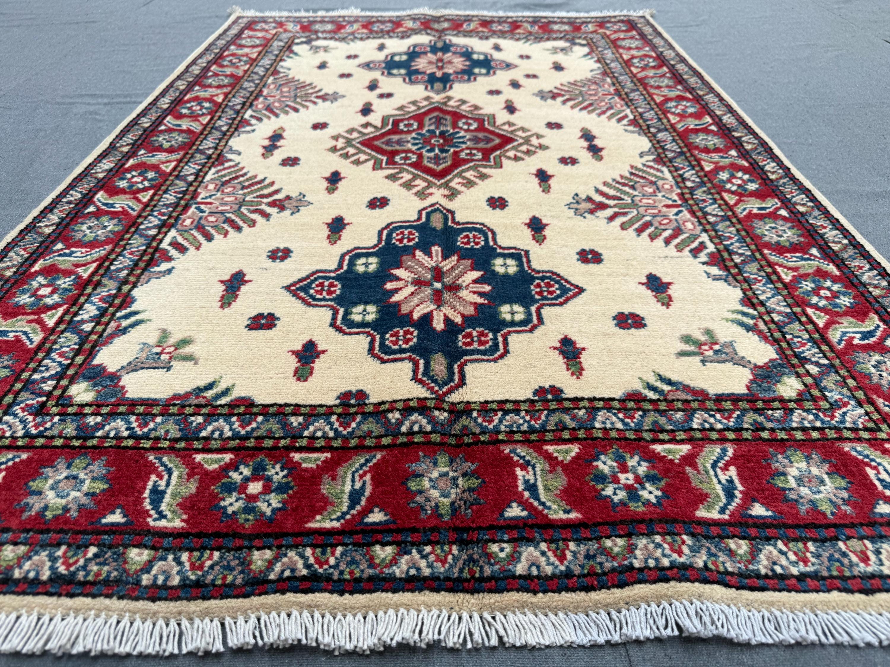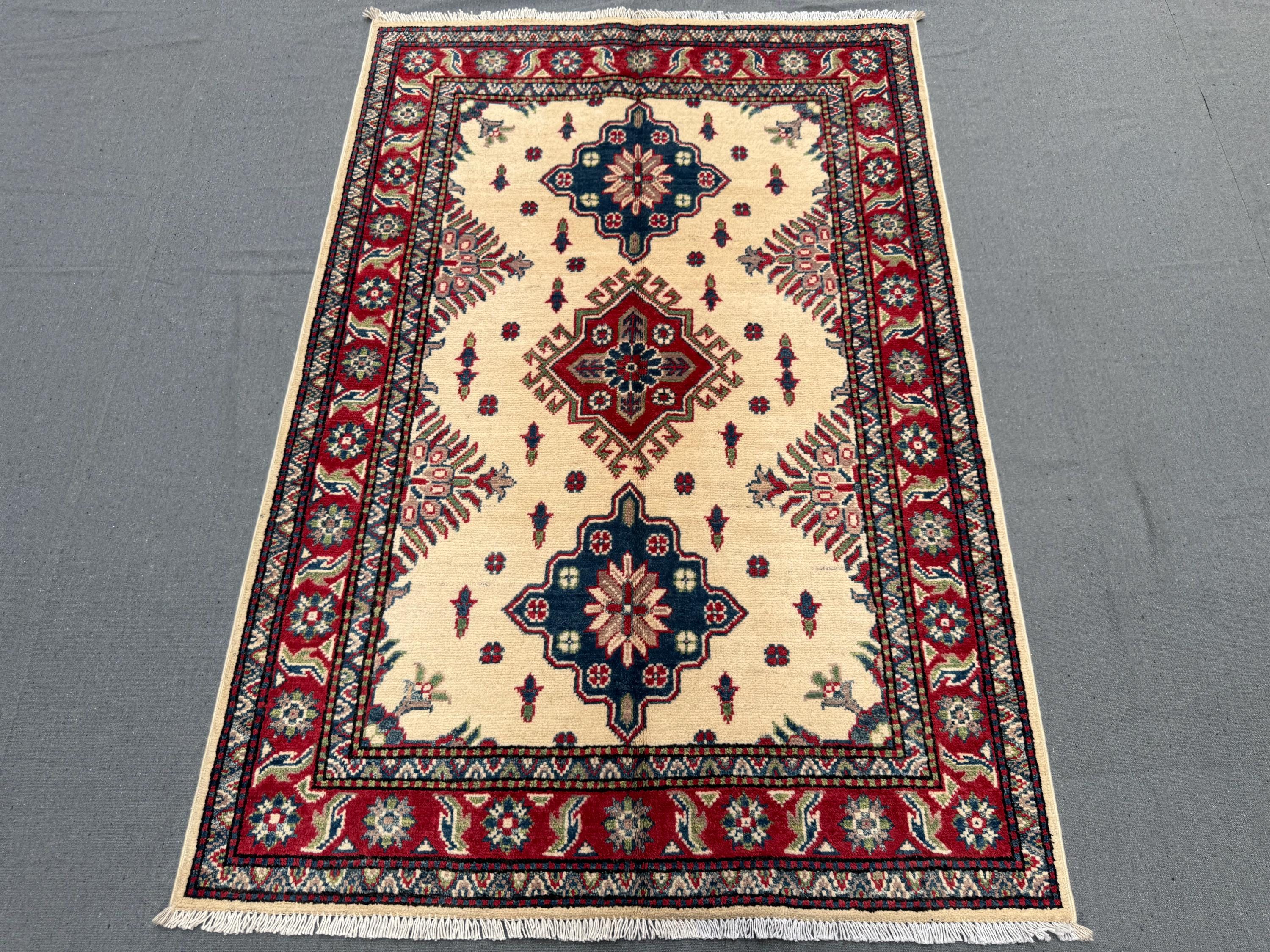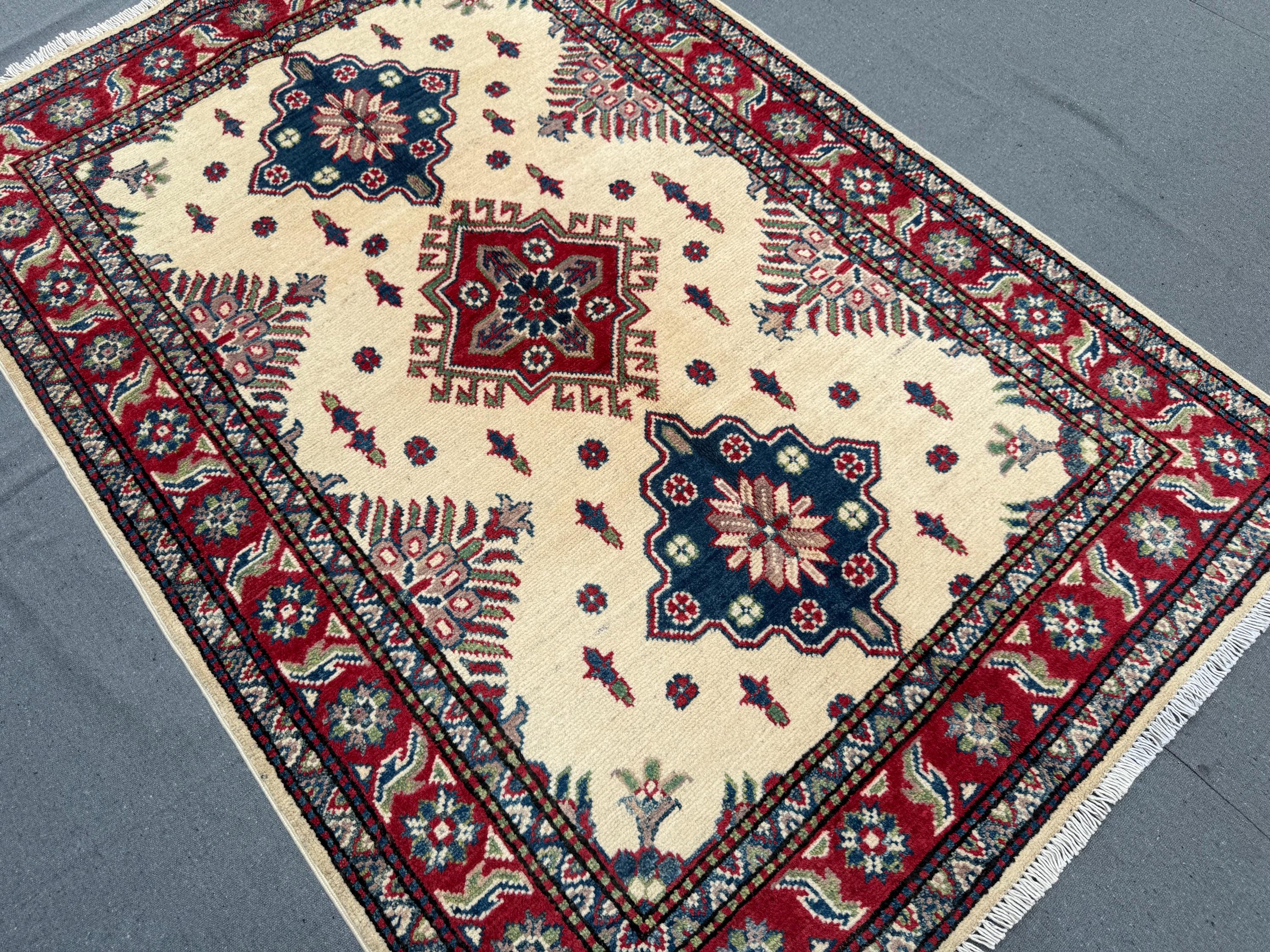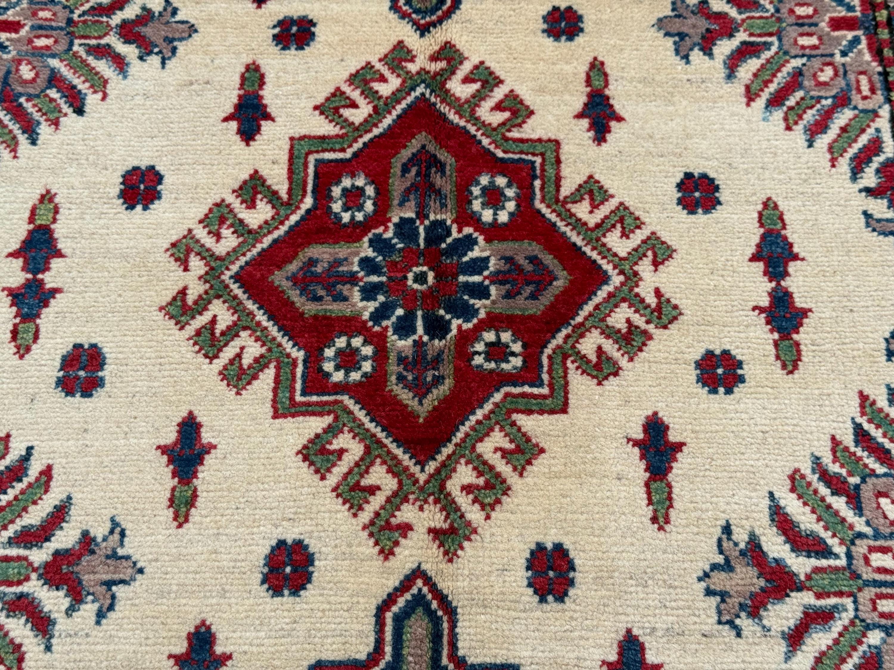 Kazak Rug 3.4x4.11 ft Hand-Knotted Afghan Wool Carpet, Cream and Red Tribal Wool Rug, Geometric Handmade Afghan Oriental Accent Decor