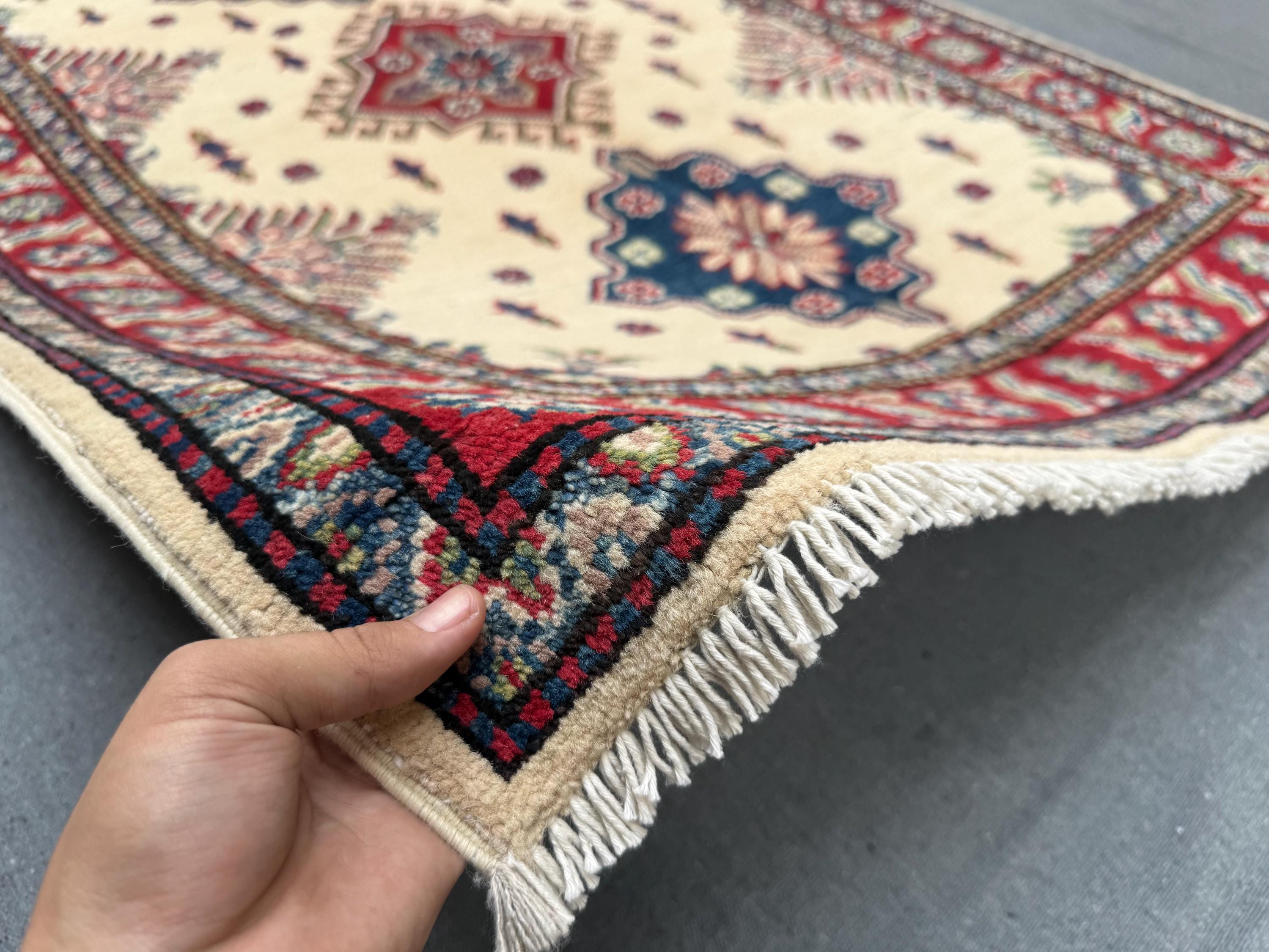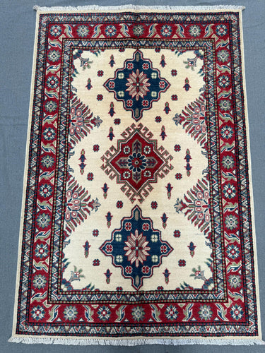 This Afghan Kazak rug combines traditional tribal motifs with a timeless cream background and bold red and navy medallions. Entirely hand-knotted from 100% natural wool, it reflects the centuries-old craftsmanship of Afghan weavers, offering beauty, durability, and authenticity.