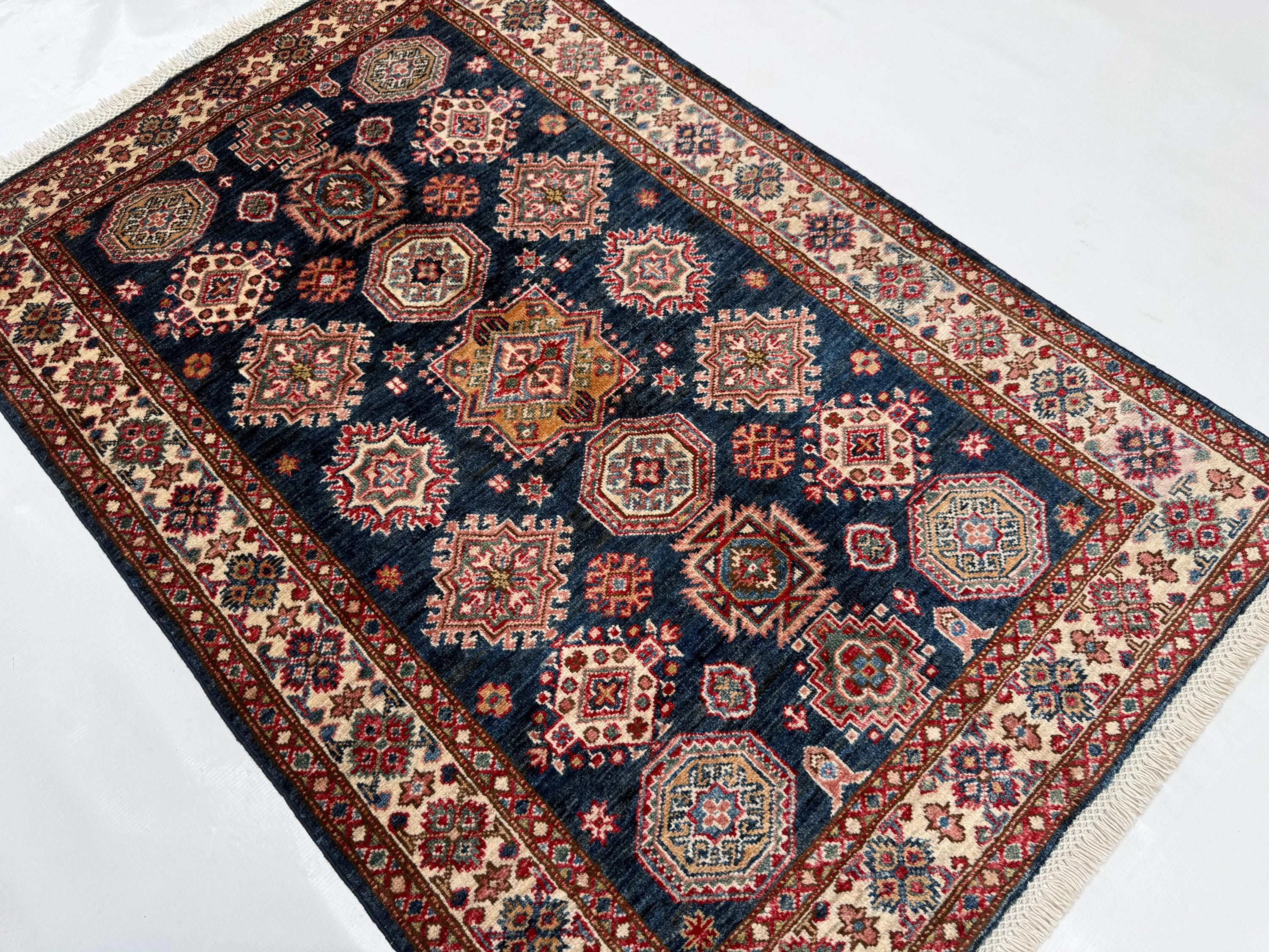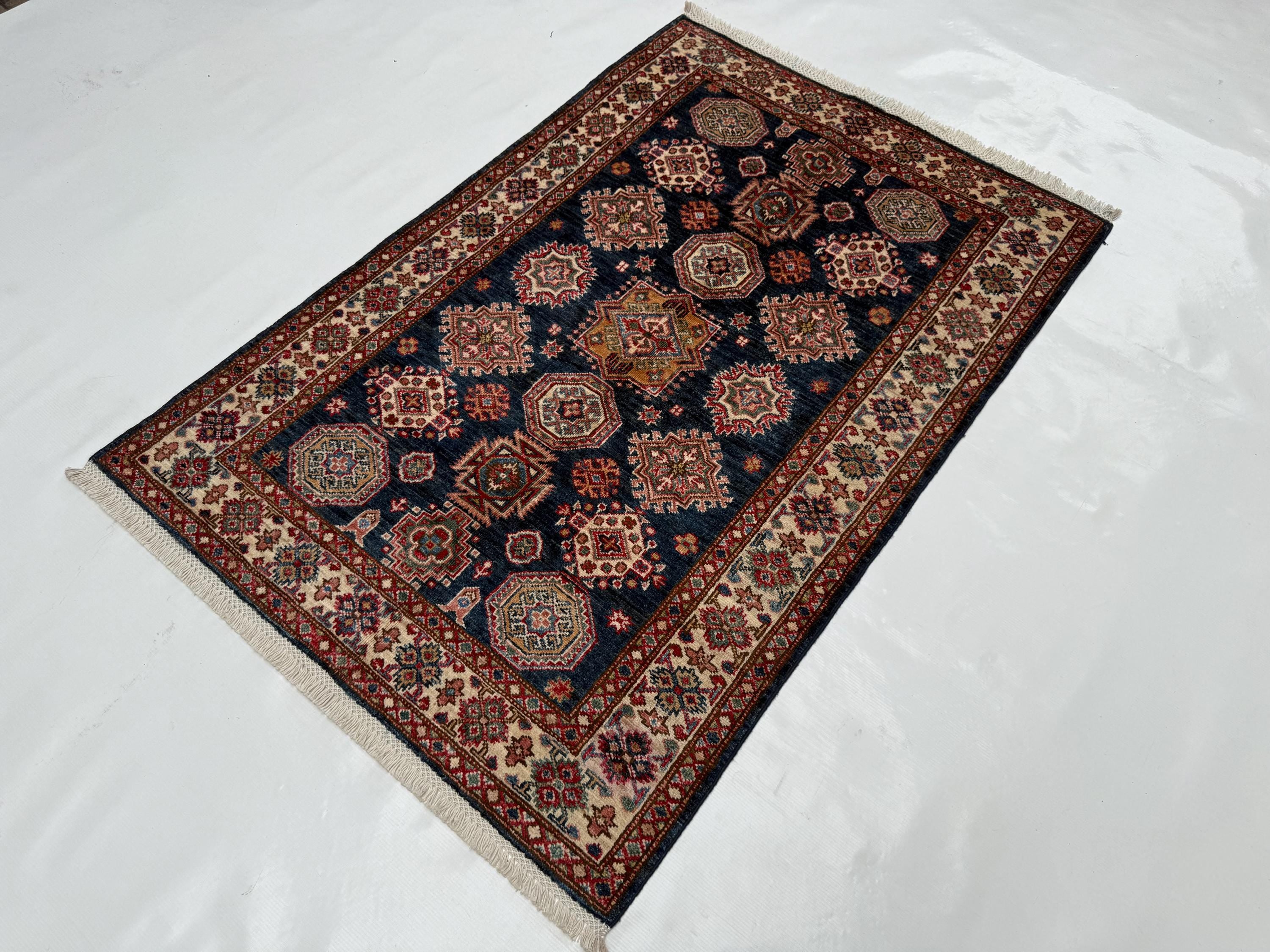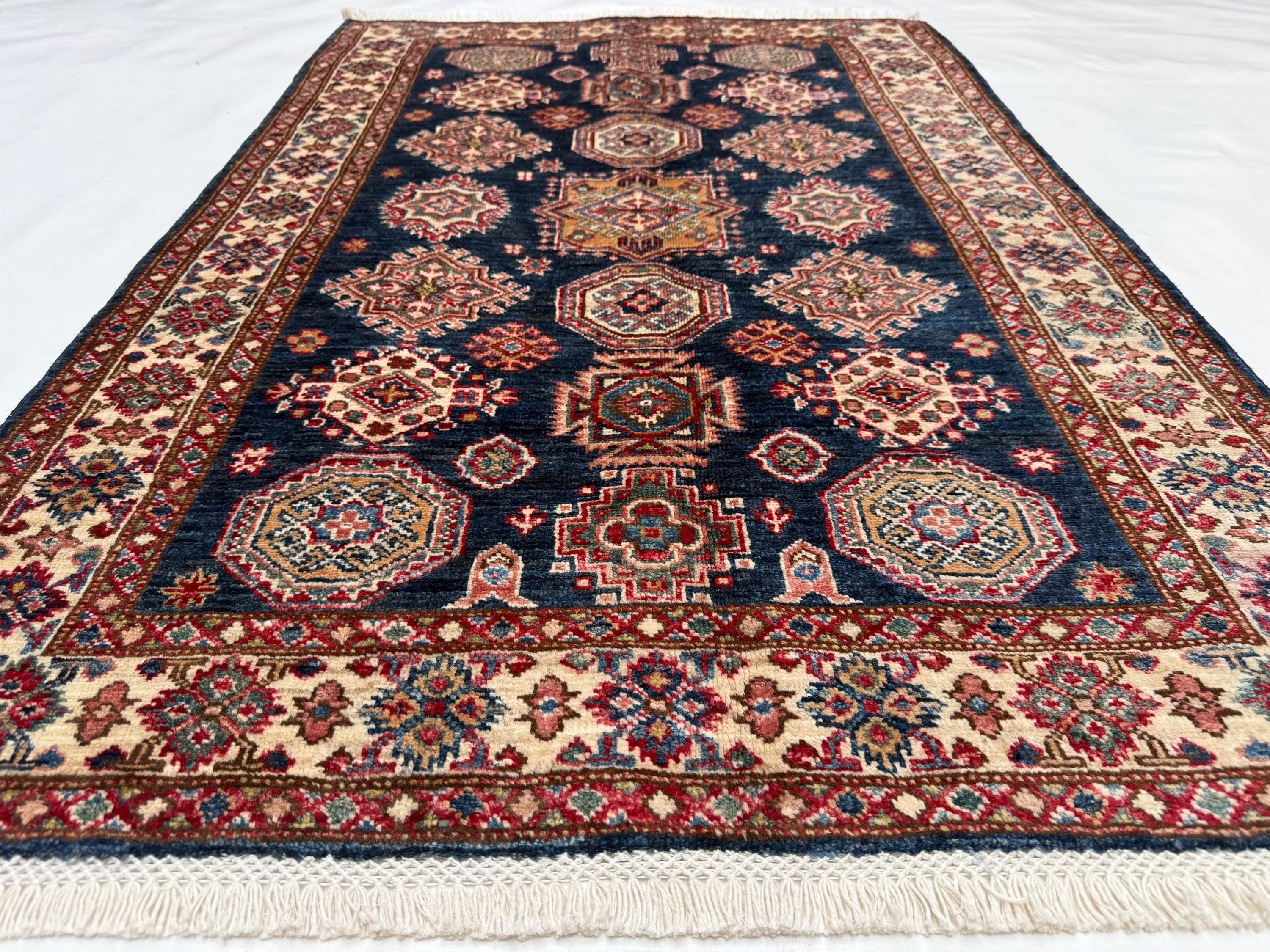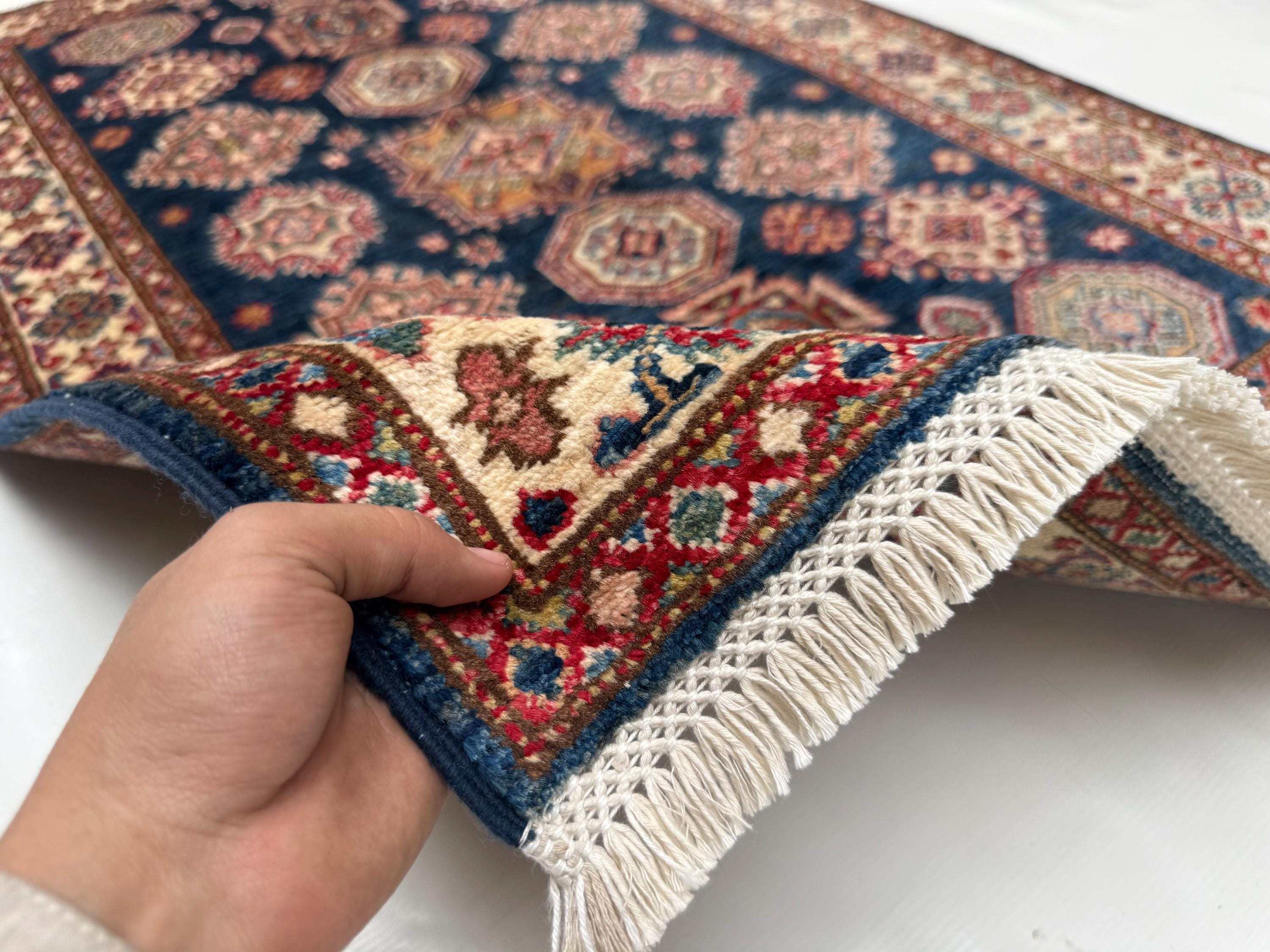 Kazak Area Rug 3x4 ft, Geometric Wool Rug with Navy Blue Base, Traditional Accent Rug for Living Room Entryway Decor