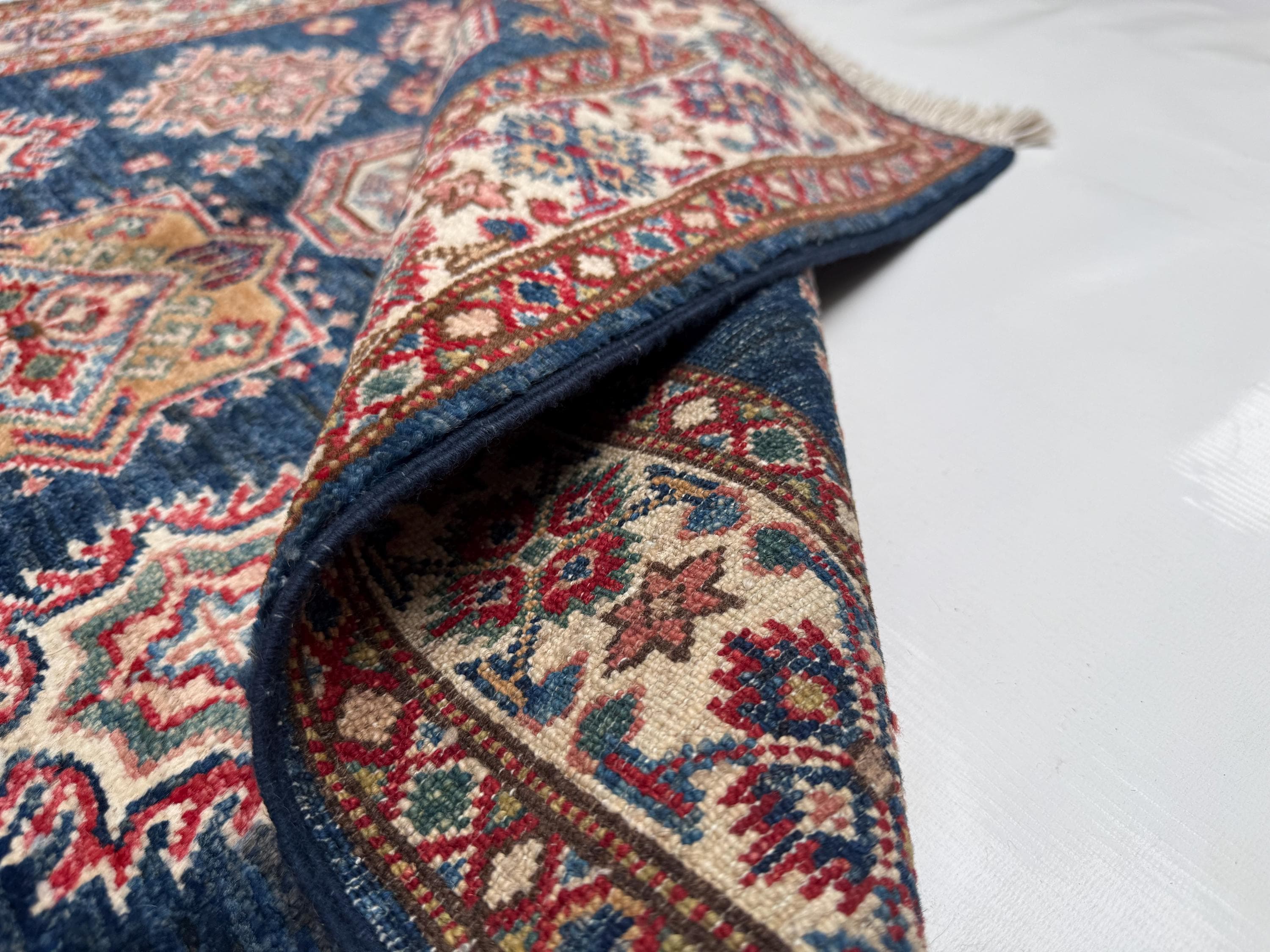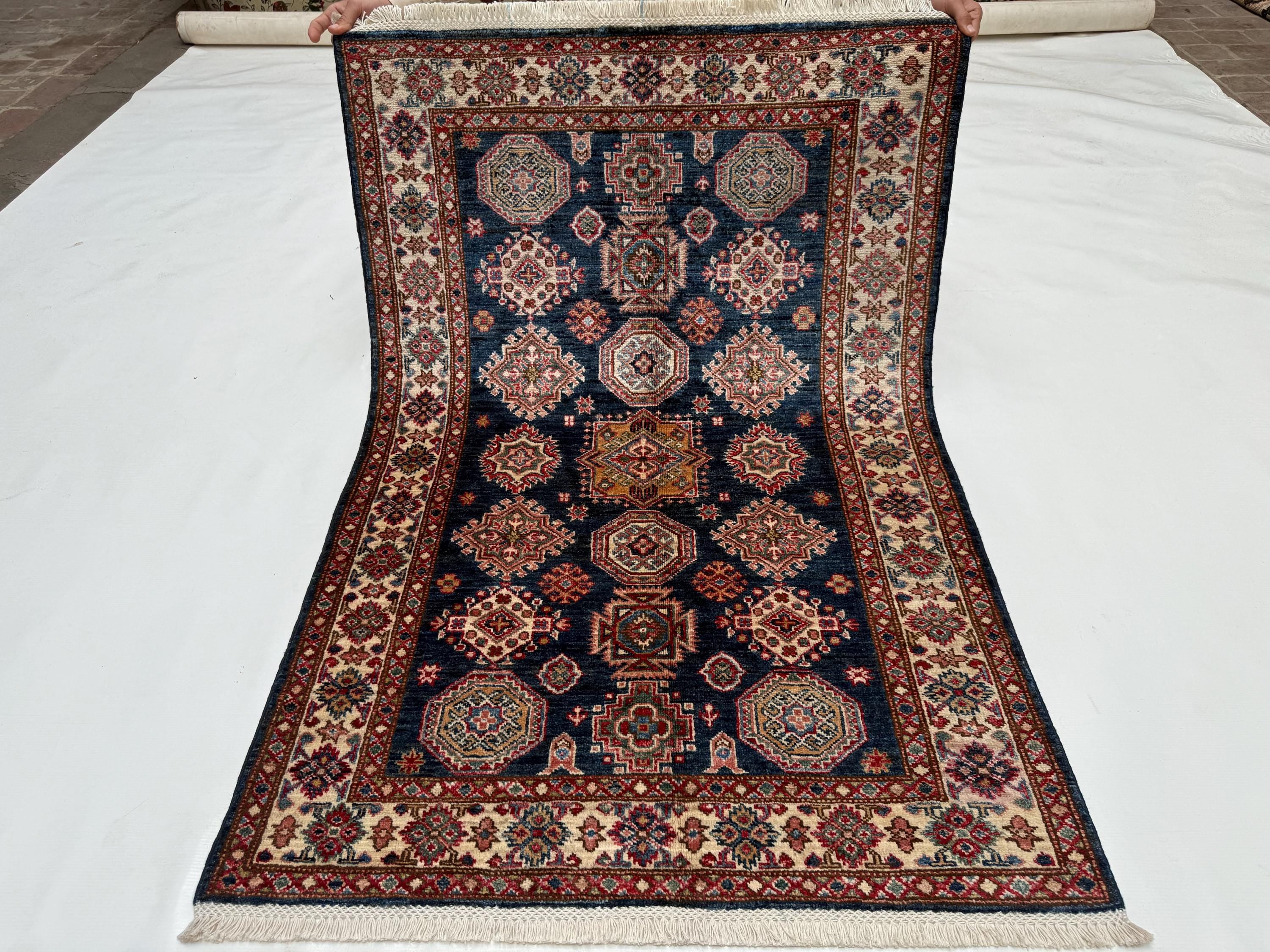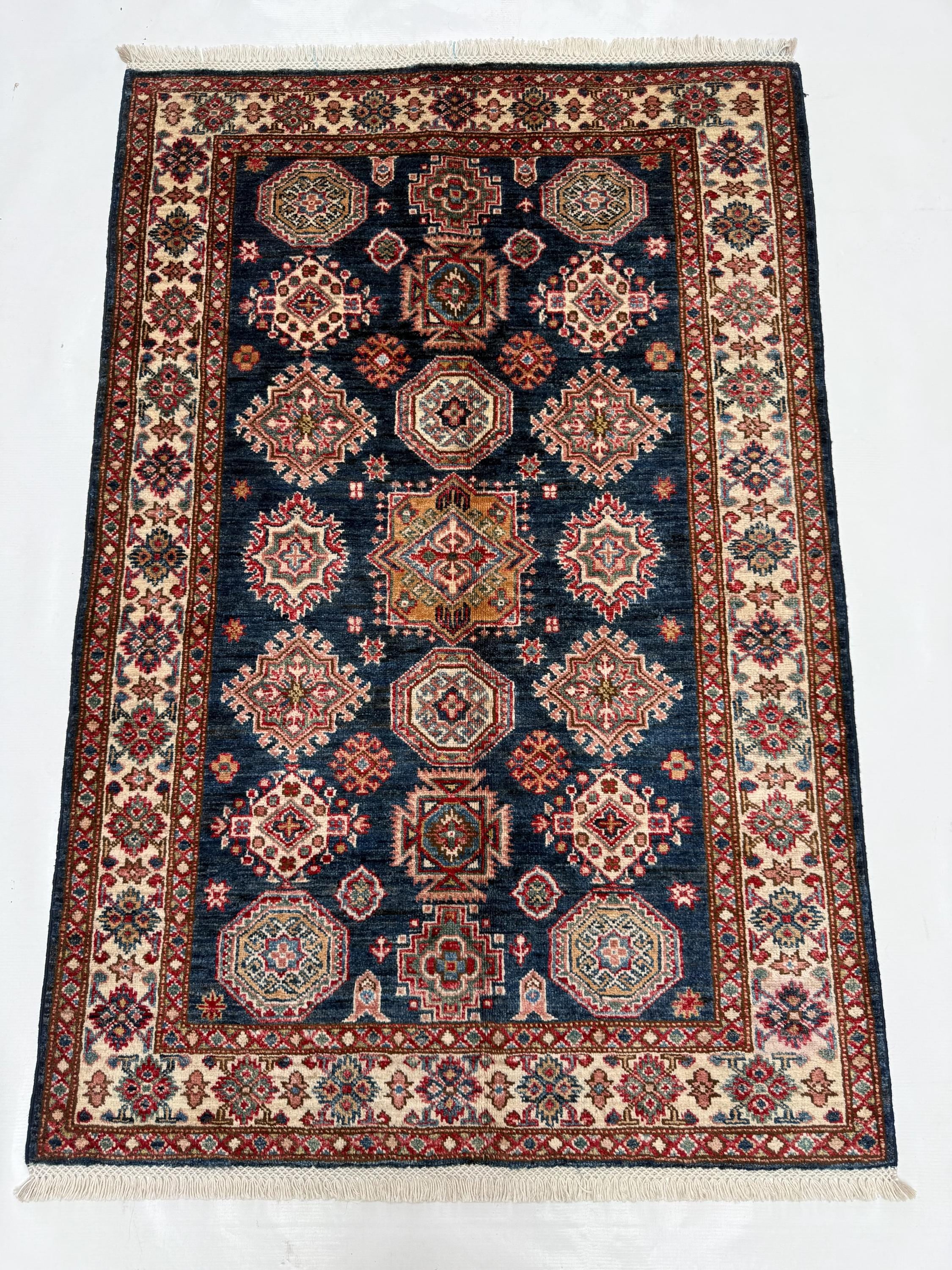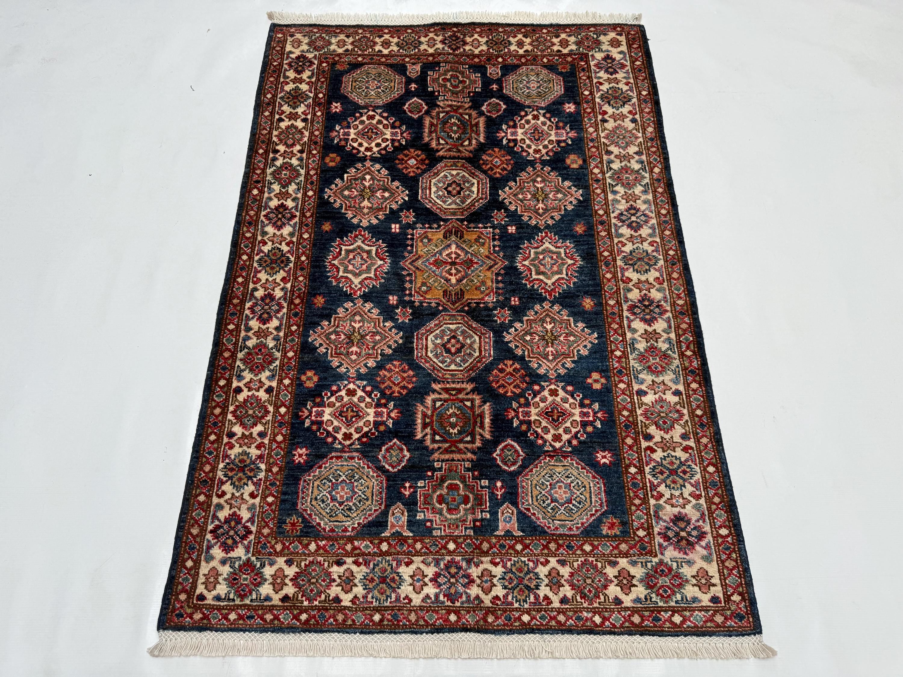 Kazak Area Rug 3x4 ft, Geometric Wool Rug with Navy Blue Base, Traditional Accent Rug for Living Room Entryway Decor
