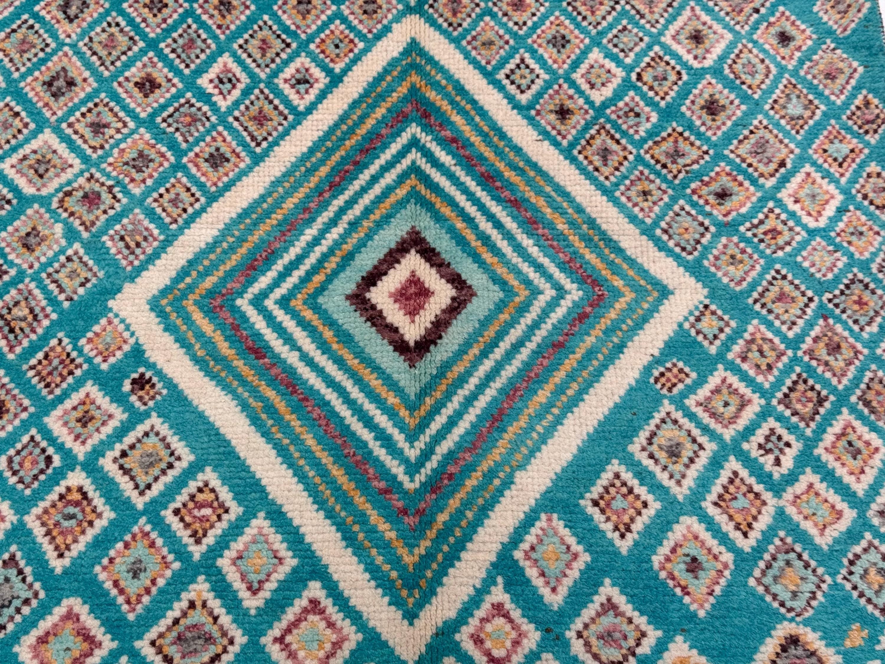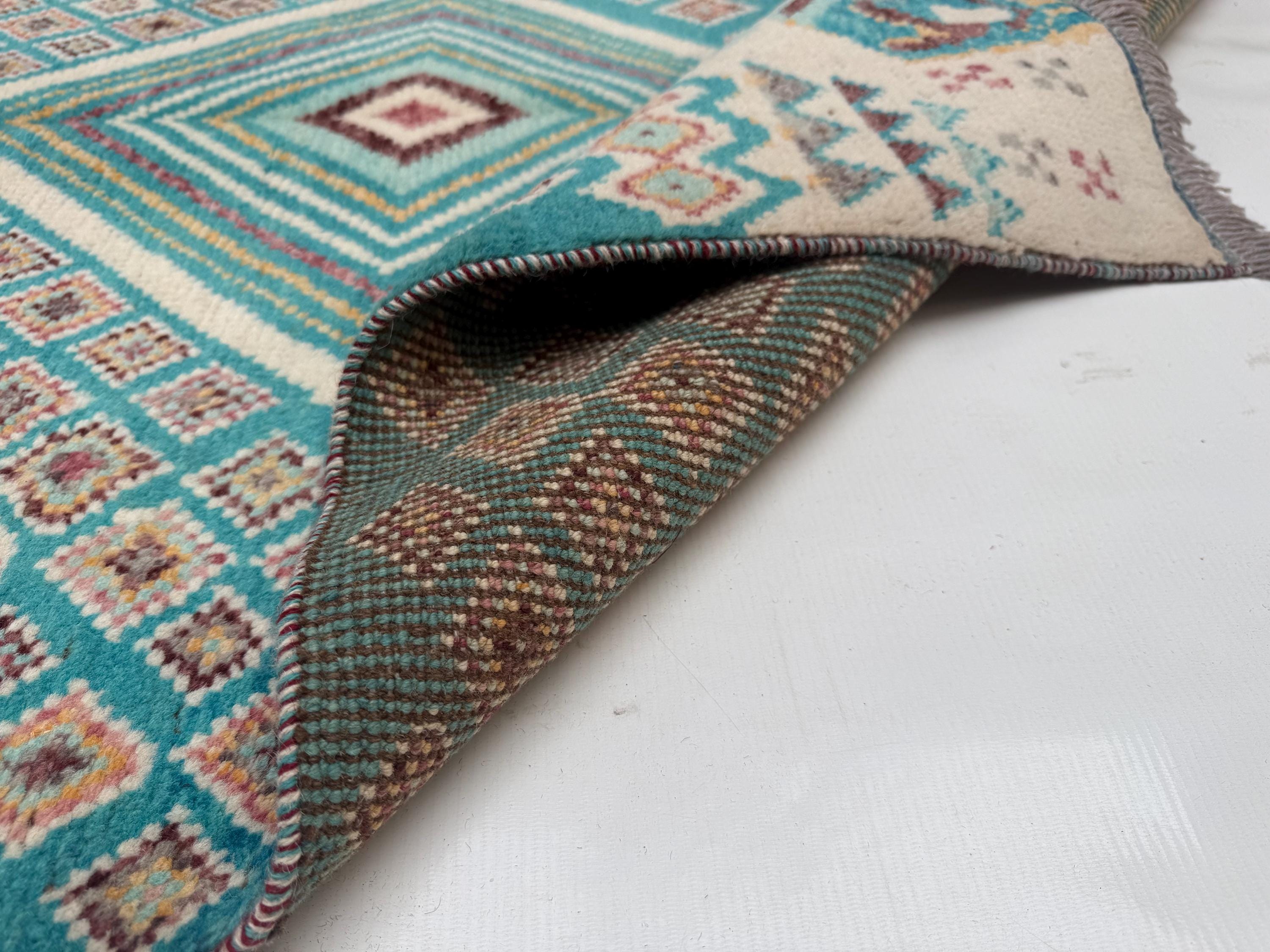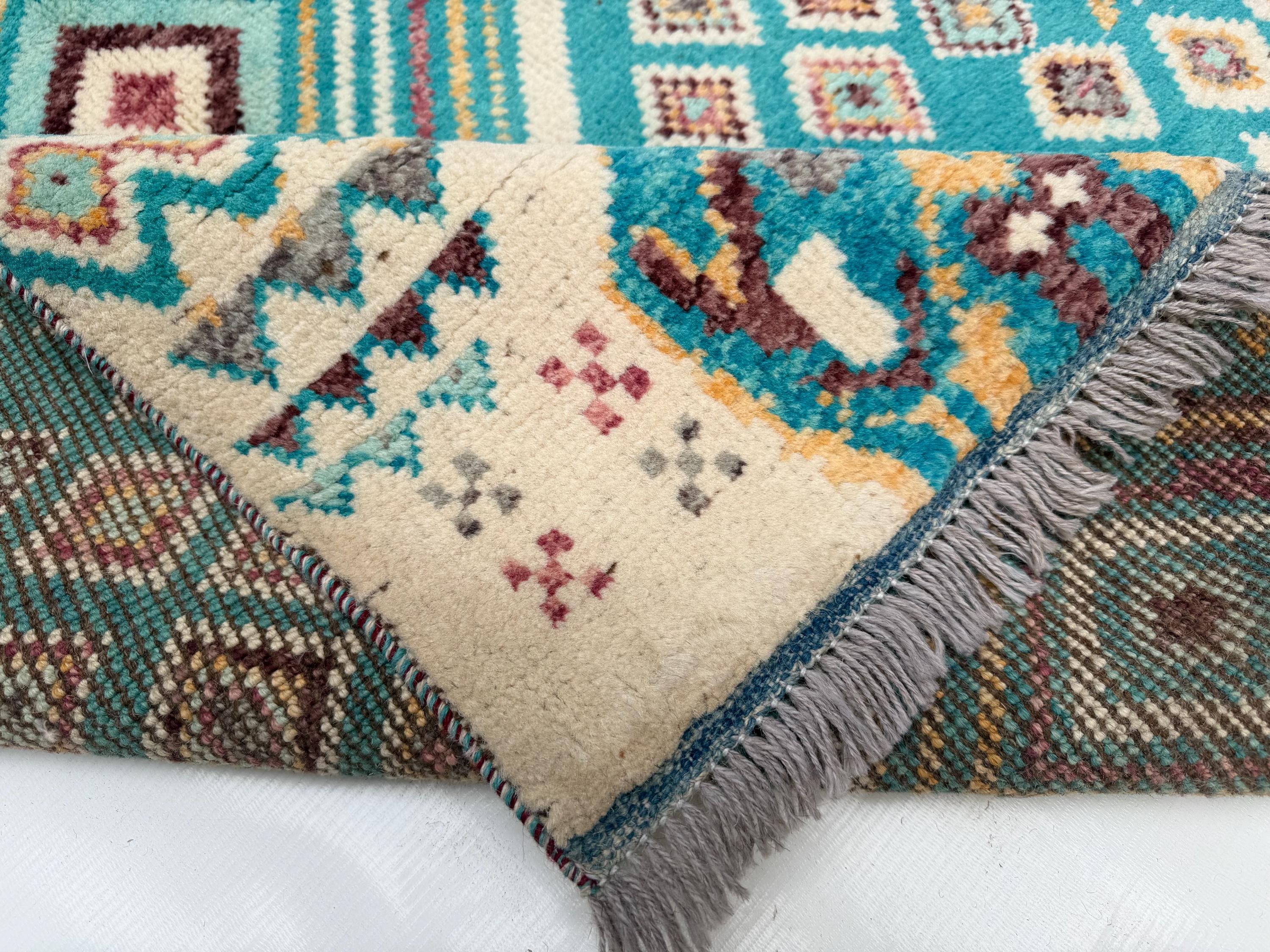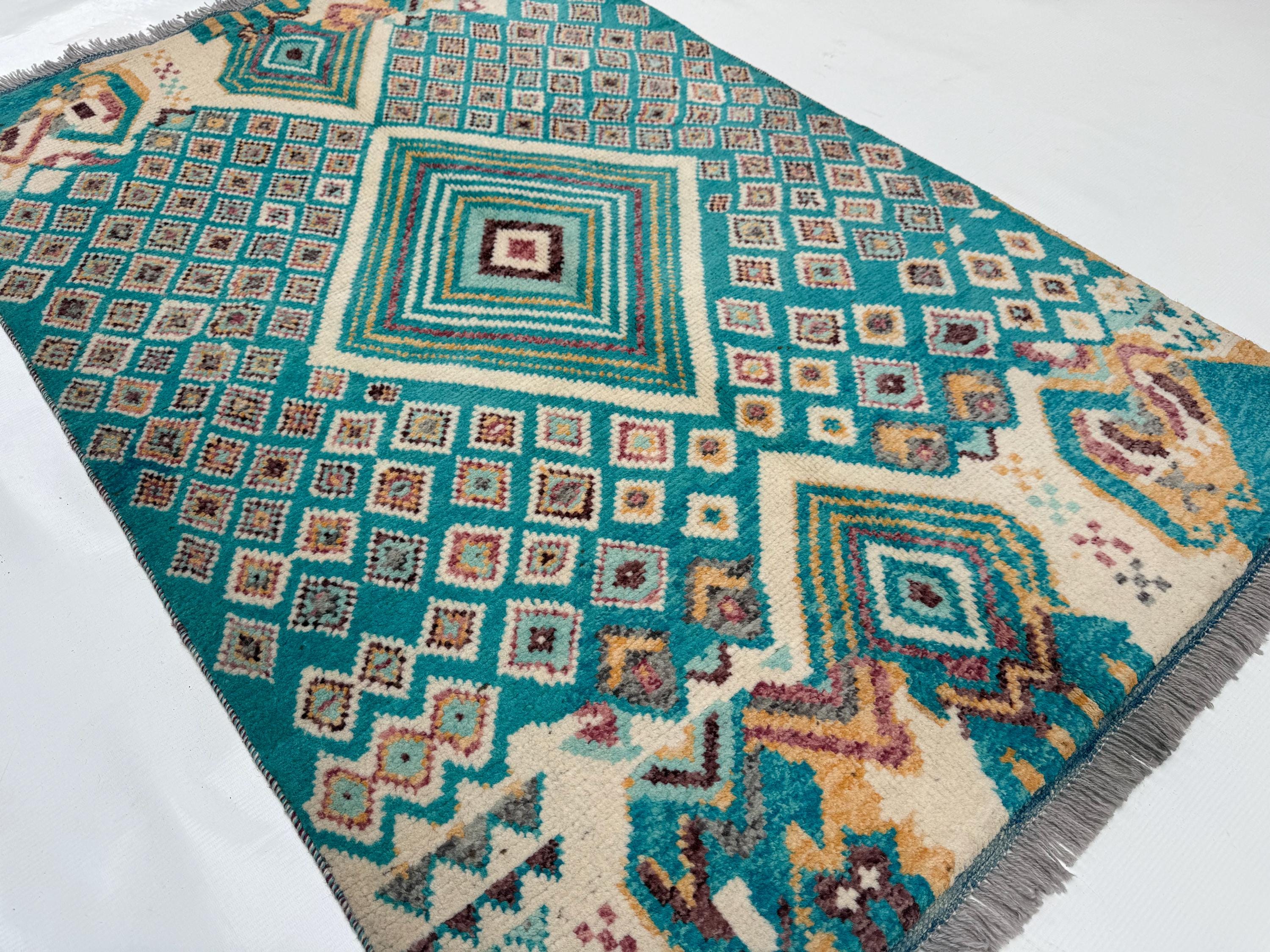 Moroccan Geometric Area Rug 3.3x4.10 ft, Teal Diamond Tribal Accent Rug, Boho Wool Rug for Living Room Bedroom Decor