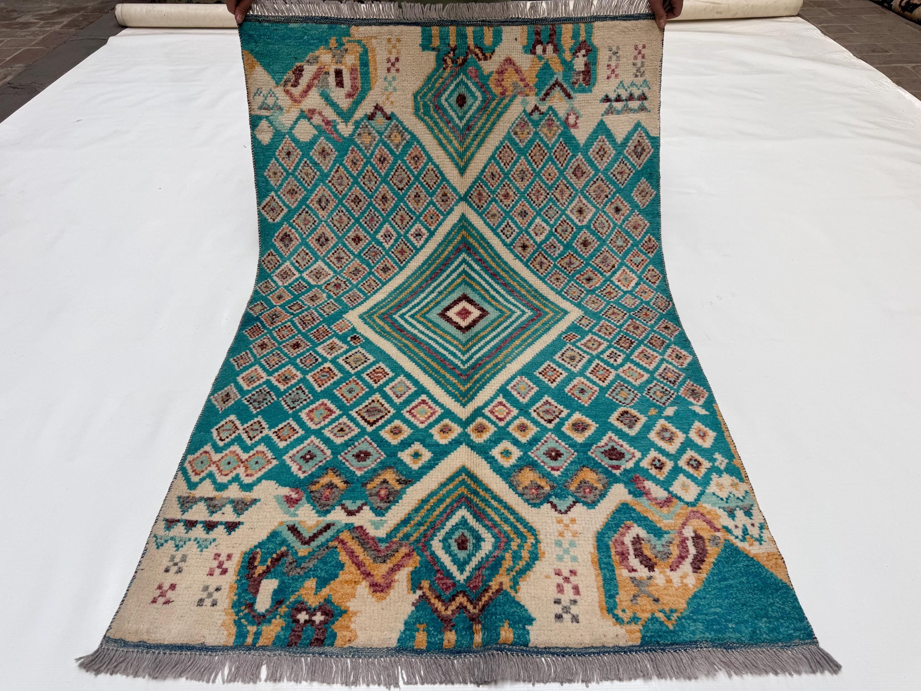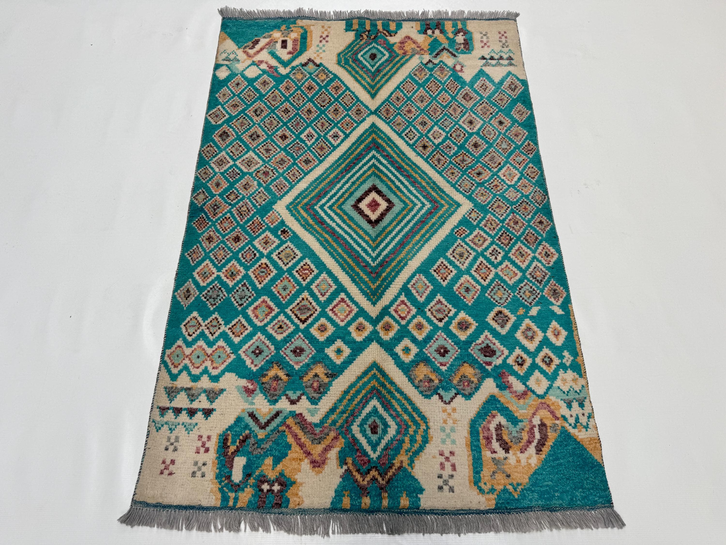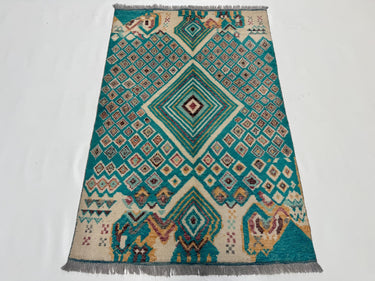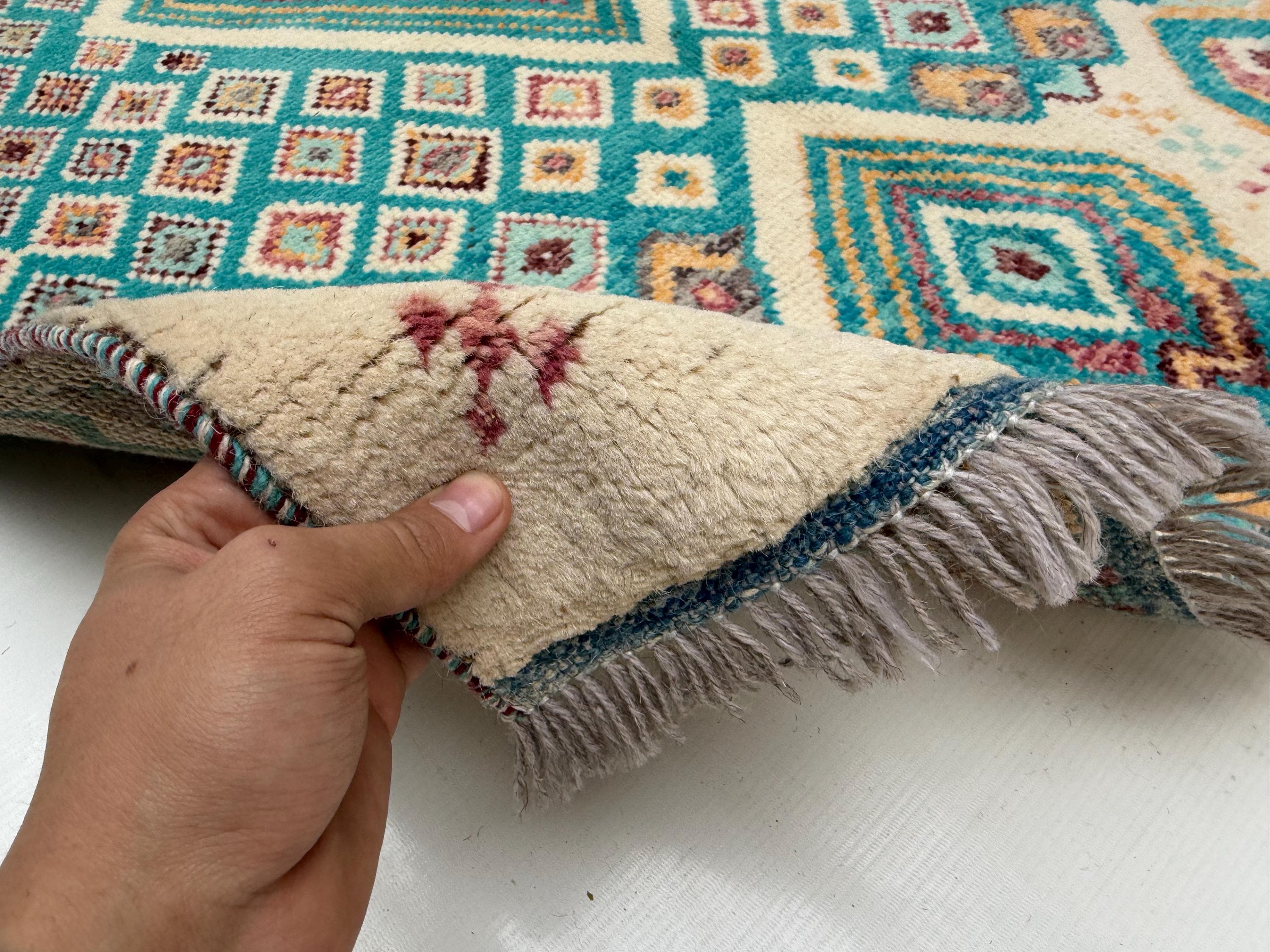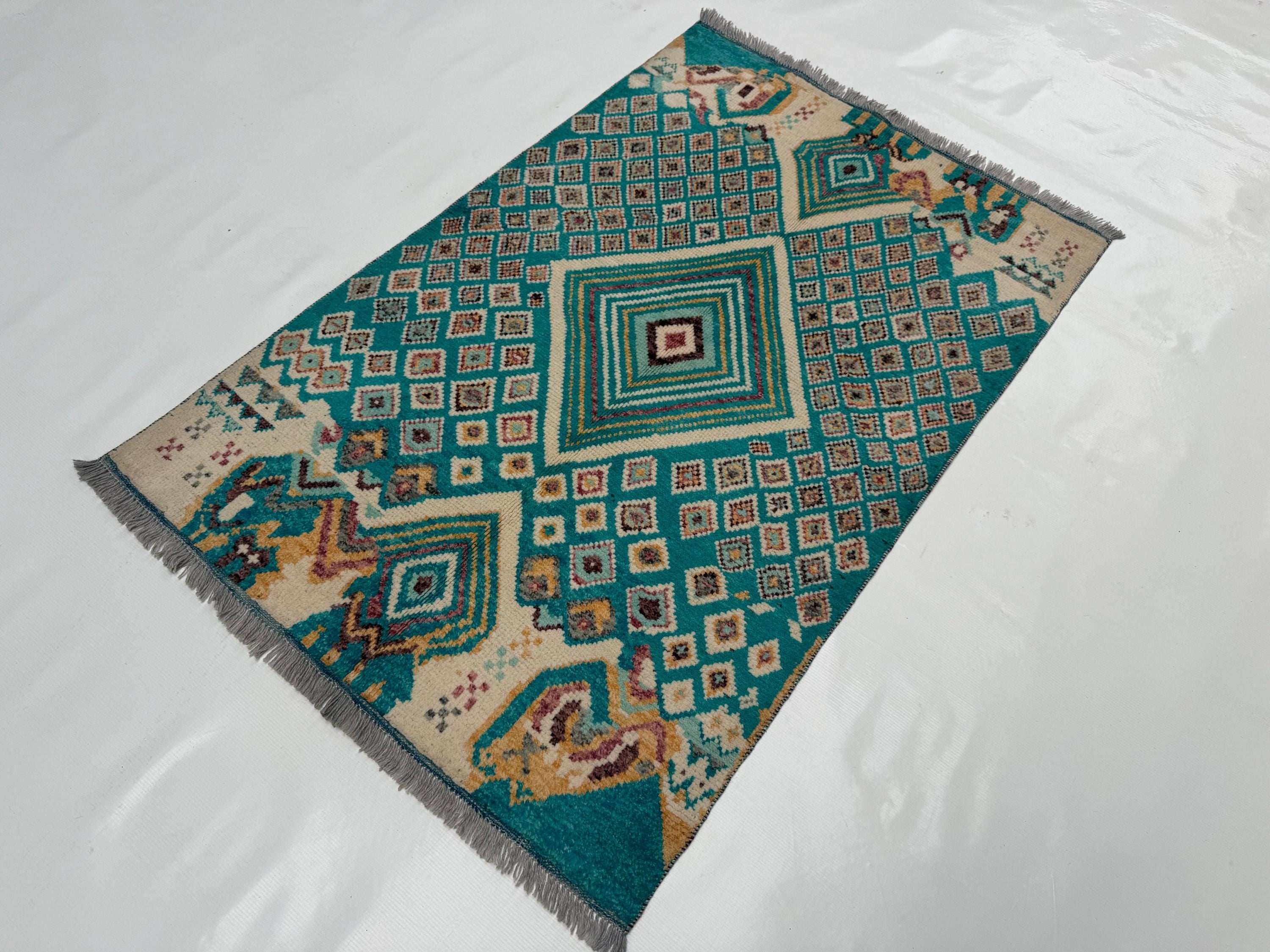 Moroccan Geometric Area Rug 3.3x4.10 ft, Teal Diamond Tribal Accent Rug, Boho Wool Rug for Living Room Bedroom Decor