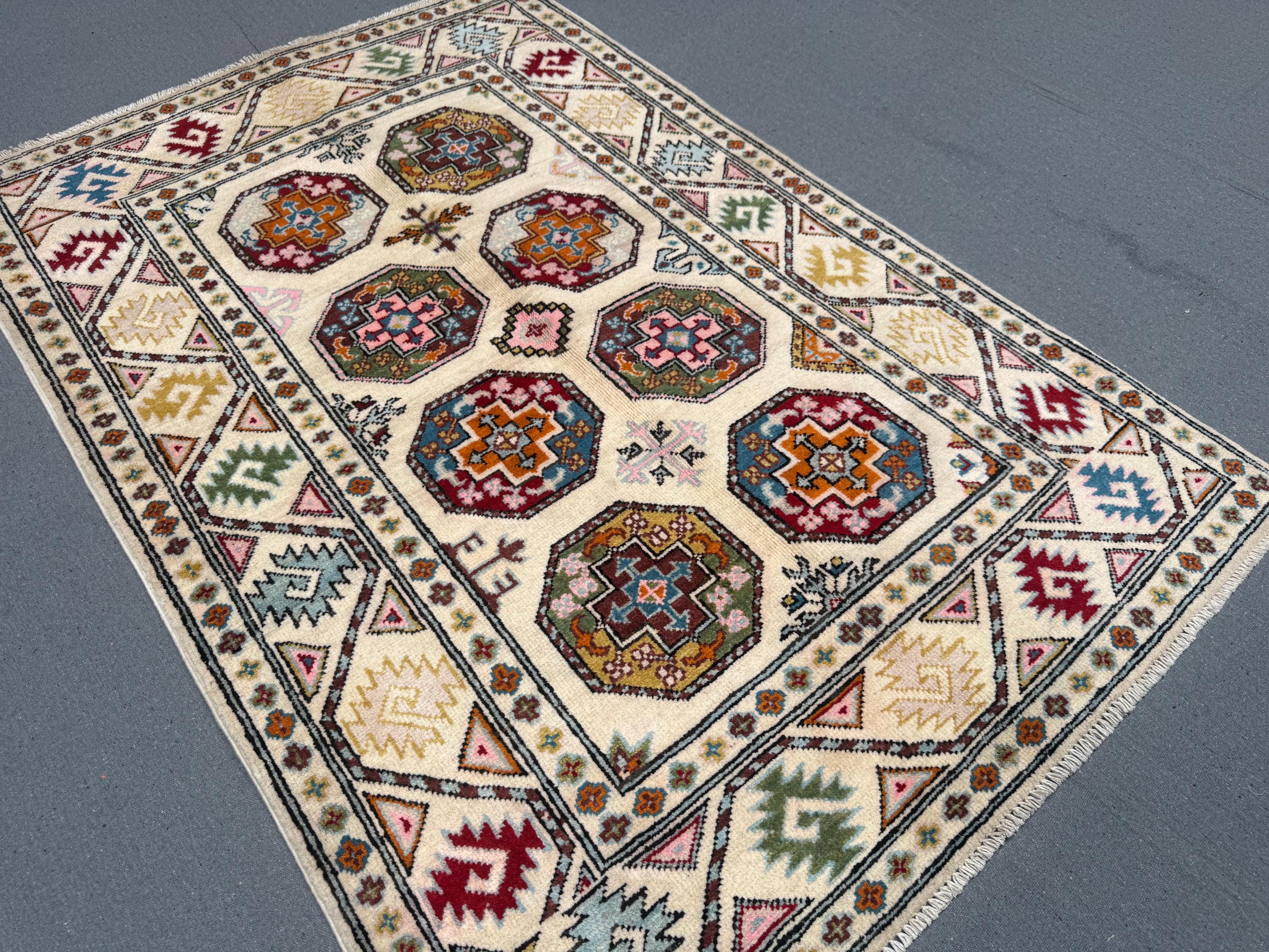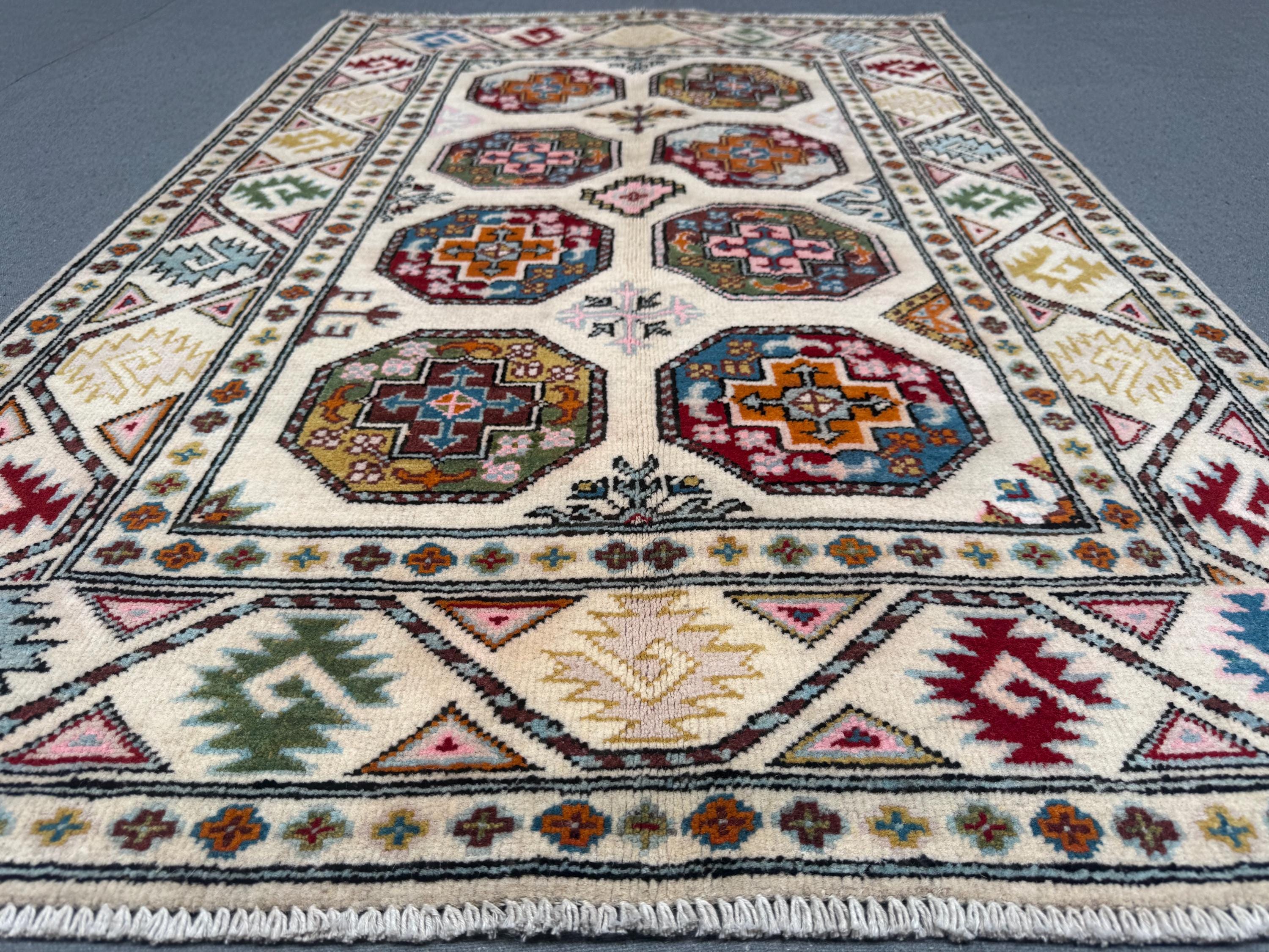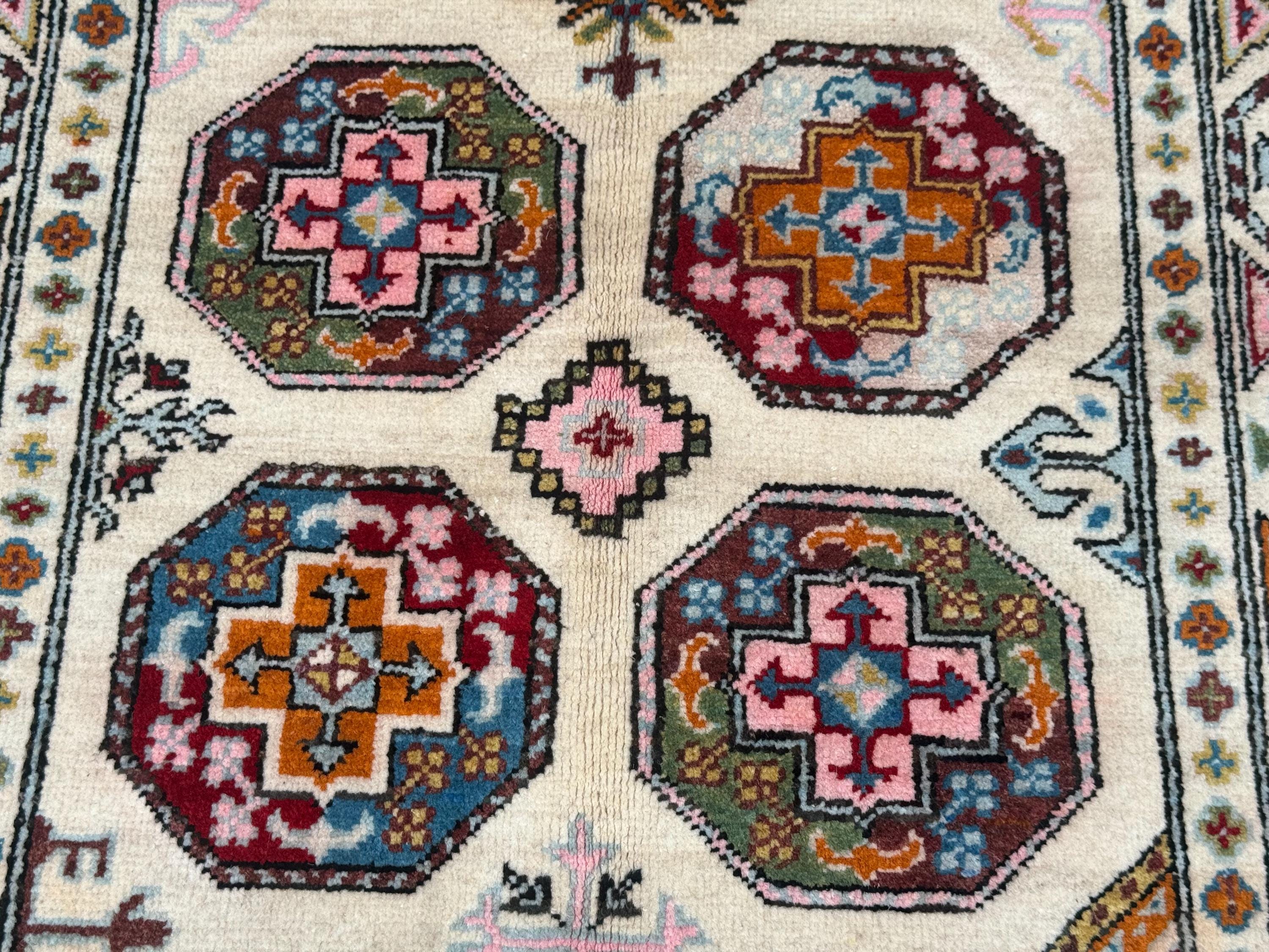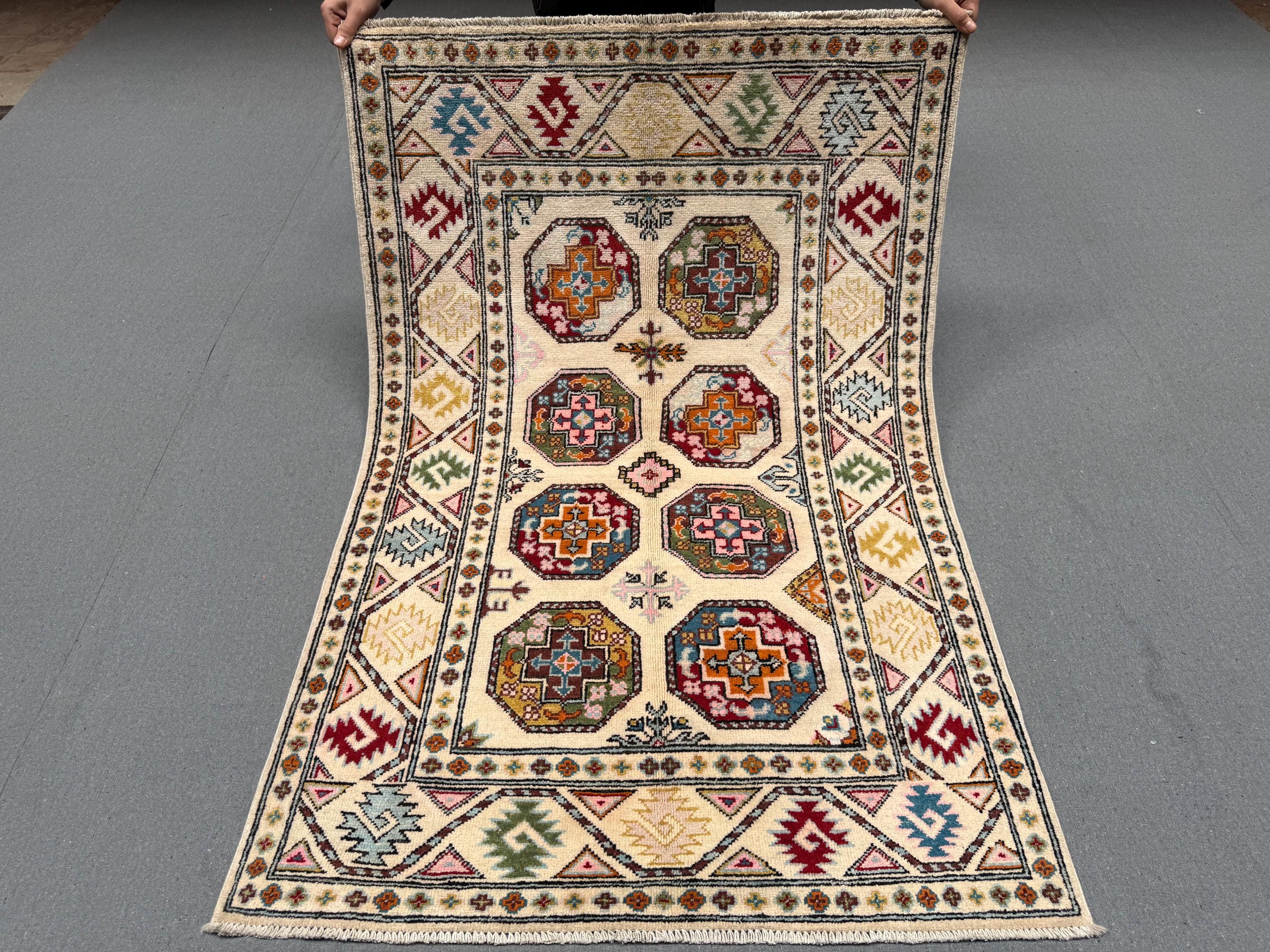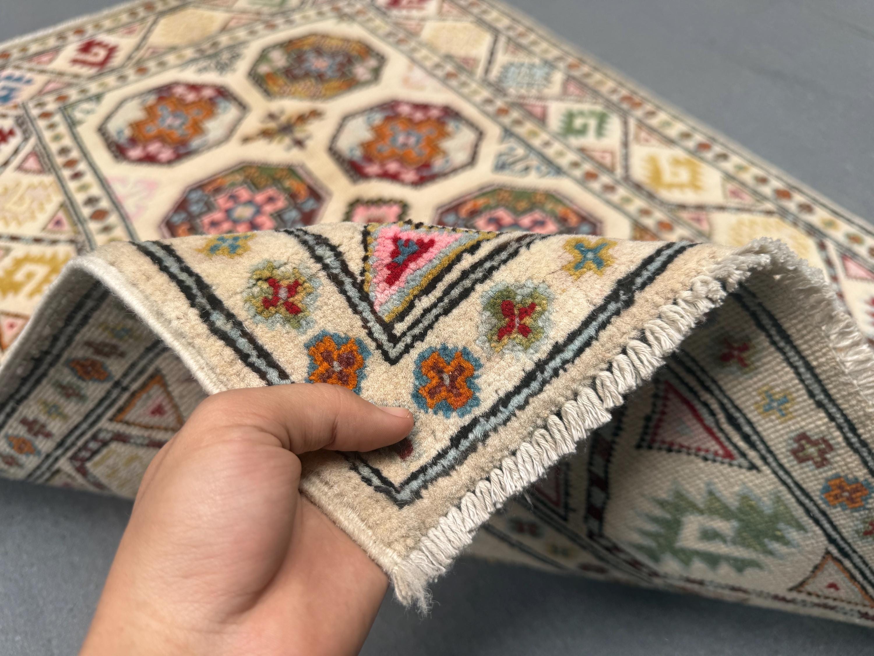 Handmade Pilpai Geometric Rug 3x5 ft Cream Tribal Wool Carpet Colorful Octagon Design Boho Area Rug for Living Room & Bedroom Decor