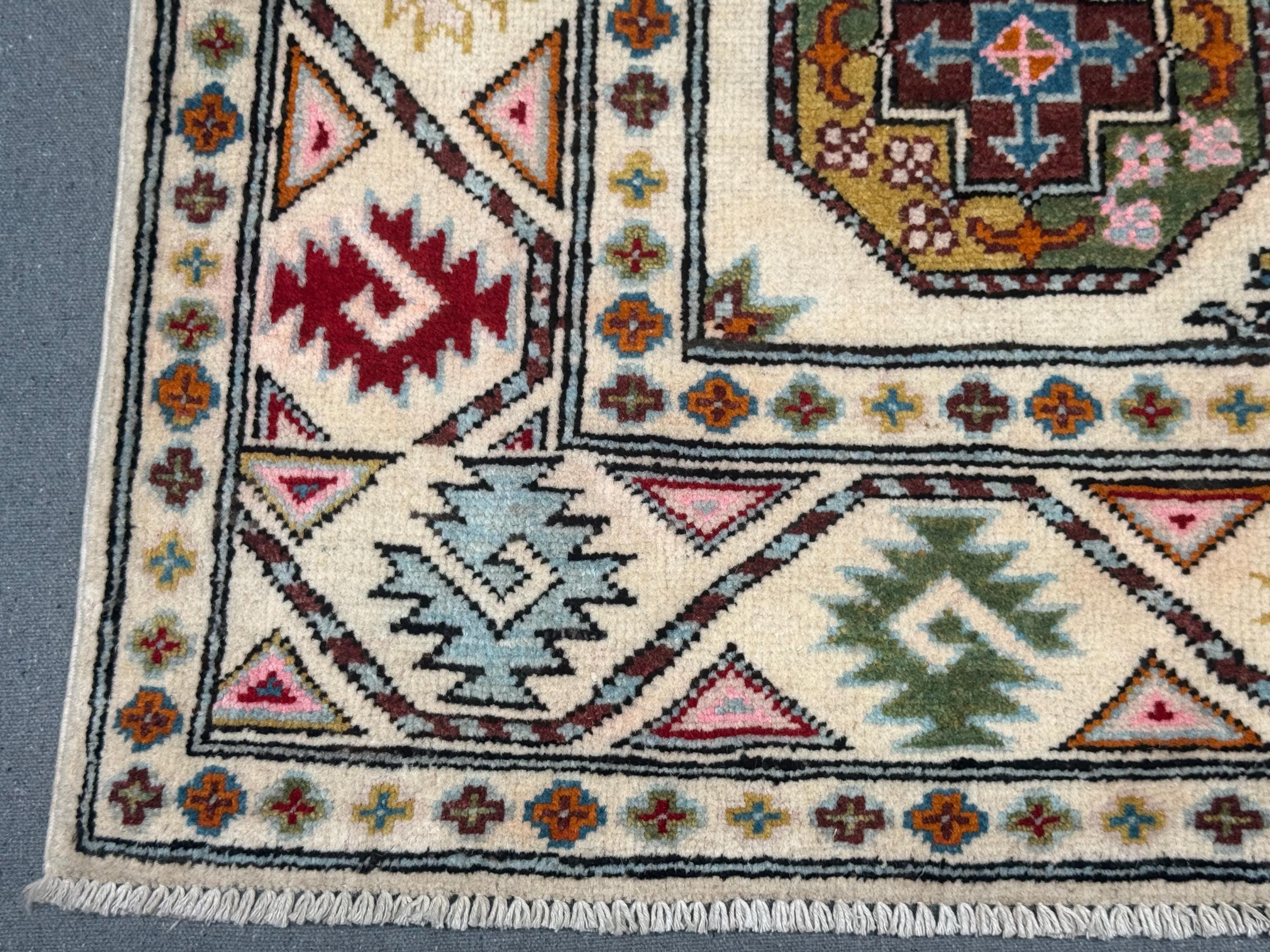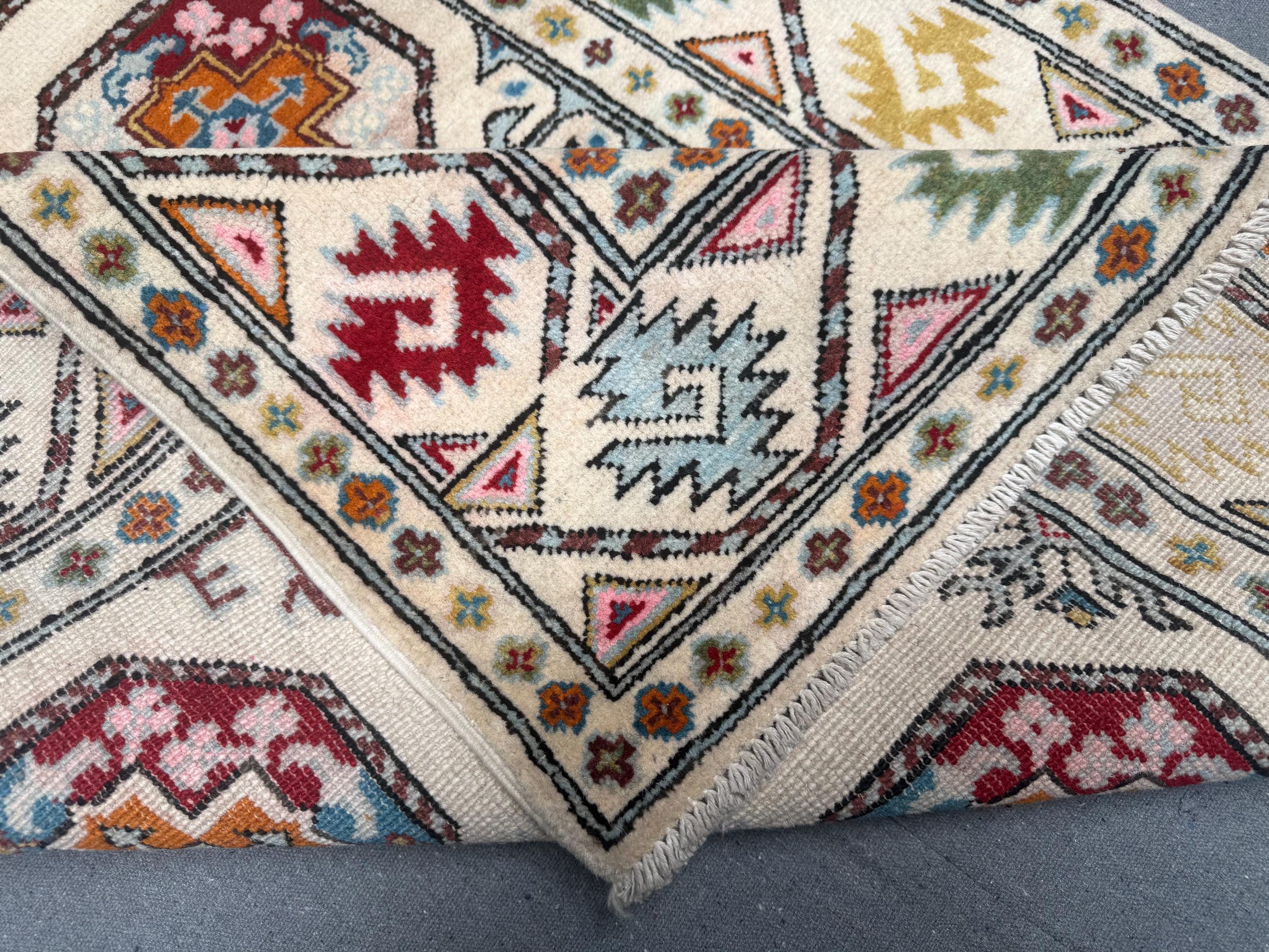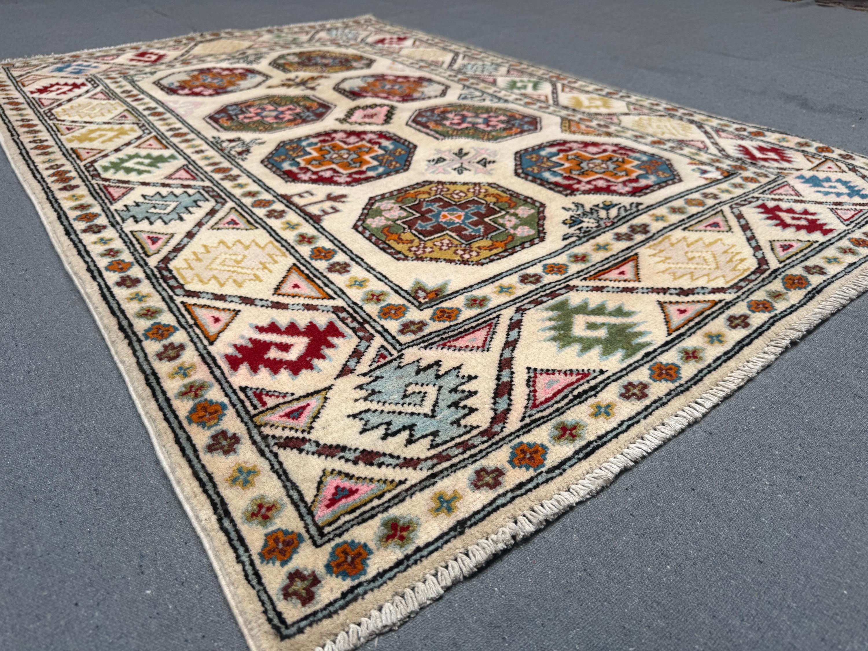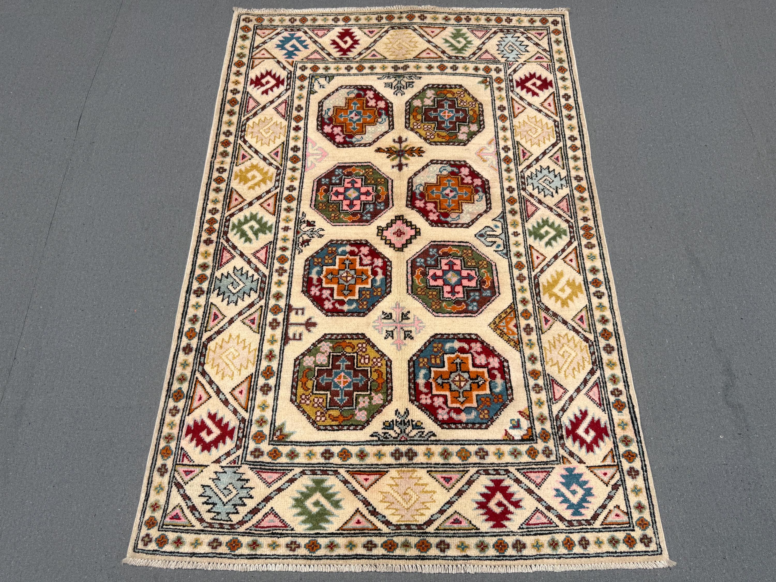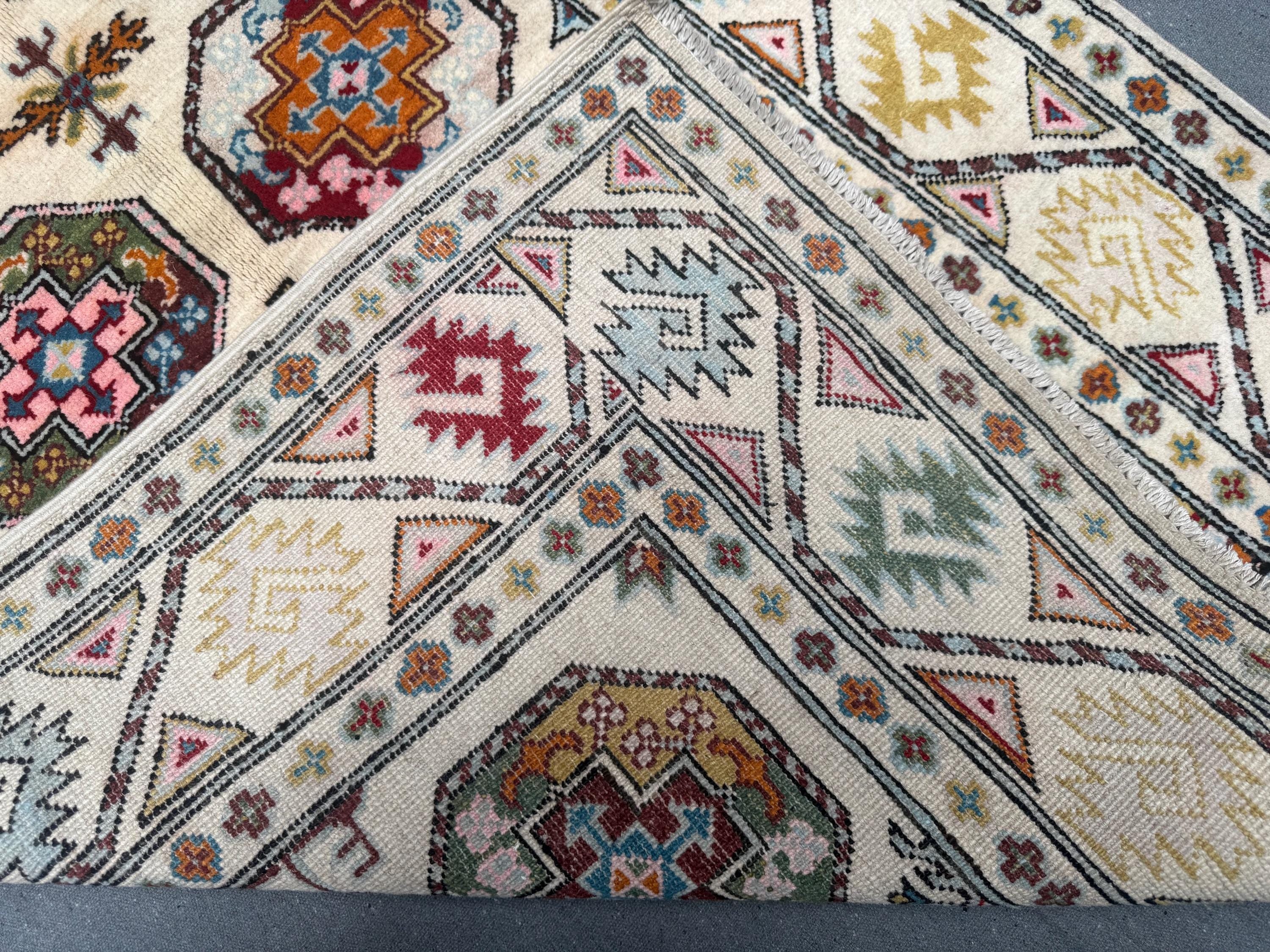 Handmade Pilpai Geometric Rug 3x5 ft Cream Tribal Wool Carpet Colorful Octagon Design Boho Area Rug for Living Room & Bedroom Decor