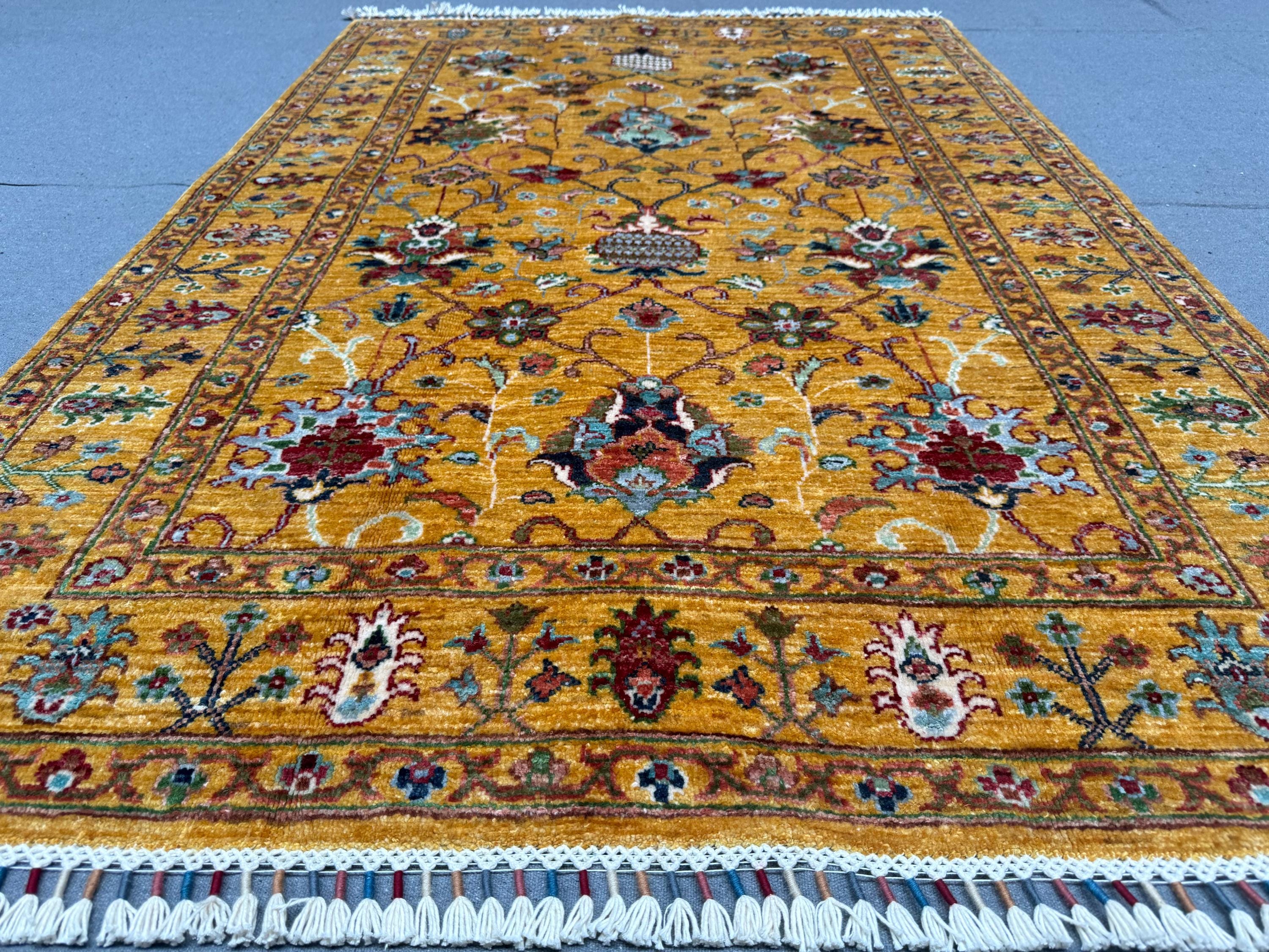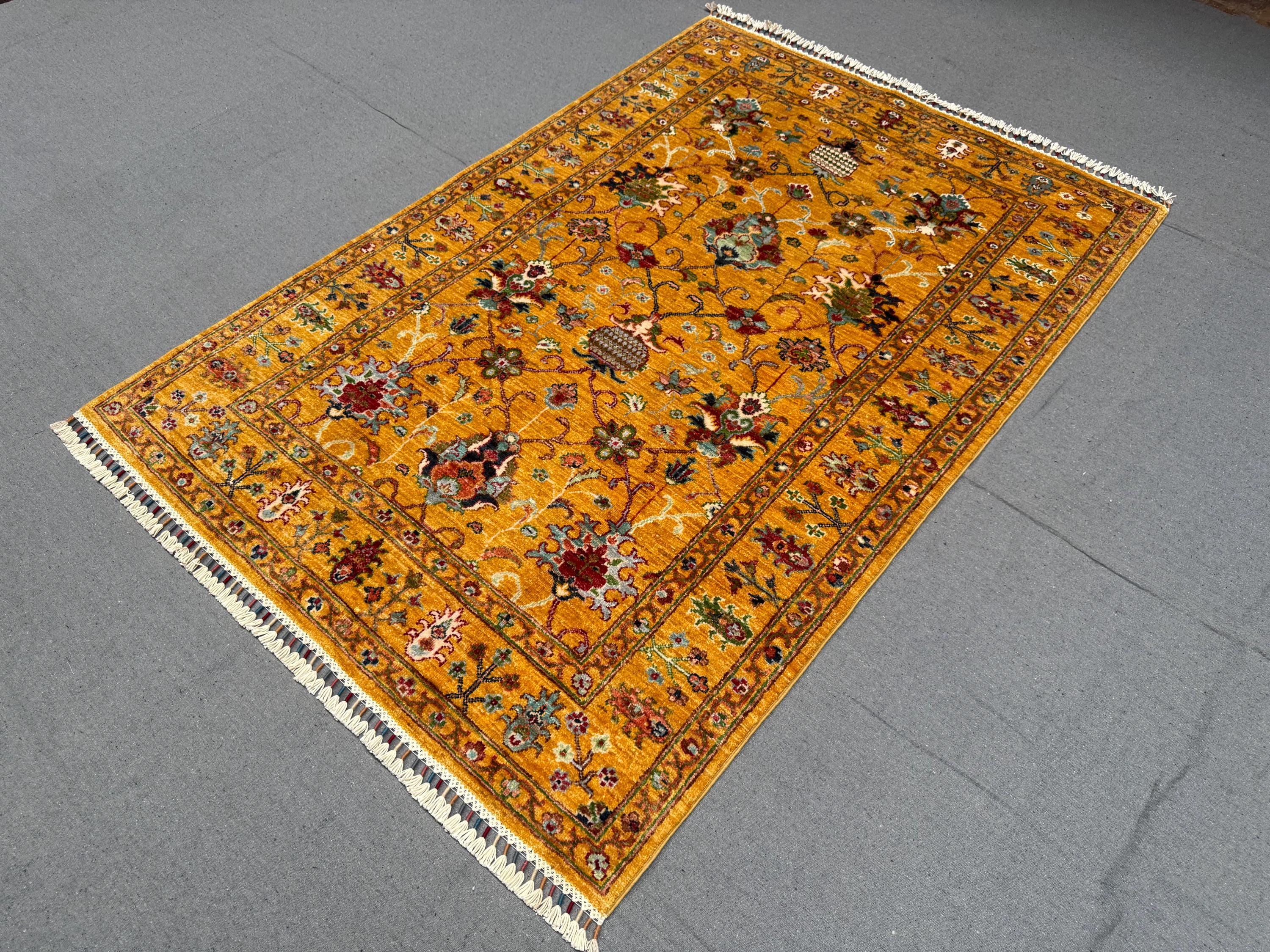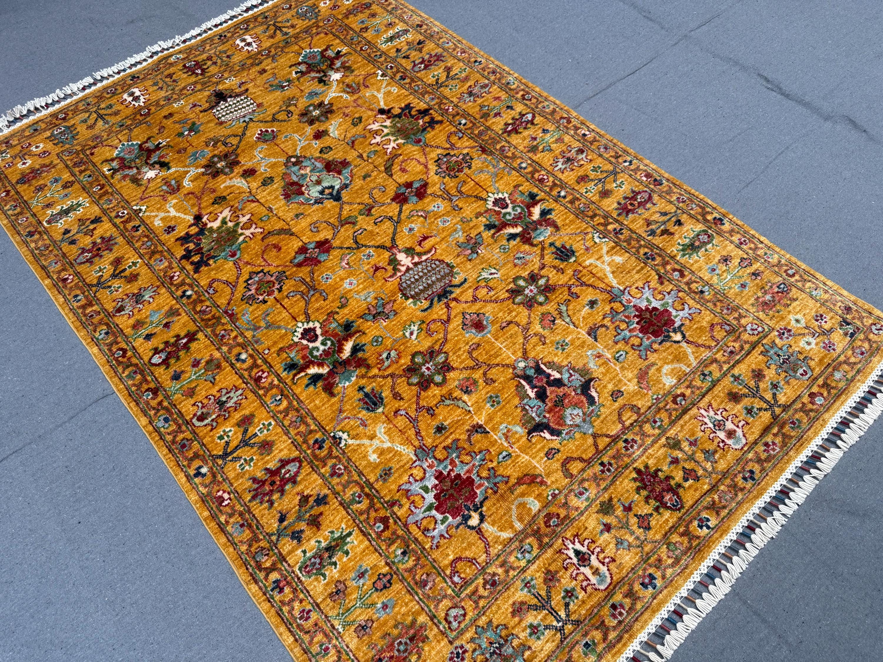 Handmade Sultani Rug 4x6 ft Afghan Yellow Wool Area Rug, Golden Oriental Floral Carpet, Boho Living Room Decor, Traditional Handmade Rug