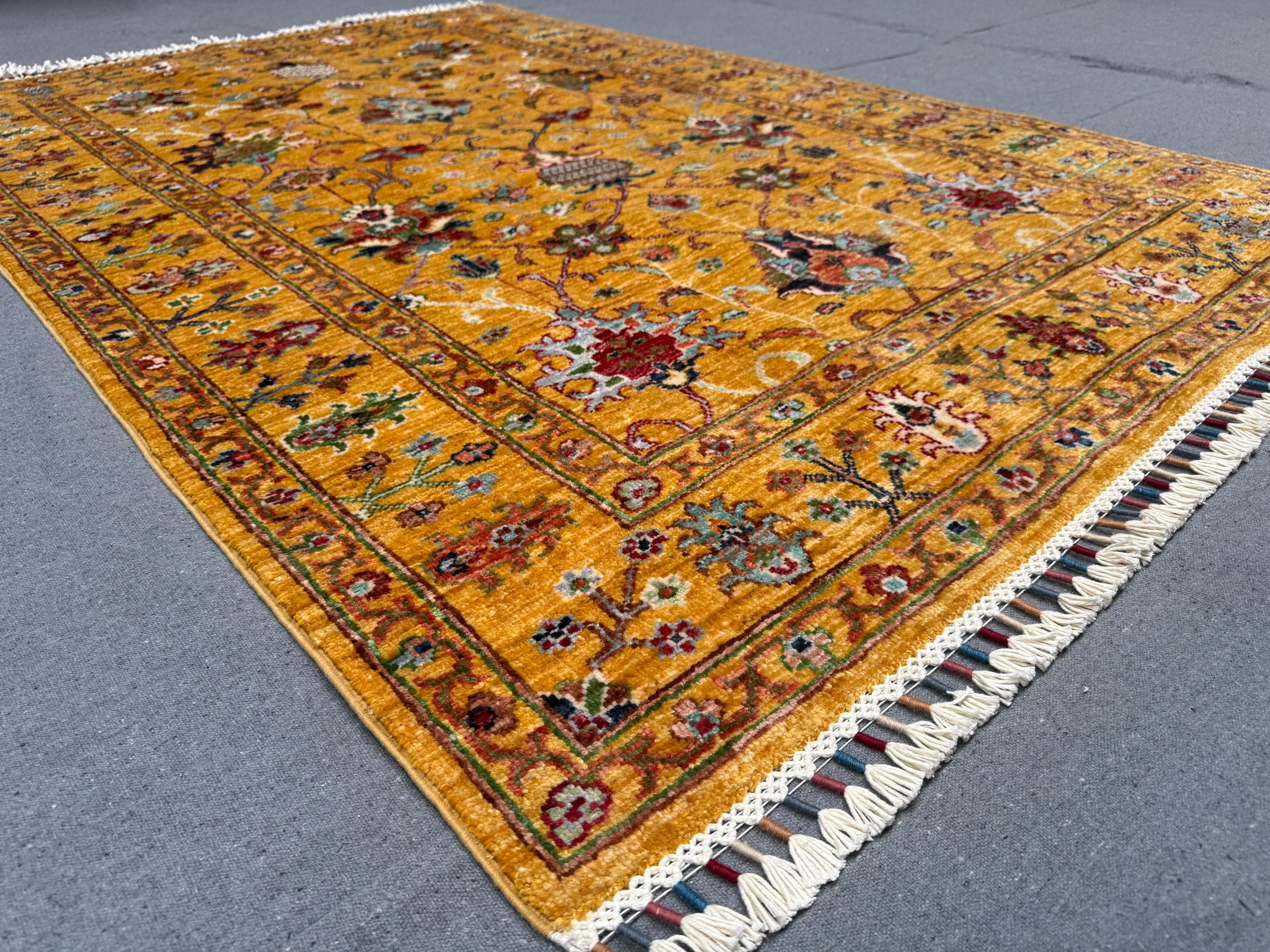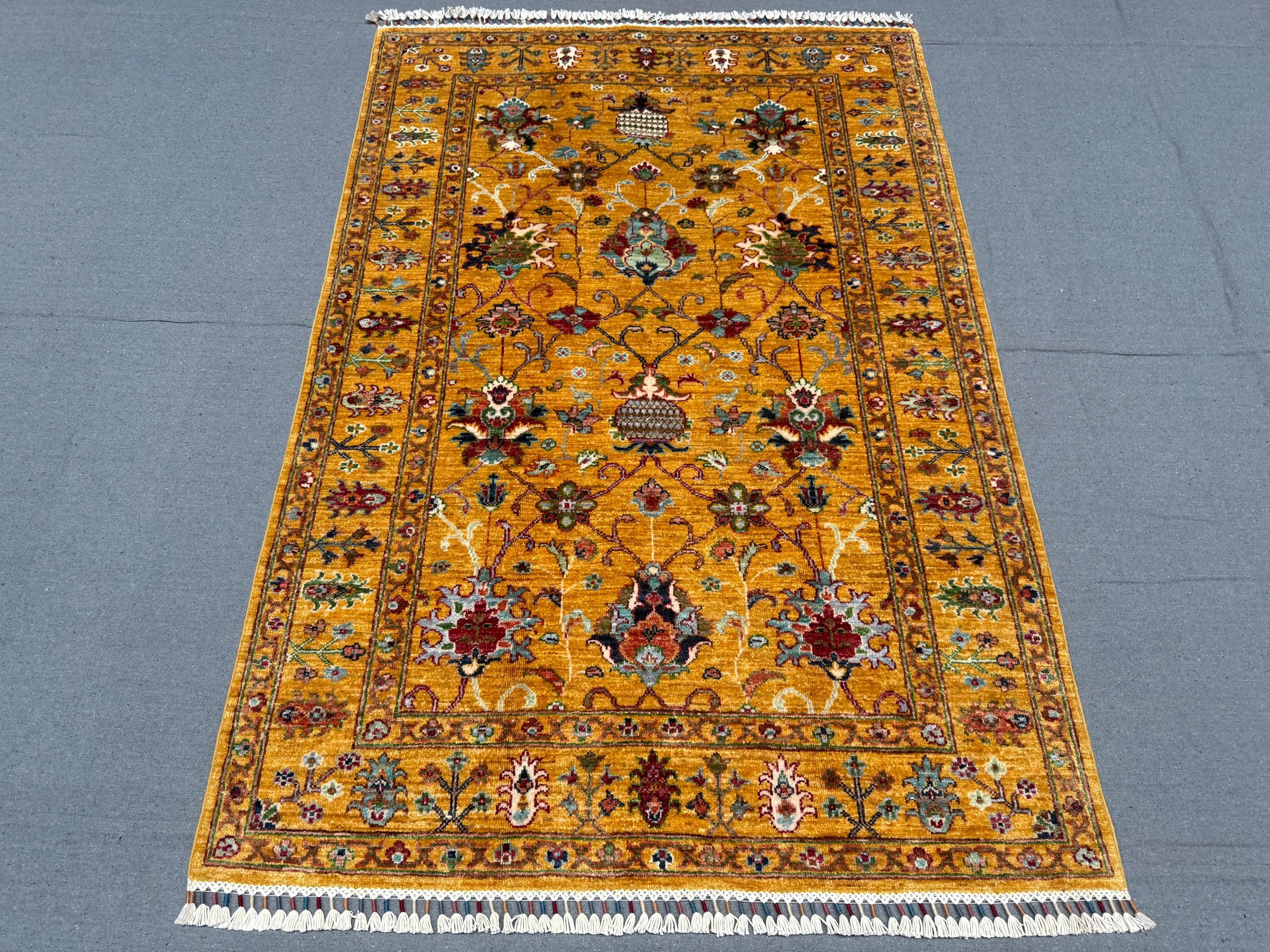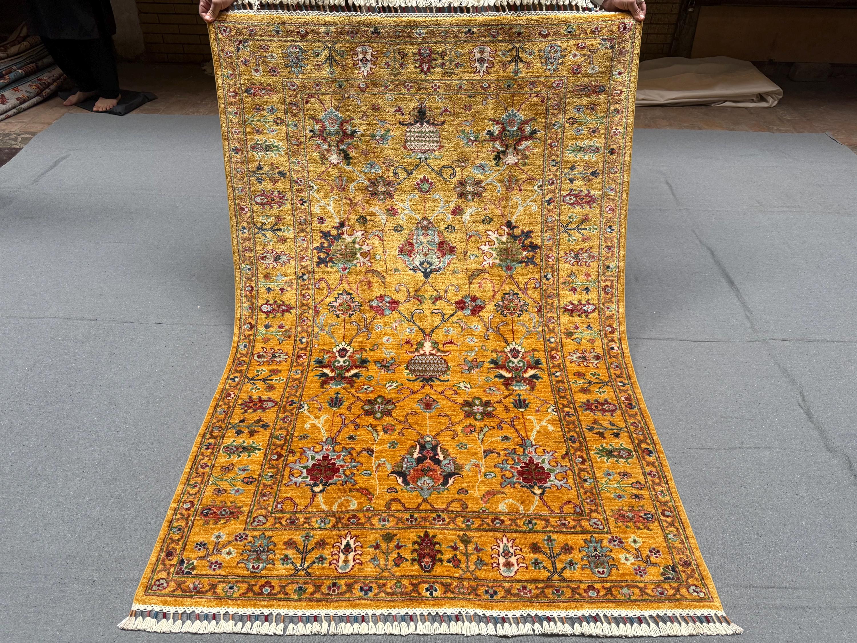 Handmade Sultani Rug 4x6 ft Afghan Yellow Wool Area Rug, Golden Oriental Floral Carpet, Boho Living Room Decor, Traditional Handmade Rug
