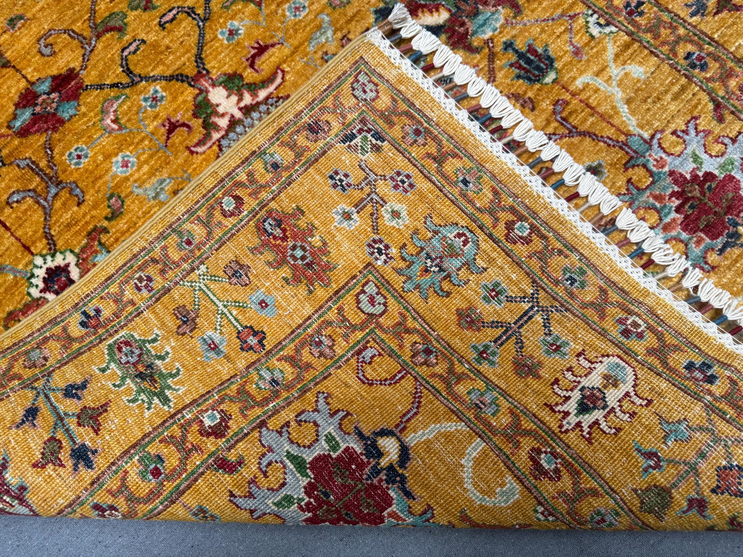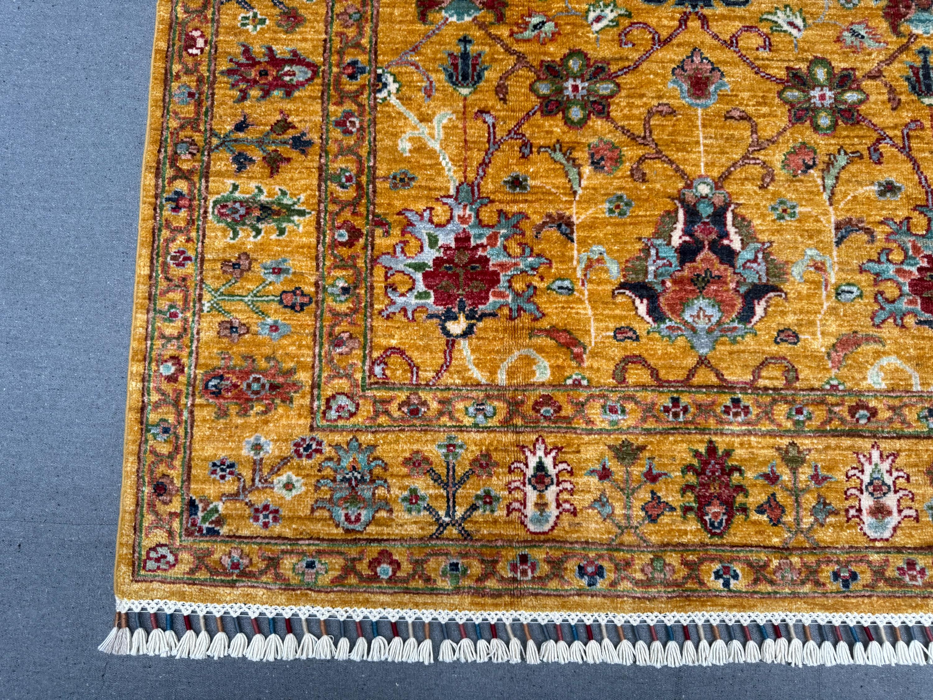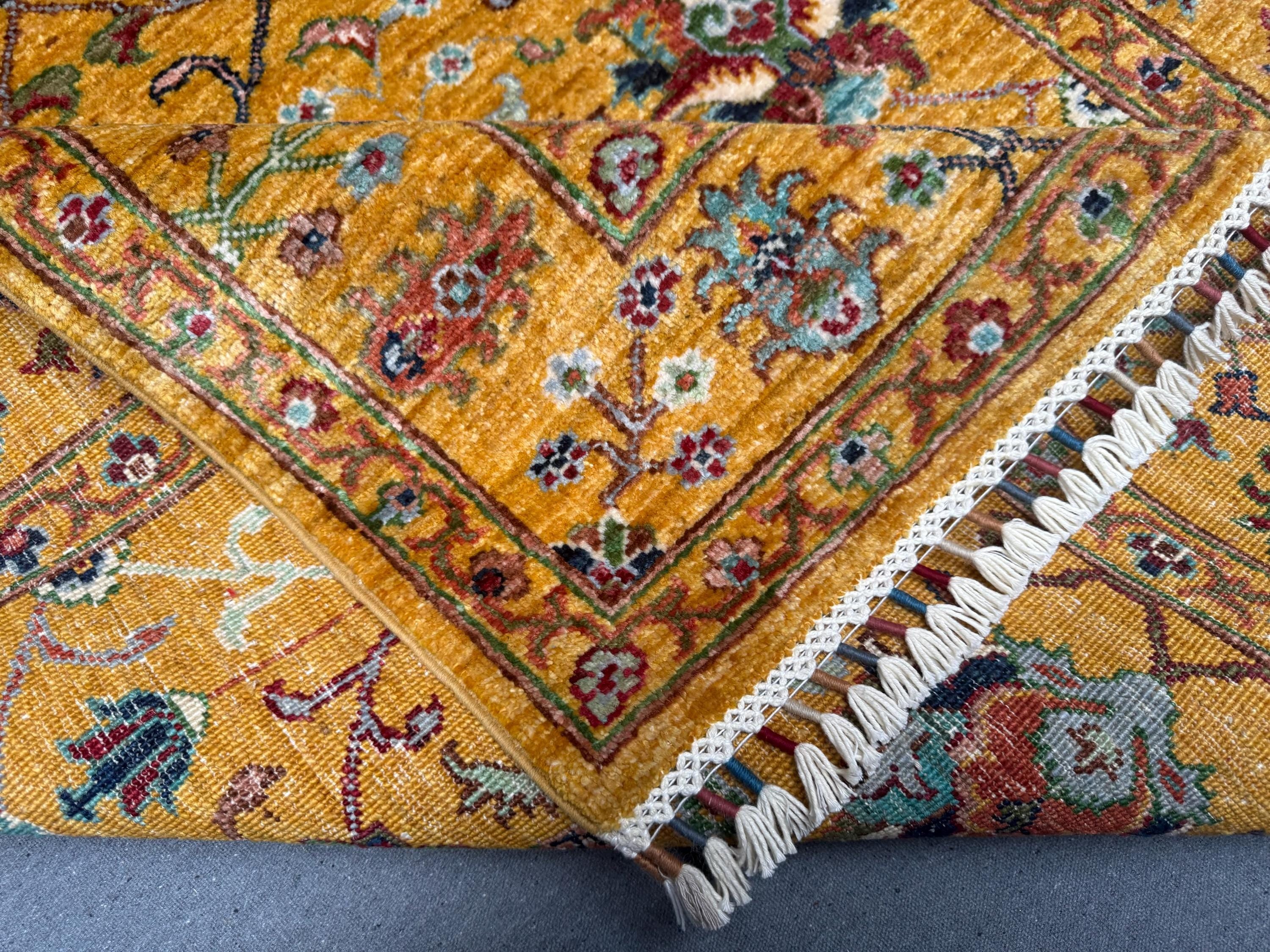 Handwoven by experienced Afghan artisans, this piece showcases a classic Sultani design with elegant borders, blooming floral patterns, and graceful symmetry. The warm golden color not only makes a bold statement but also blends effortlessly with boho, classic, rustic, and modern interiors.