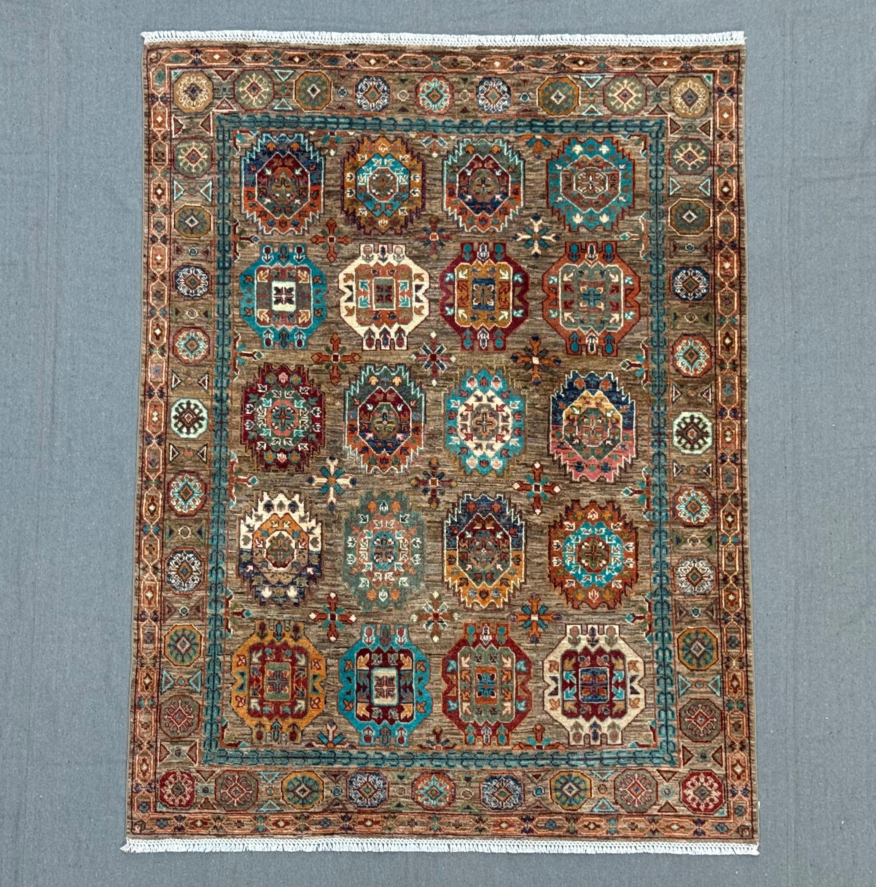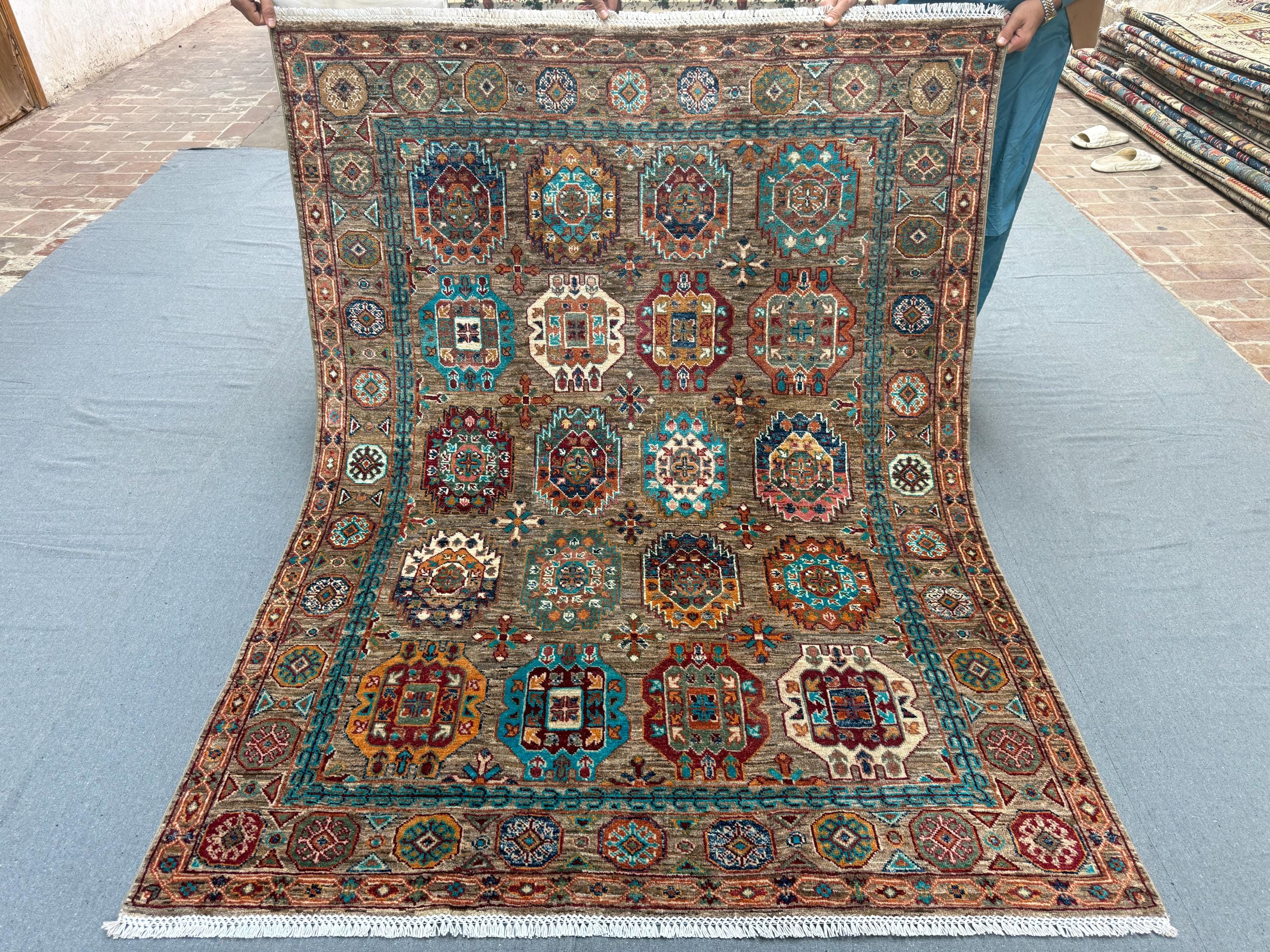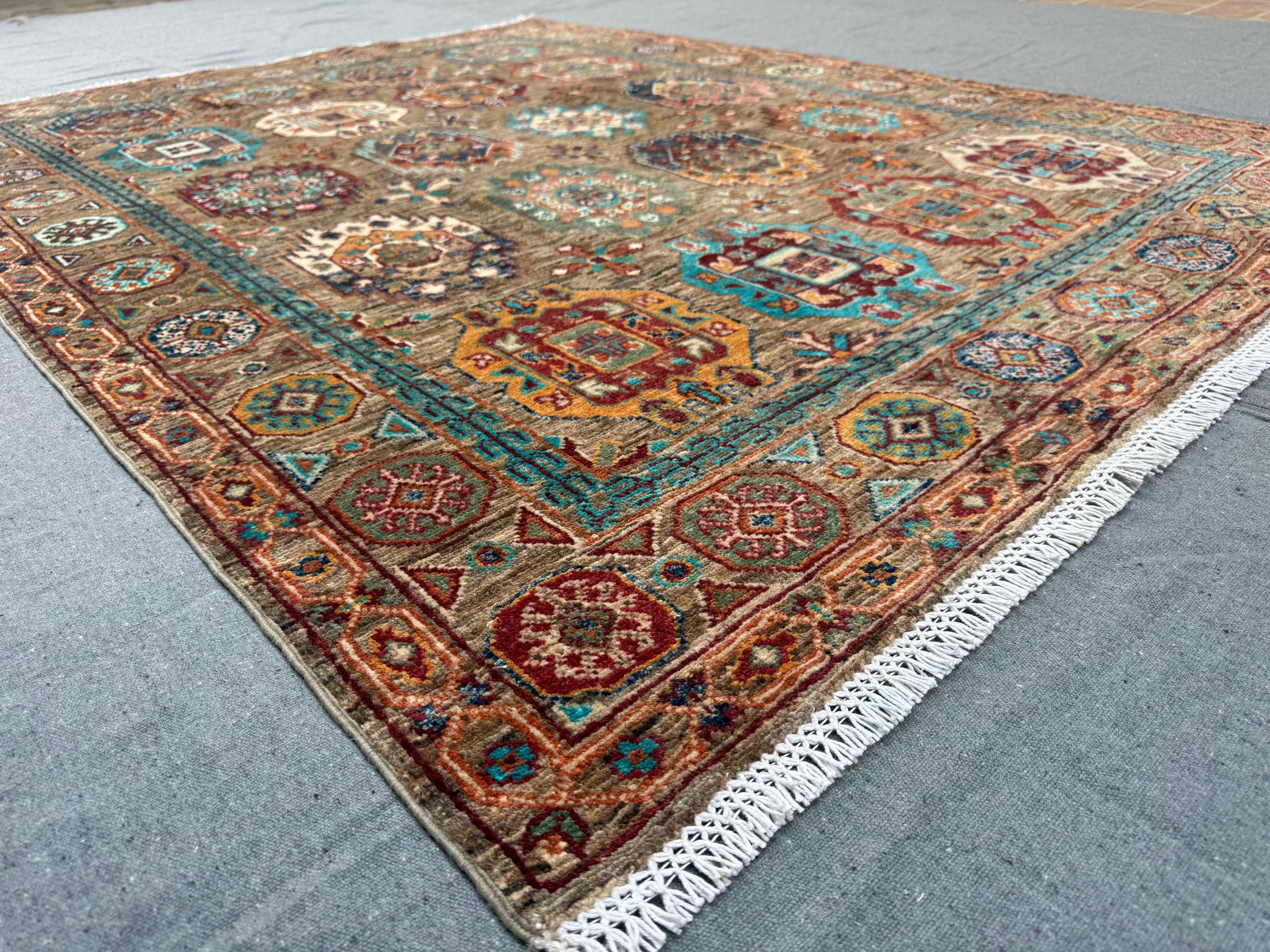 Handmade Waziri Rug 4x6 ft Afghan Wool Area Carpet | Brown & Multicolor Tribal Geometric Design | Vintage Oriental Living Room Decor