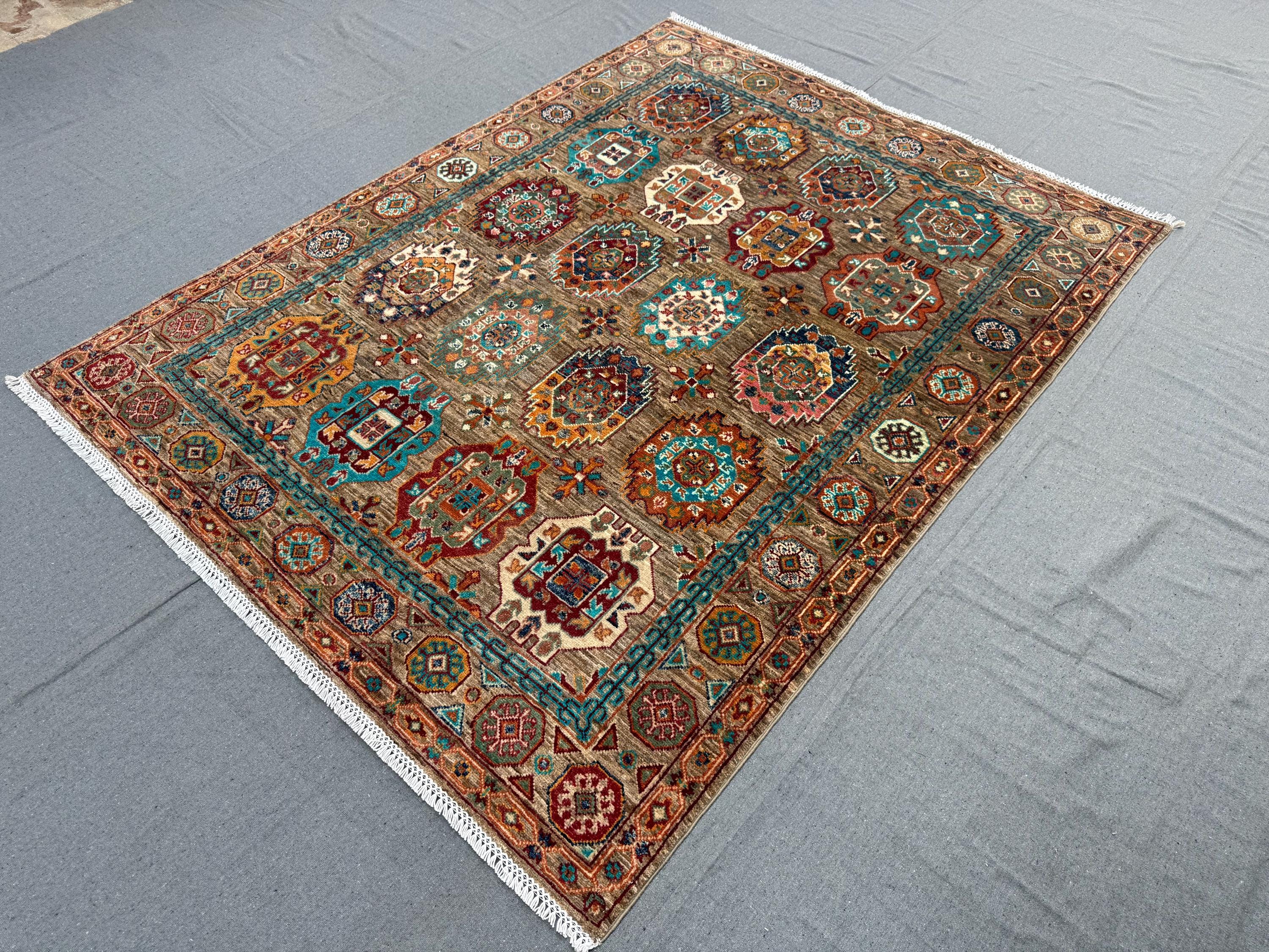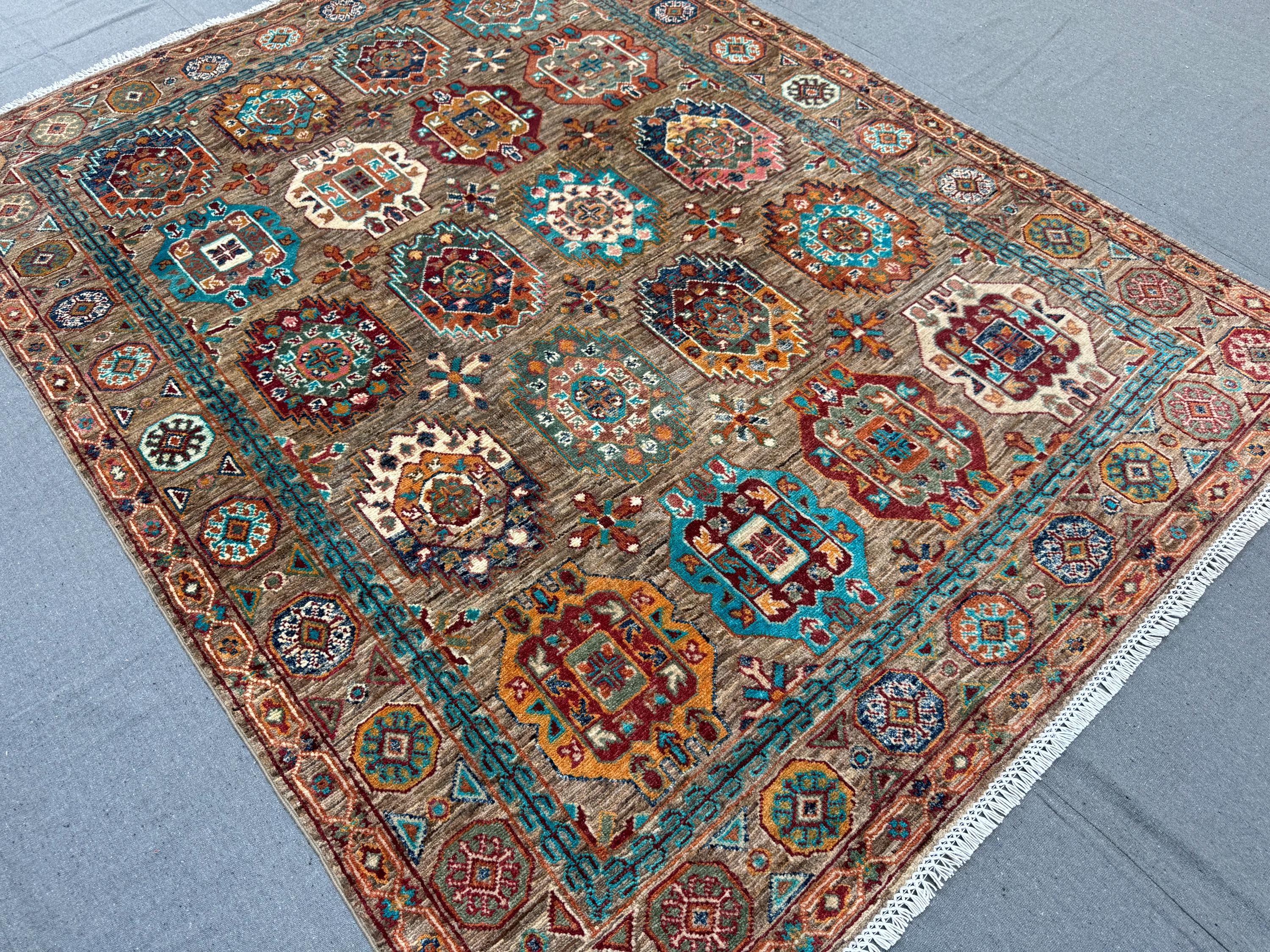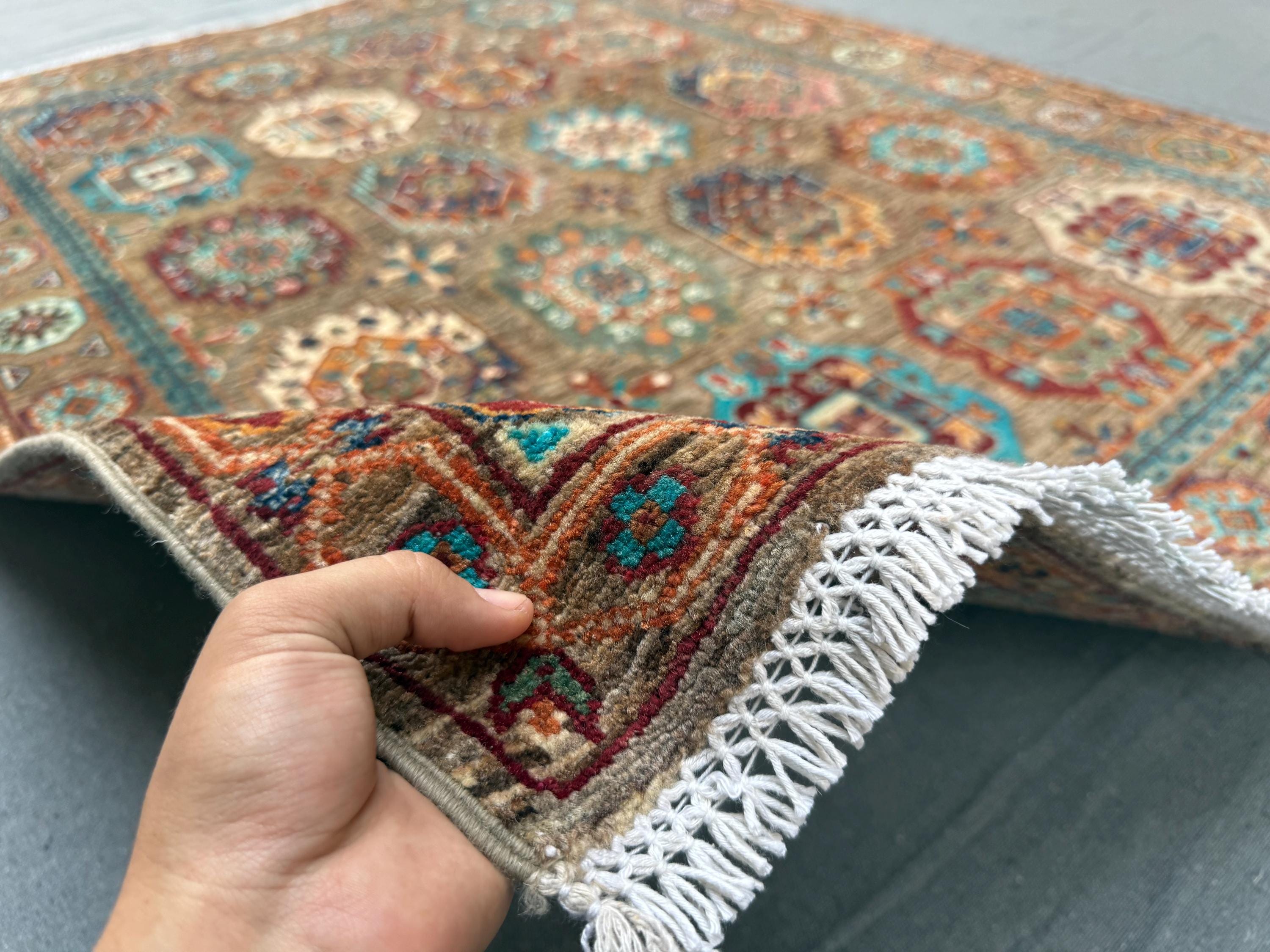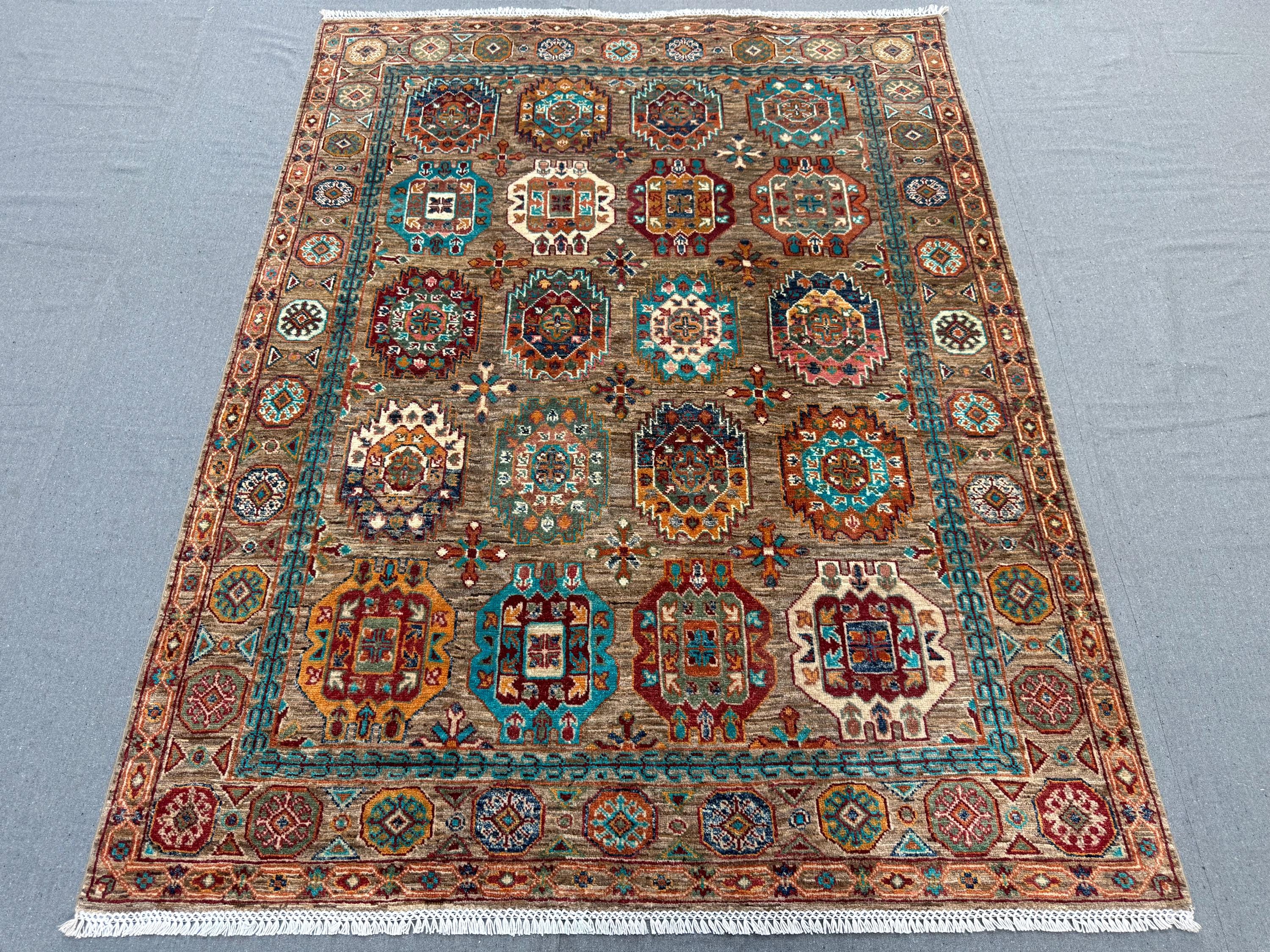 Handmade Waziri Rug 4x6 ft Afghan Wool Area Carpet | Brown & Multicolor Tribal Geometric Design | Vintage Oriental Living Room Decor