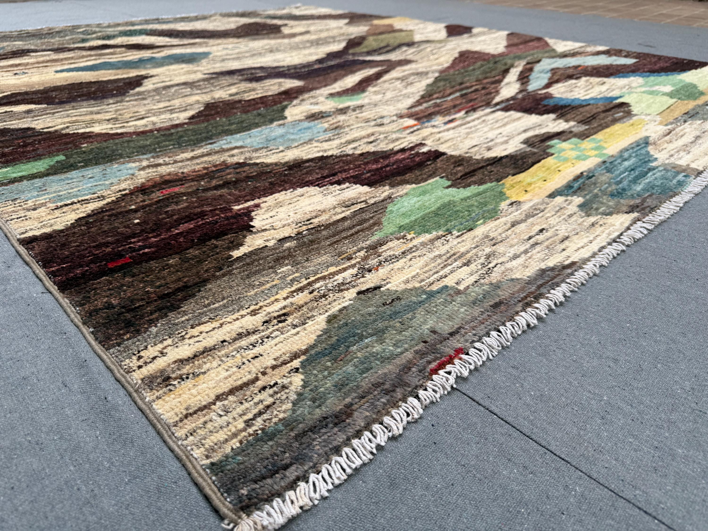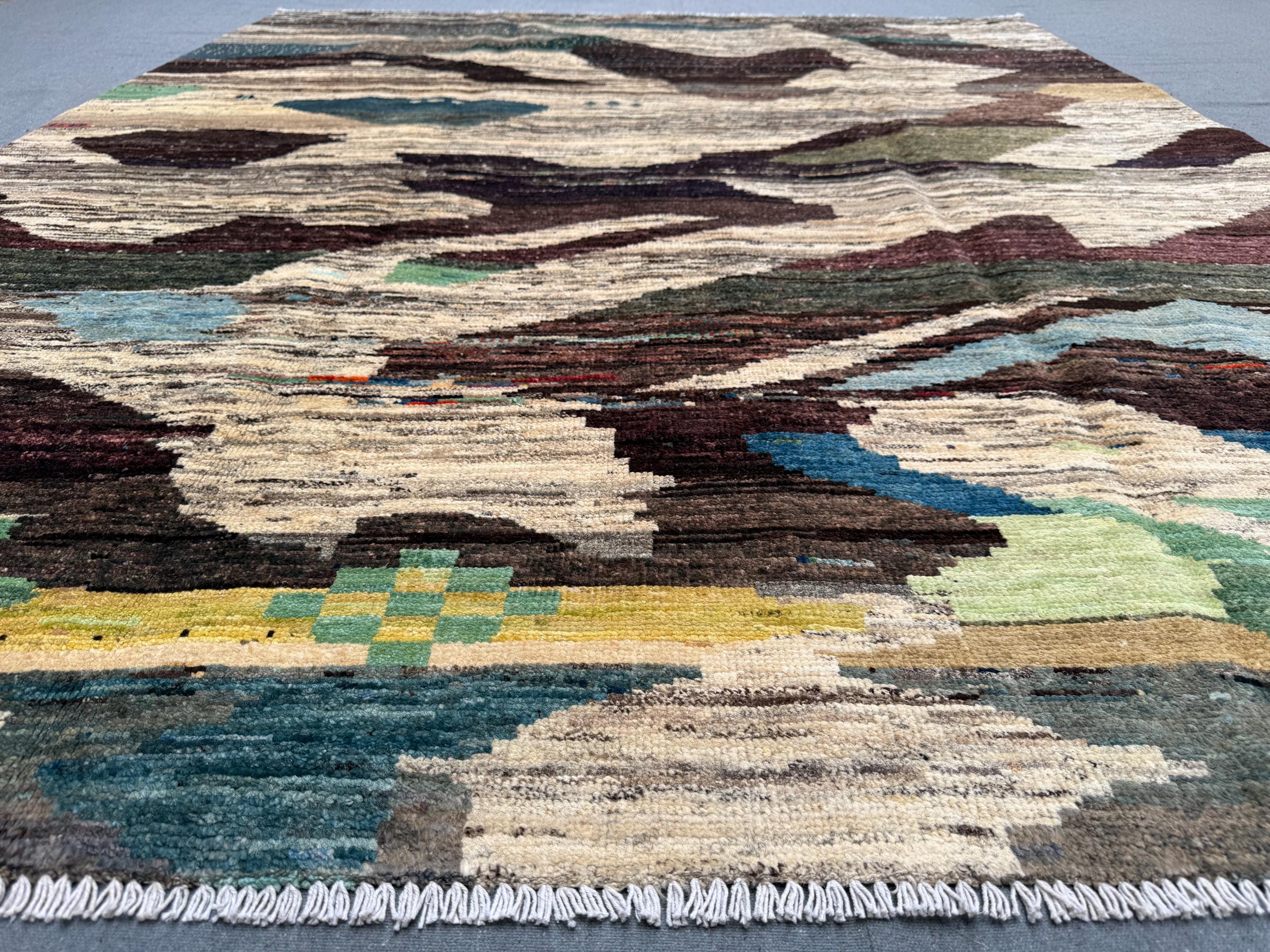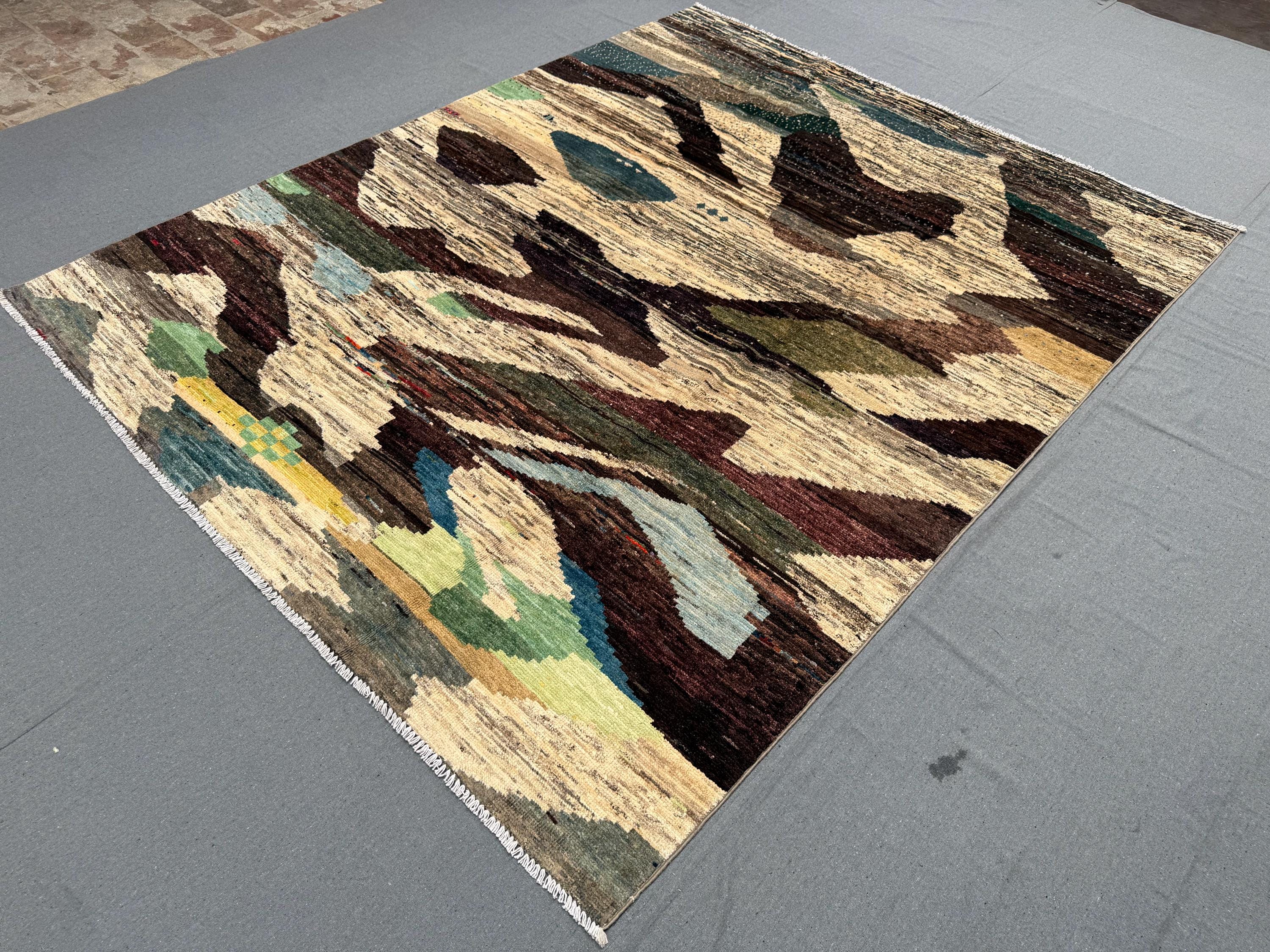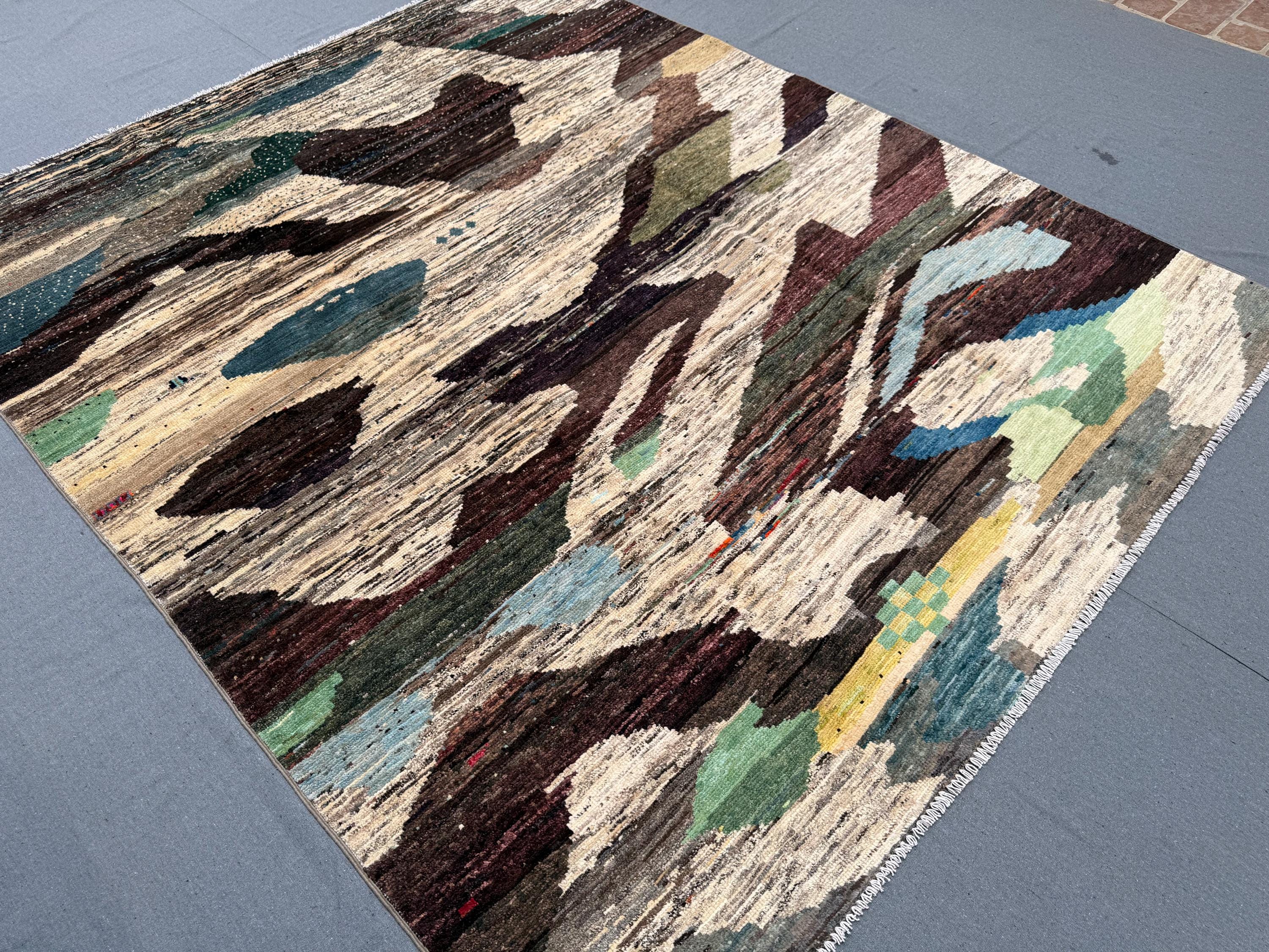 Handmade Gabbeh Style Rug 7x8 ft Modern Abstract Geometric Wool Area Rug in Neutral Earth Tones