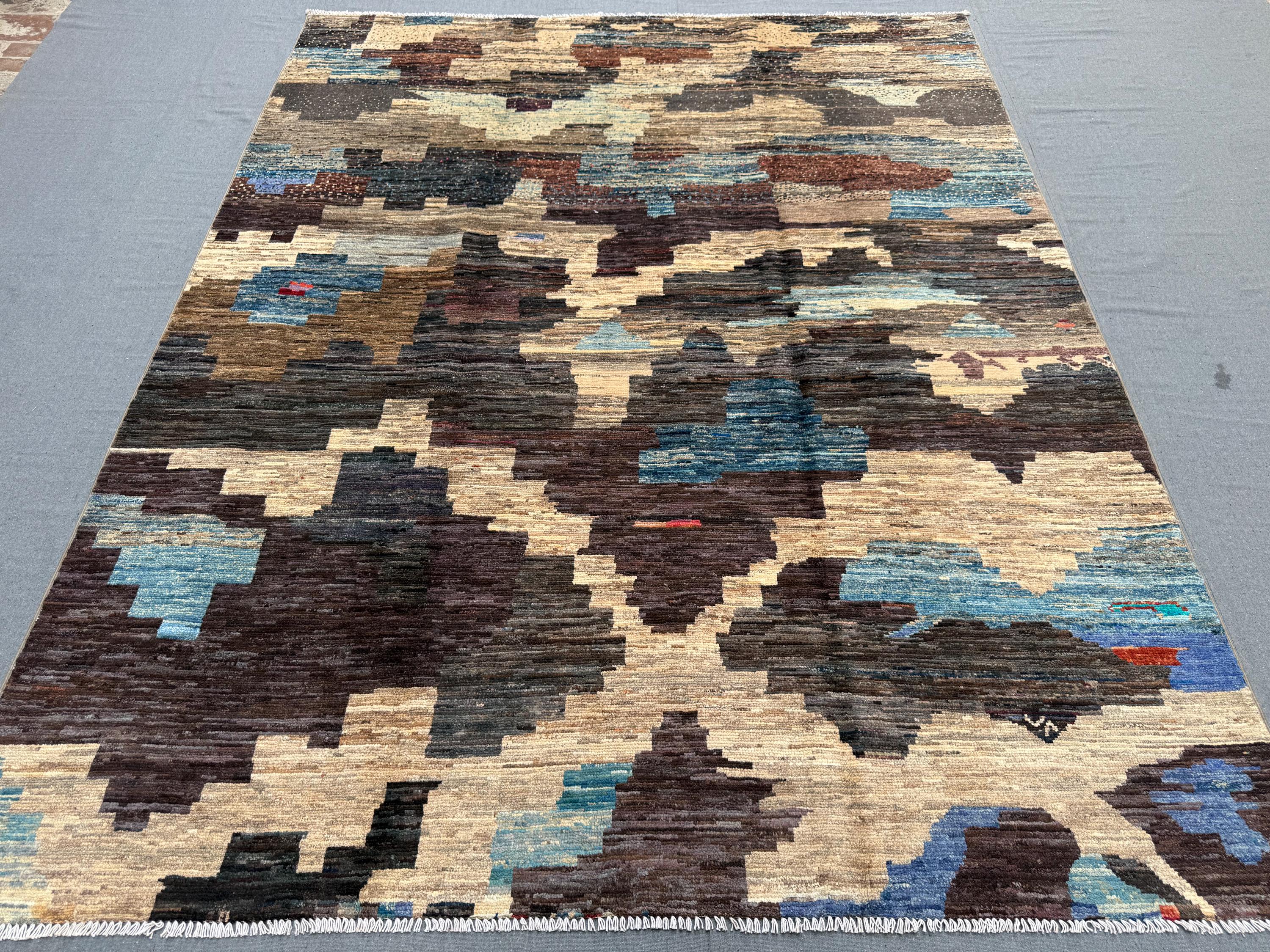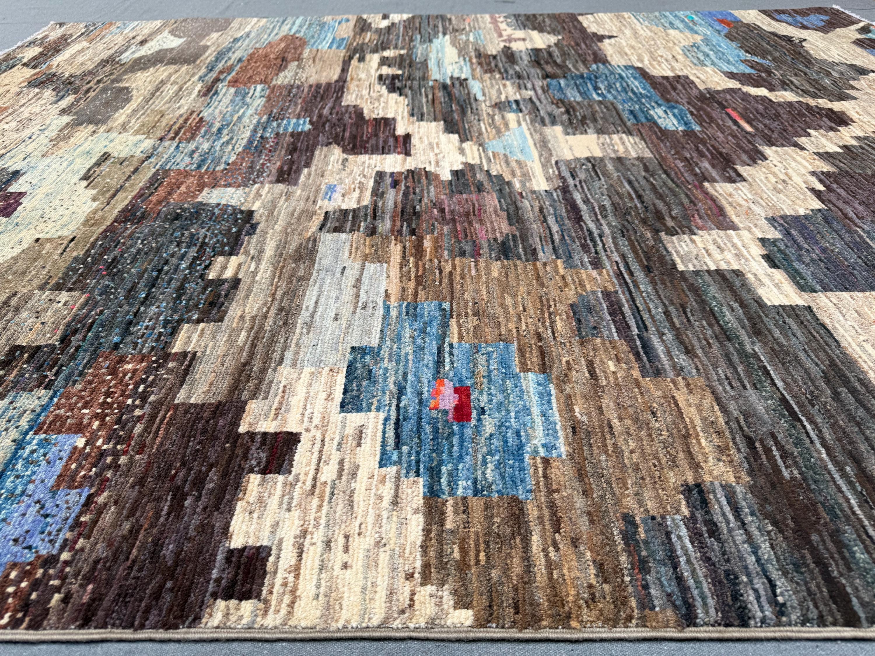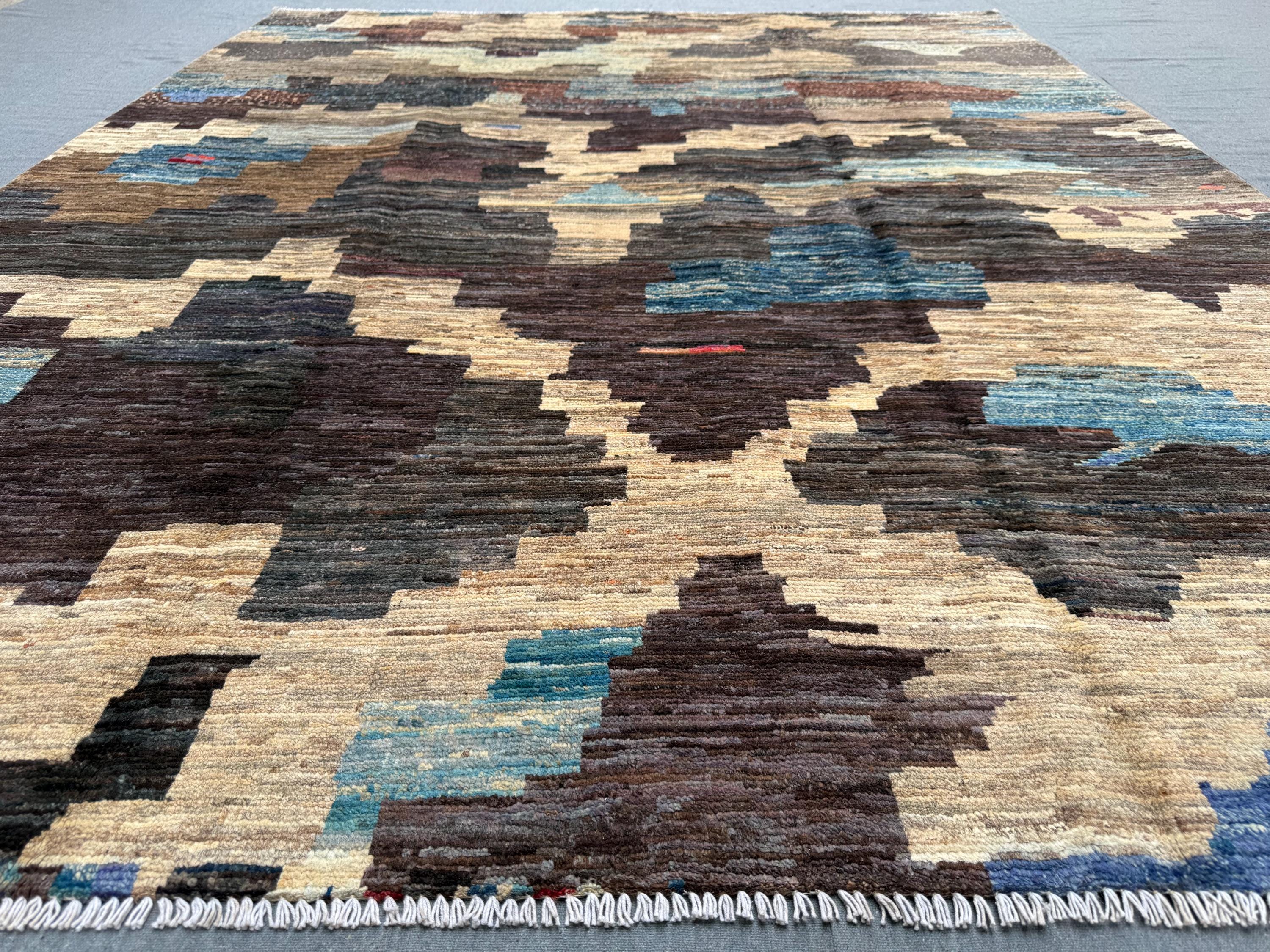 Handmade Moroccan Style Rug 7x8 ft Modern Abstract Geometric Wool Area Rug in Neutral Tones with Blue & Brown Accents